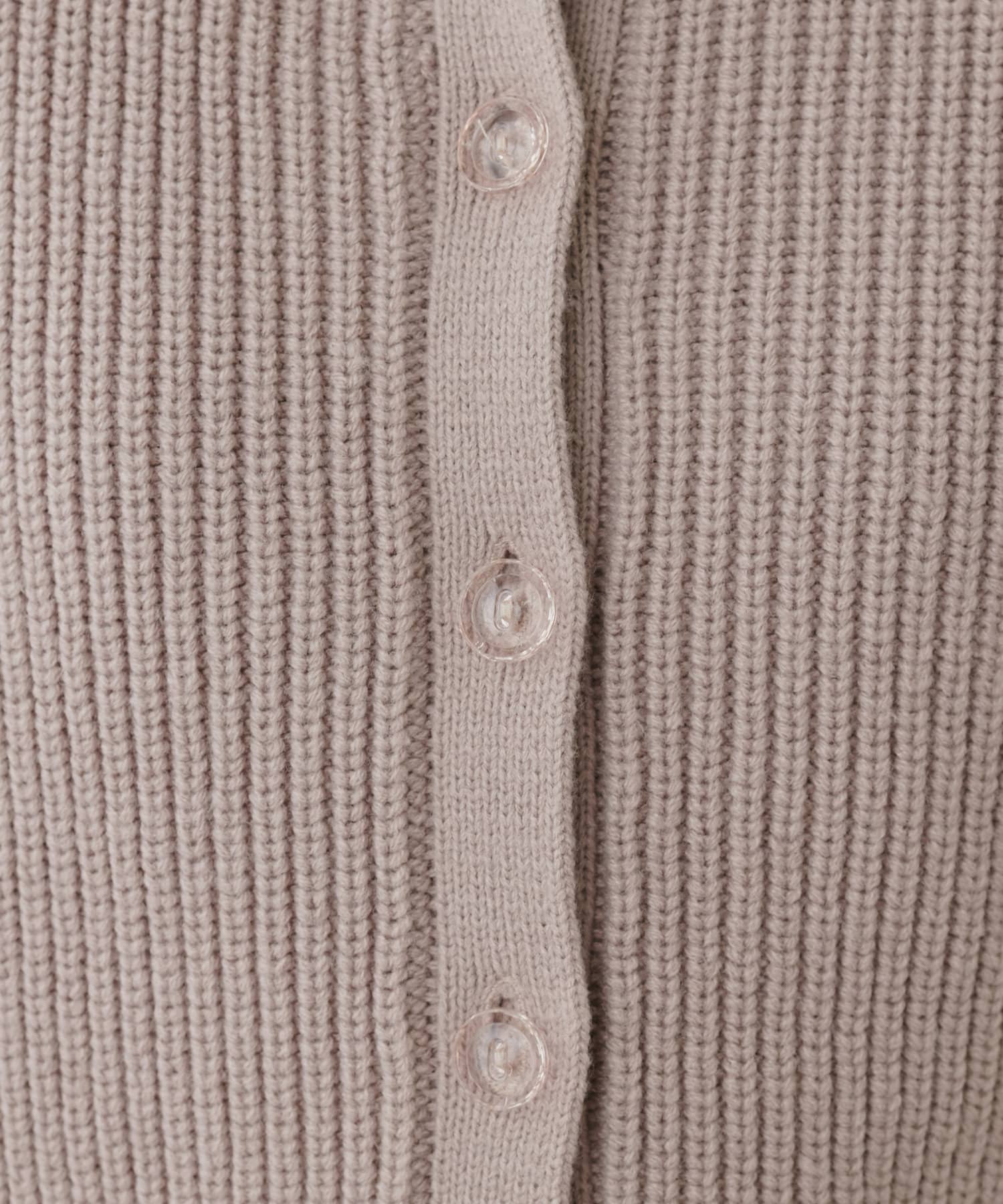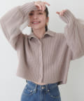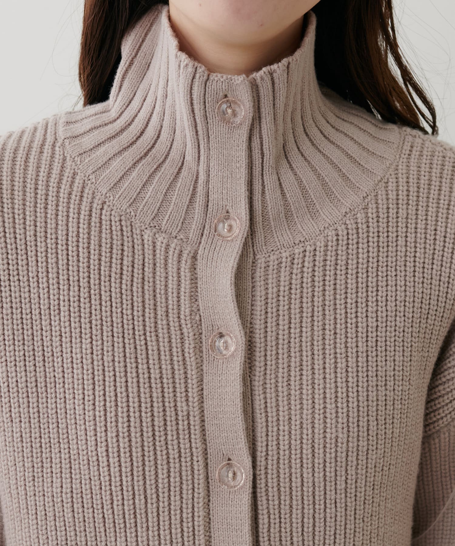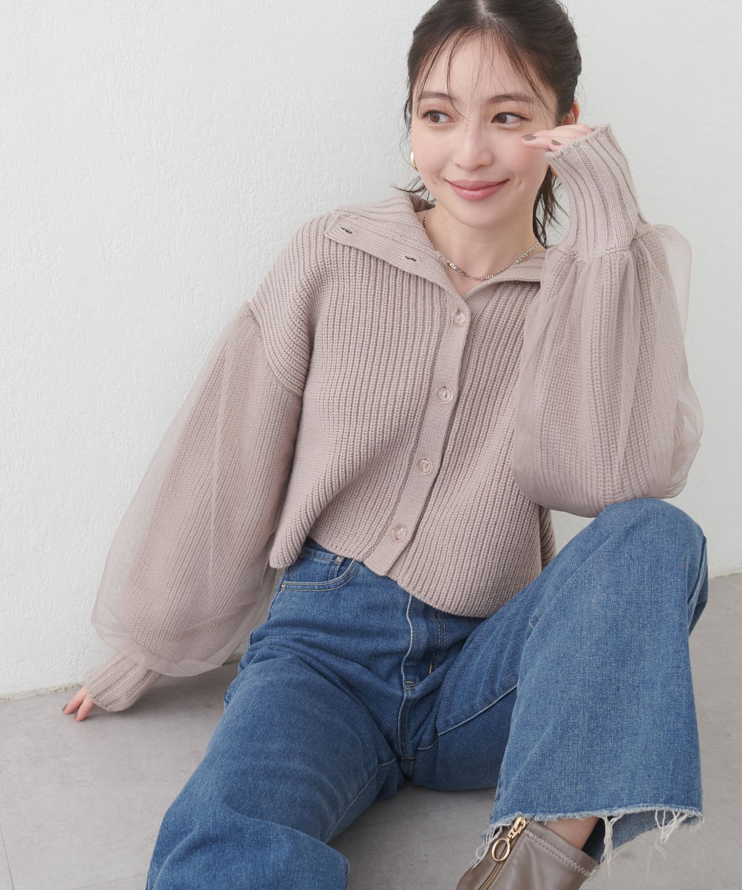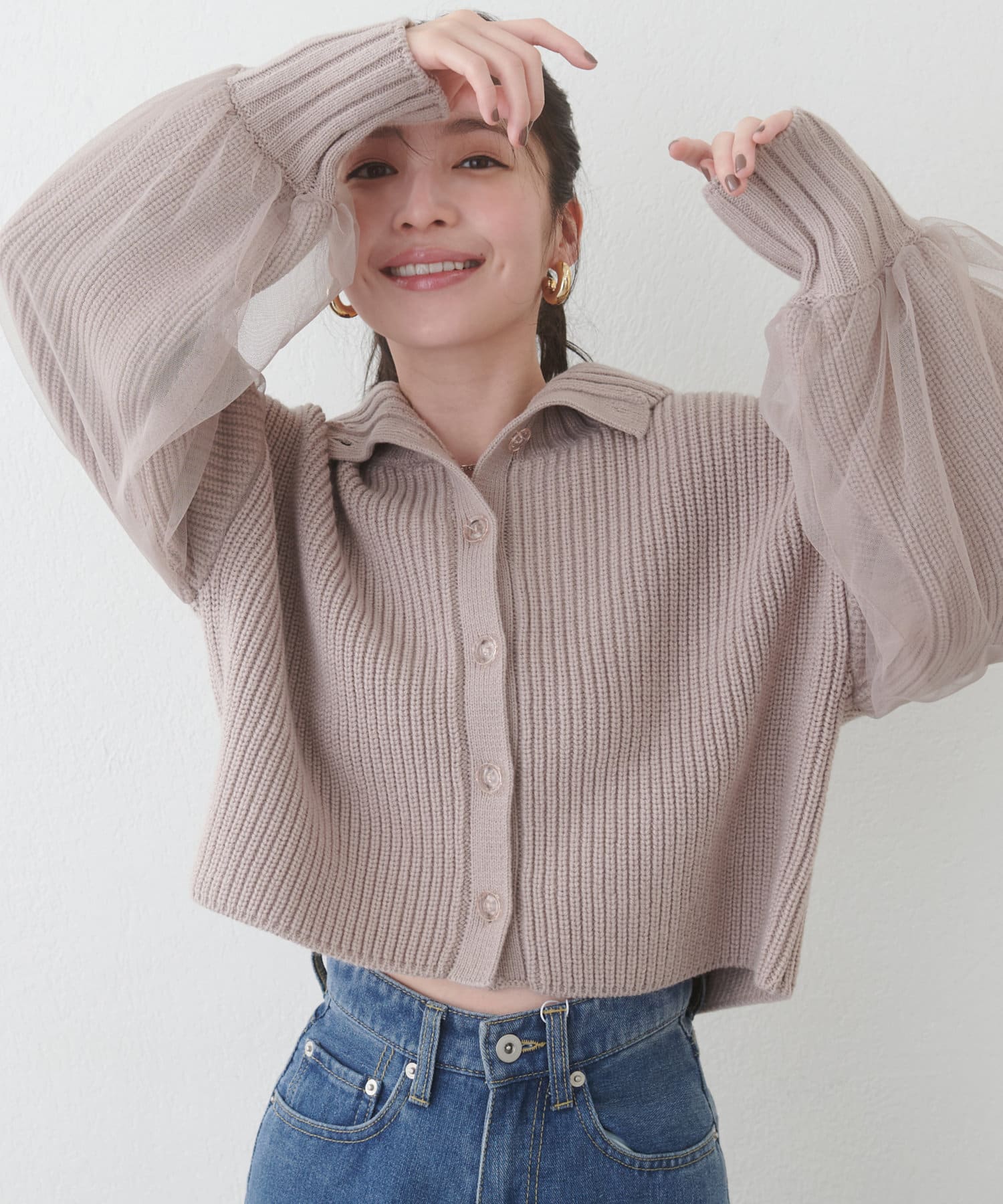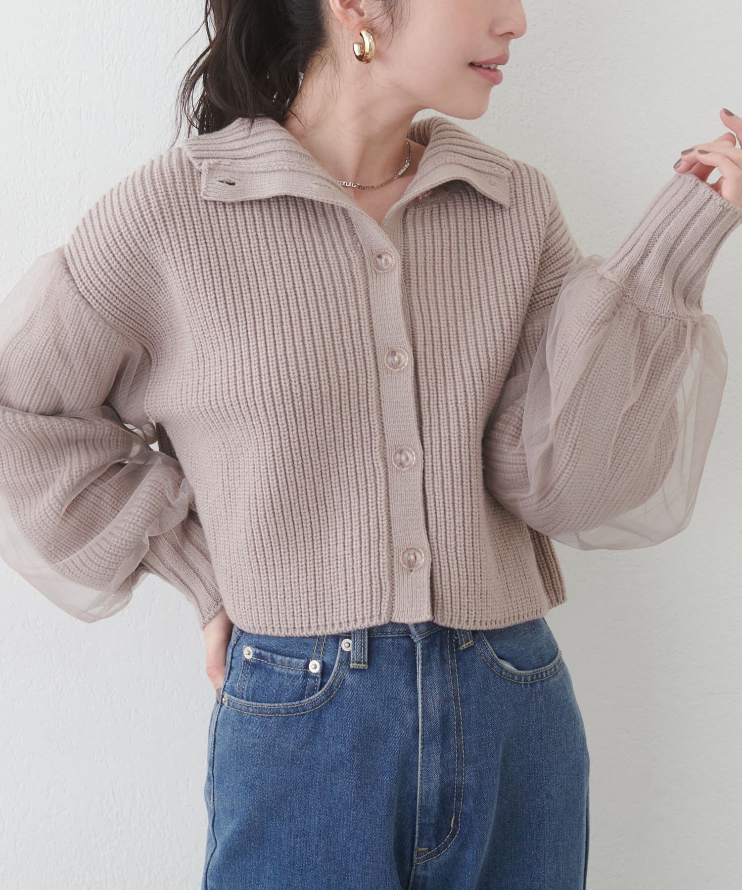 首元のデザインと袖のチュールがポイントのカーディガン。
