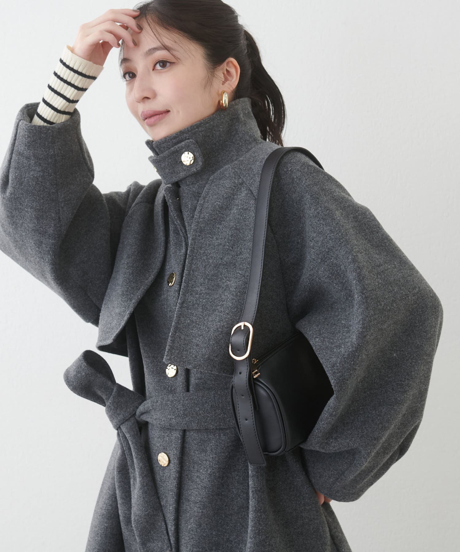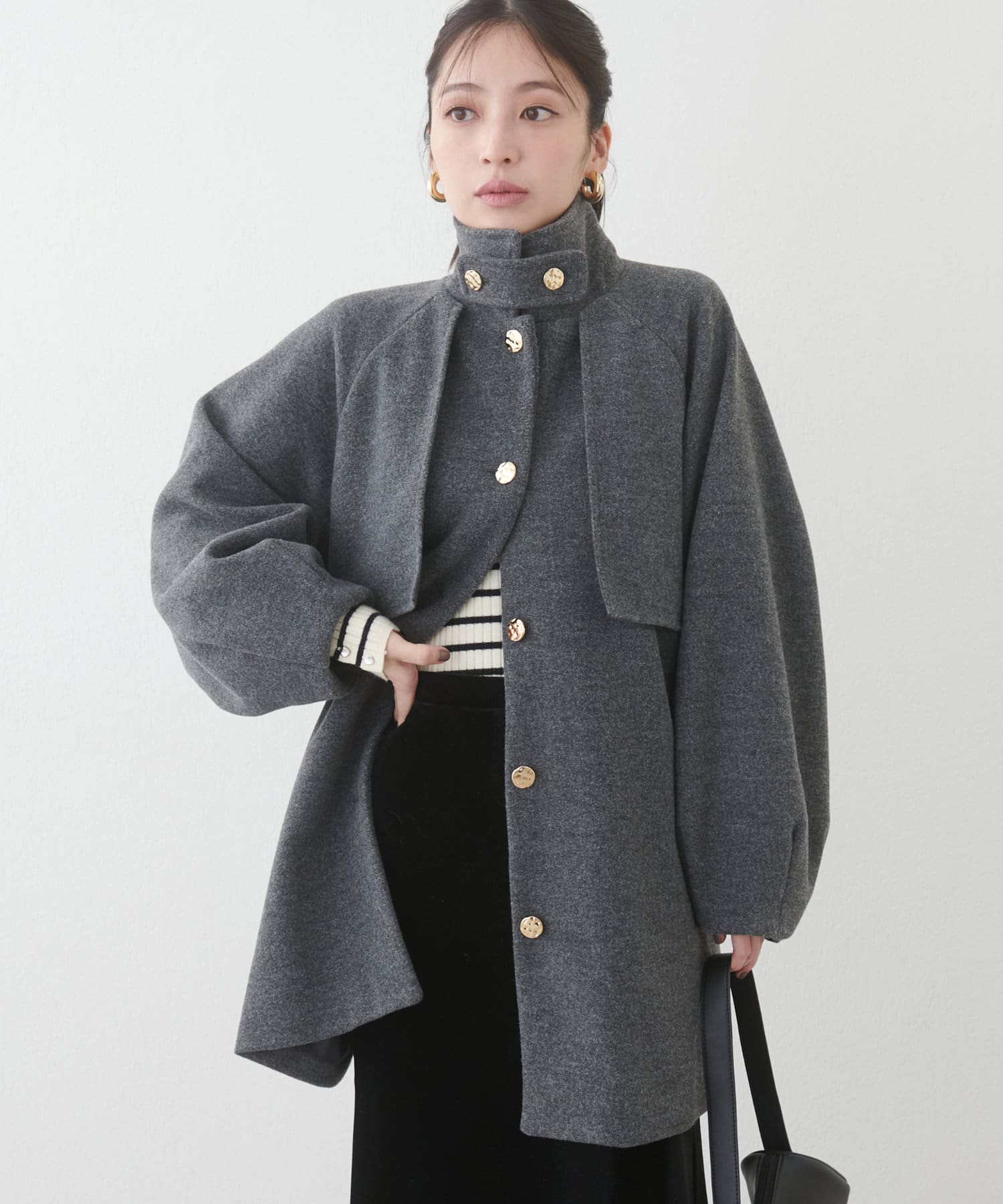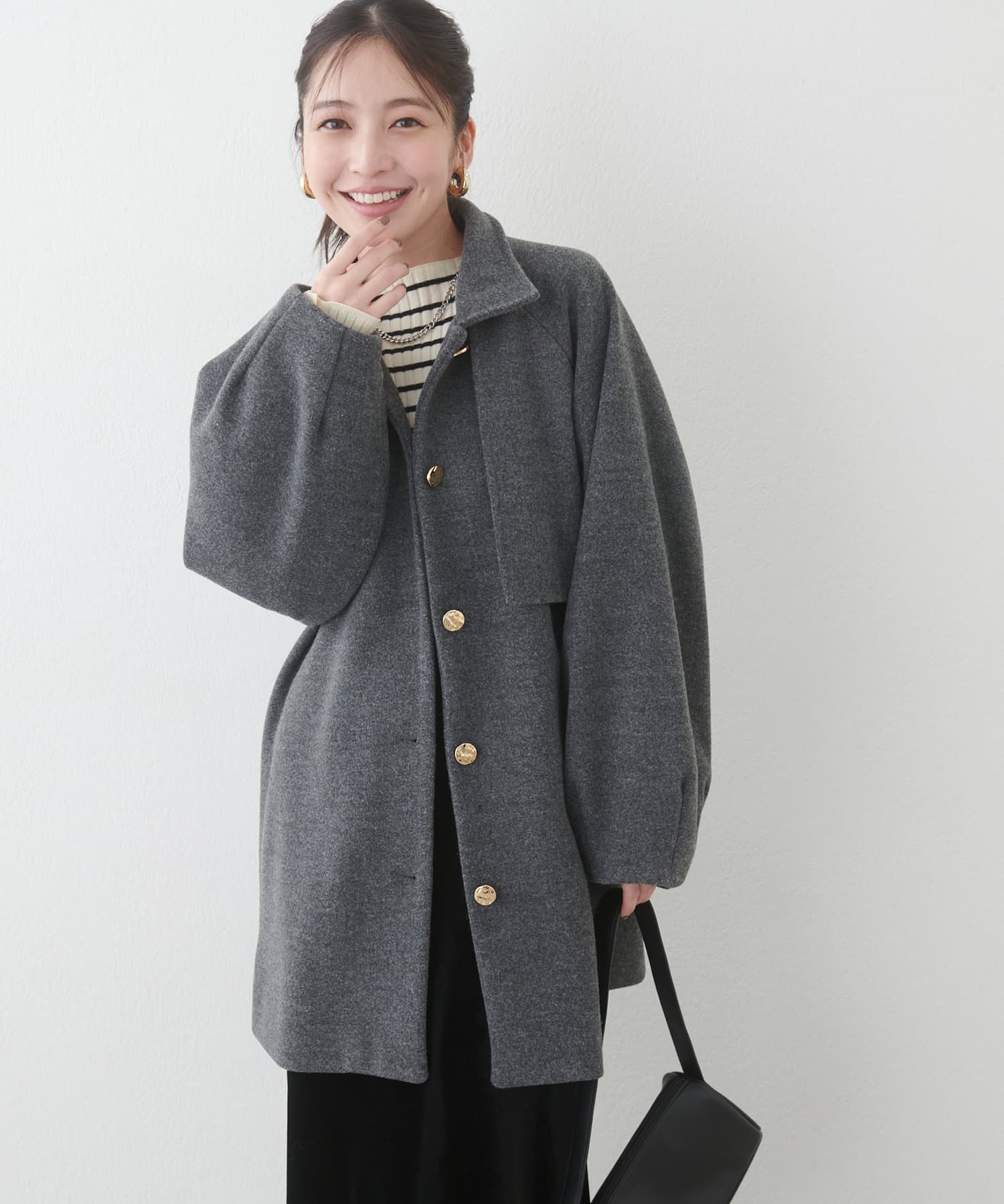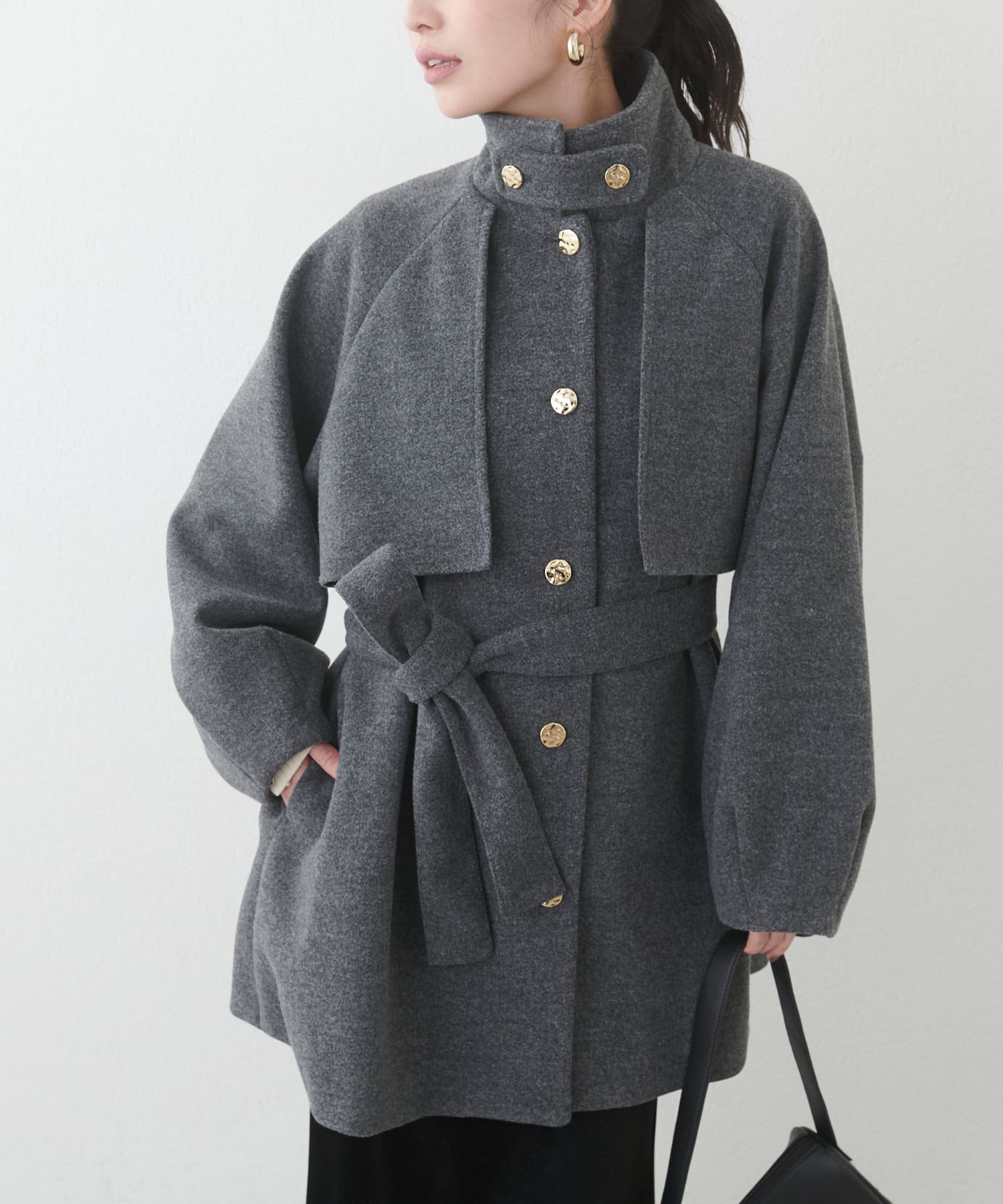 フェミニンバッグはカラーが選べるヨーク付きのスタンドカラーコートに加えて