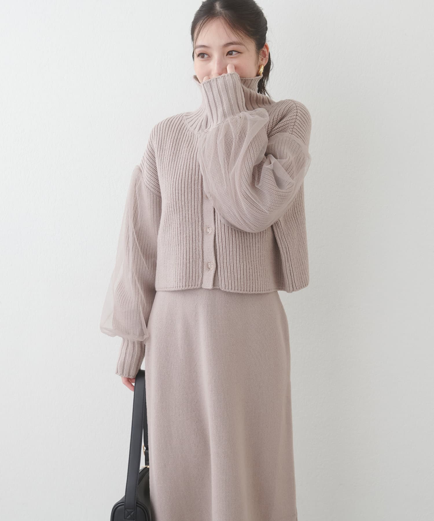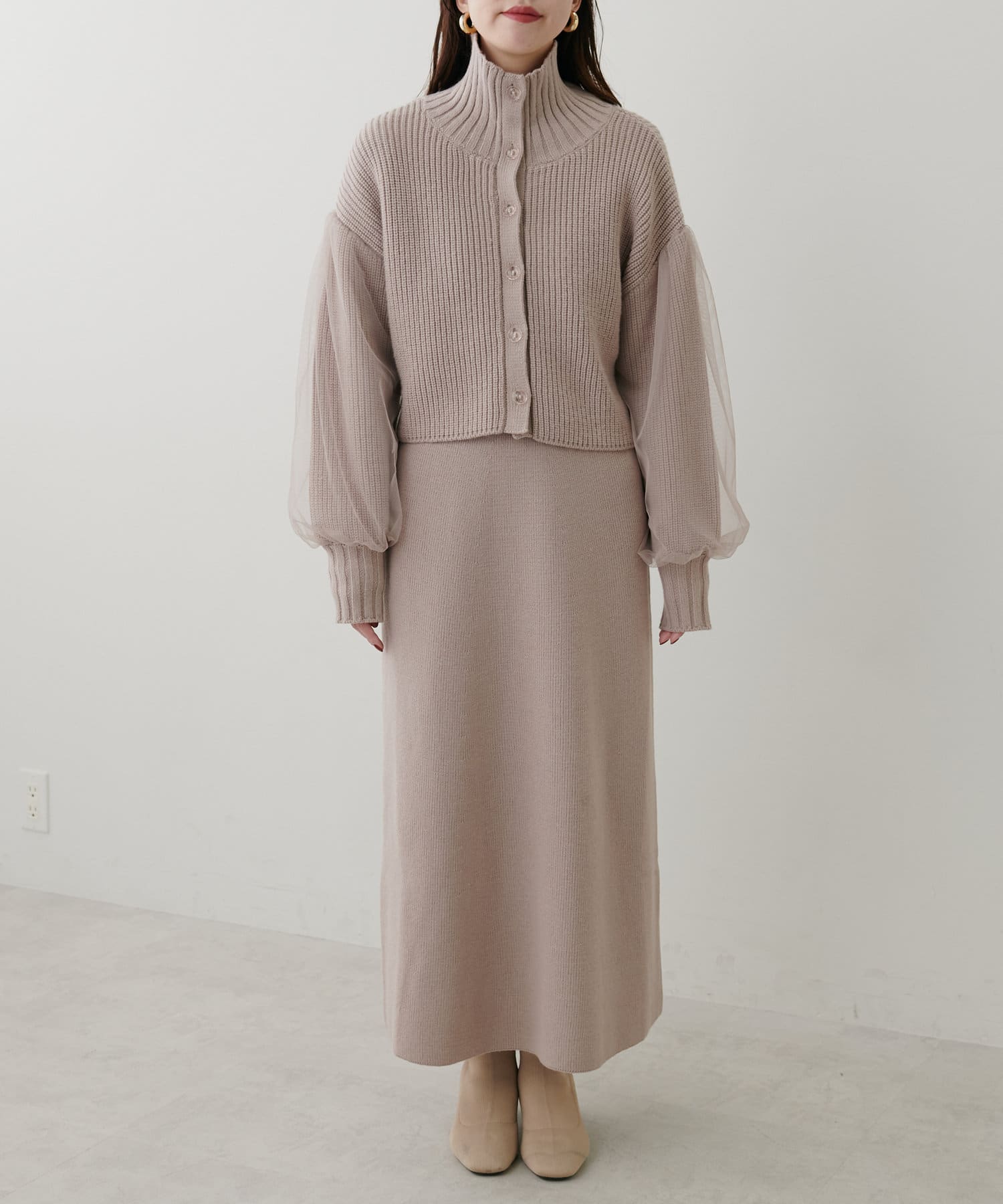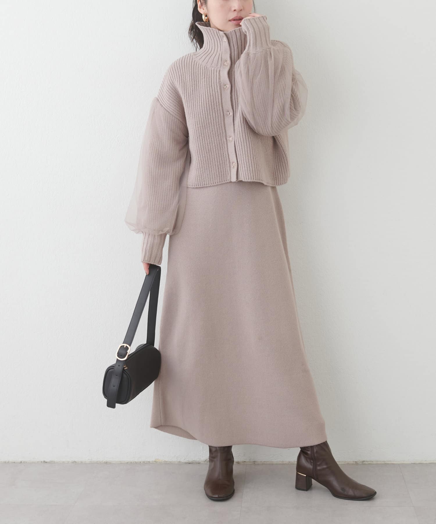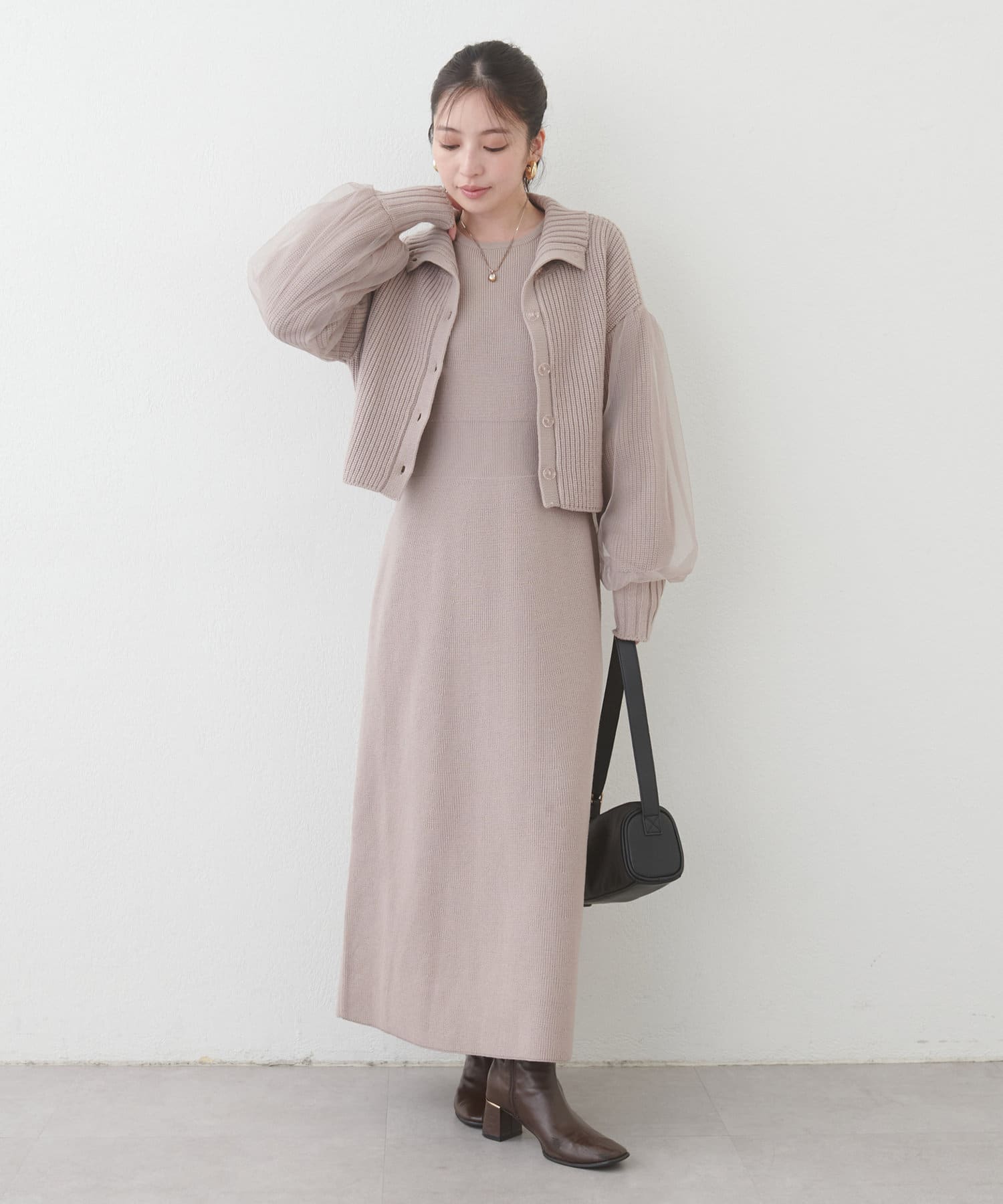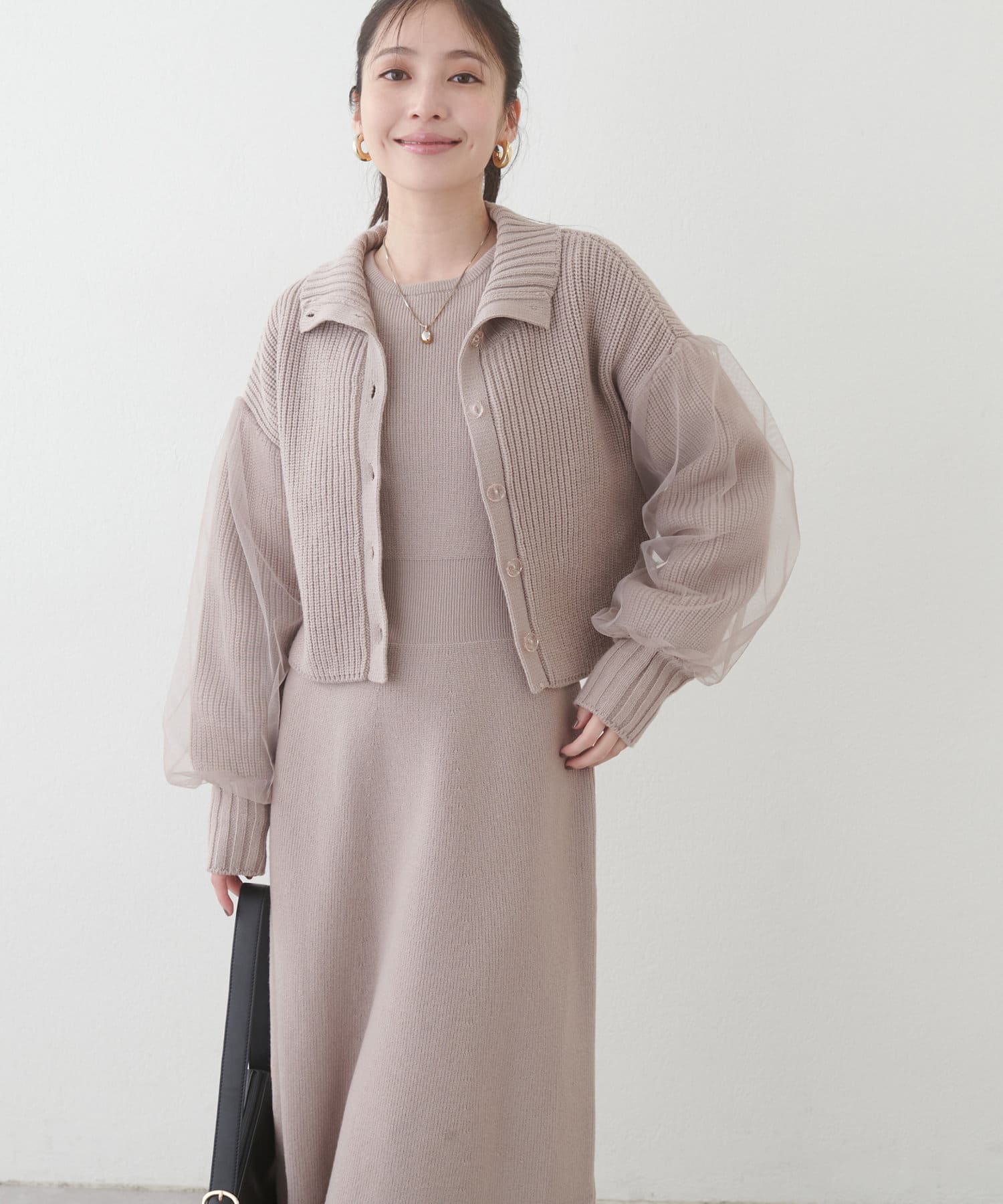 1枚で着ても、袖チュールカーディガンと合わせても使える万能ニットワンピース。