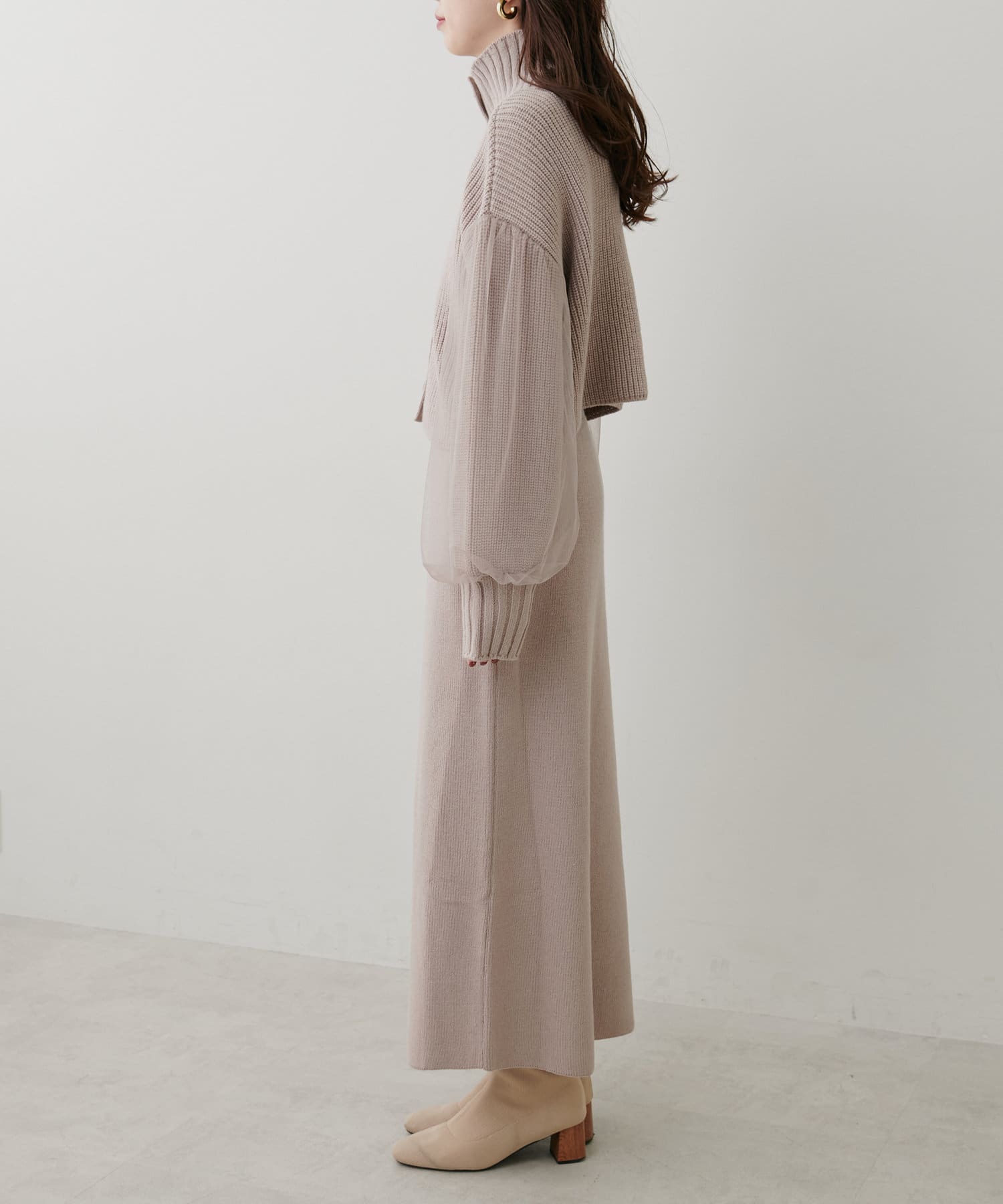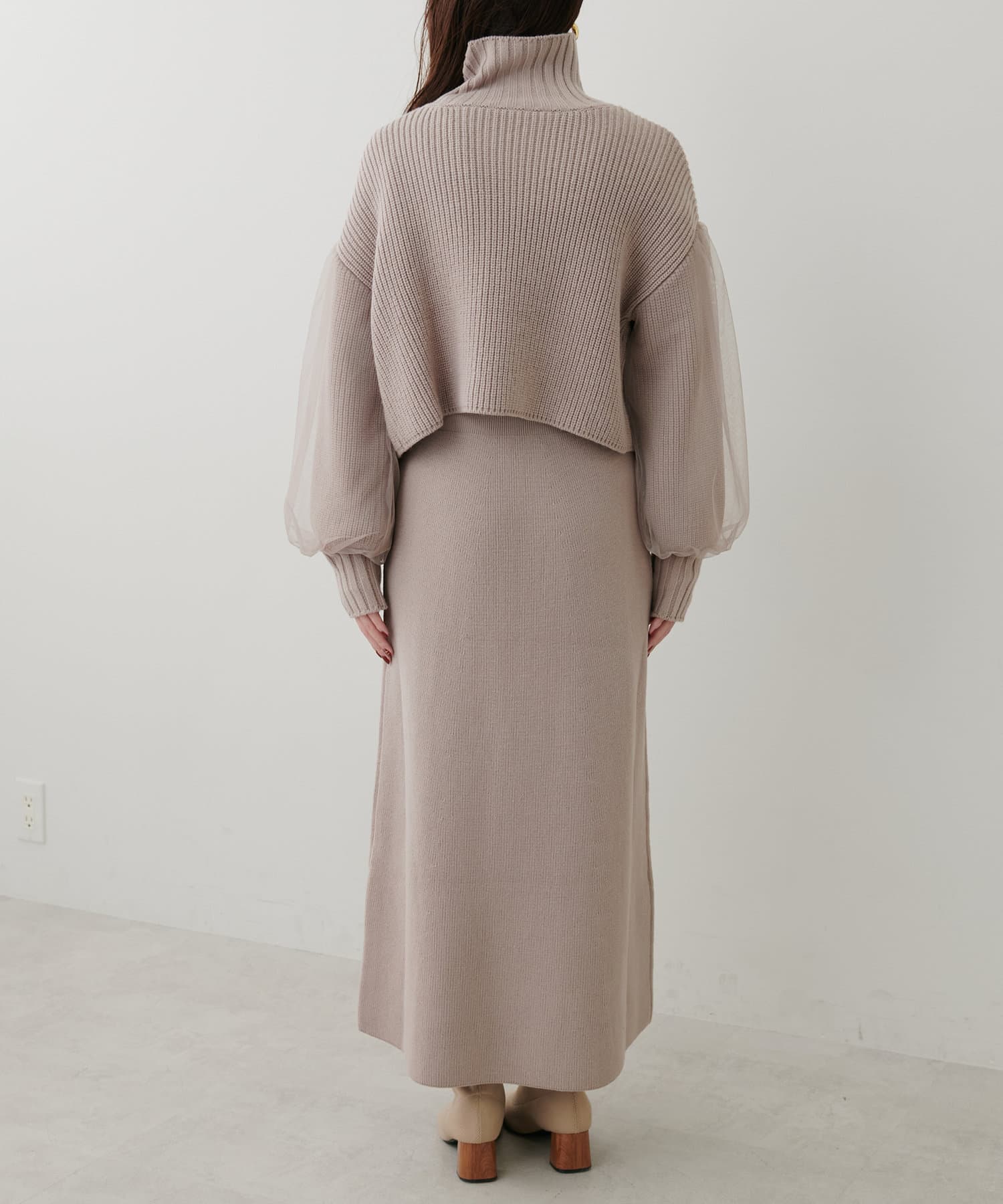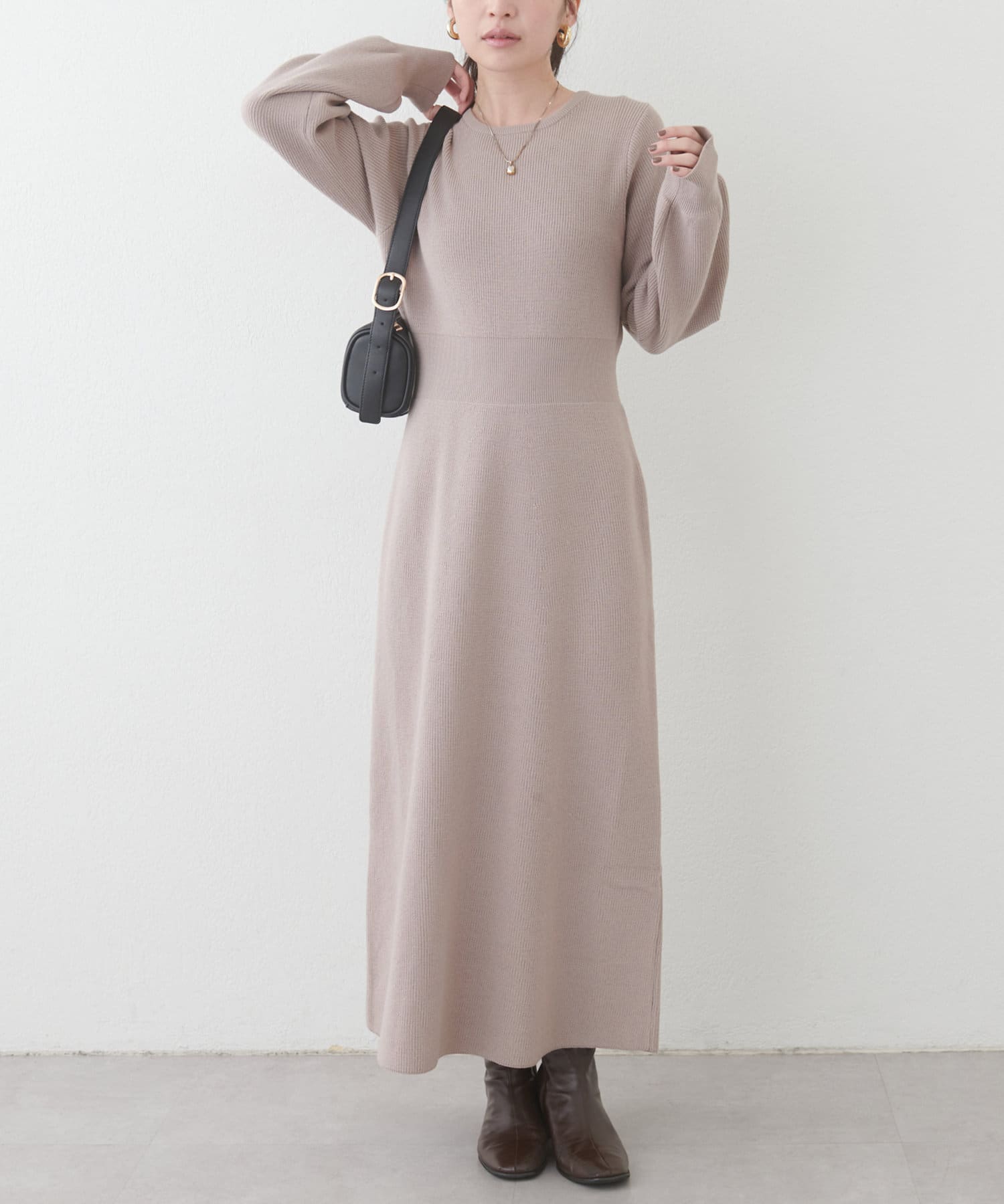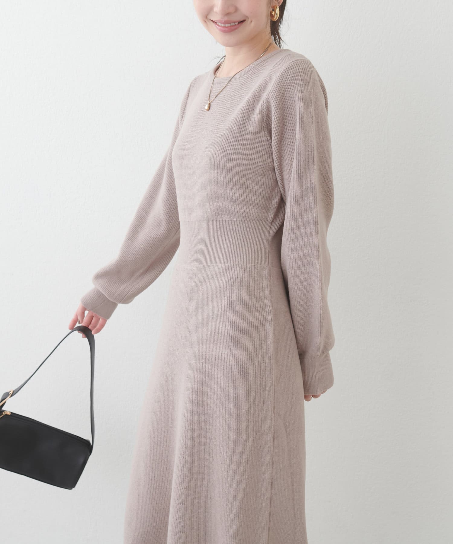 1枚で着ても、袖チュールカーディガンと合わせても使える万能ニットワンピース。