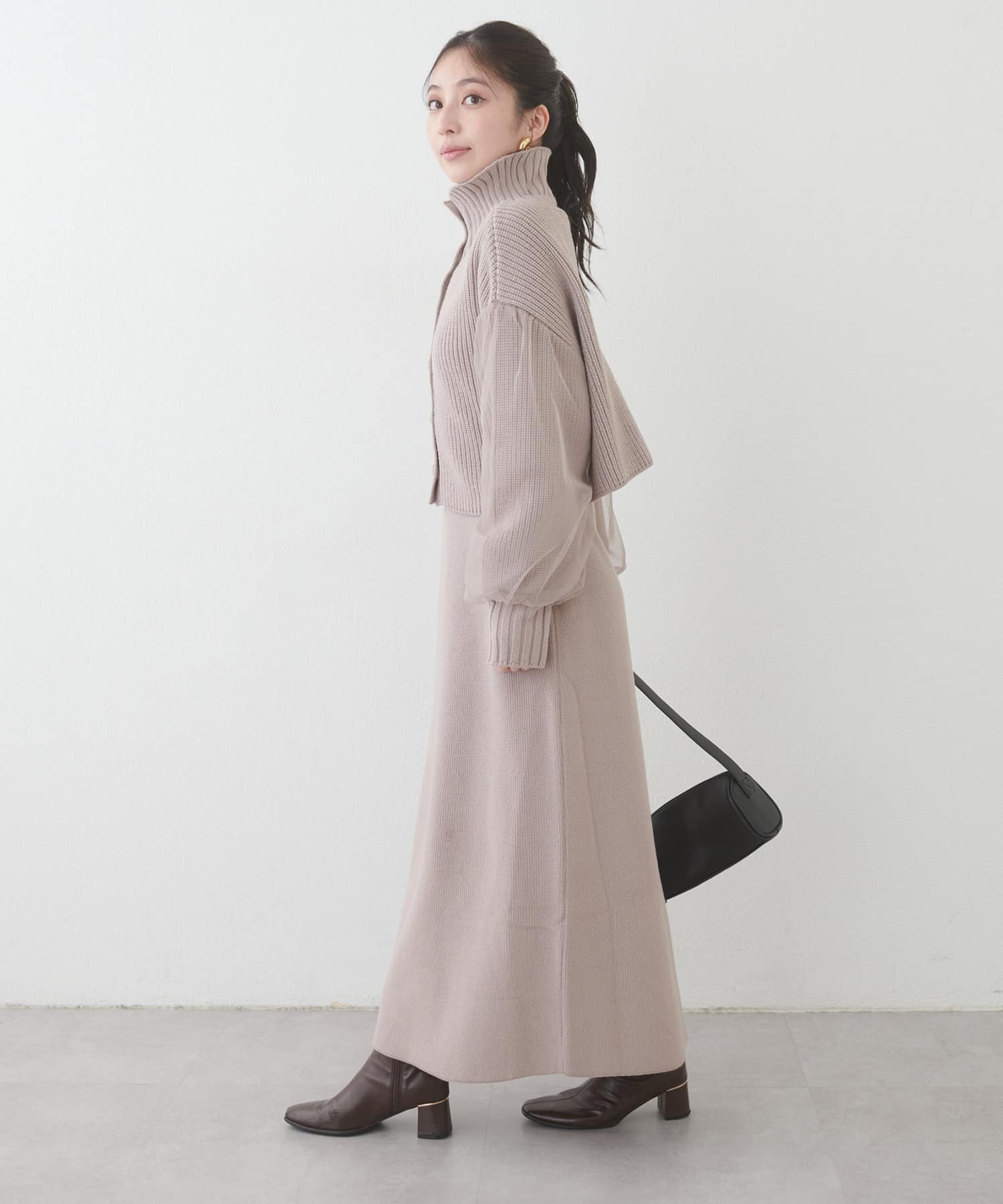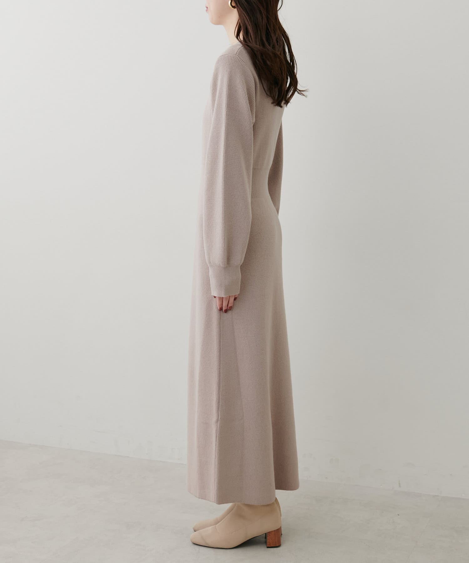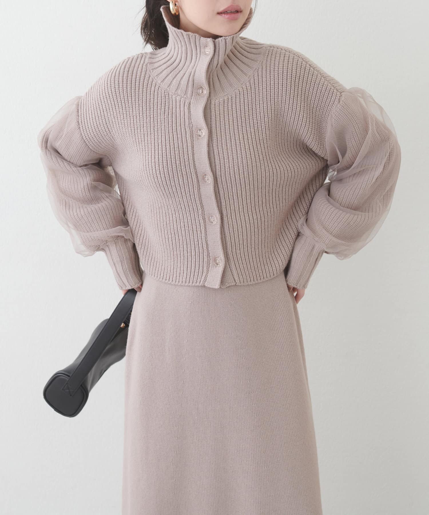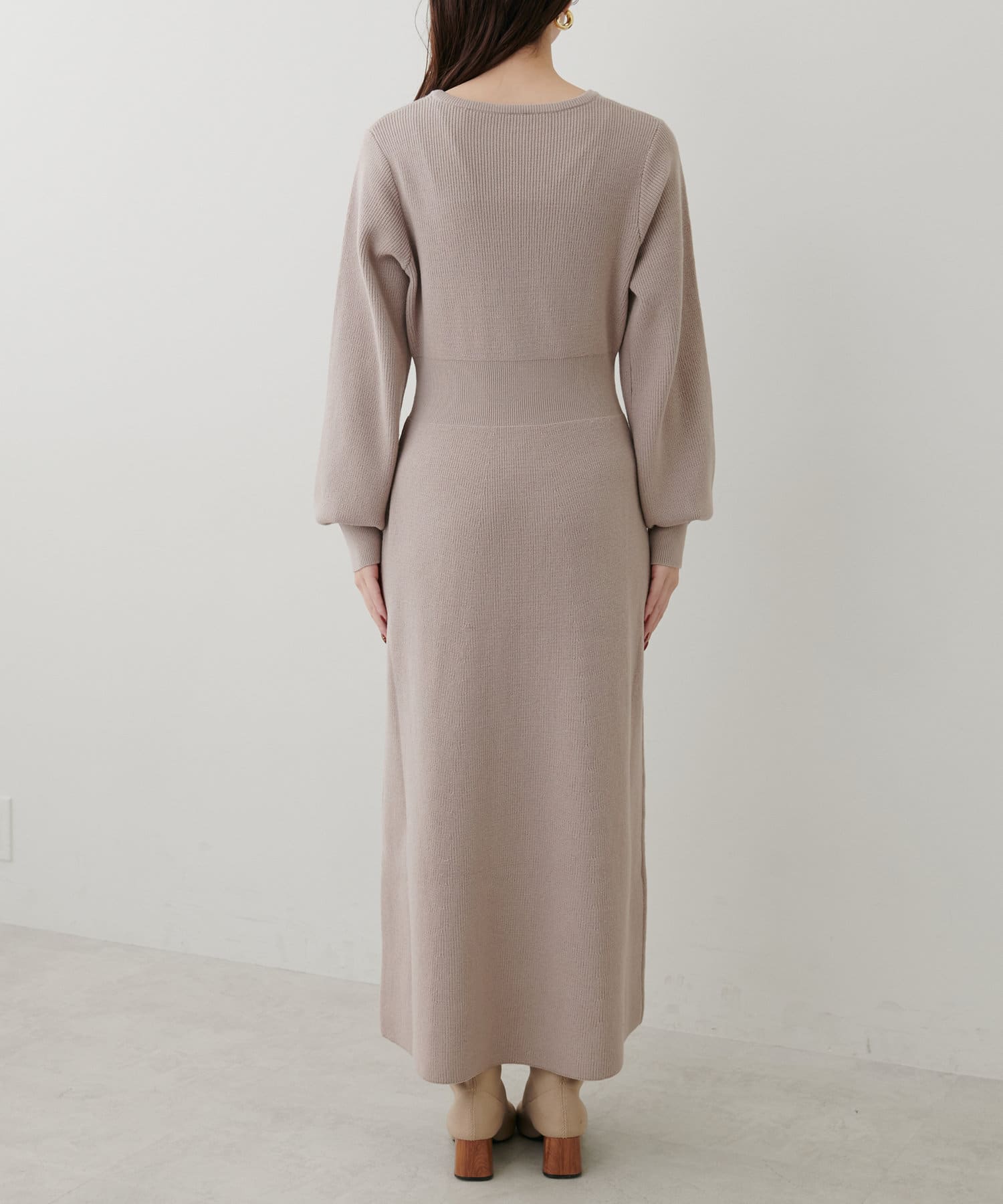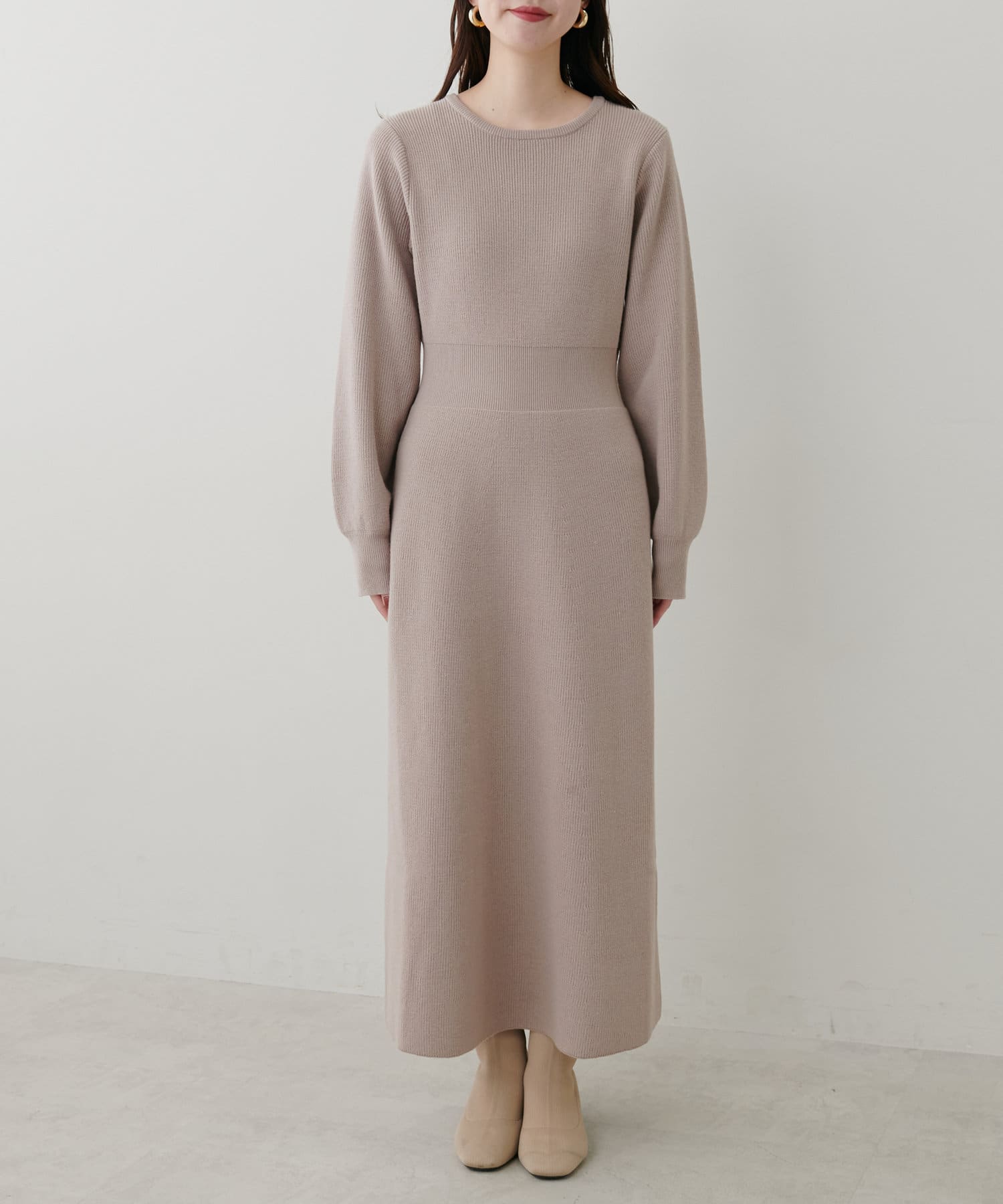 1枚で着ても、袖チュールカーディガンと合わせても使える万能ニットワンピース。