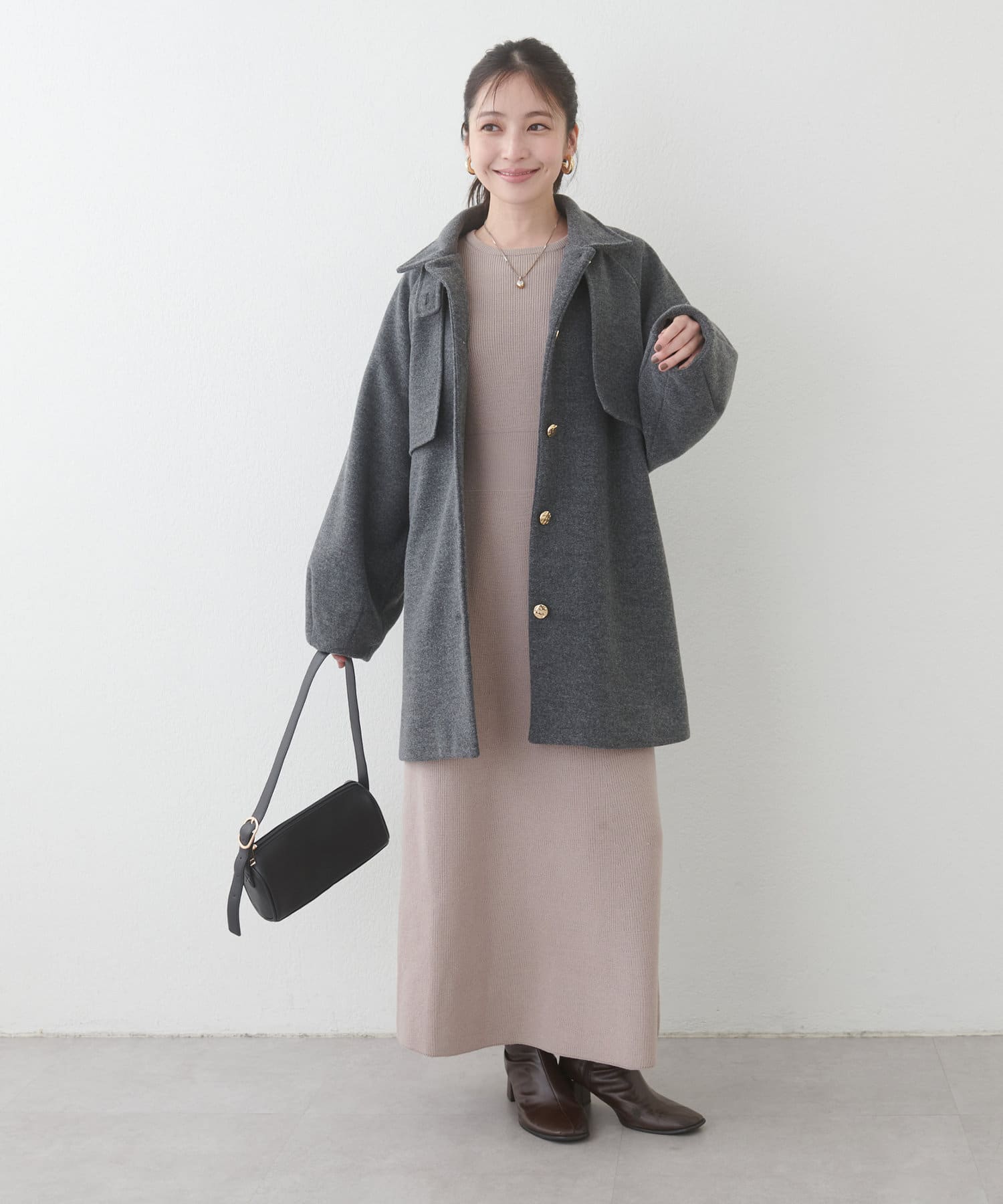 低身長でも着やすい丈感のニットワンピースと、バランスよく使えるミドル丈のコートがとってもお気に入りです♪