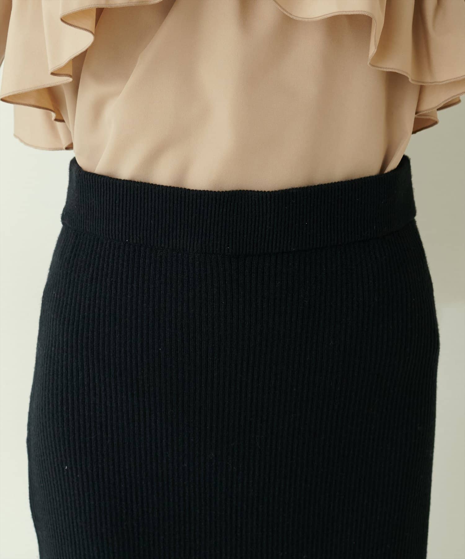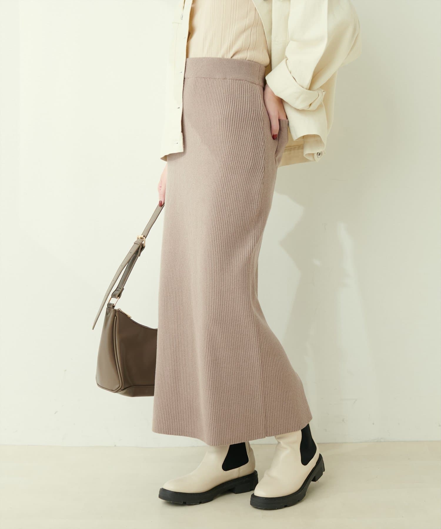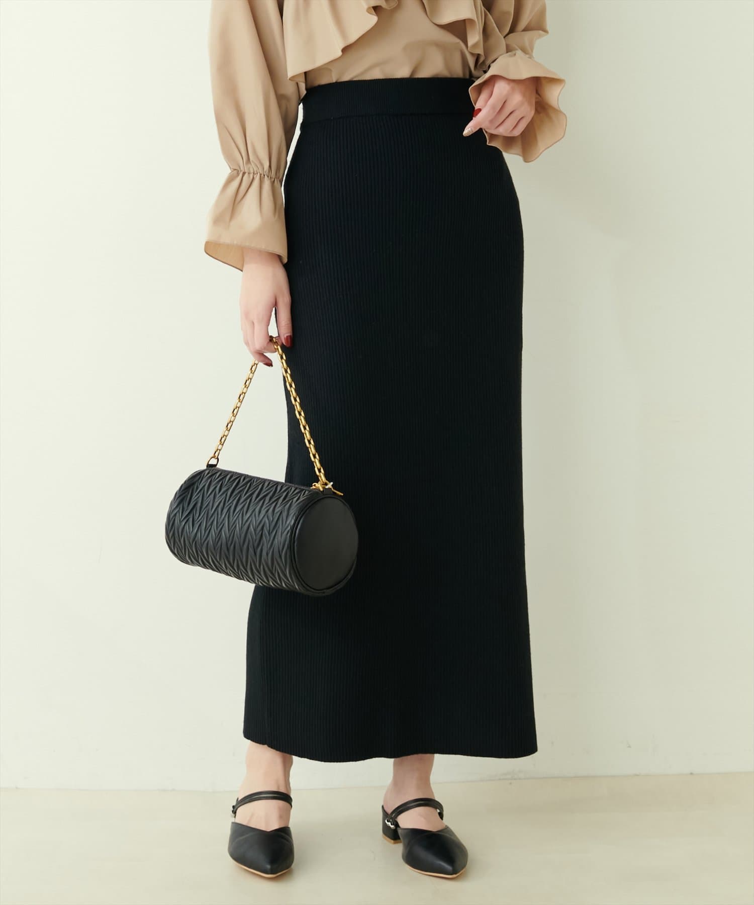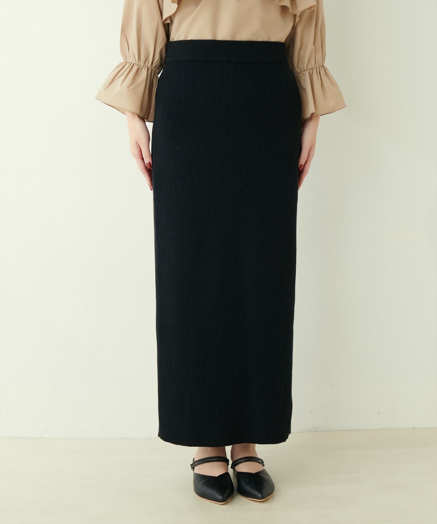 Iラインシルエットが華奢見えを叶えるリブニットスカート。