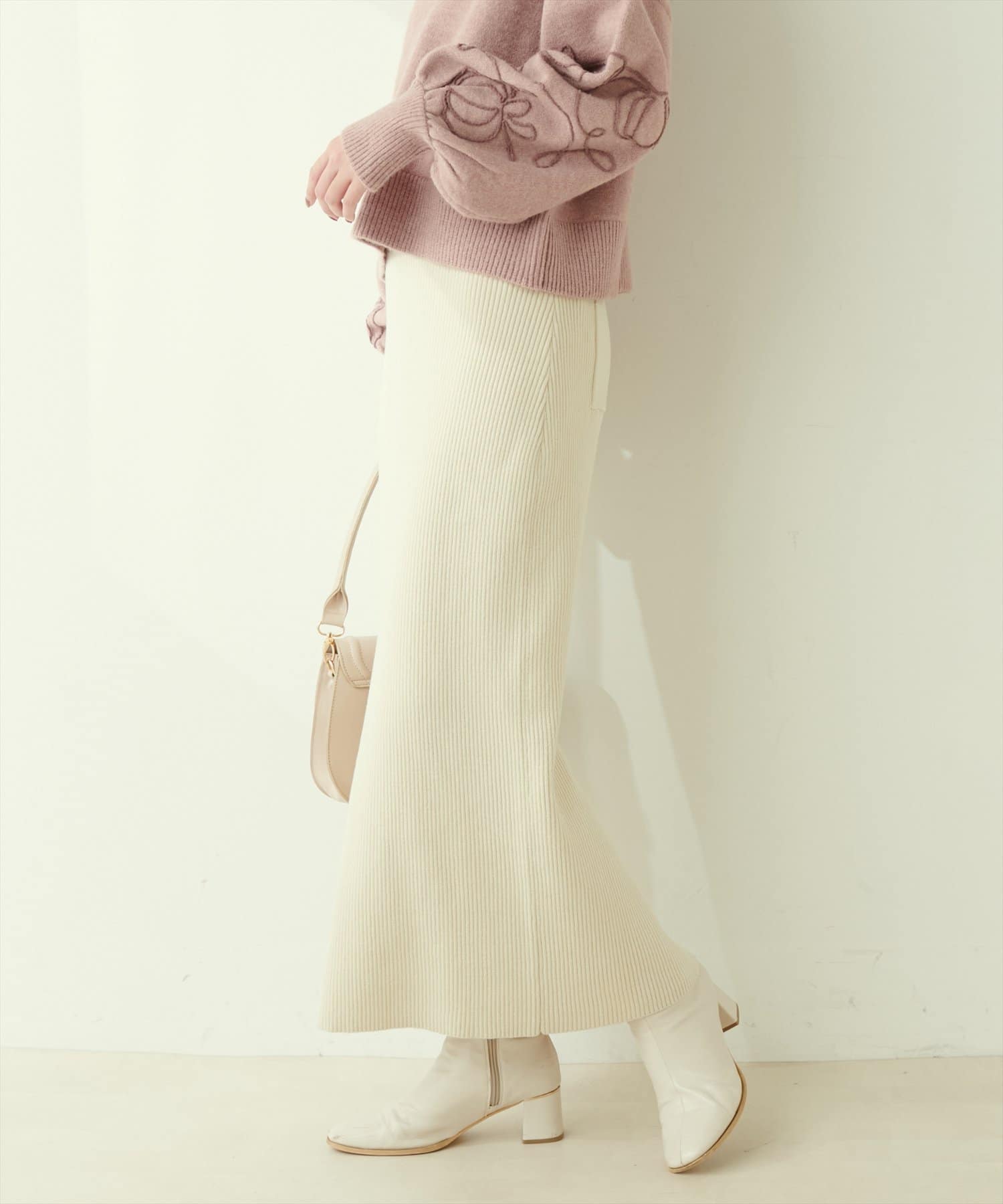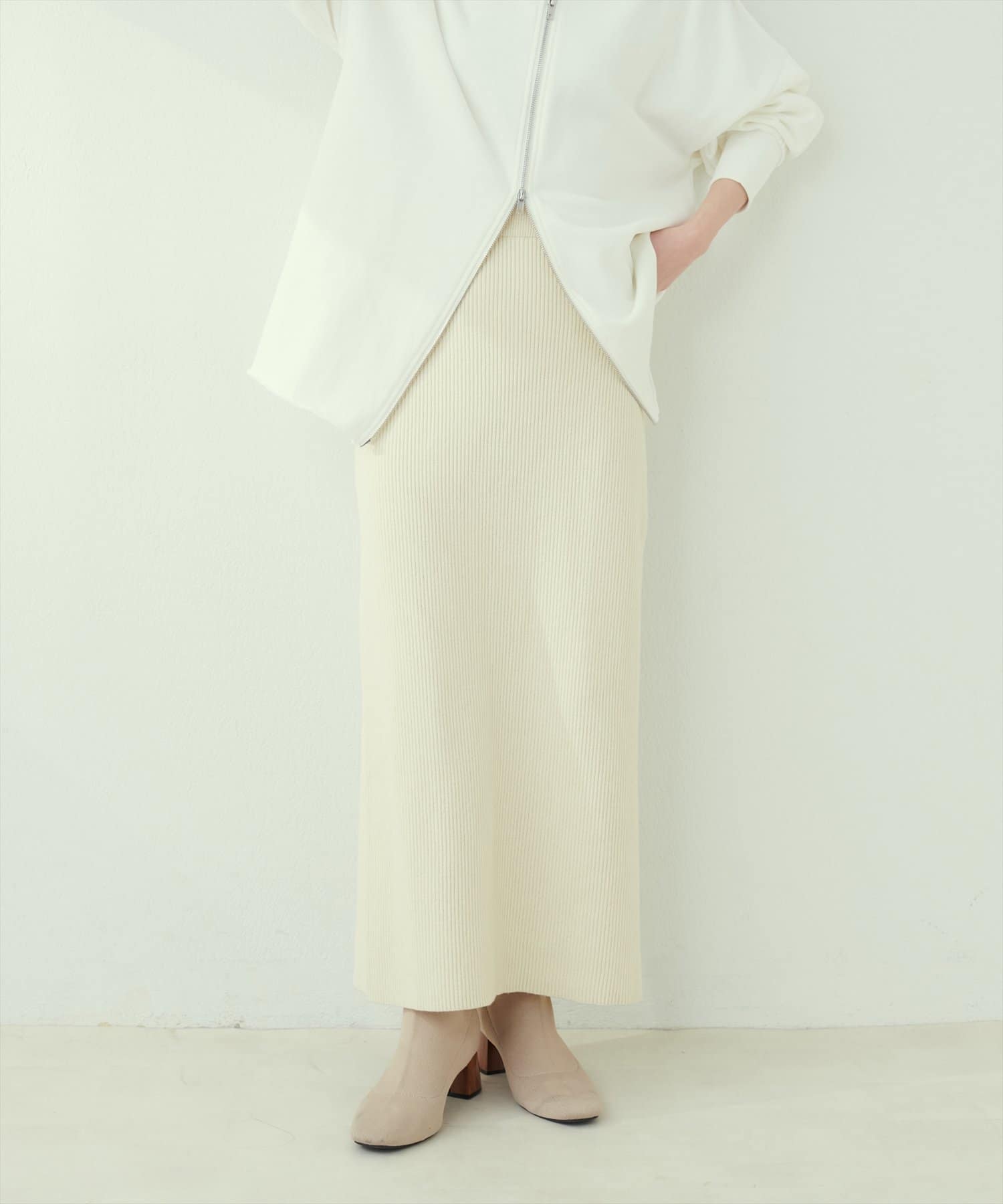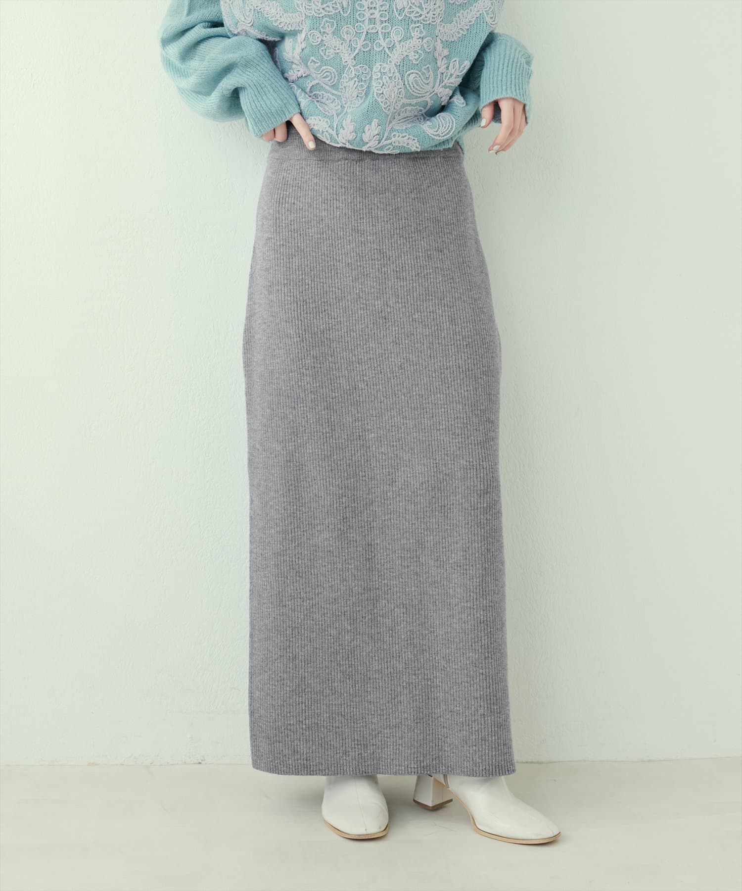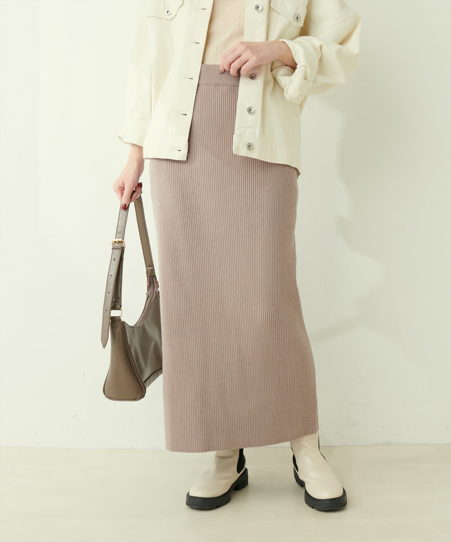 Iラインシルエットが華奢見えを叶えるリブニットスカート。
