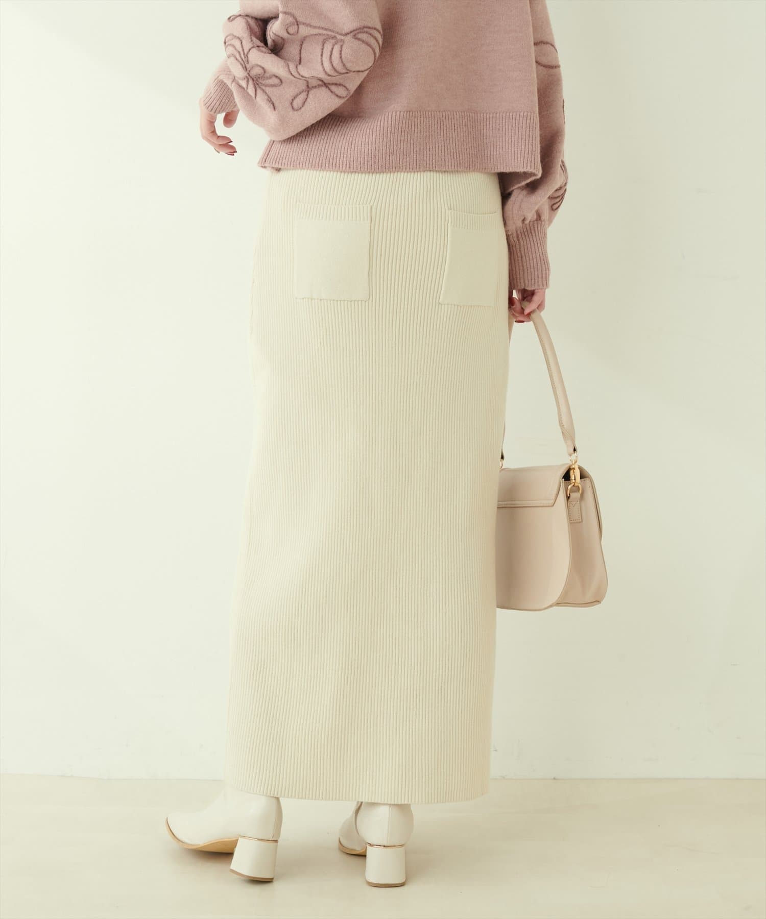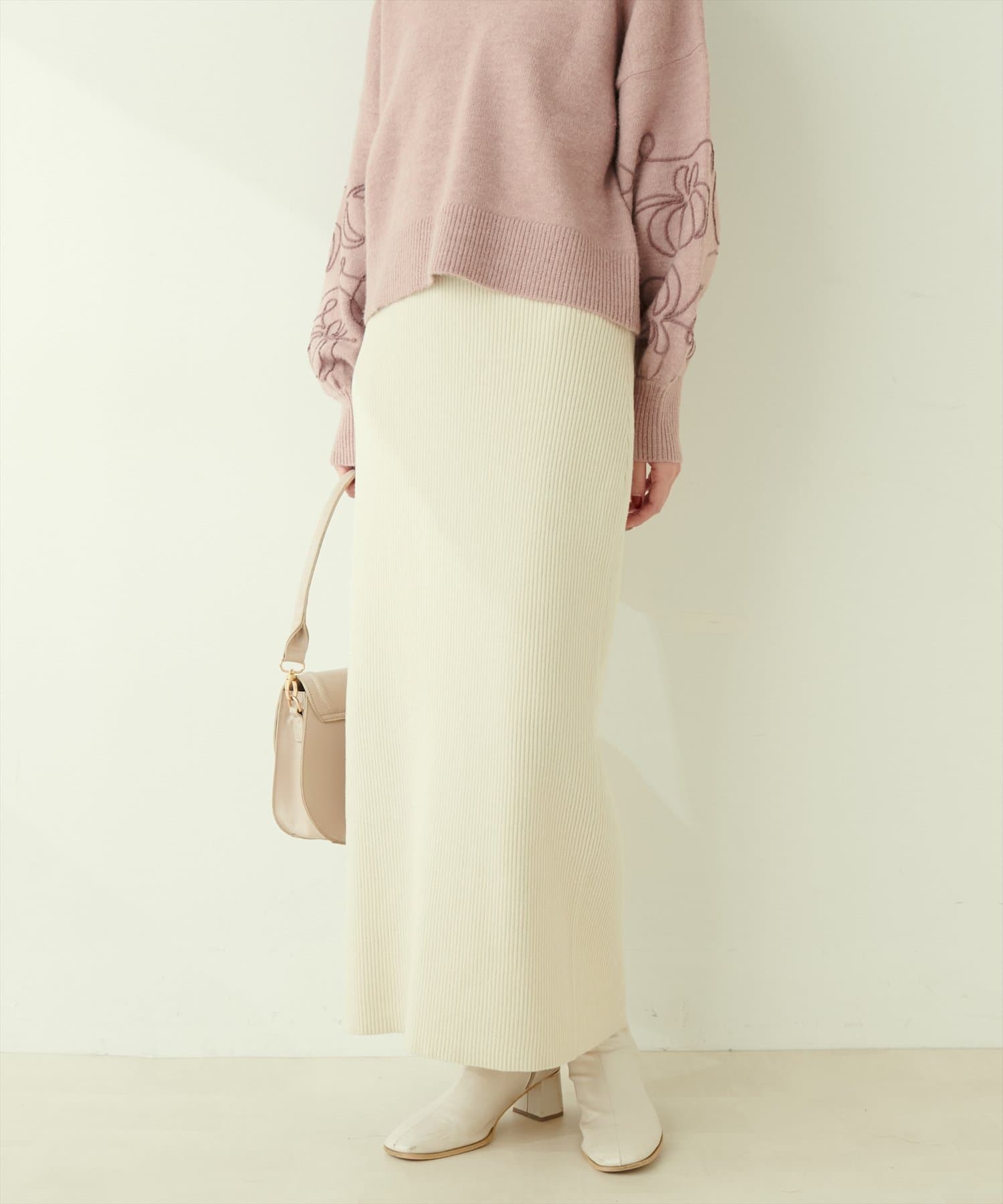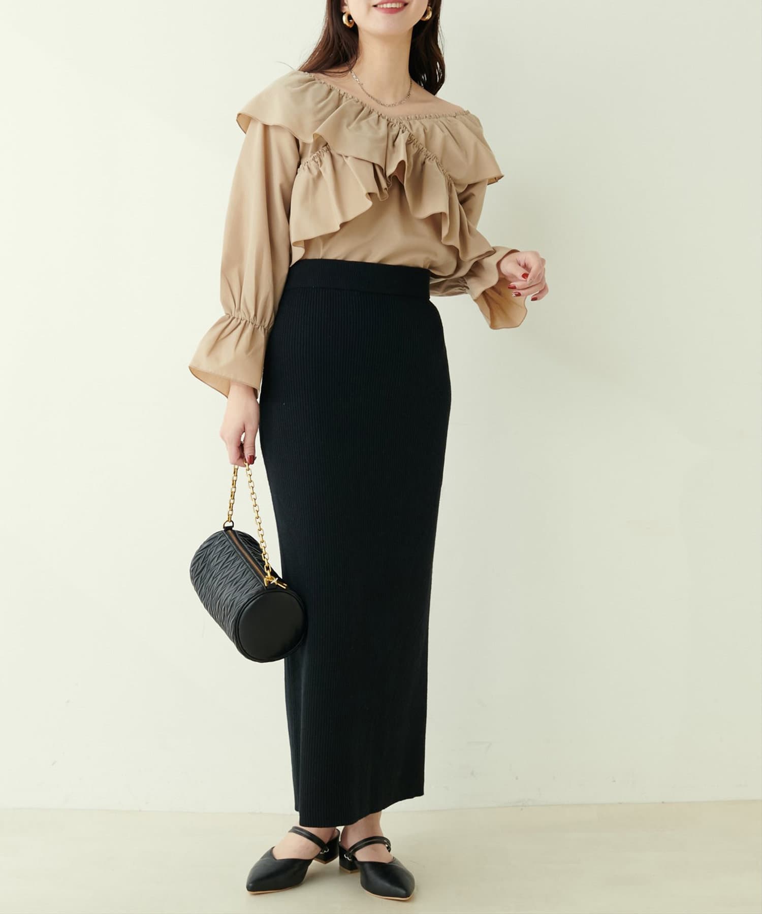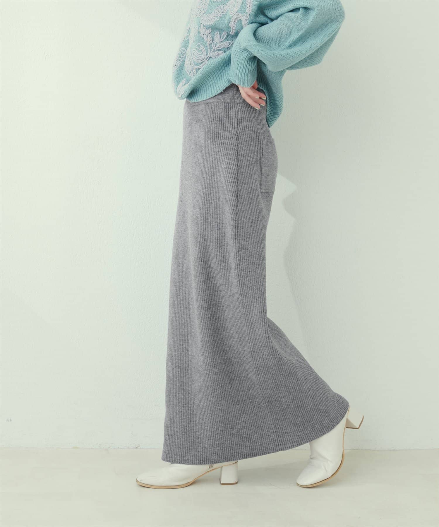Iラインシルエットが華奢見えを叶えるリブニットスカート。