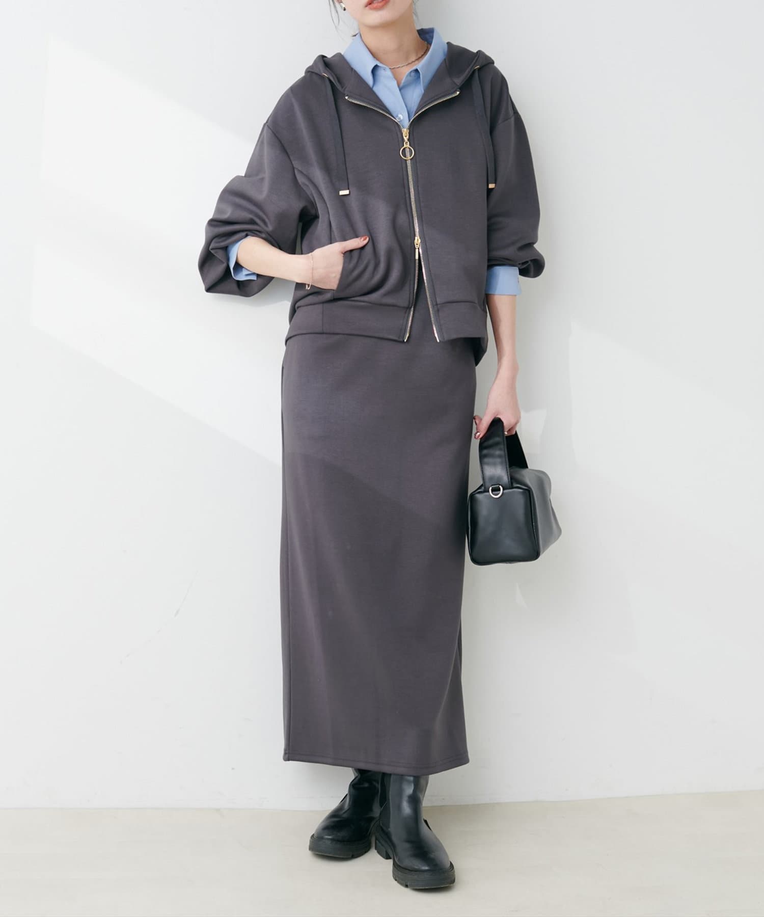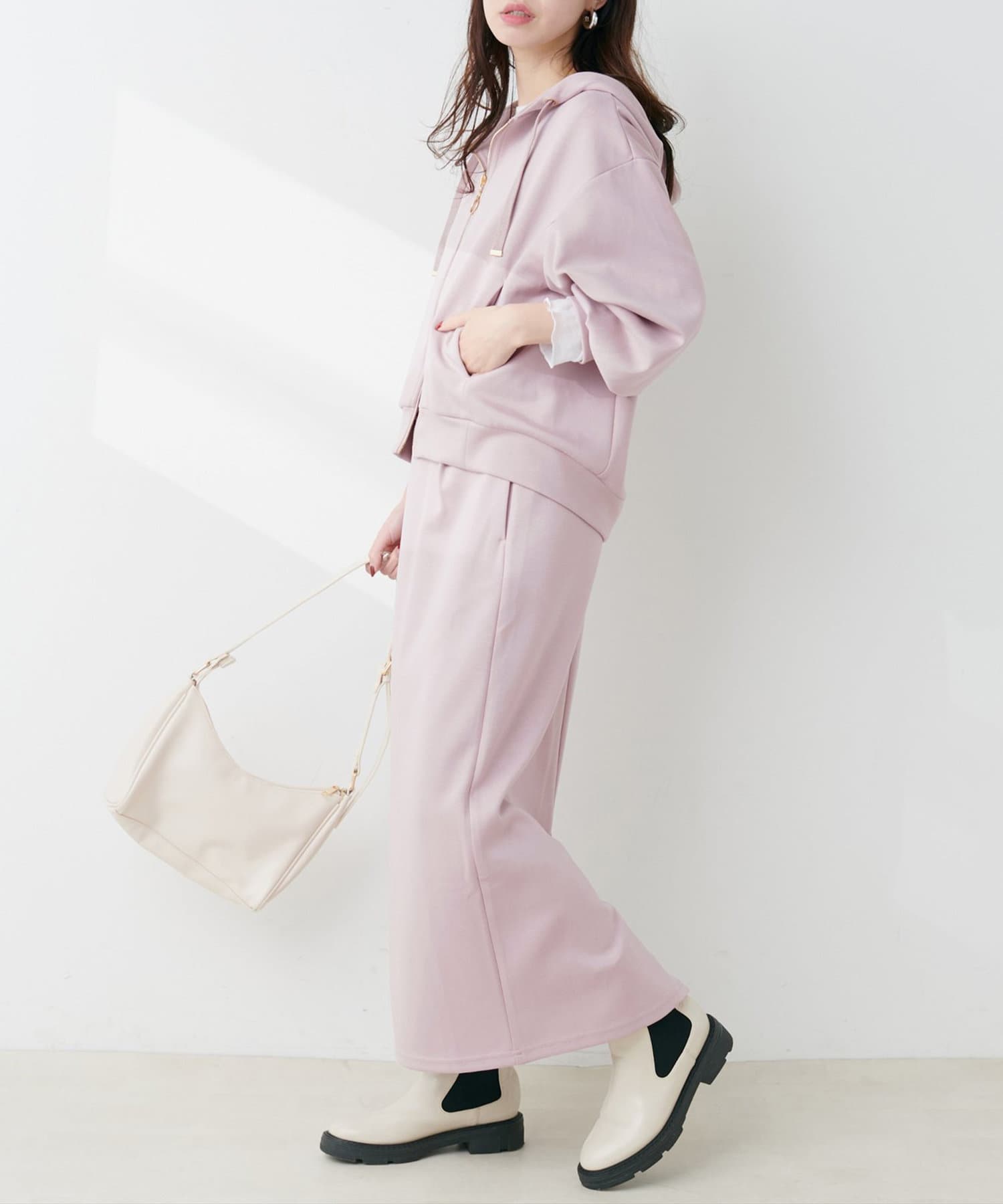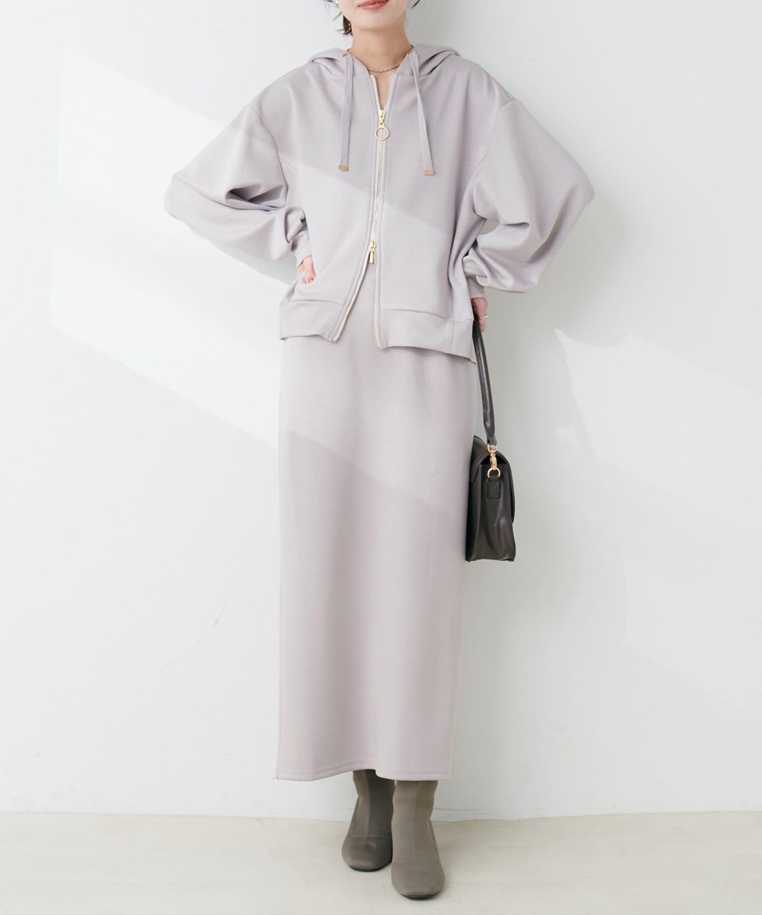同素材の(0351060040 ふわもちWZIPパーカー)とセットアップ合わせでカチッとしたジャケットなどを羽織り、こなれ感のあるスタイリングもおすすめです。