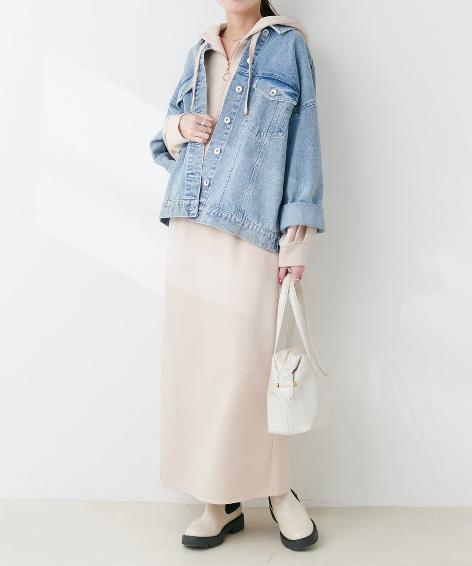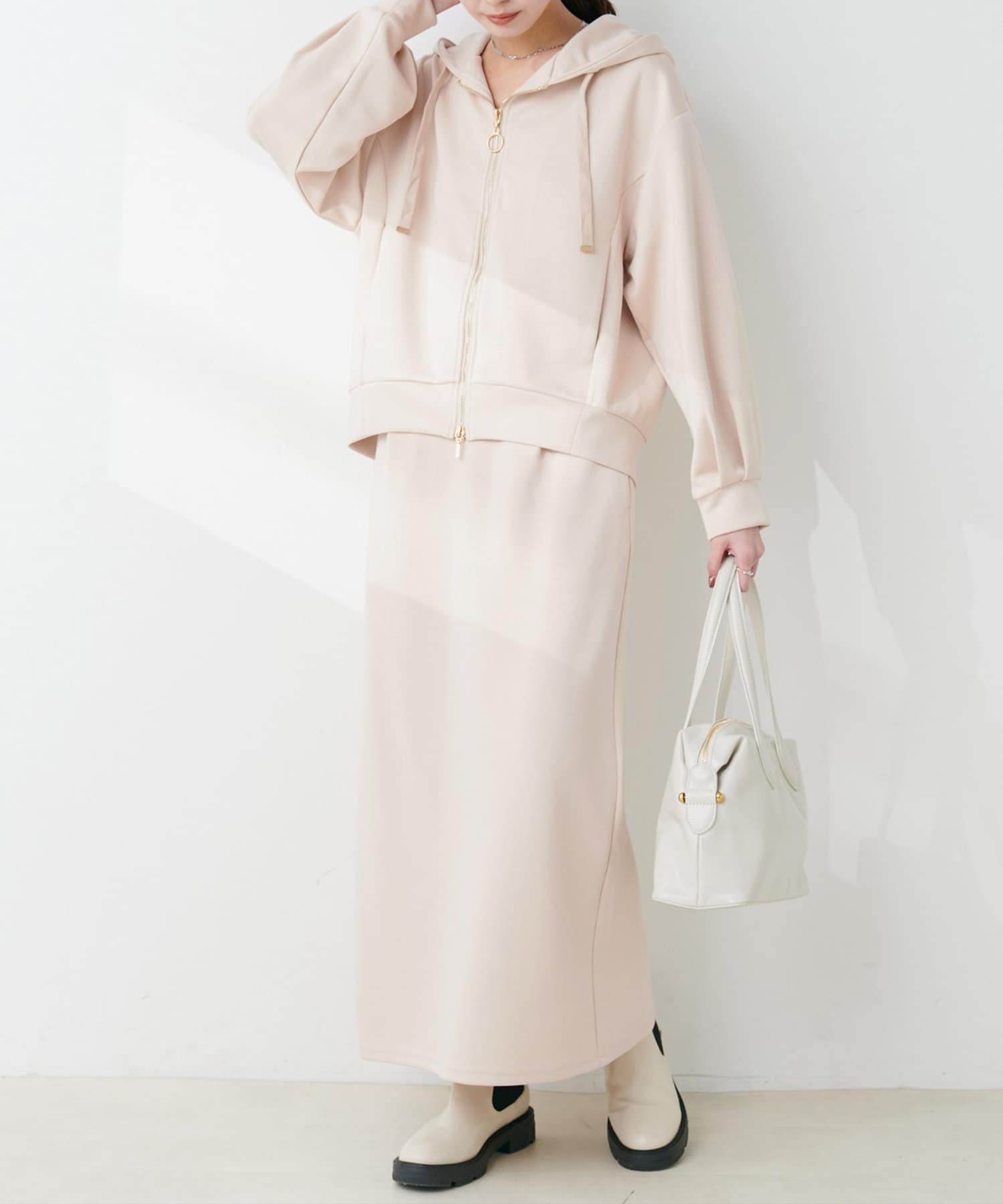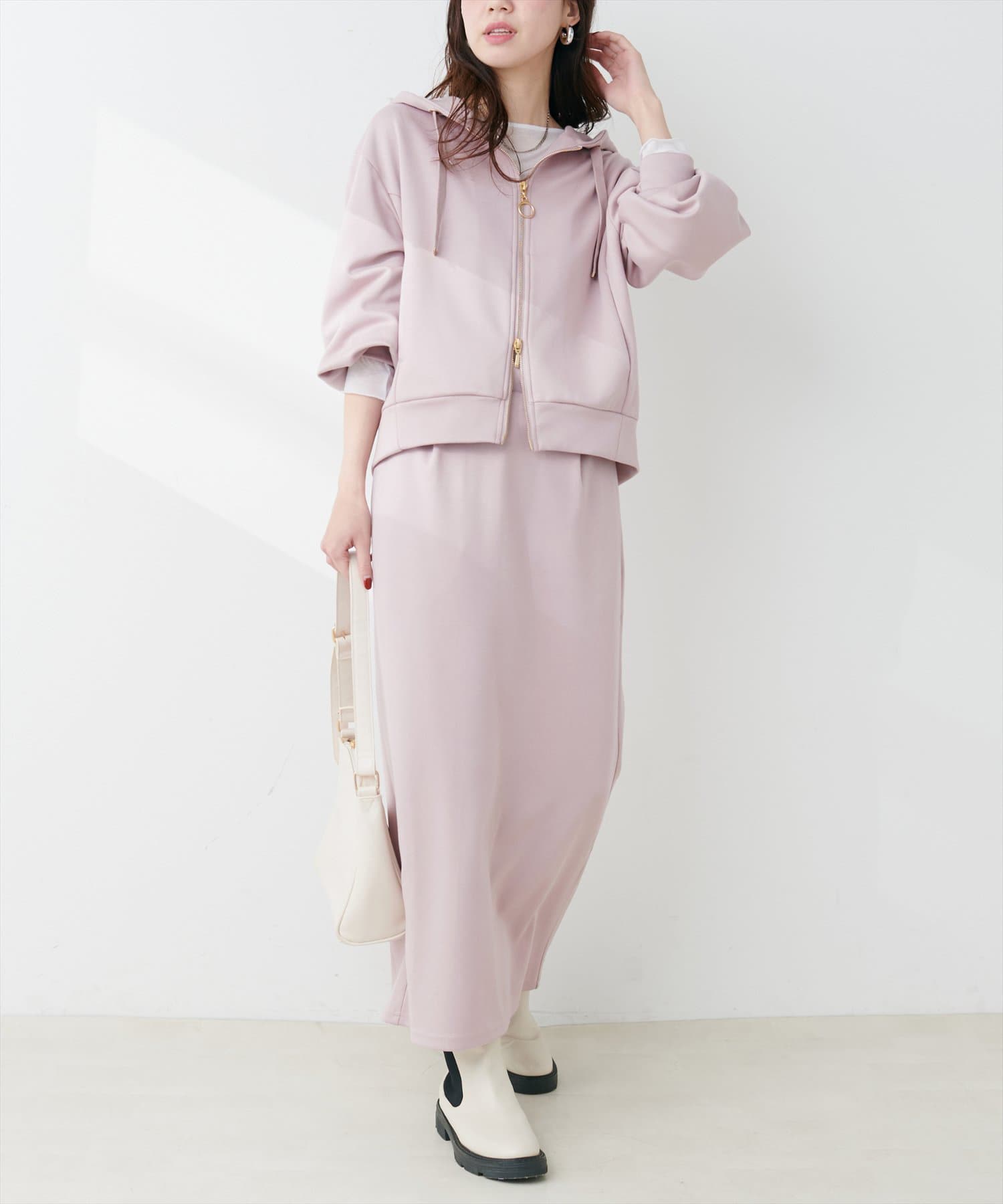 同素材の(0351060040 ふわもちWZIPパーカー)とセットアップ合わせでカチッとしたジャケットなどを羽織り、こなれ感のあるスタイリングもおすすめです。