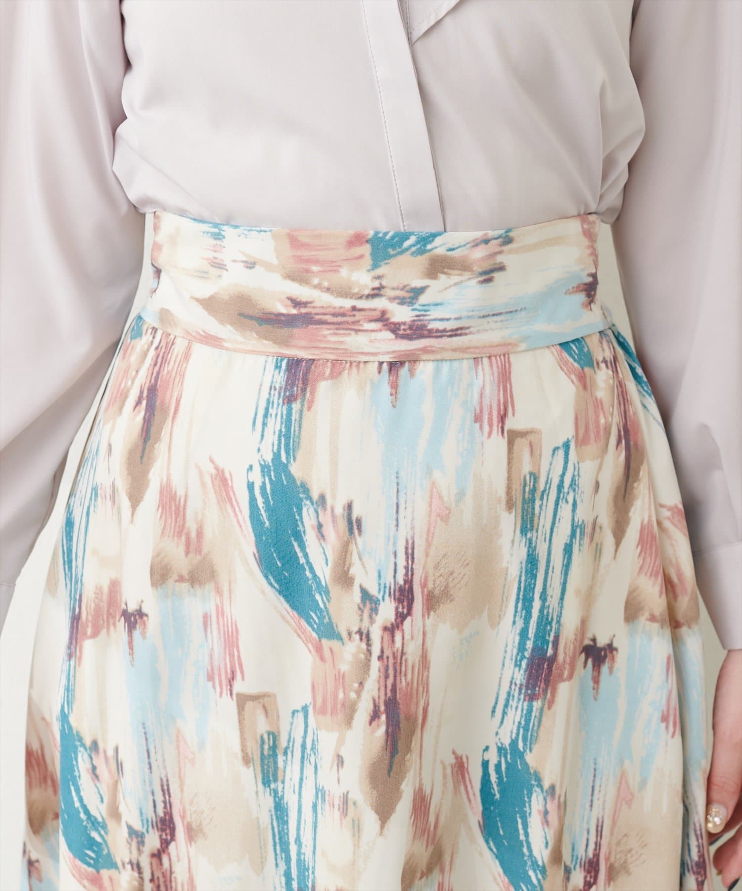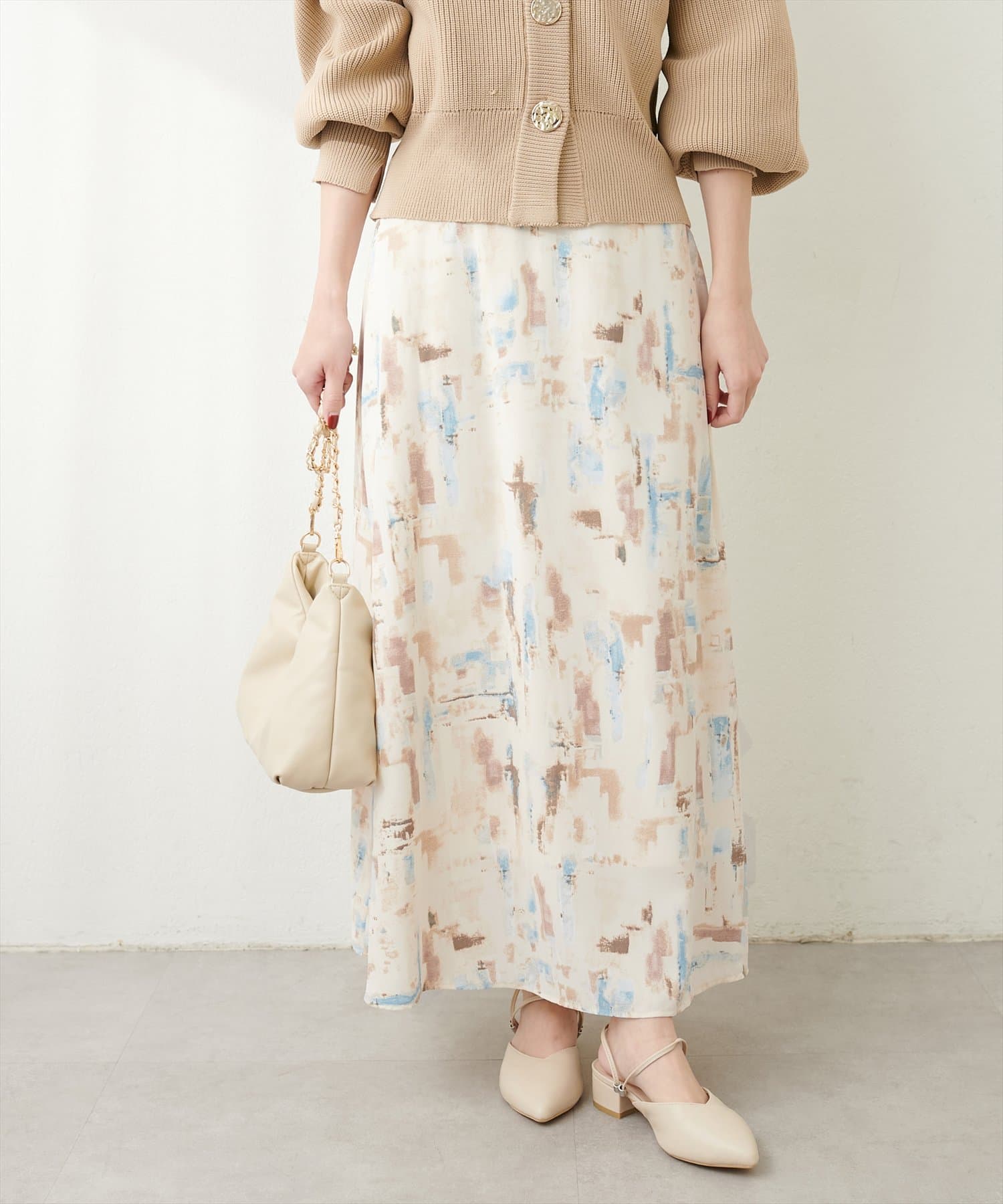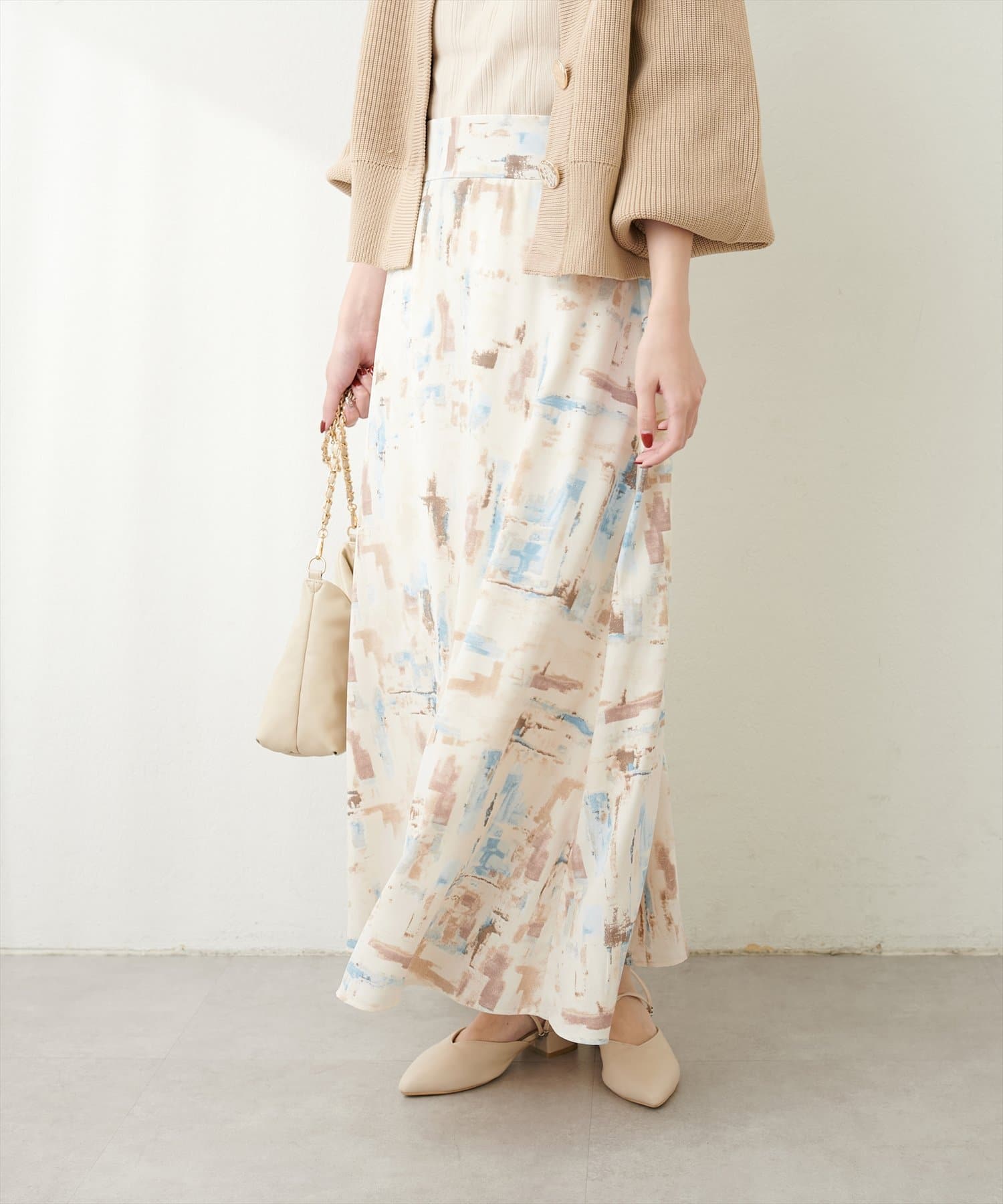 アート柄を全体にデザインし、裾にかけて緩やかなフレアラインに仕上げた、履くだけでお洒落感が増す1着。