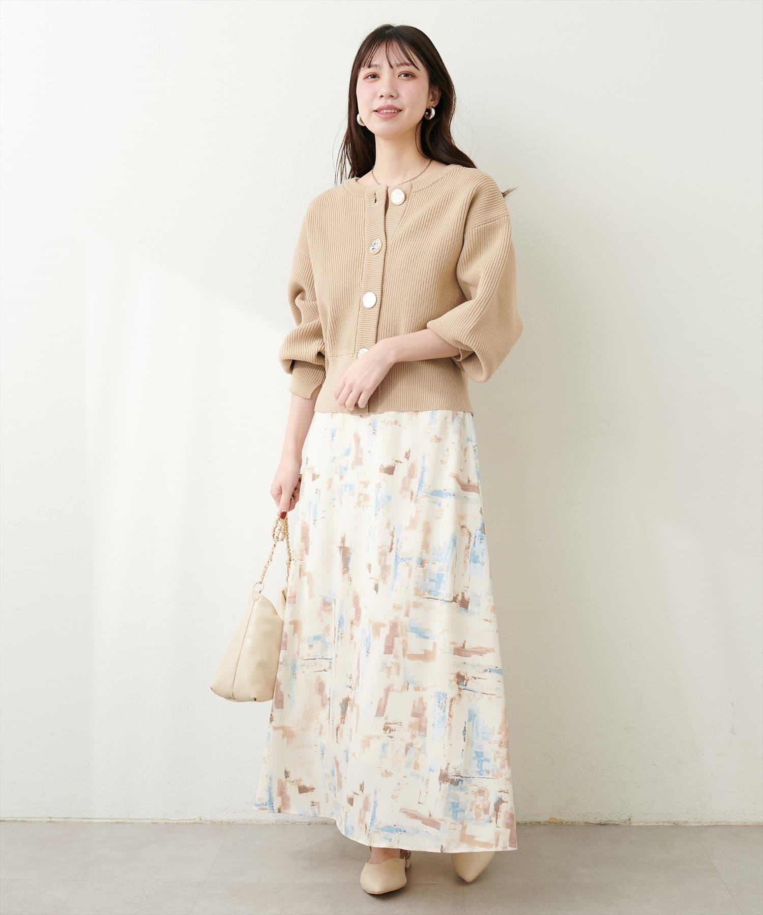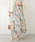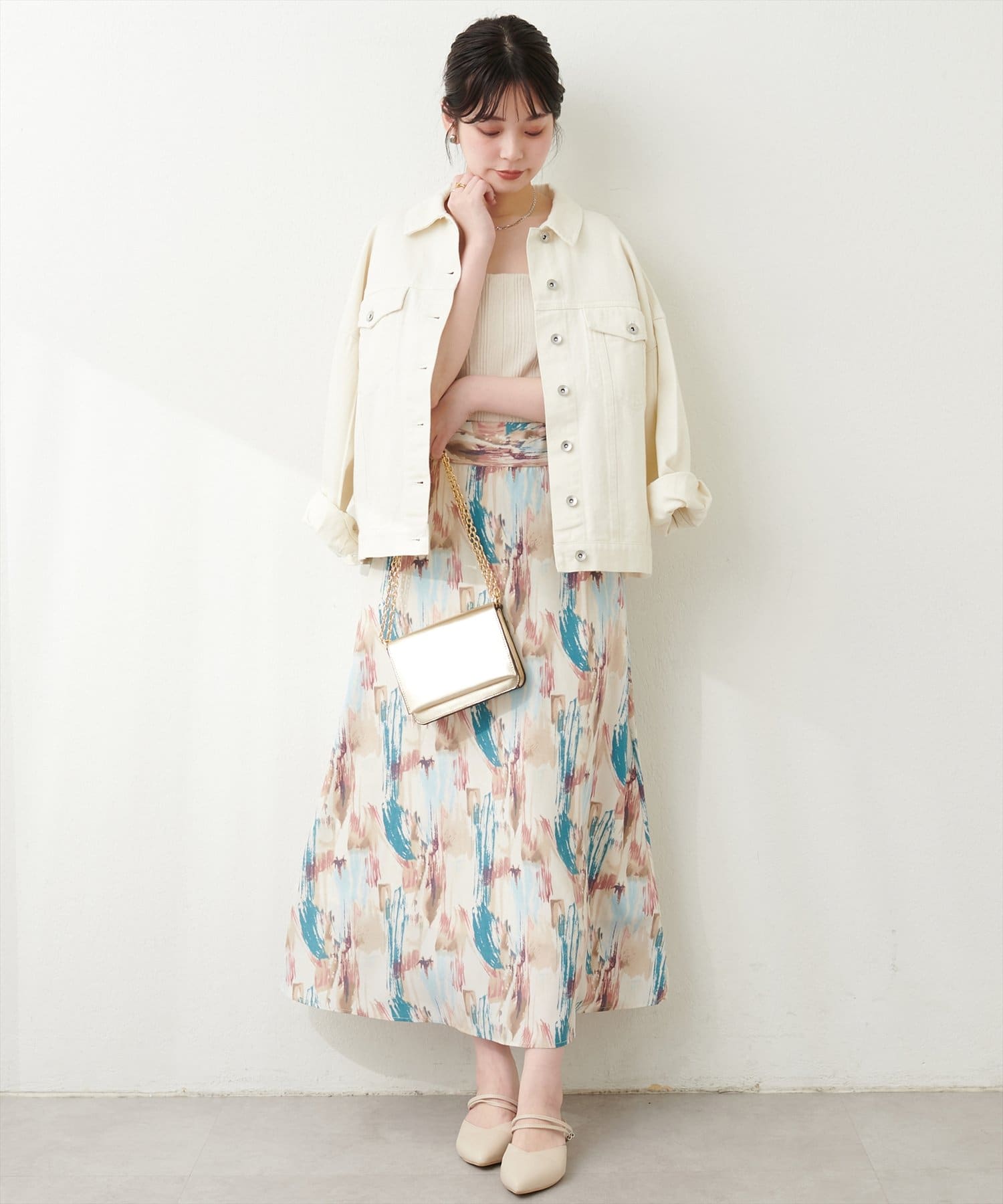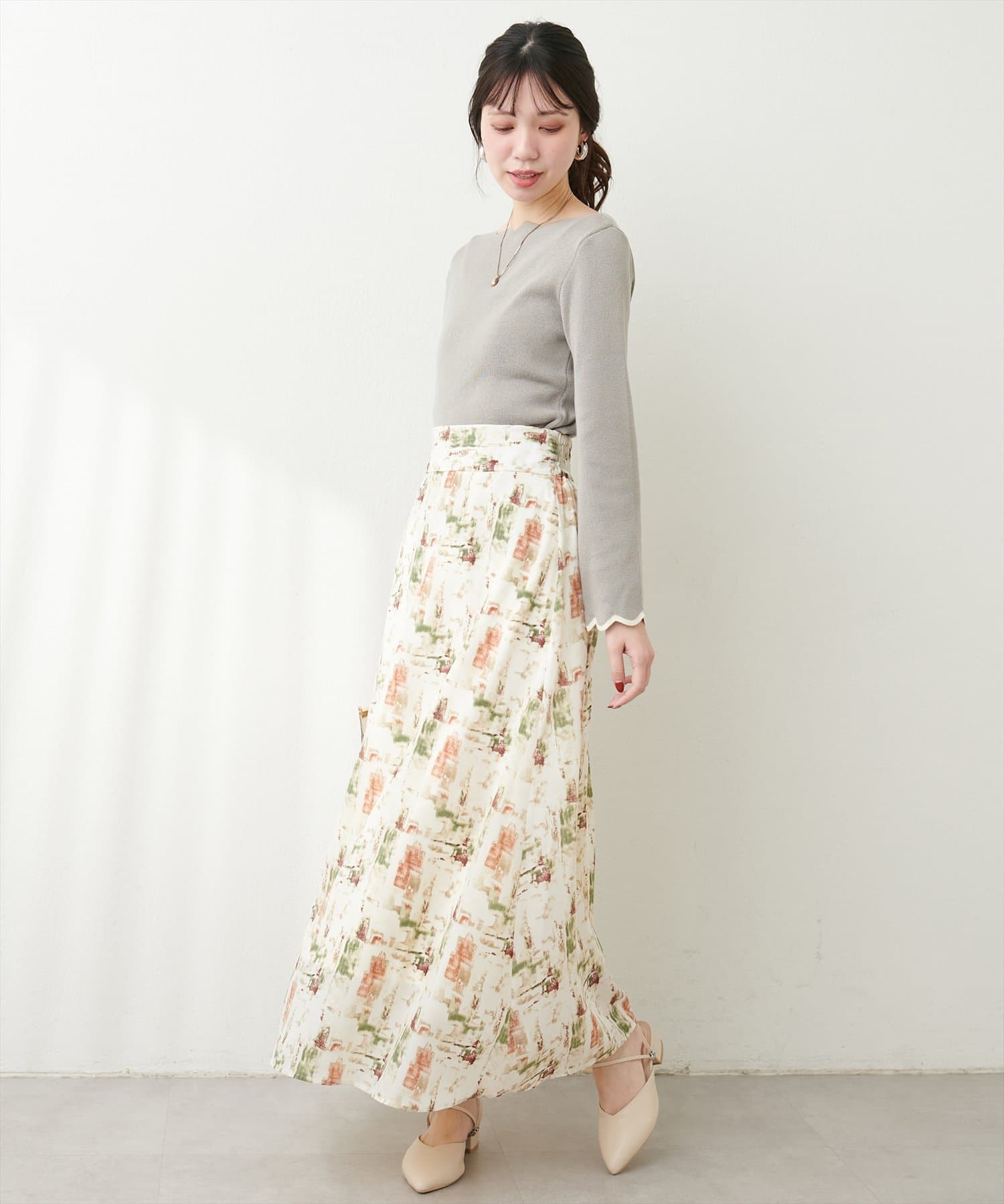 アート柄を全体にデザインし、裾にかけて緩やかなフレアラインに仕上げた、履くだけでお洒落感が増す1着。