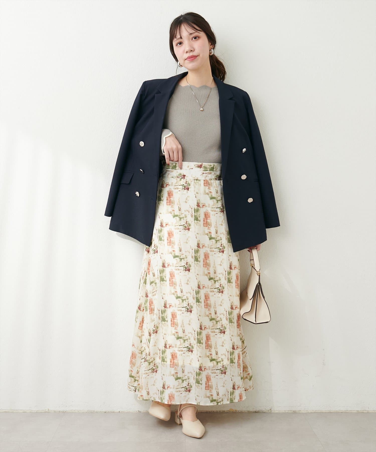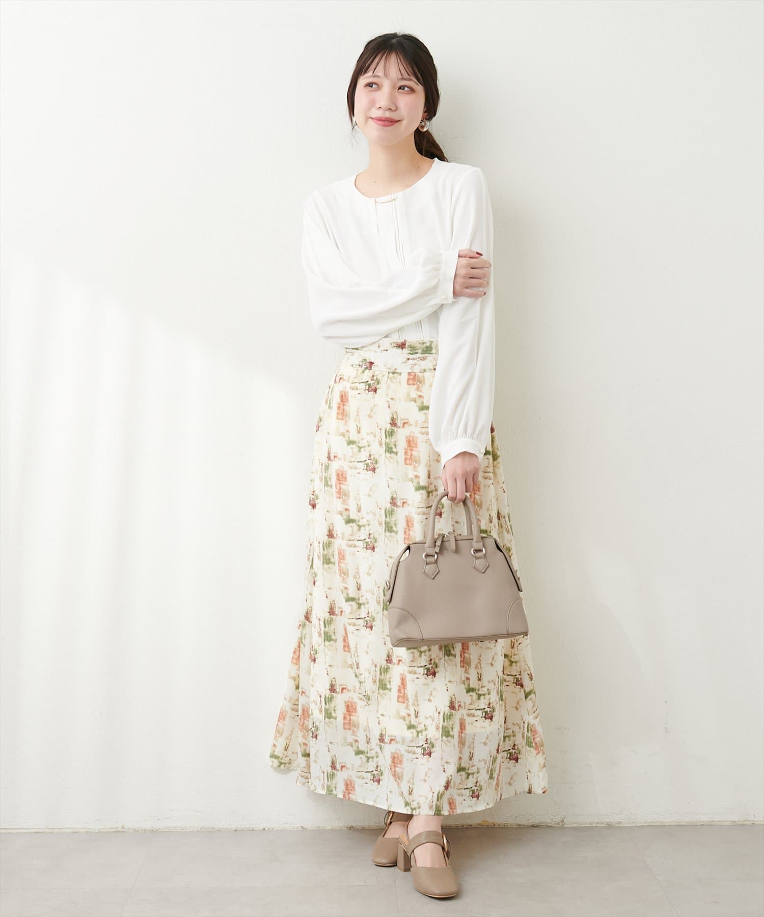 シンプルなハイネックニットやすっきりめのブラウスを合わせると、スカートのデザインが引き立ちます。