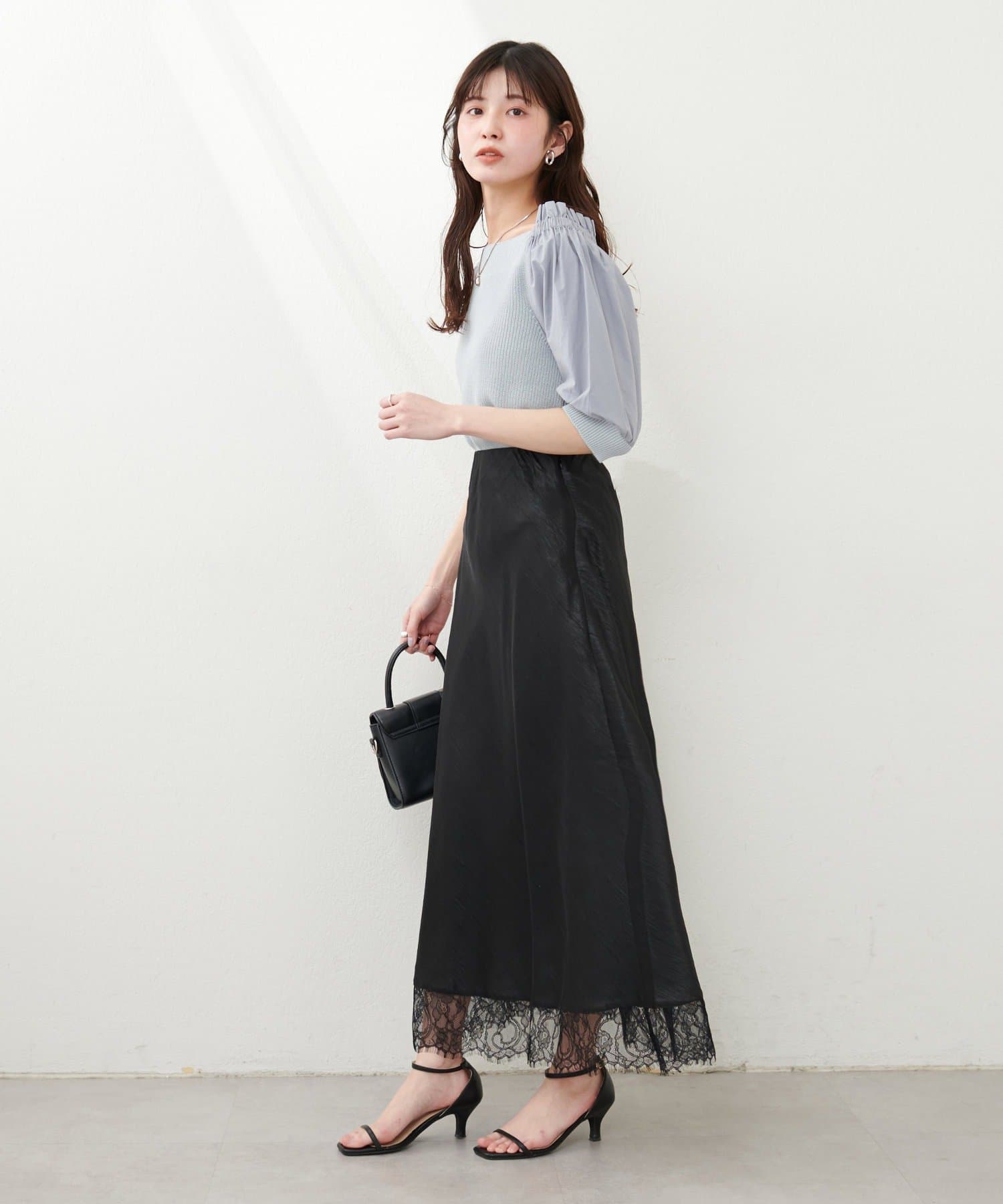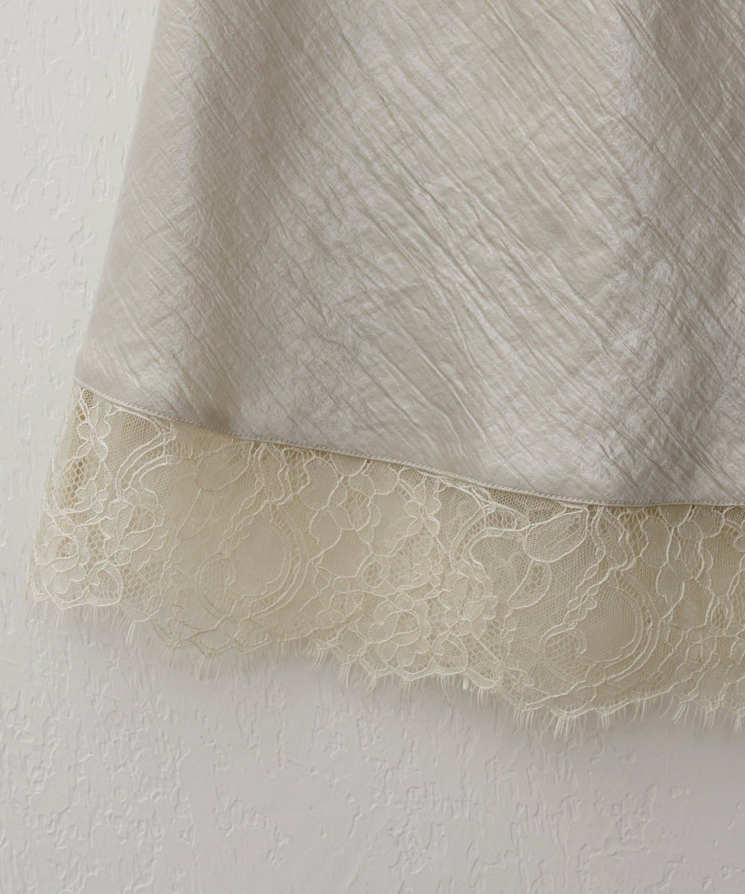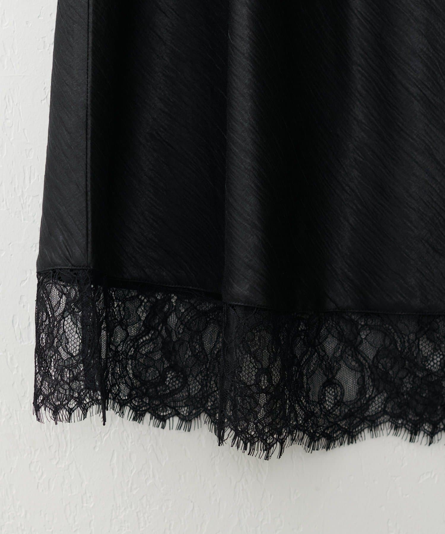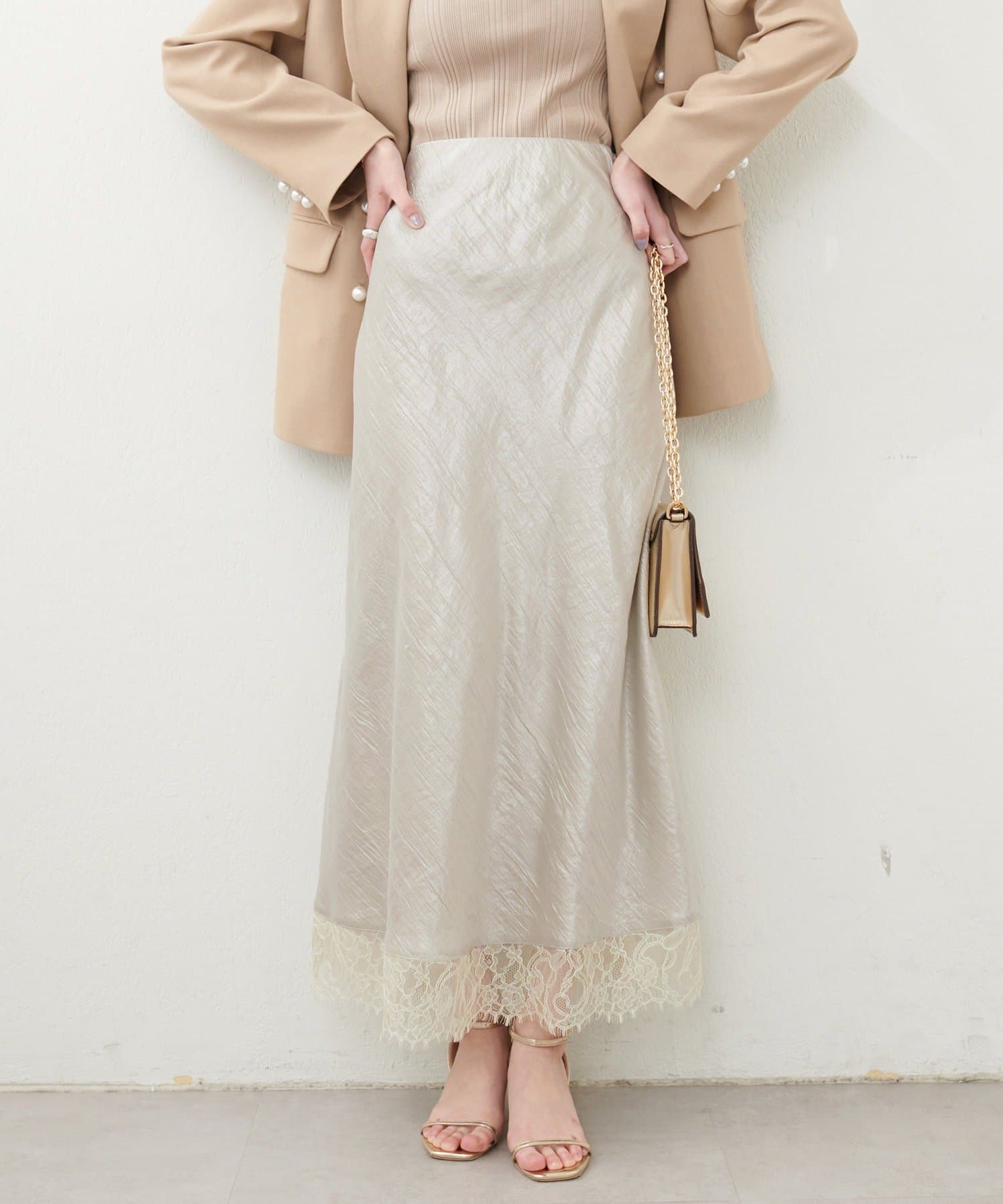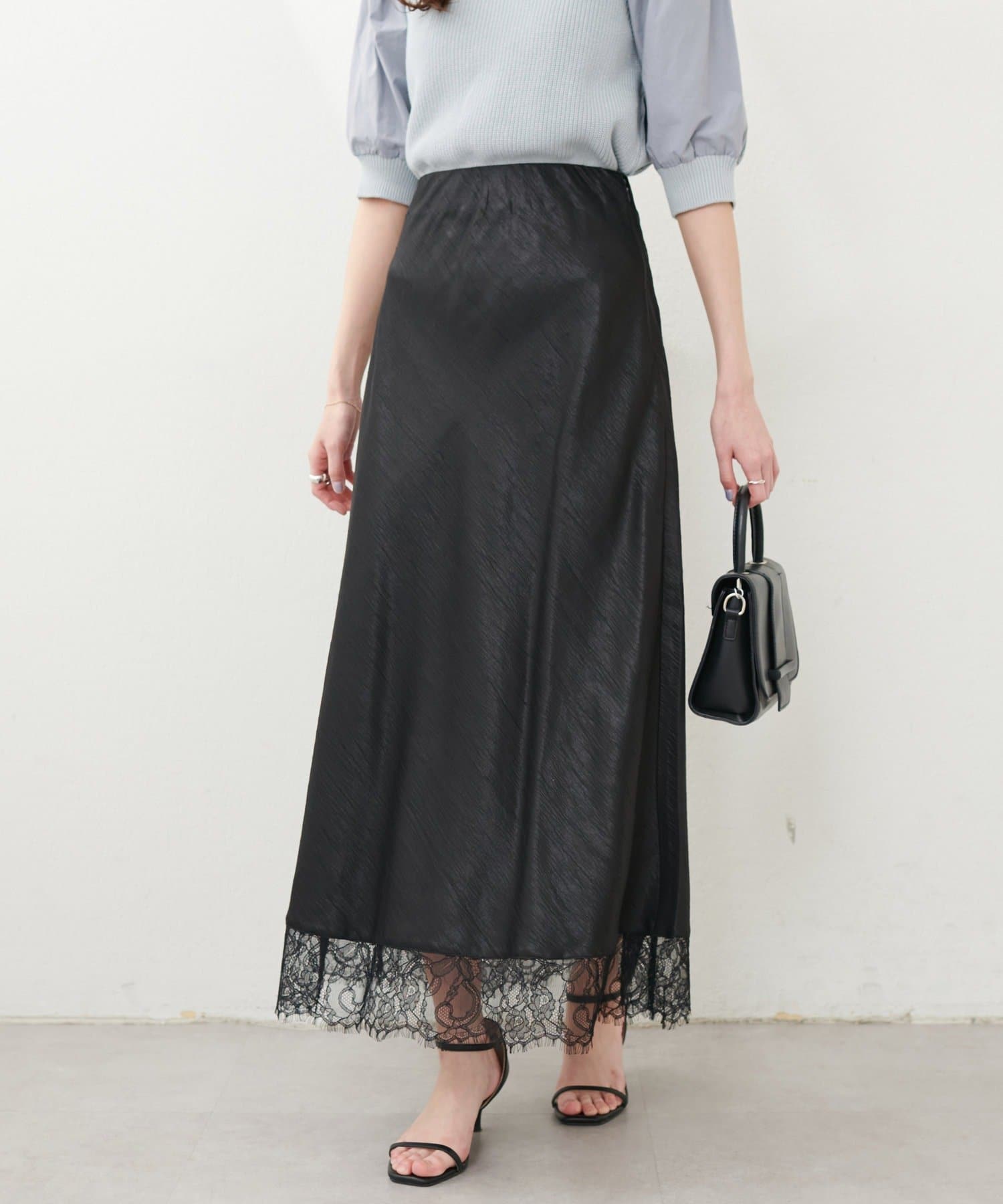 表面感のあるサテン素材に裾レースを合わせた大人フェミニンなスカート。