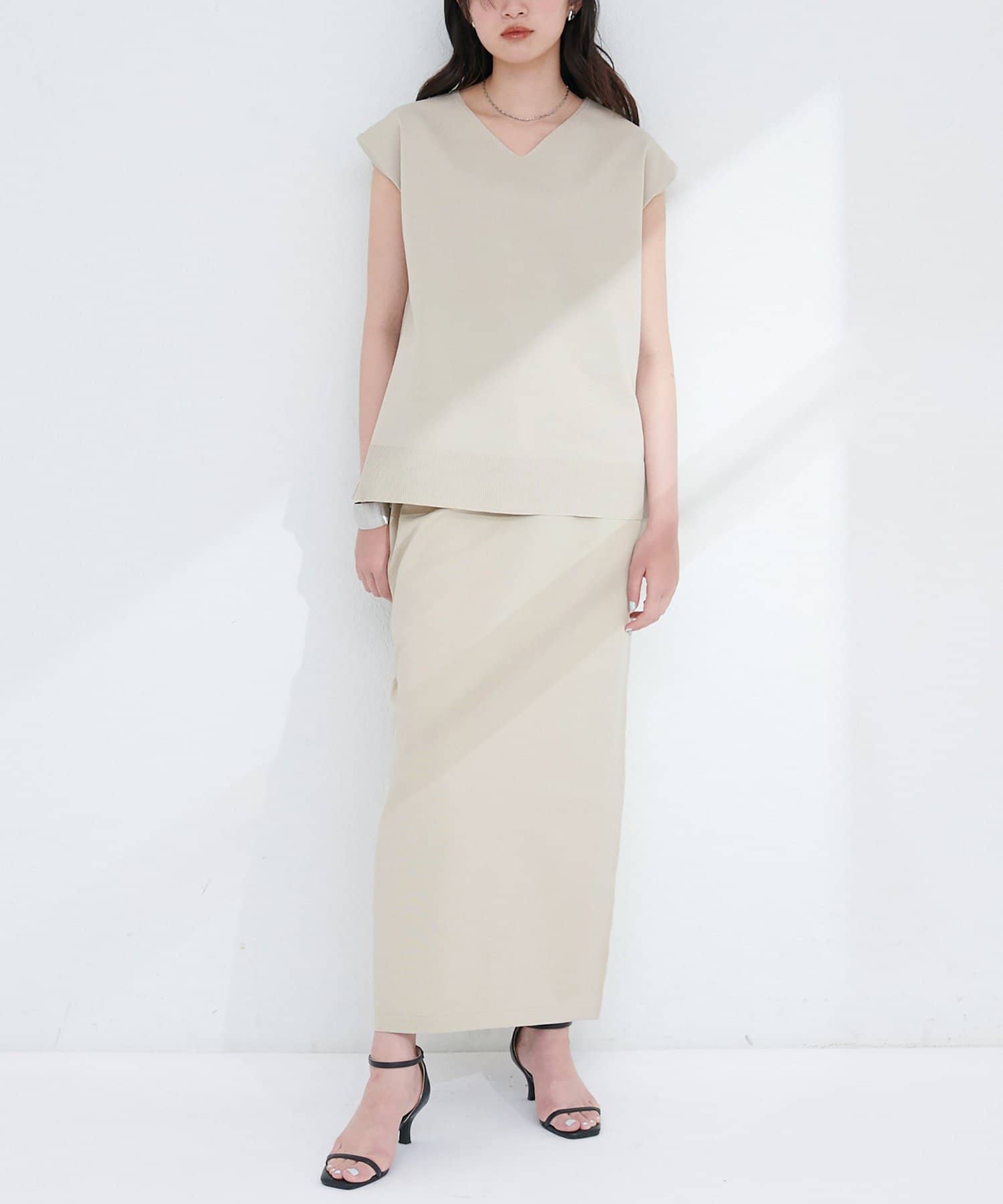 シンプルな美しさを追求した、Iラインシルエットのポリニットスカート。