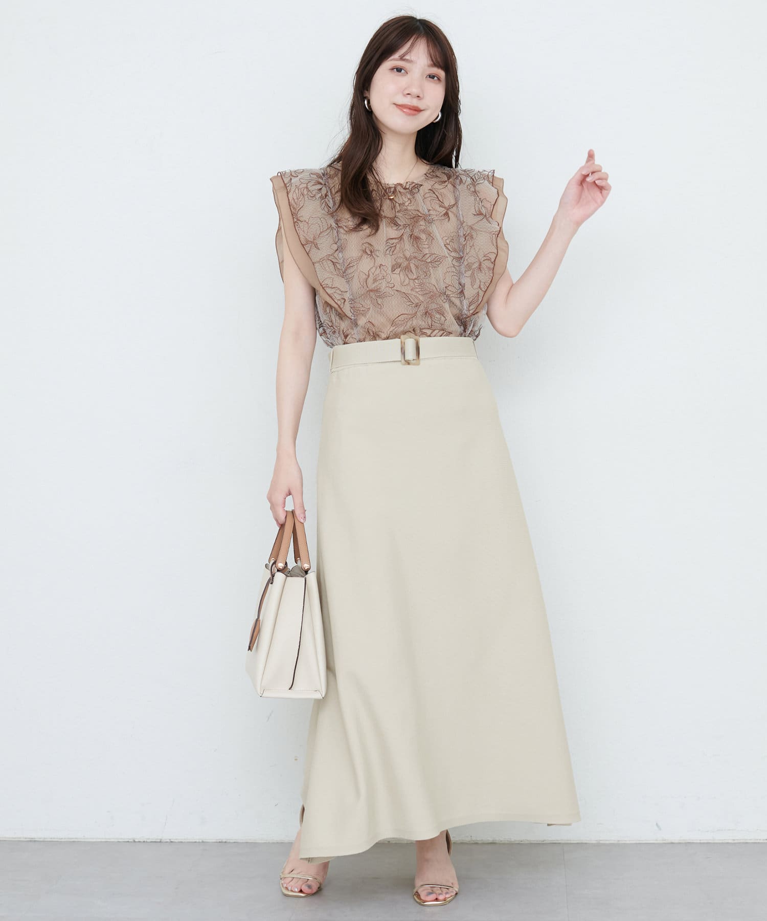 デザイン性のあるトップスやアクセサリーと合わせて、華やかなお出かけスタイルに。