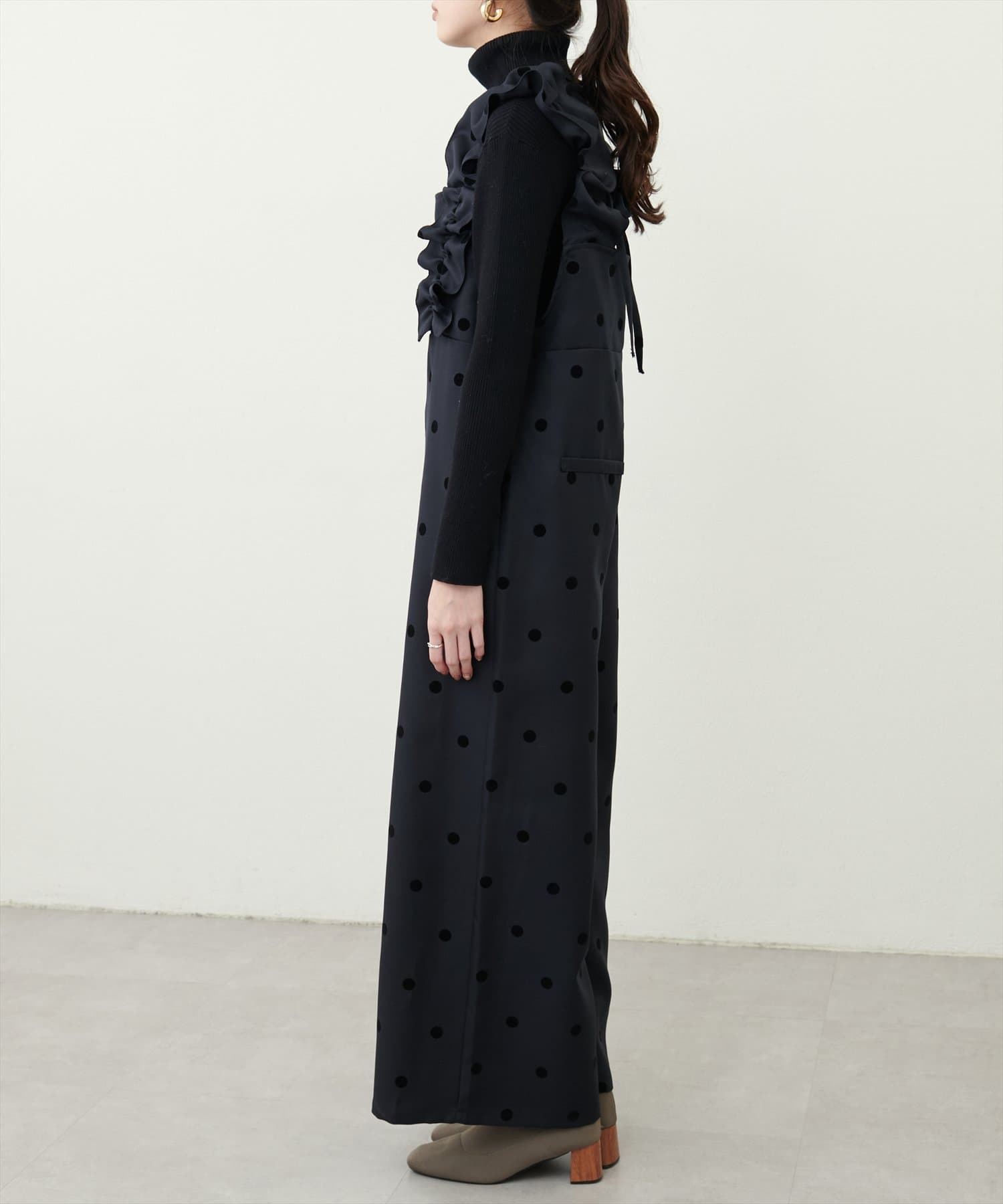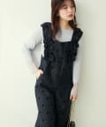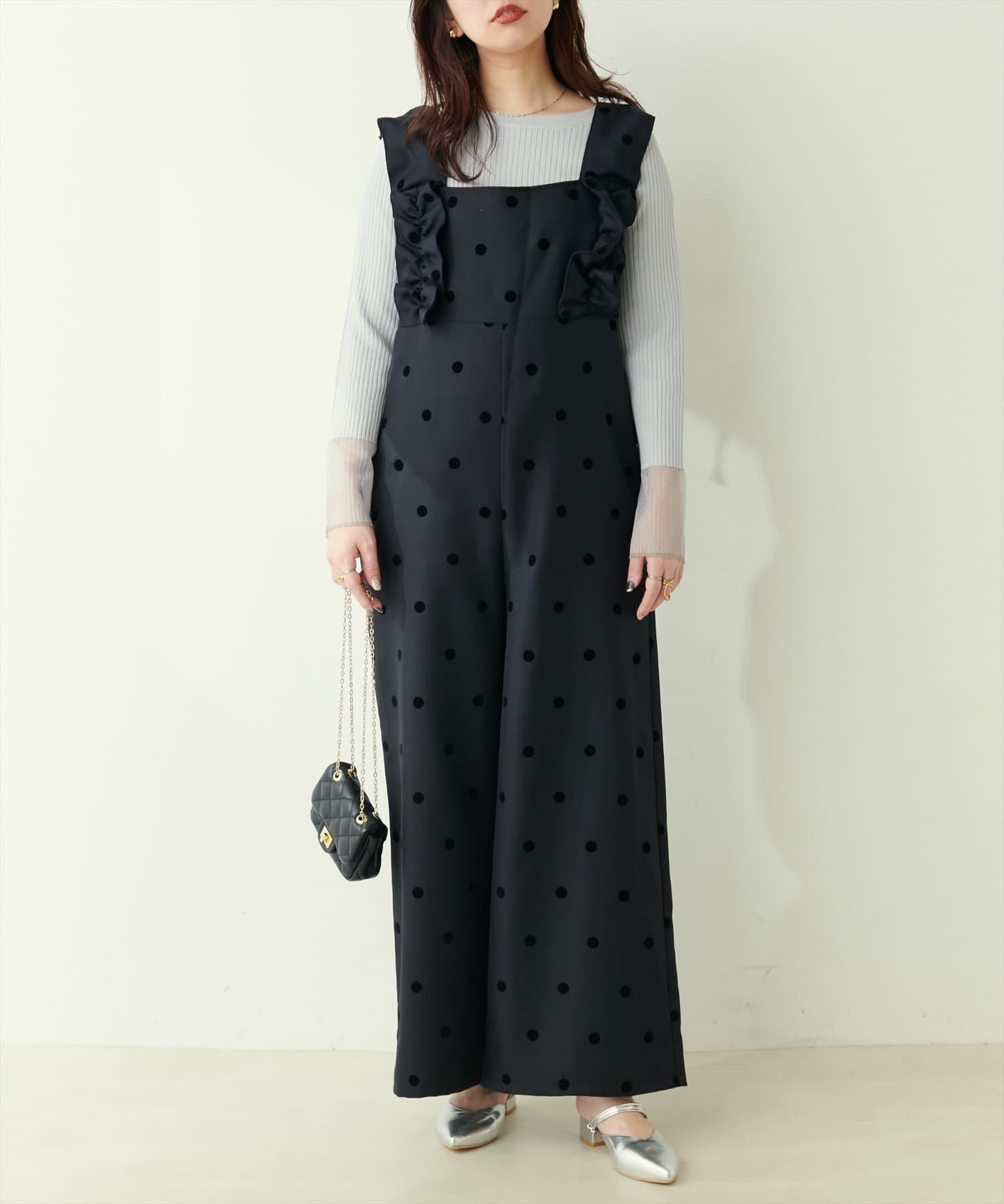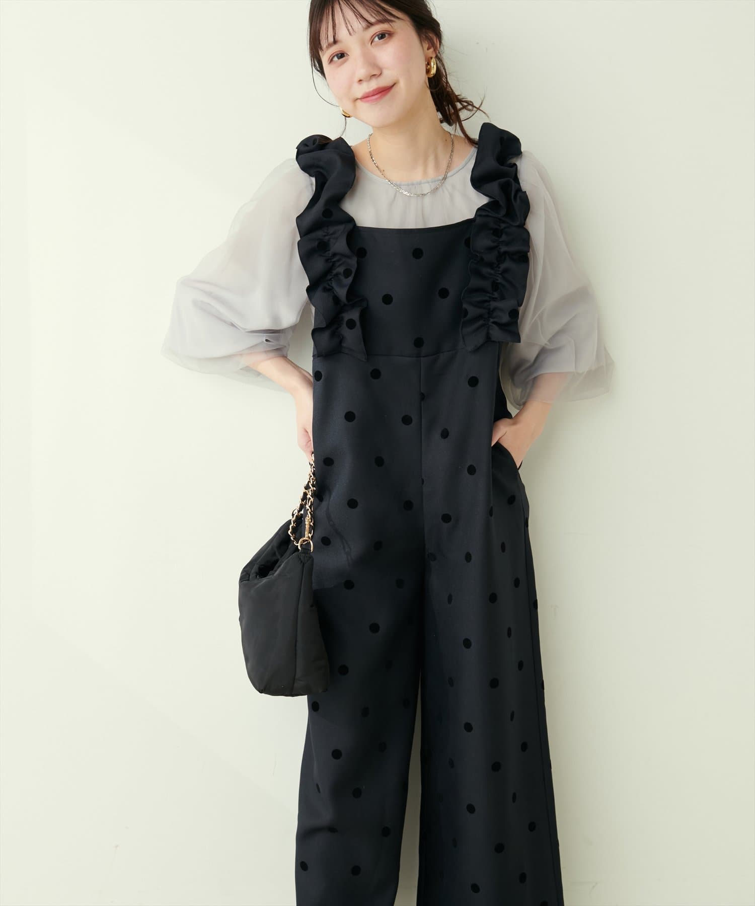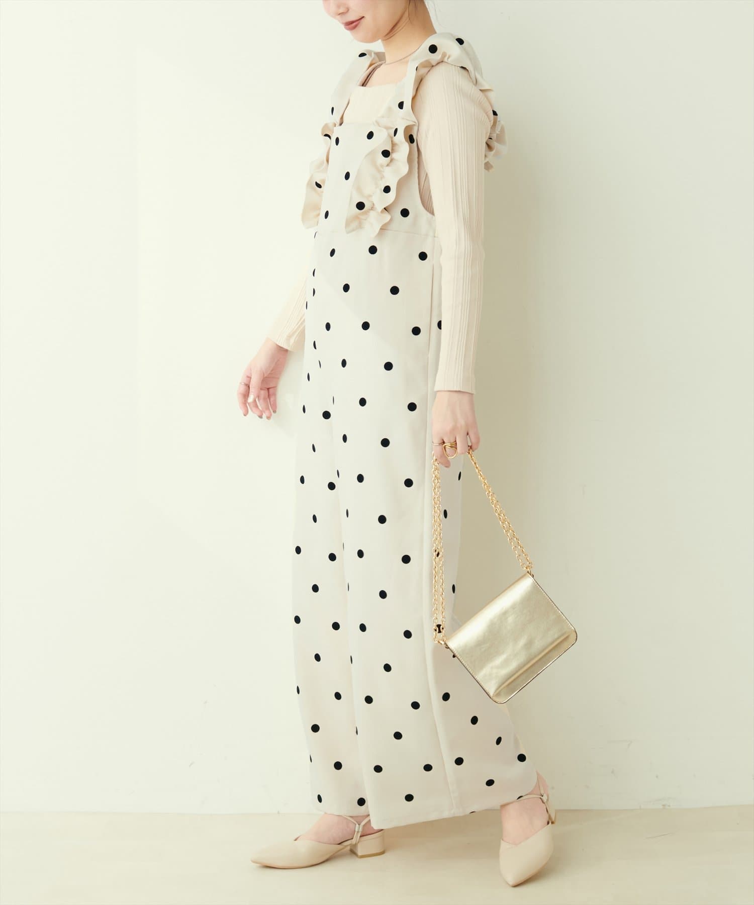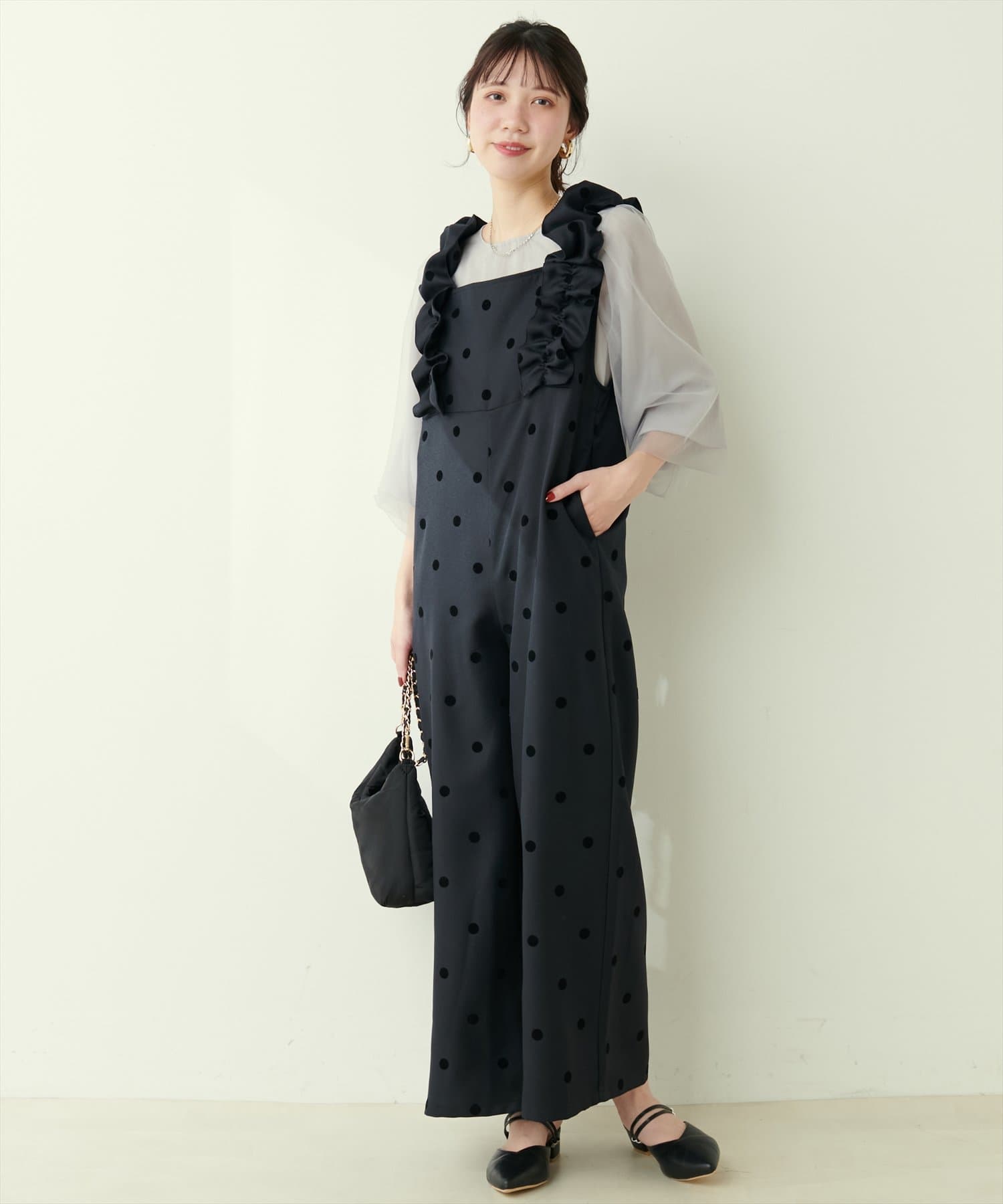 肩ヒモにあしらわれたフリルがフェミニンで印象的なオールインワン。