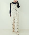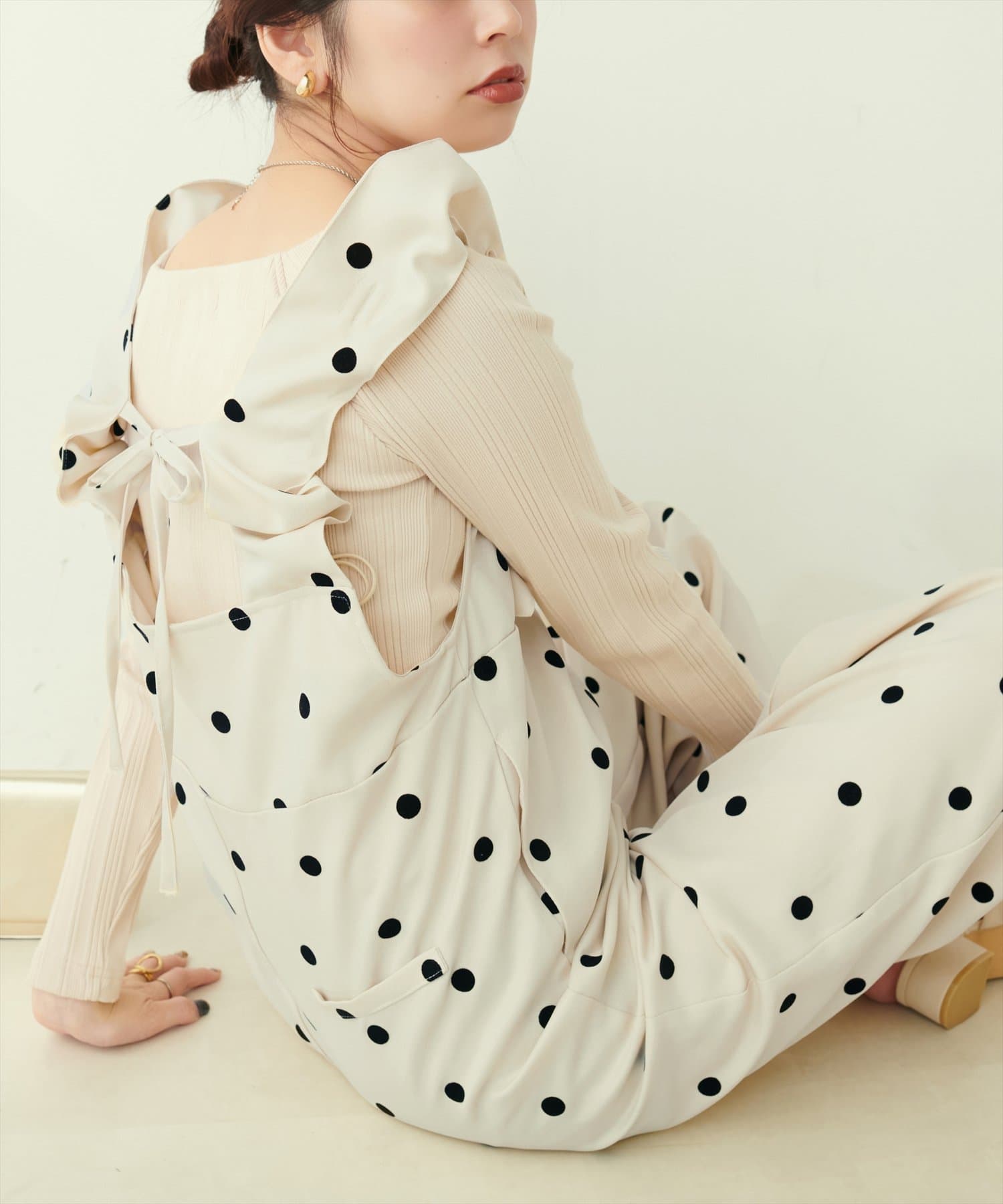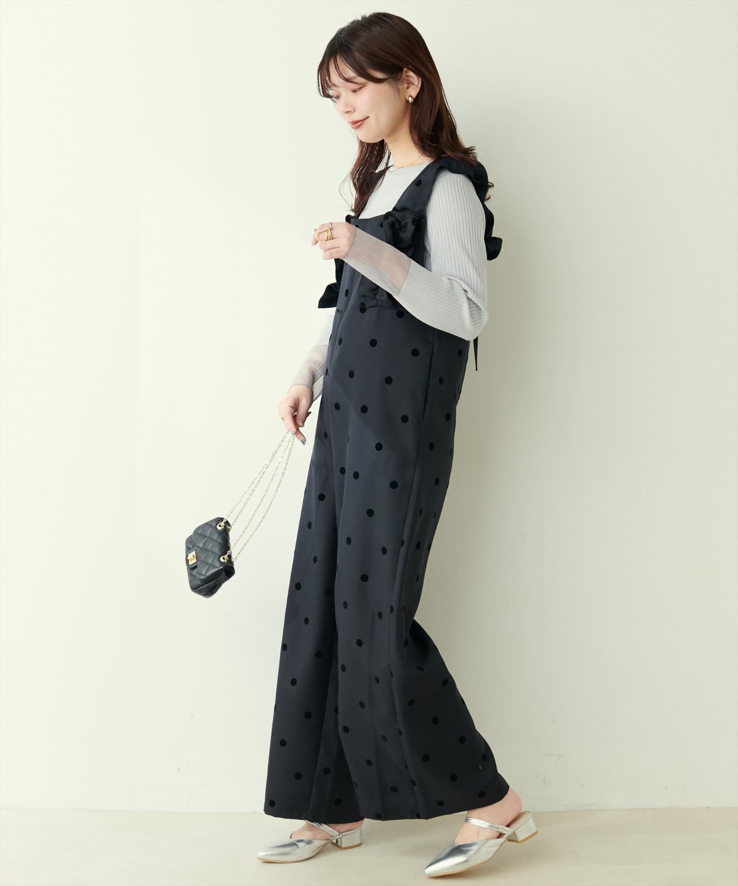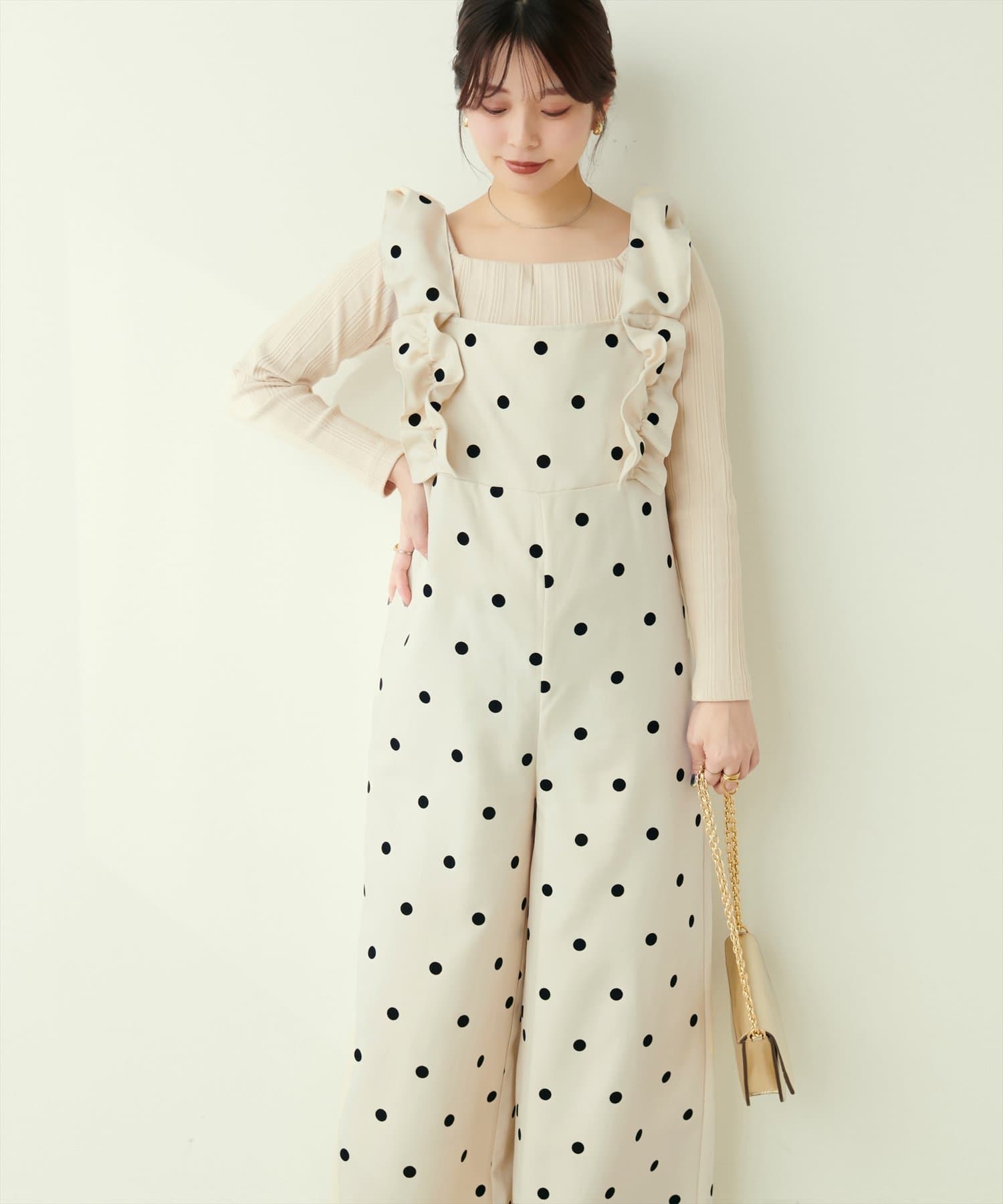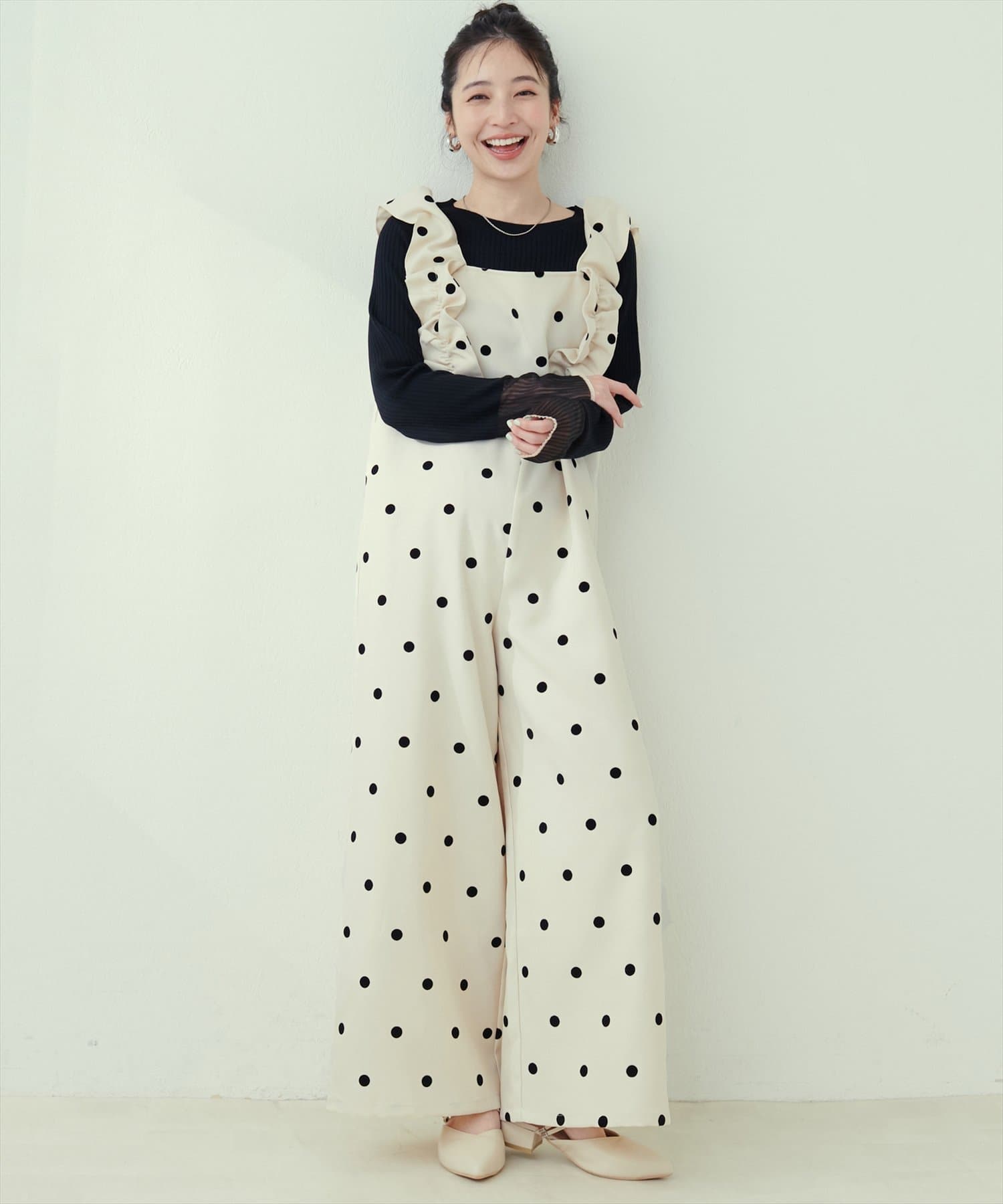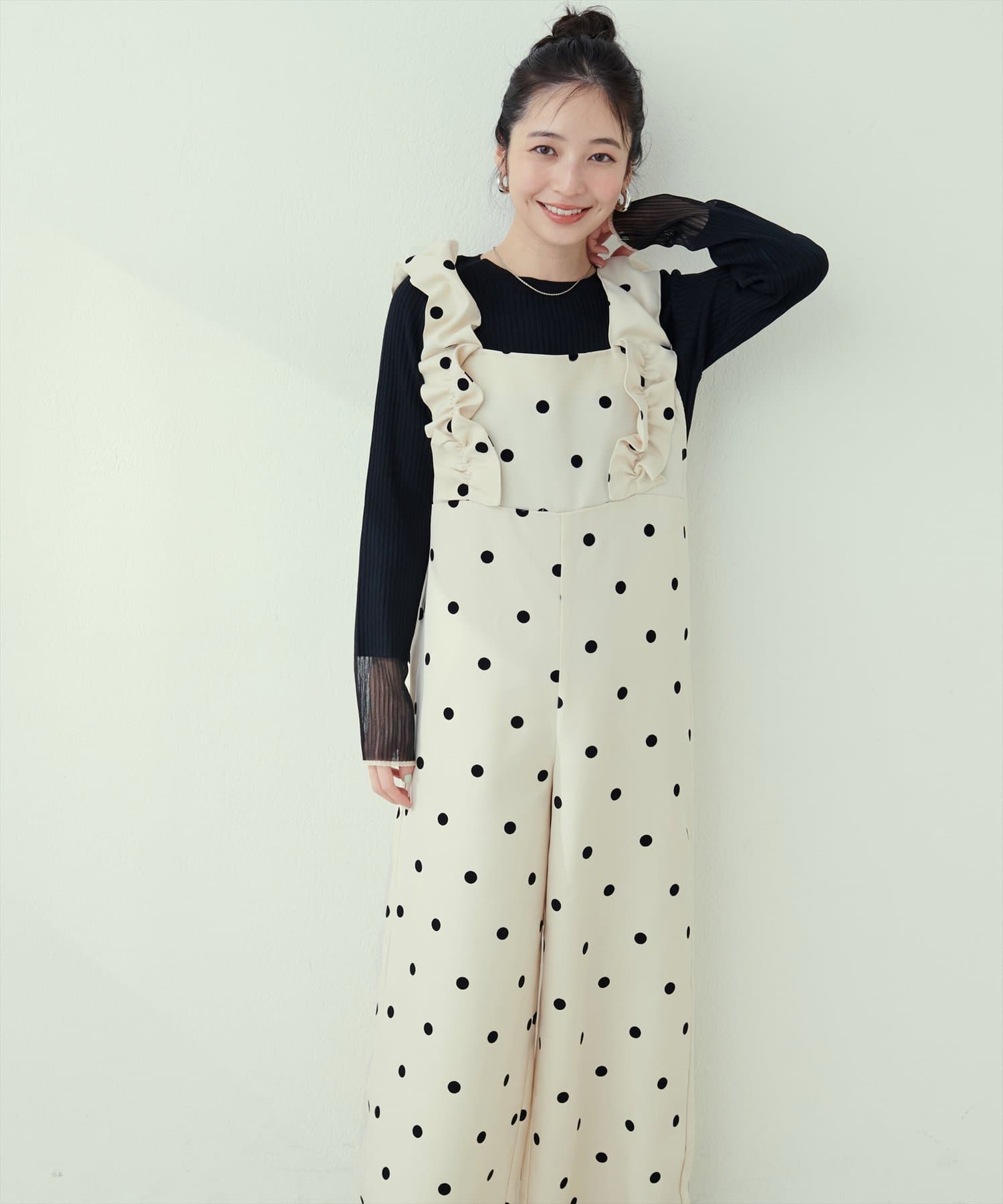 肩ヒモにあしらわれたフリルがフェミニンで印象的なオールインワン。