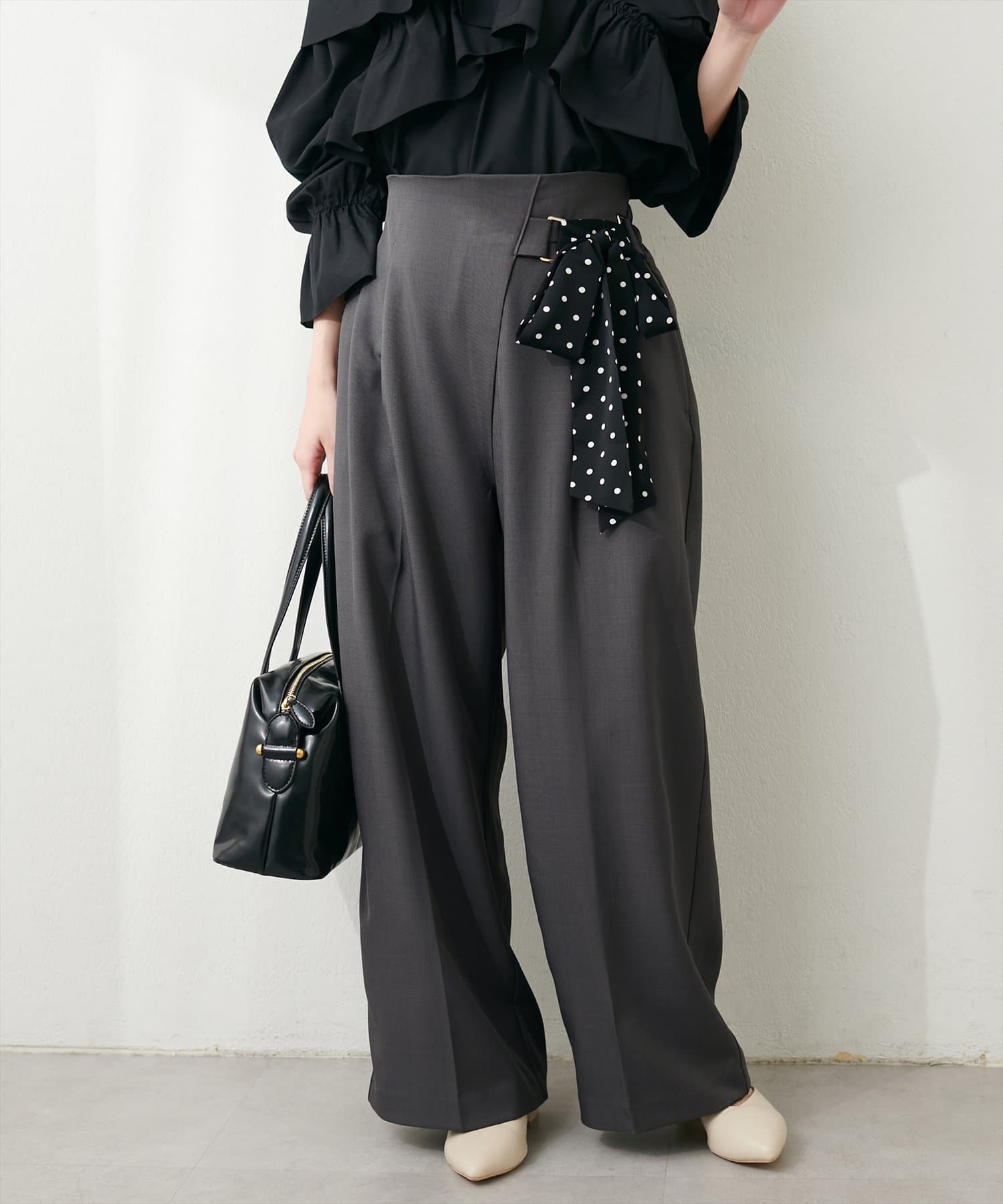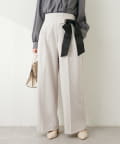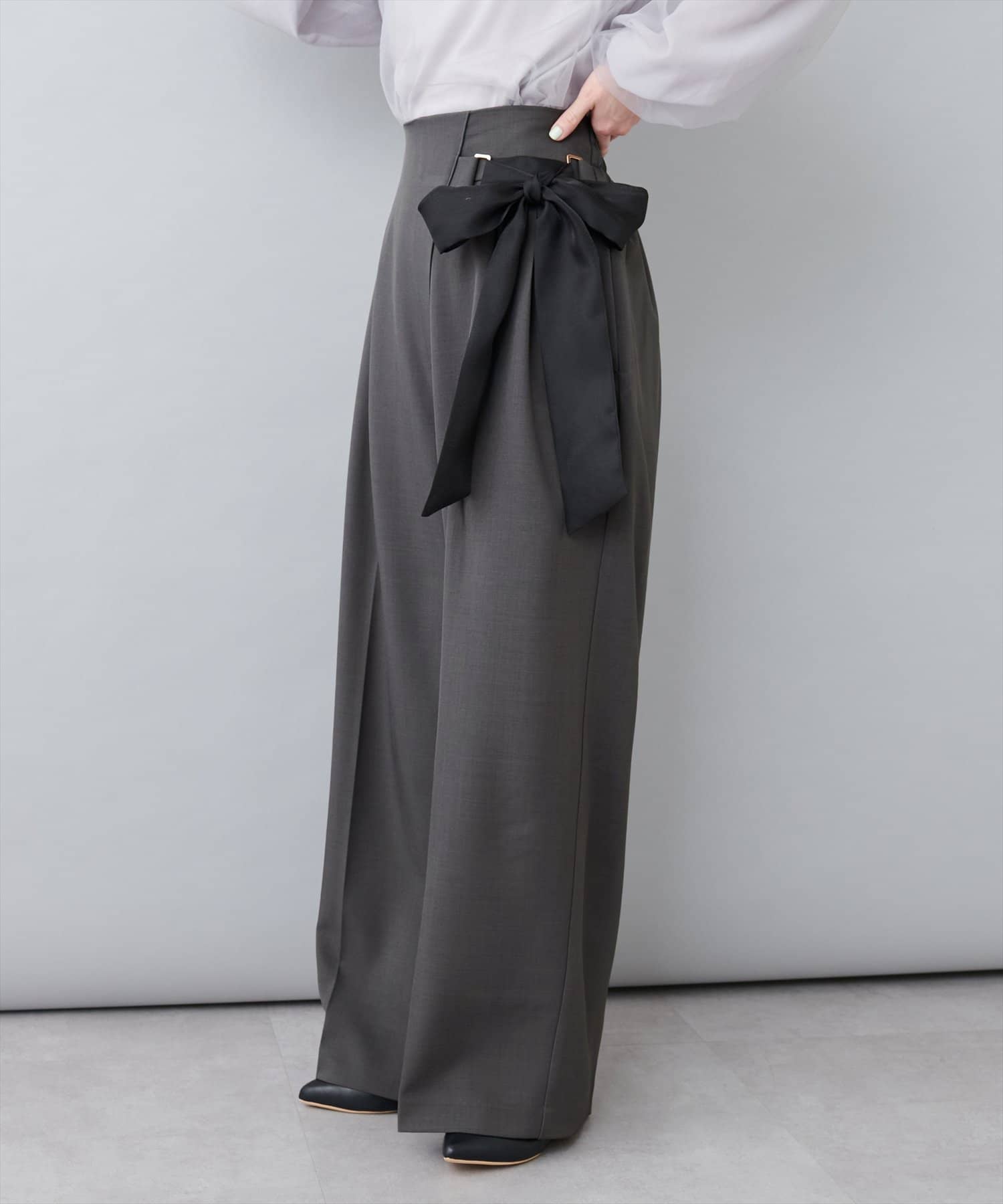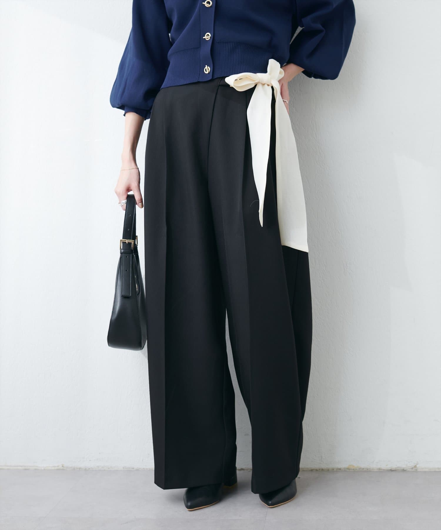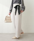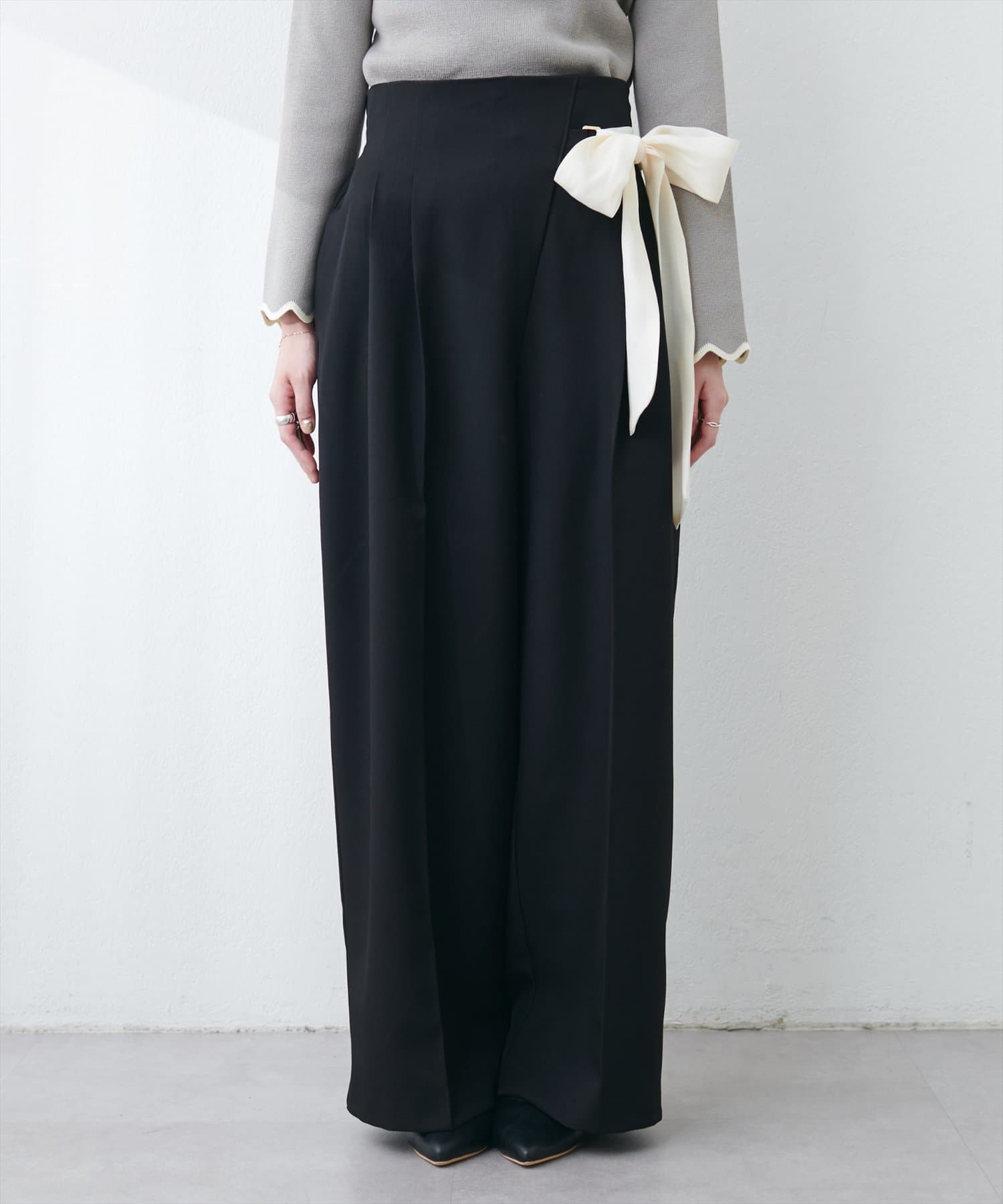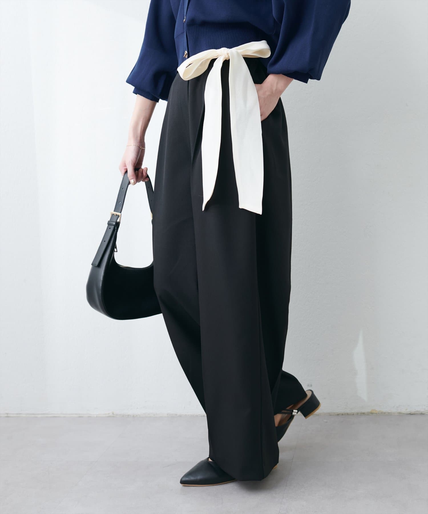 ウエストリボンでスタイリングに華やかさをプラスしてくれるタックパンツ。