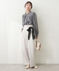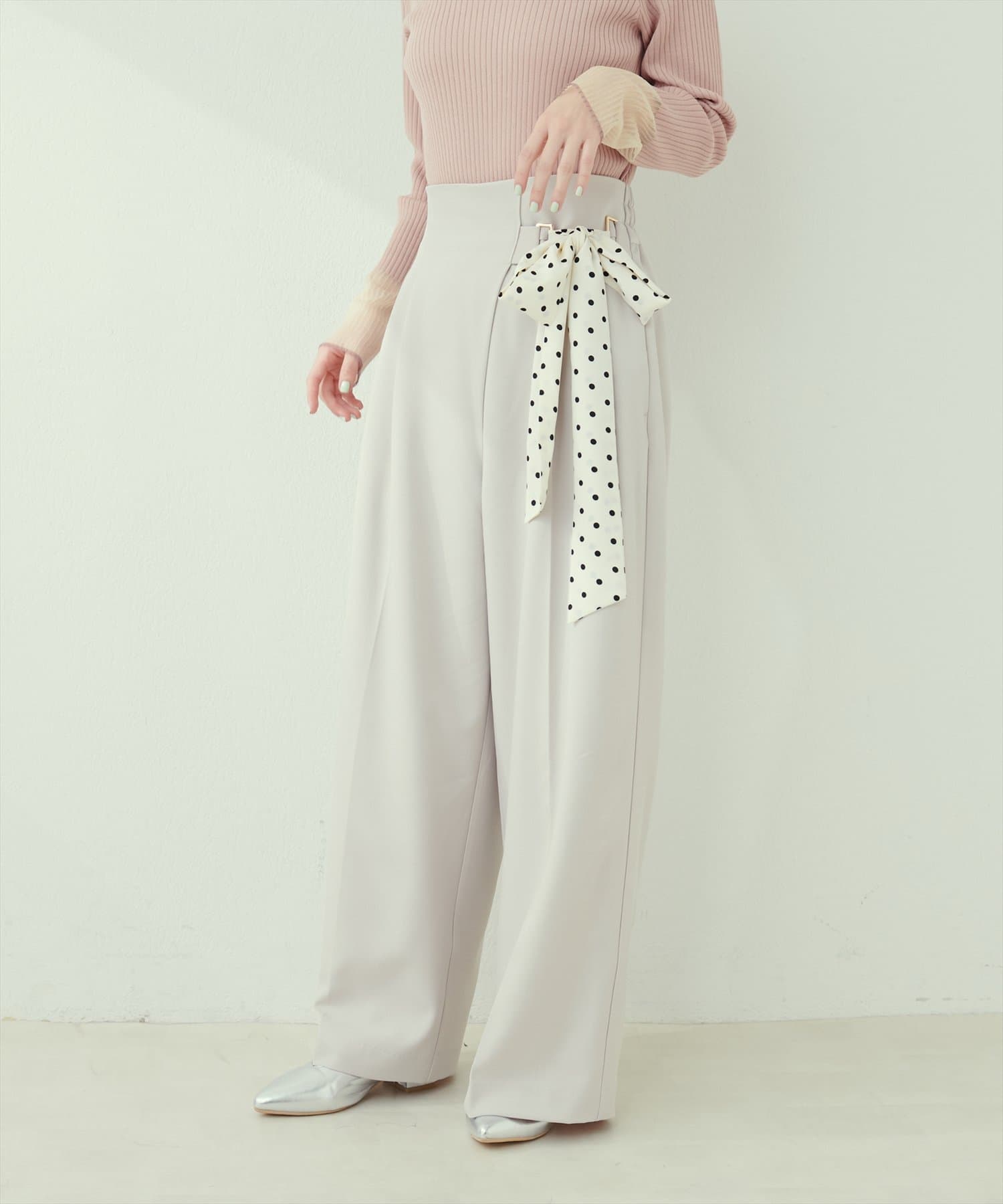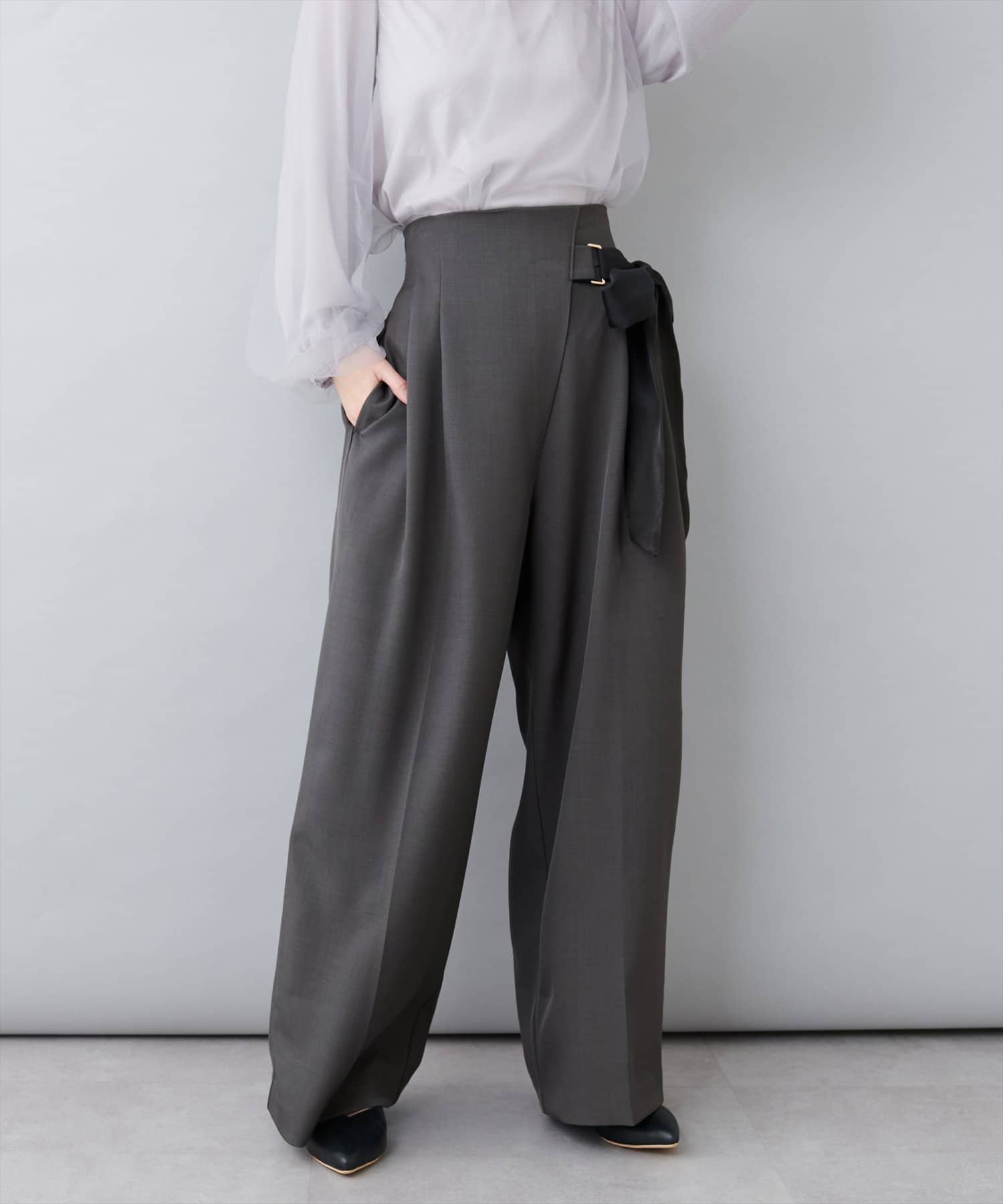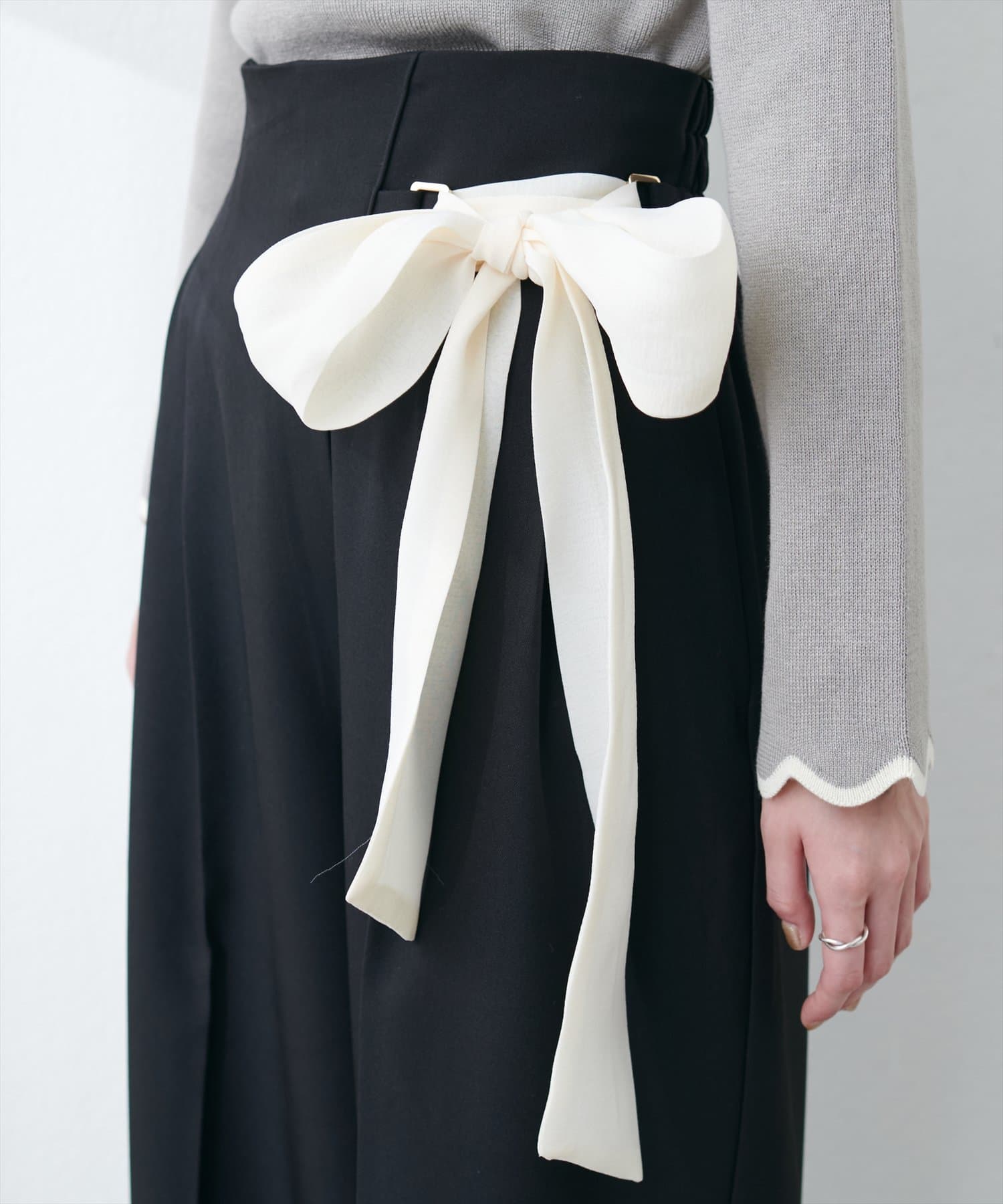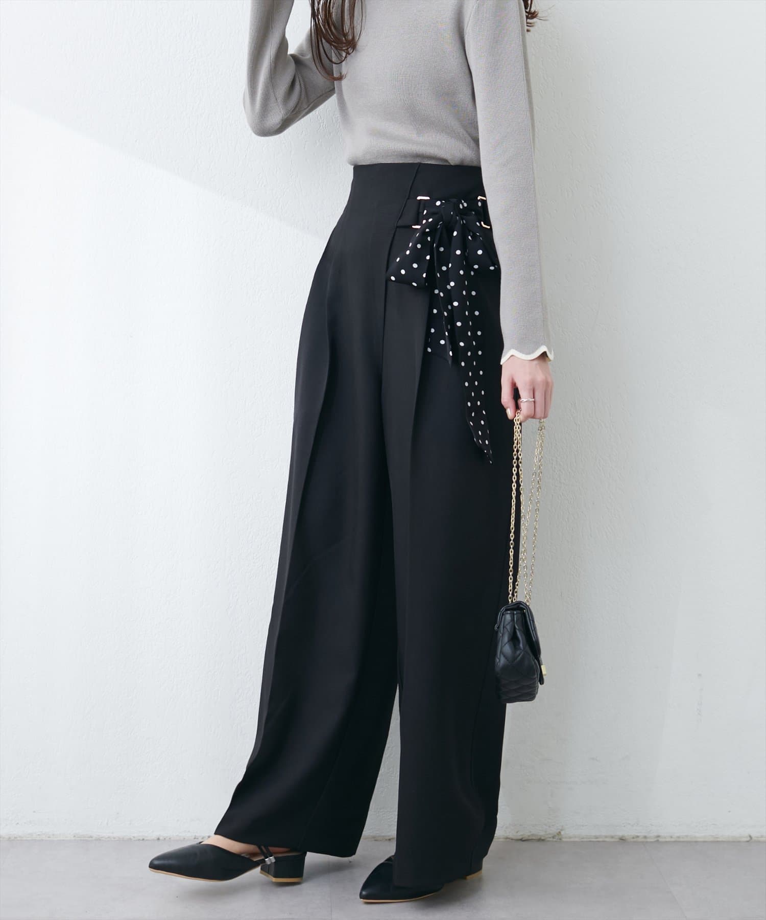 ウエストリボンでスタイリングに華やかさをプラスしてくれるタックパンツ。