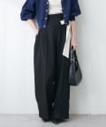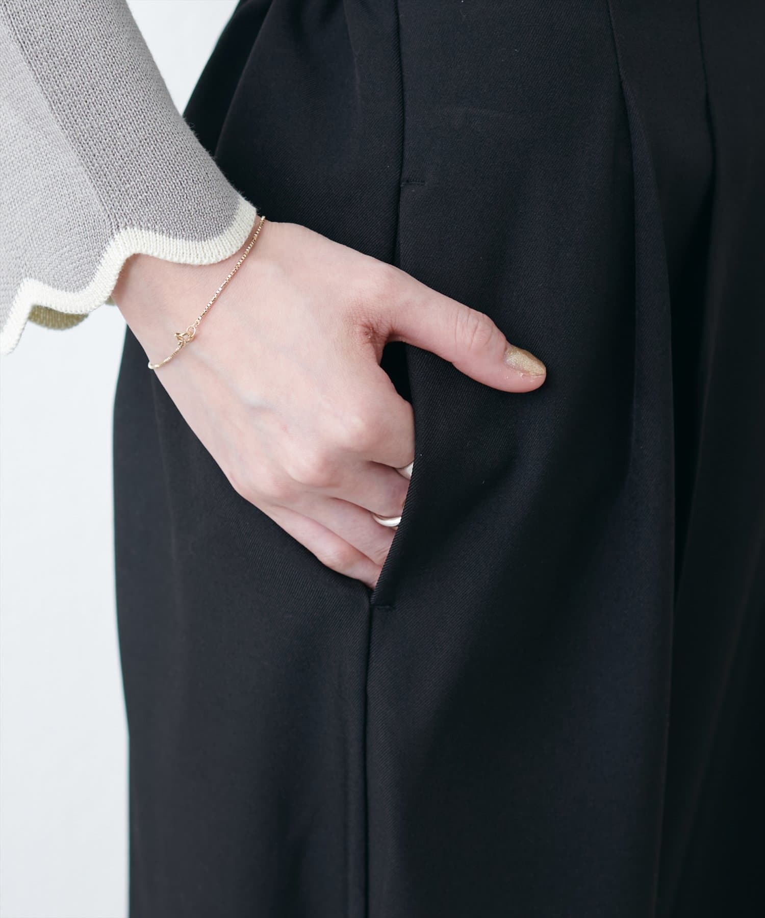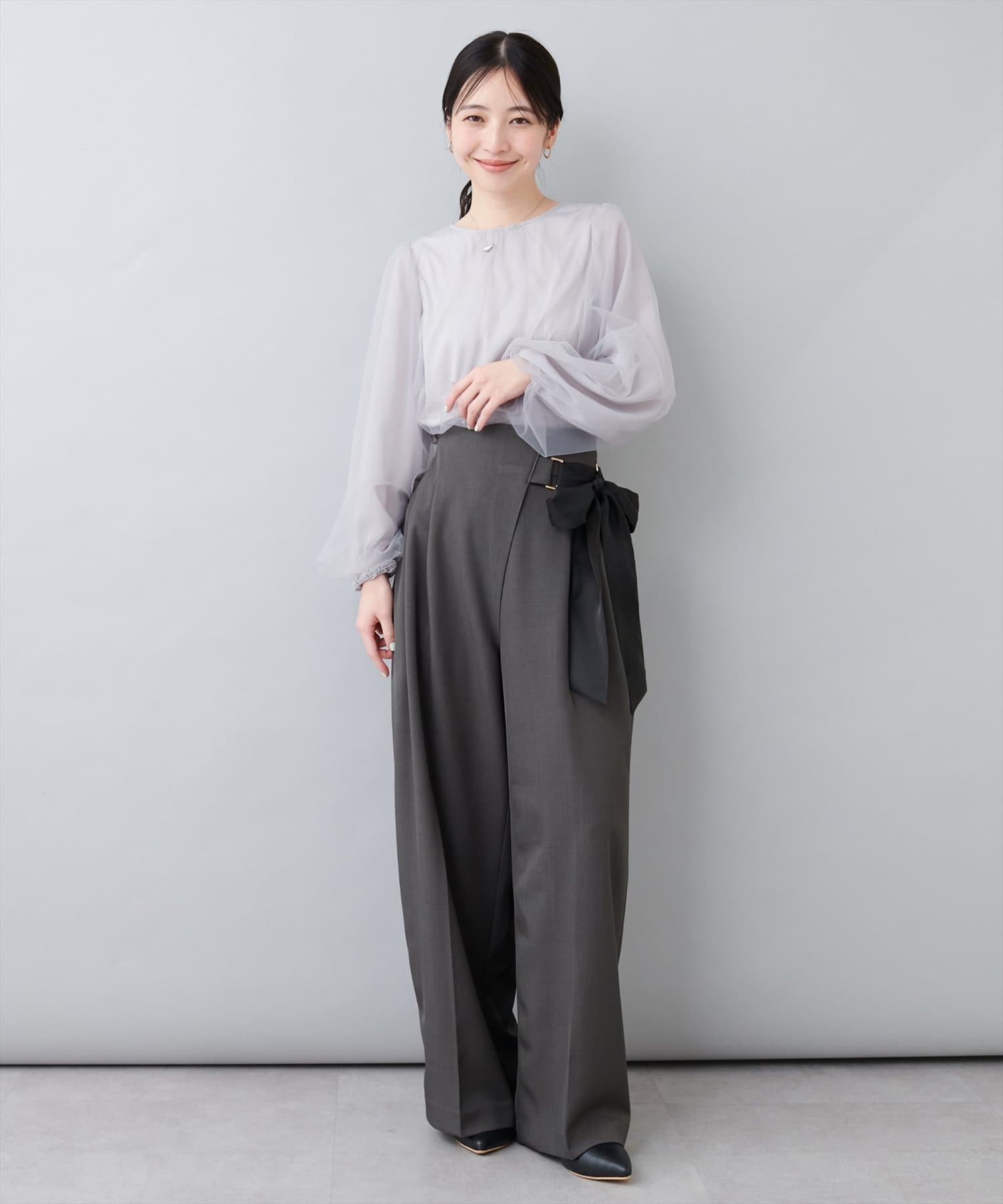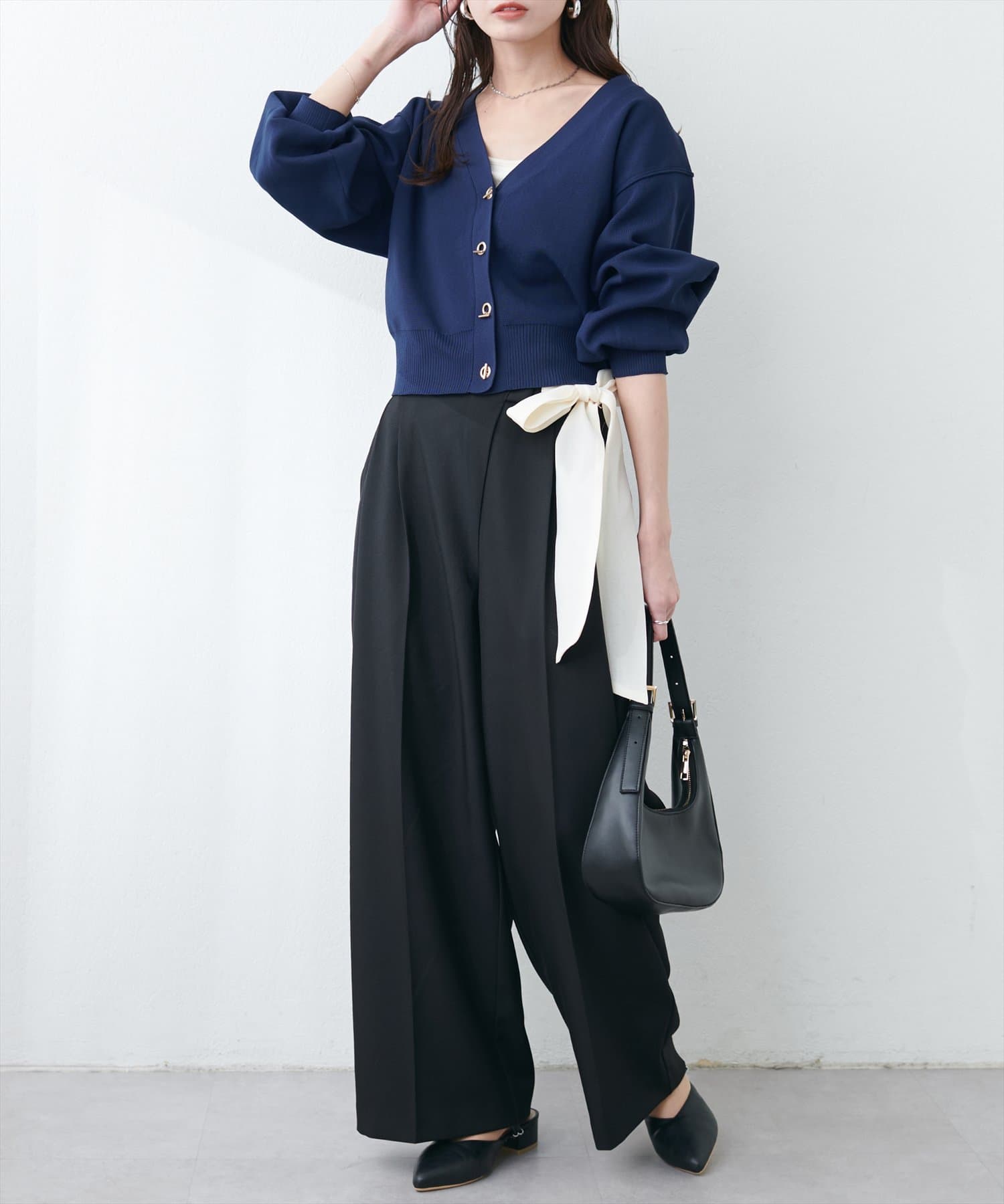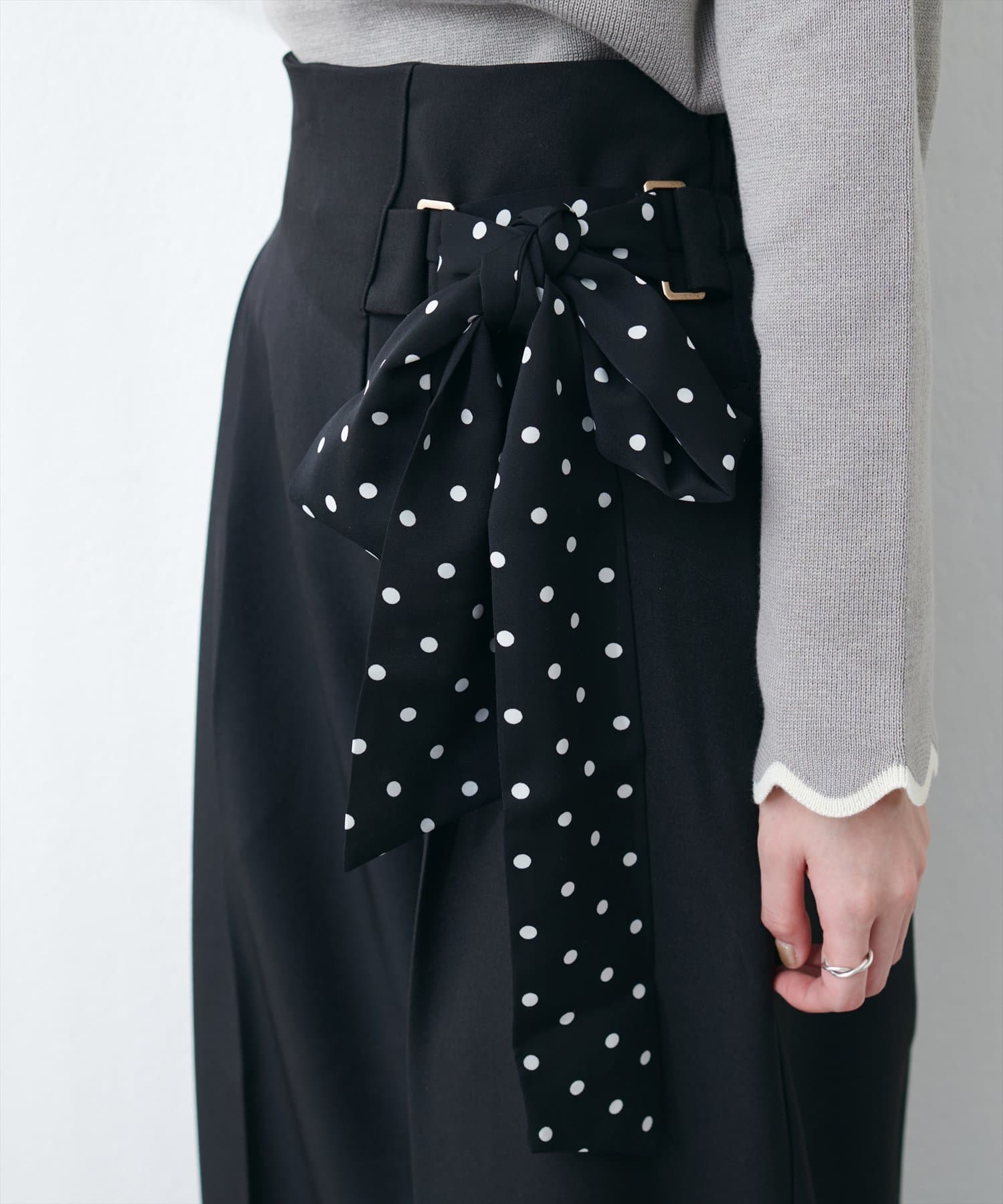 ウエストリボンでスタイリングに華やかさをプラスしてくれるタックパンツ。