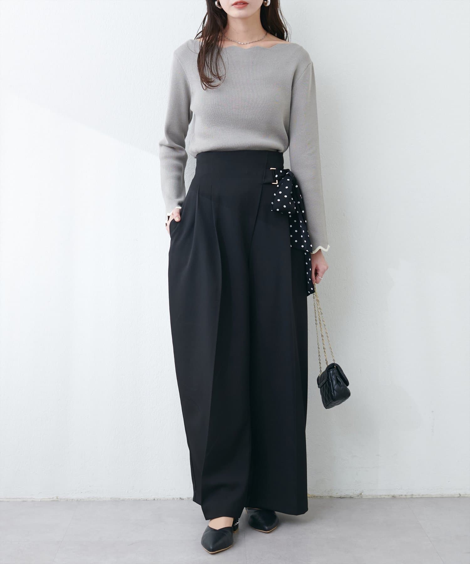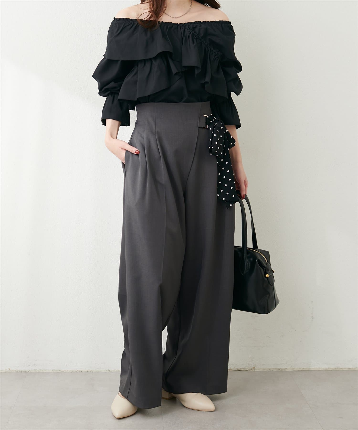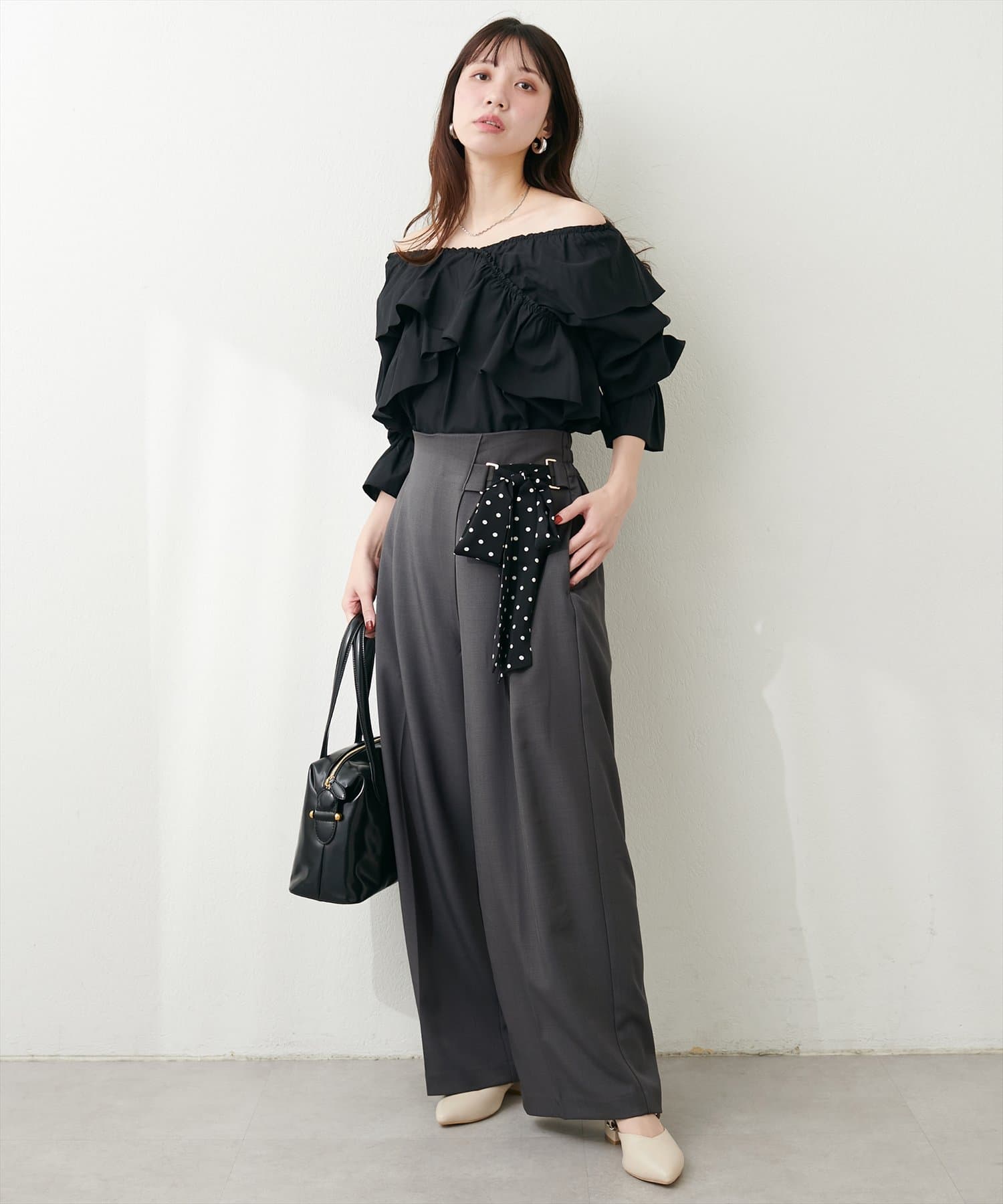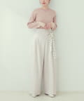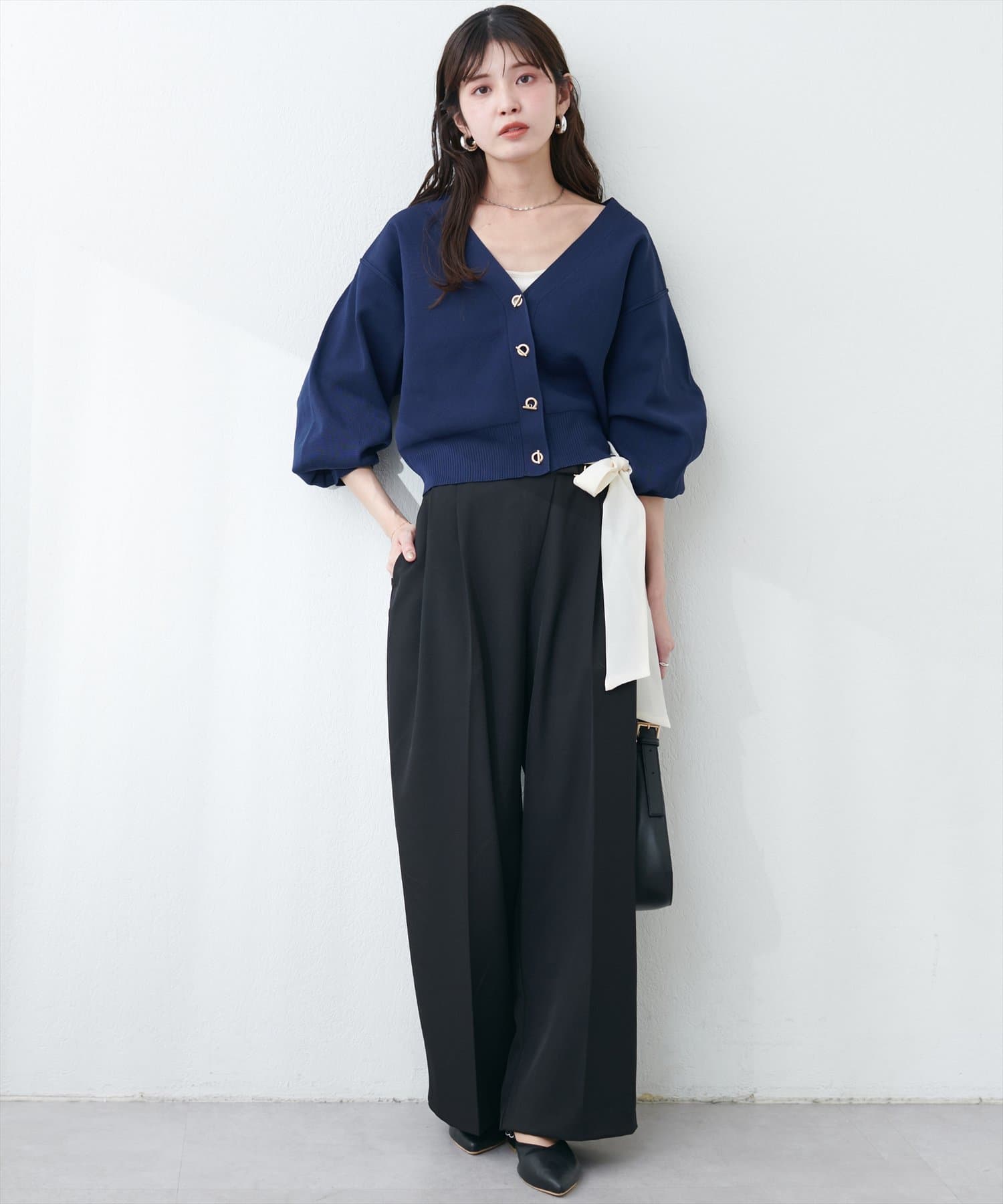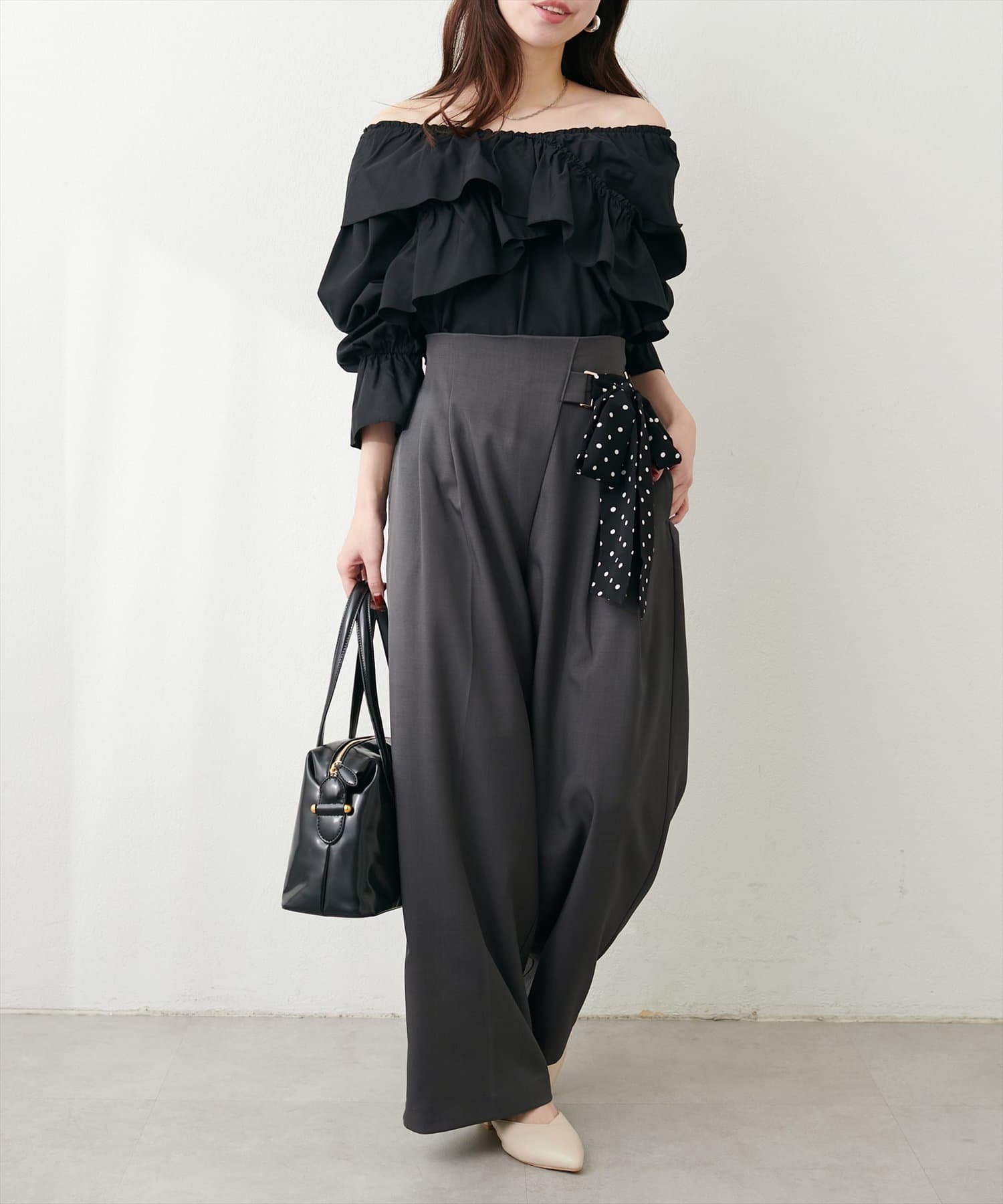 ウエストリボンでスタイリングに華やかさをプラスしてくれるタックパンツ。
