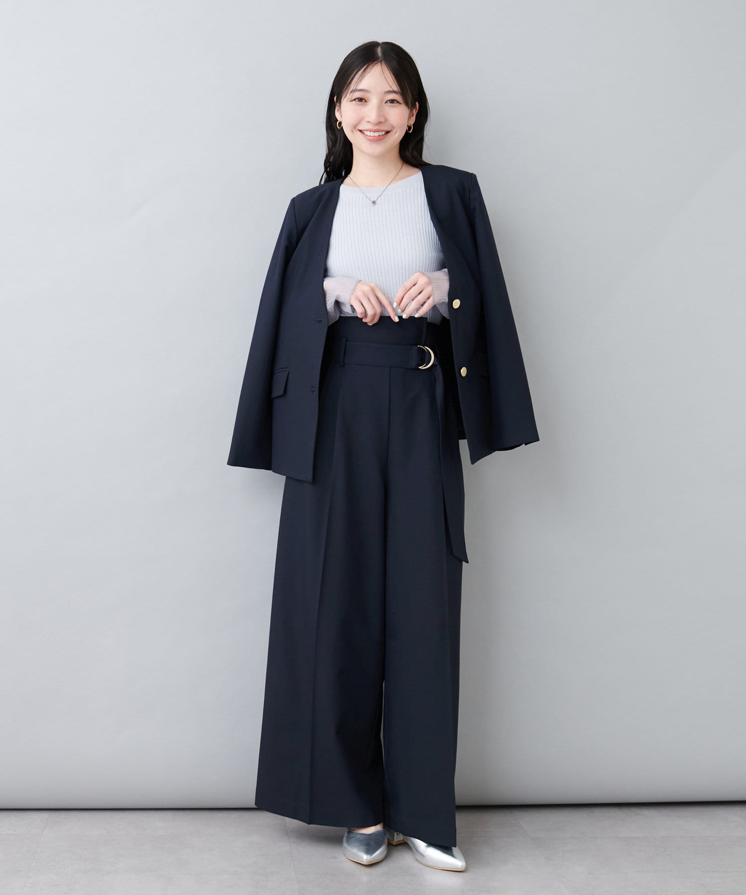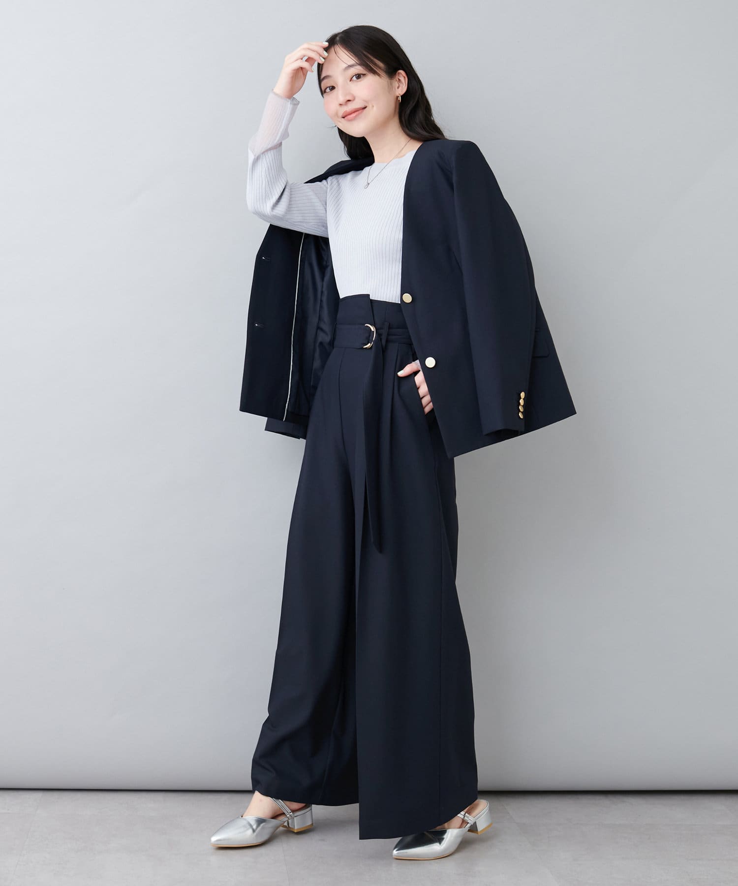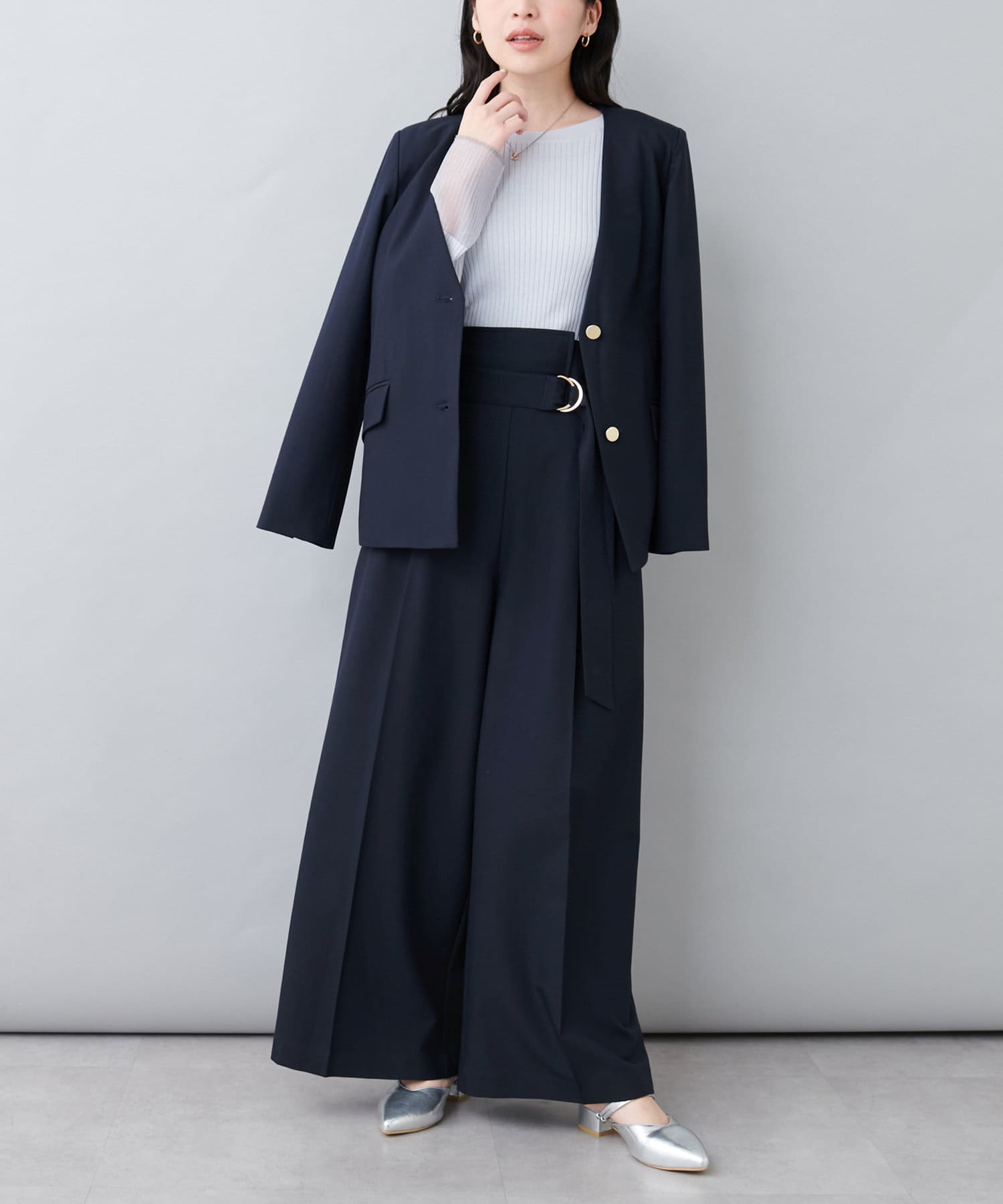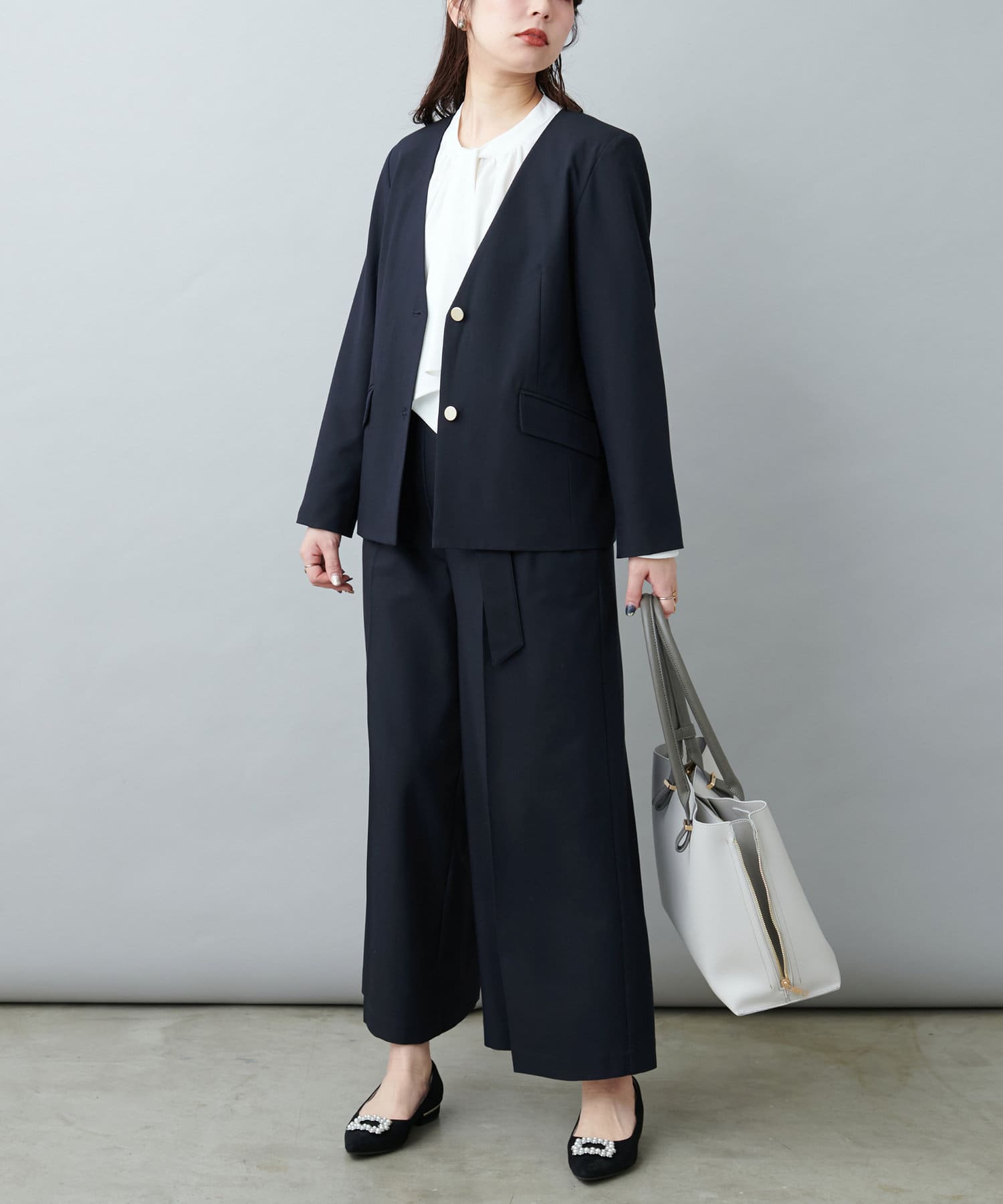 0351070080 薄金釦ノーカラージャケットとのセットアップ着用がおすすめ。