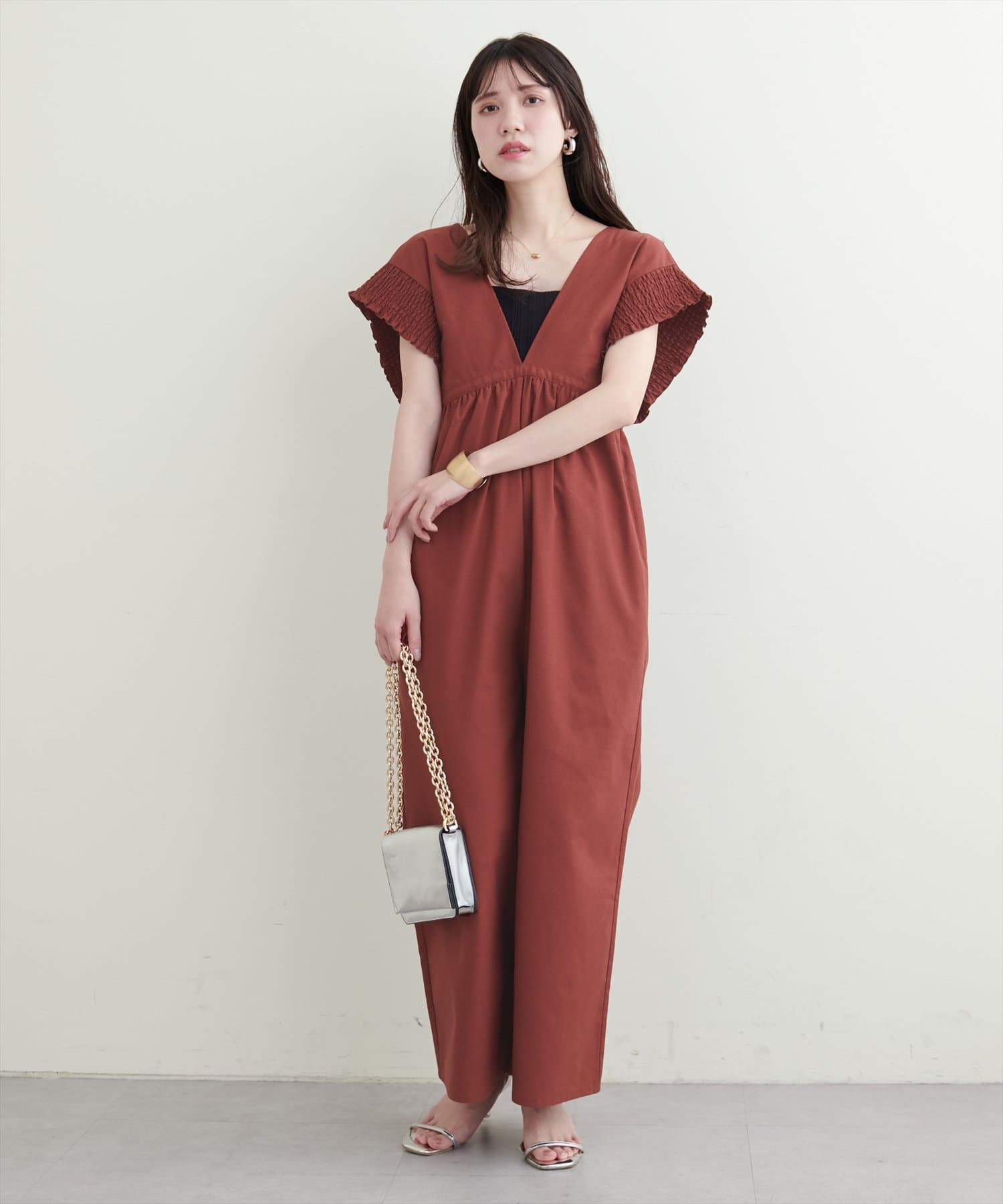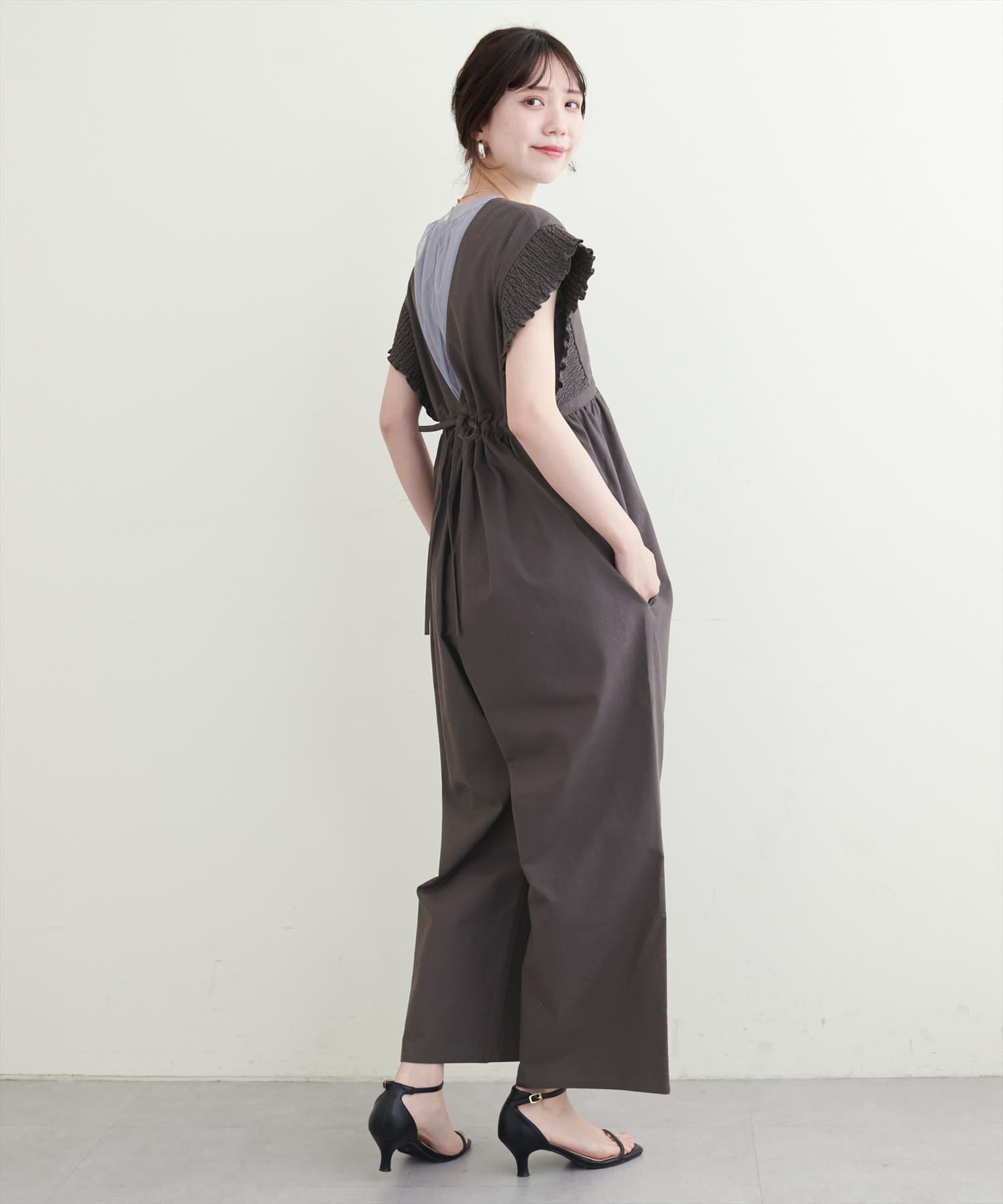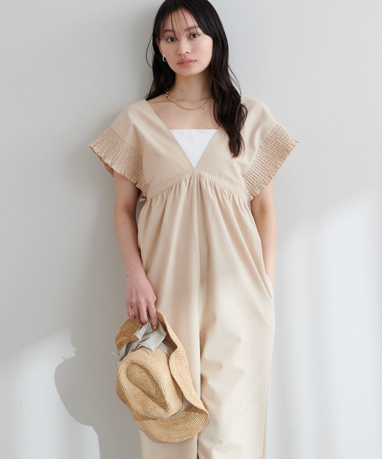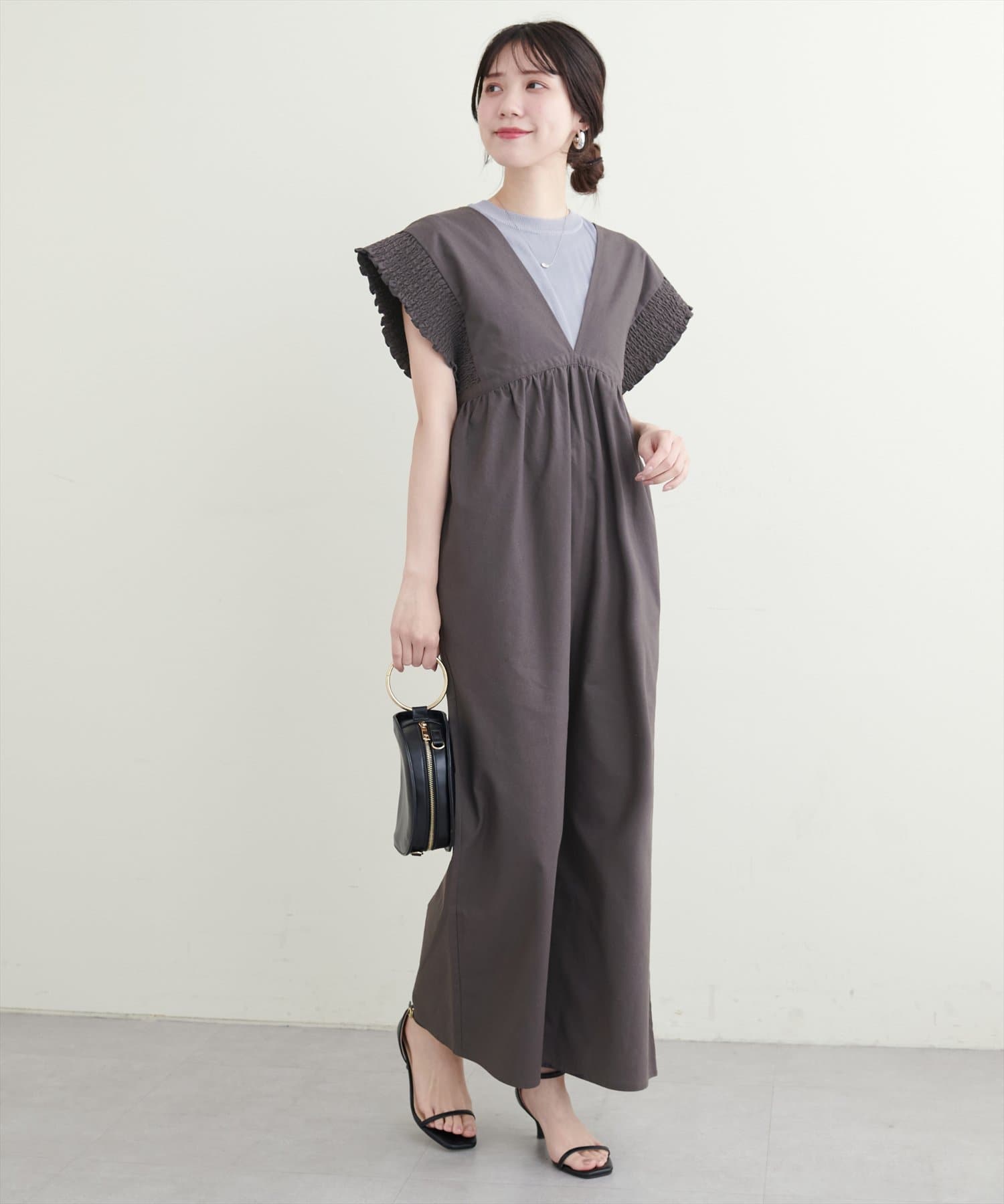 肩にあしらわれたシャーリングがフェミニンで印象的なオールインワン。