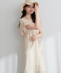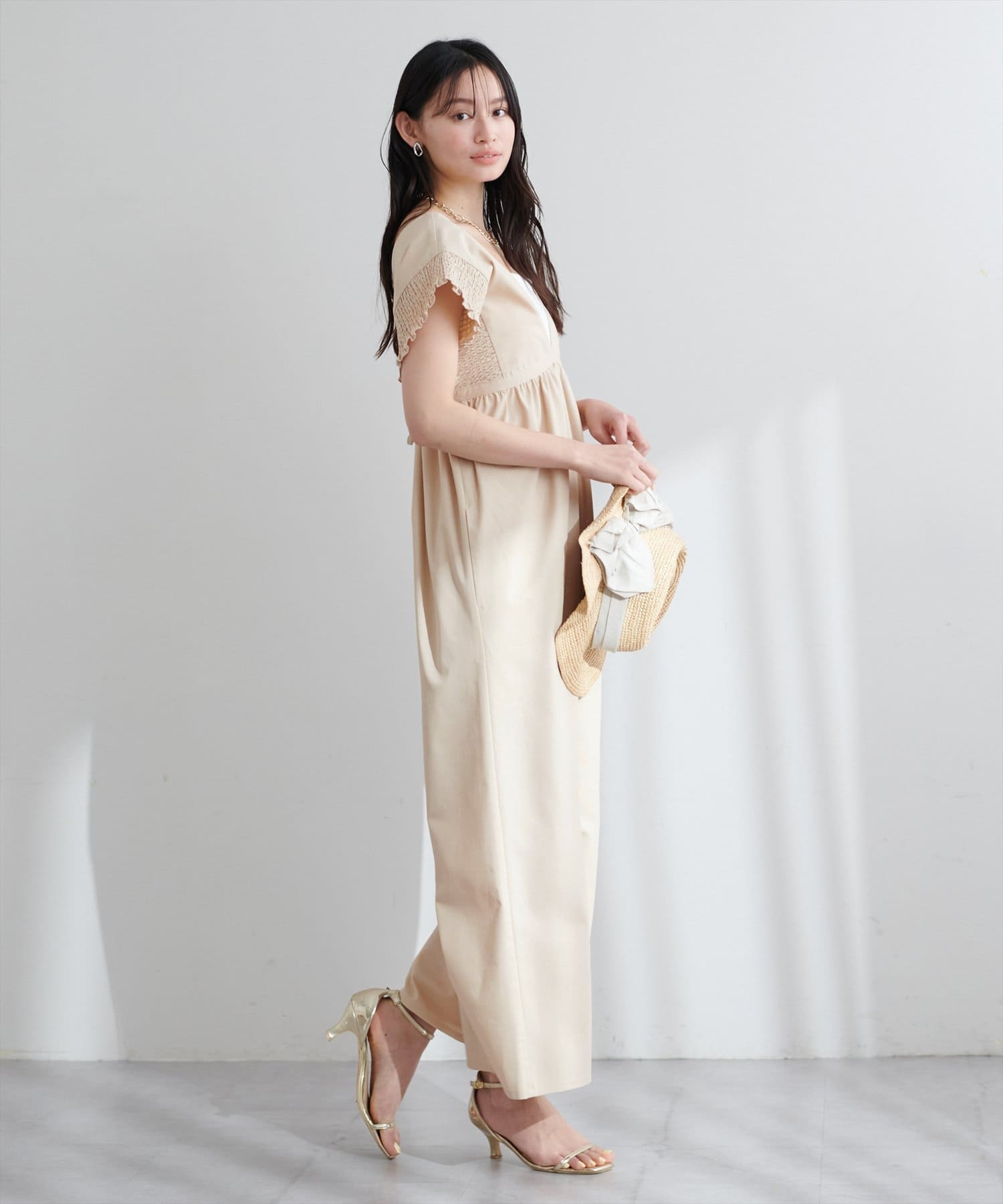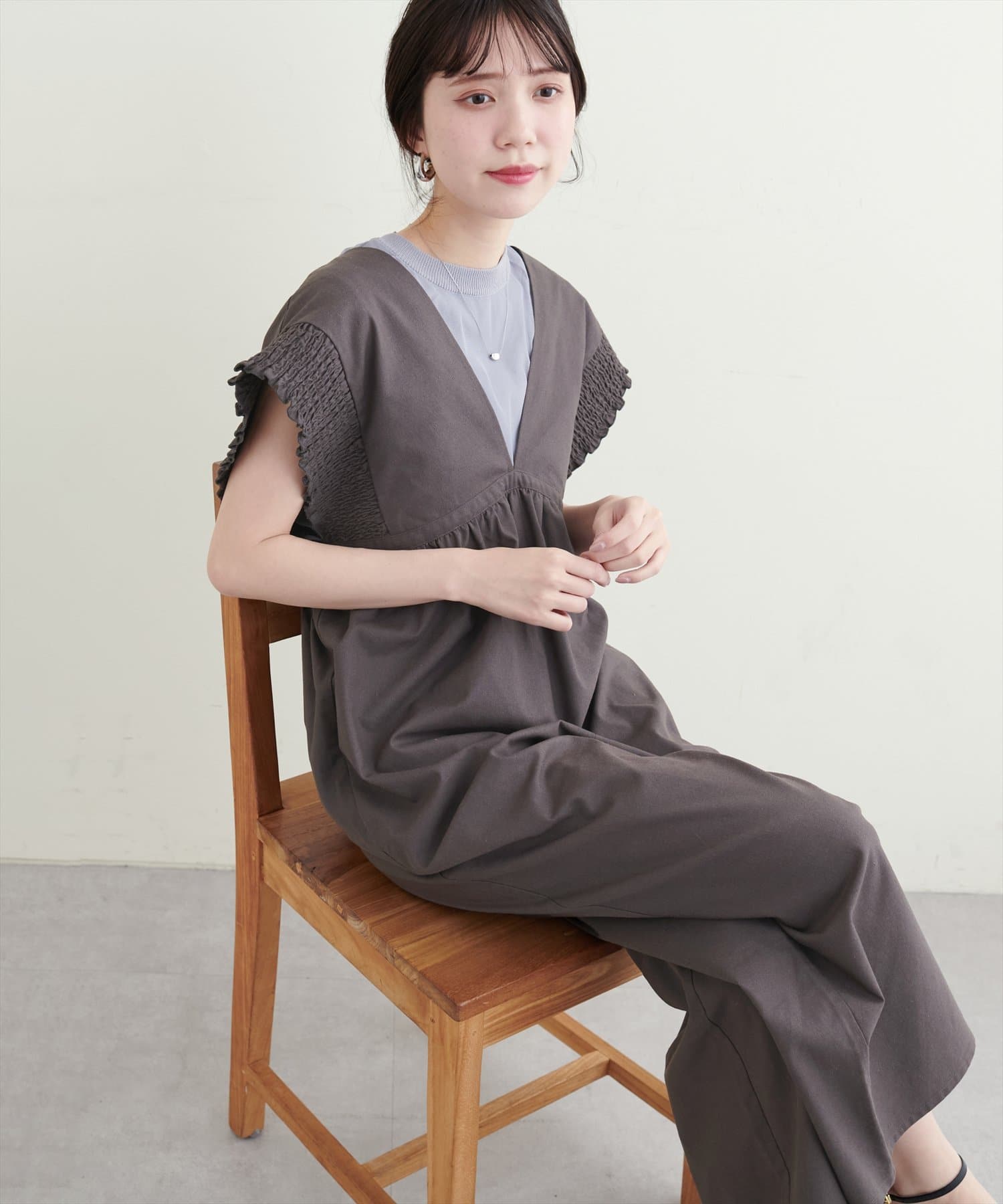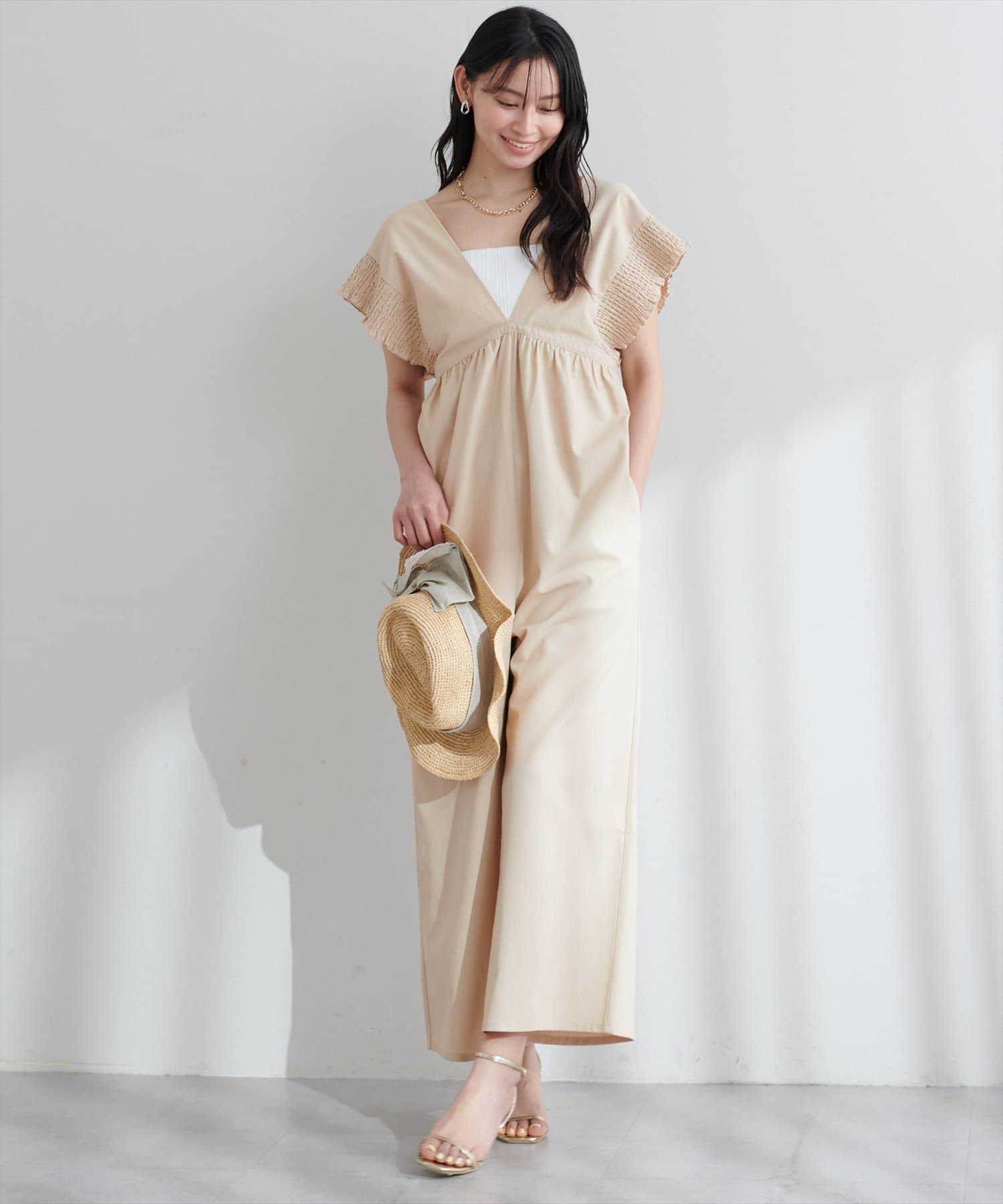 肩にあしらわれたシャーリングがフェミニンで印象的なオールインワン。
