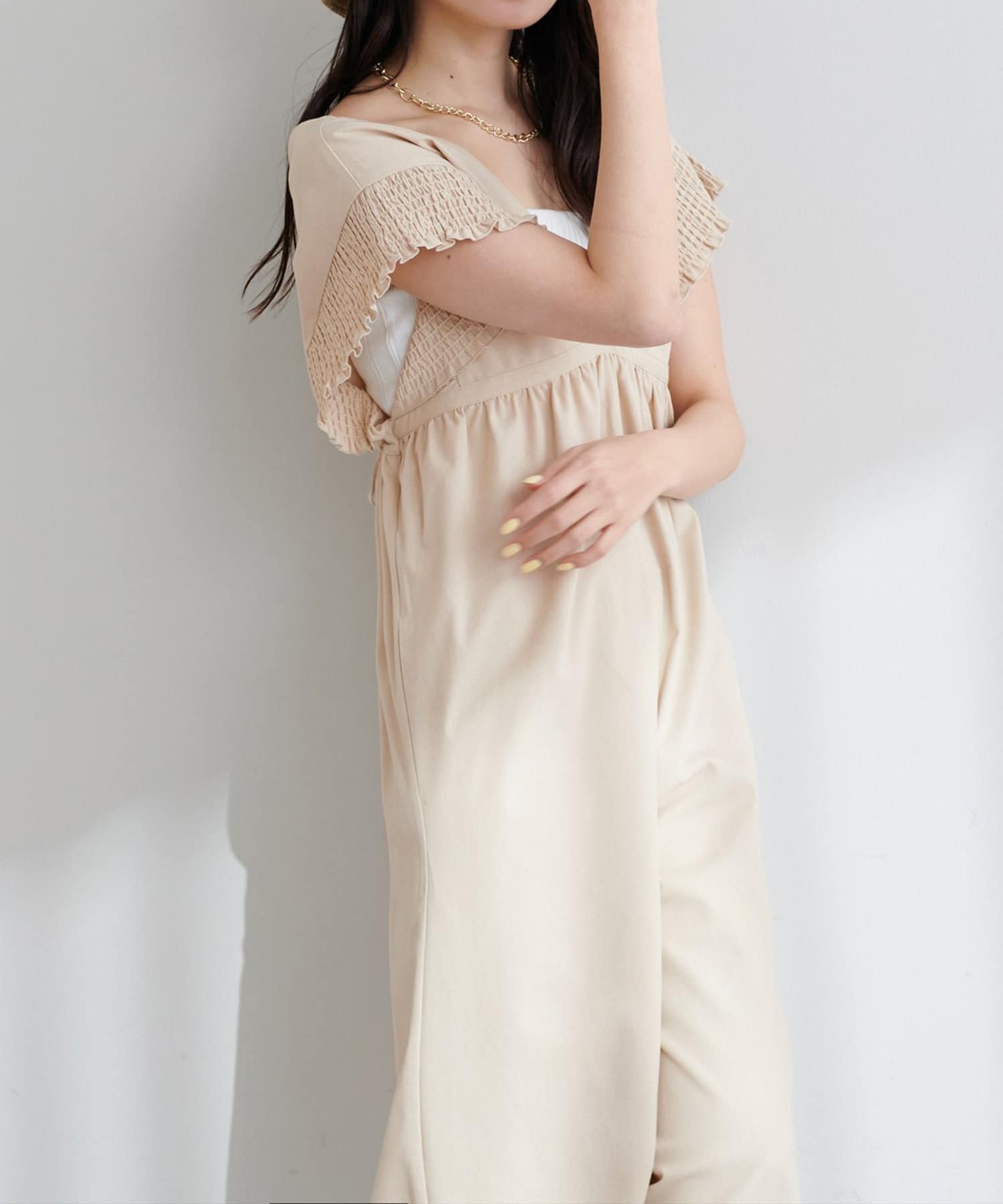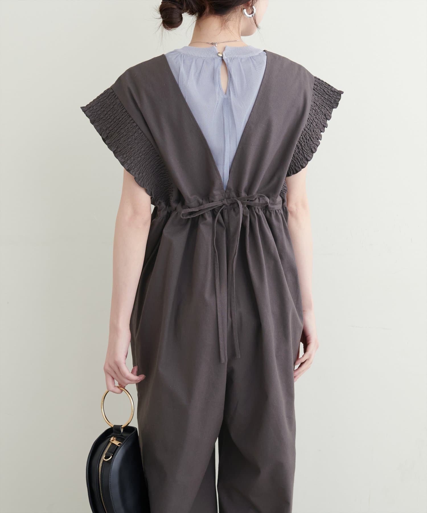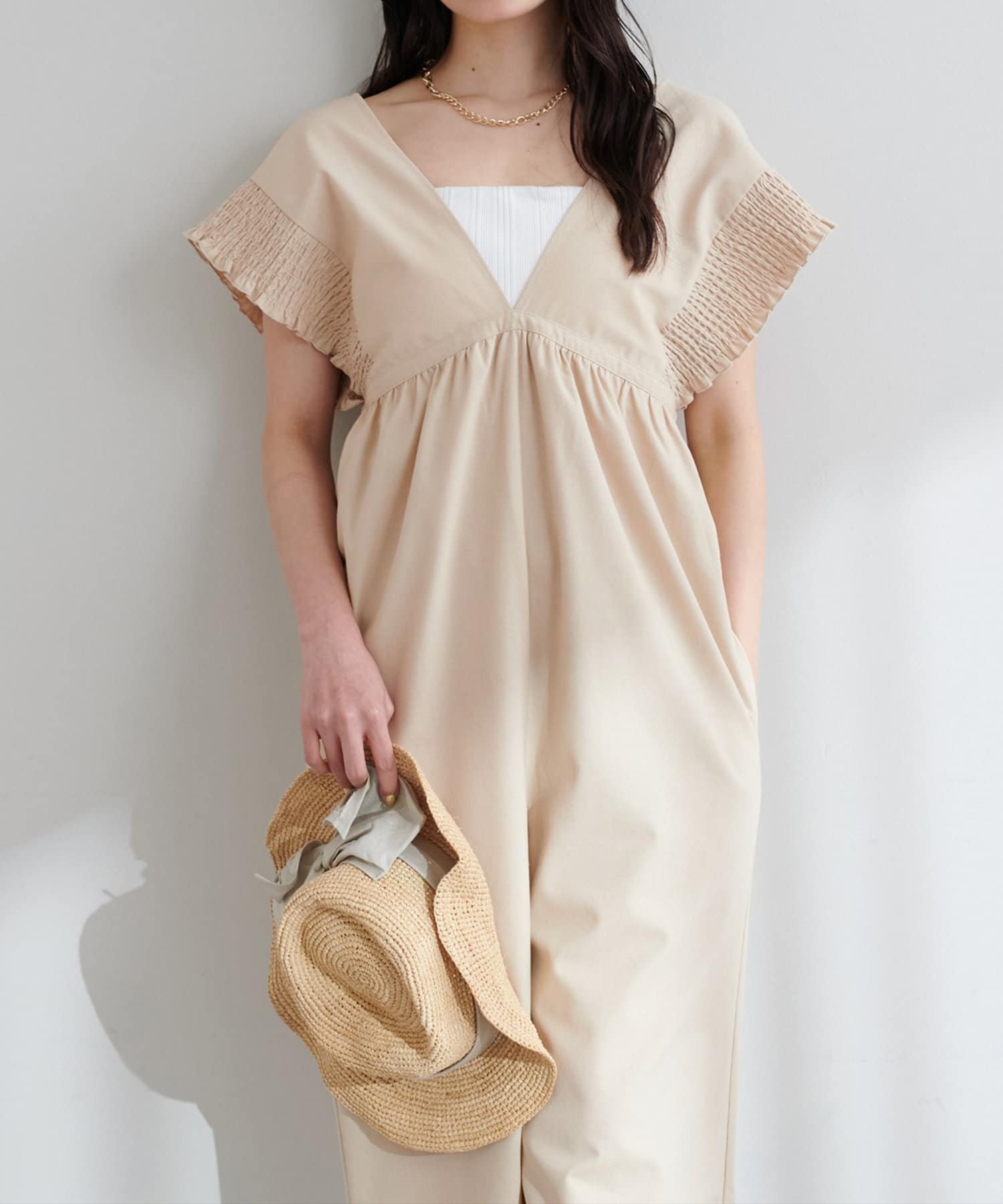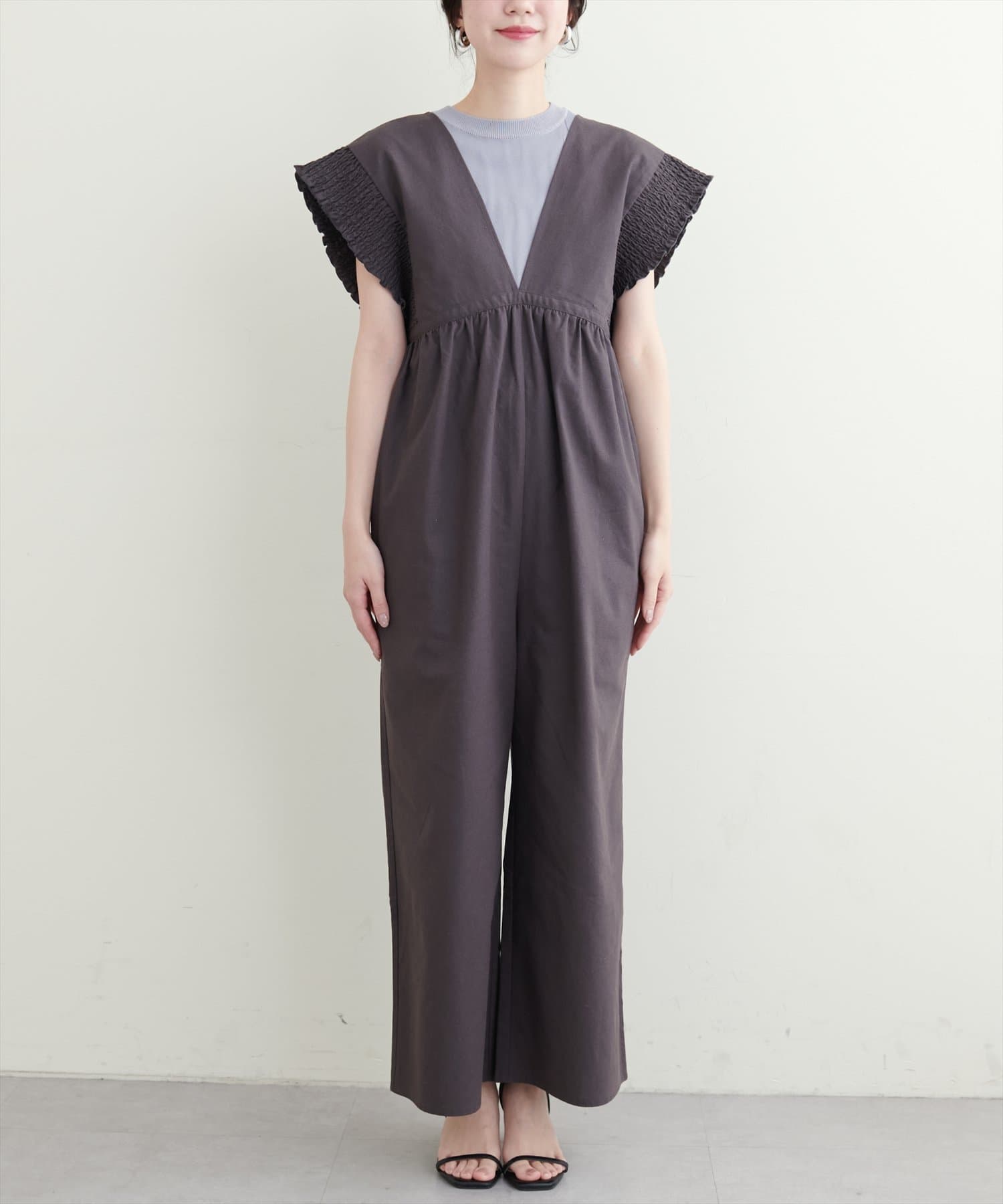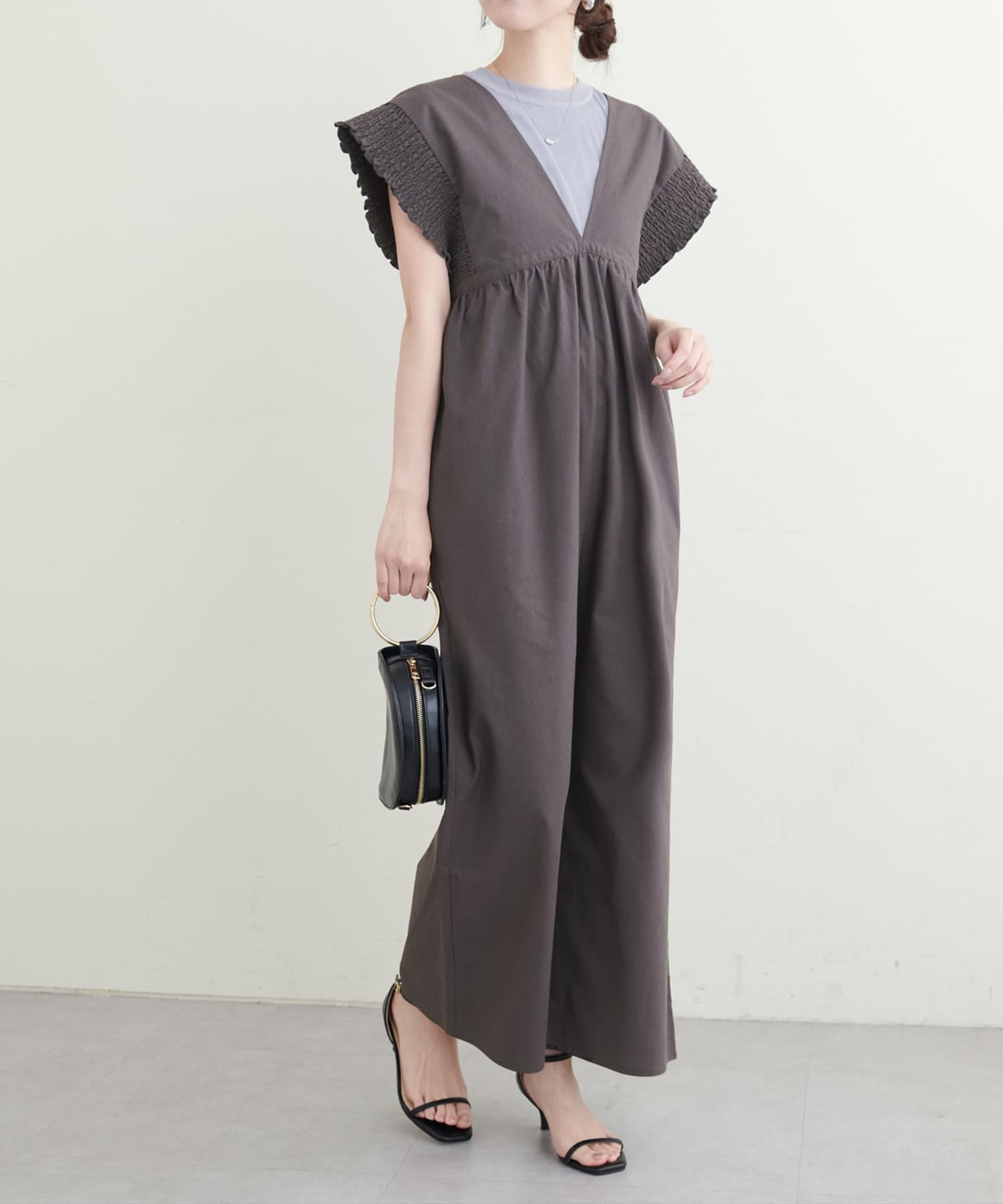 肩にあしらわれたシャーリングがフェミニンで印象的なオールインワン。