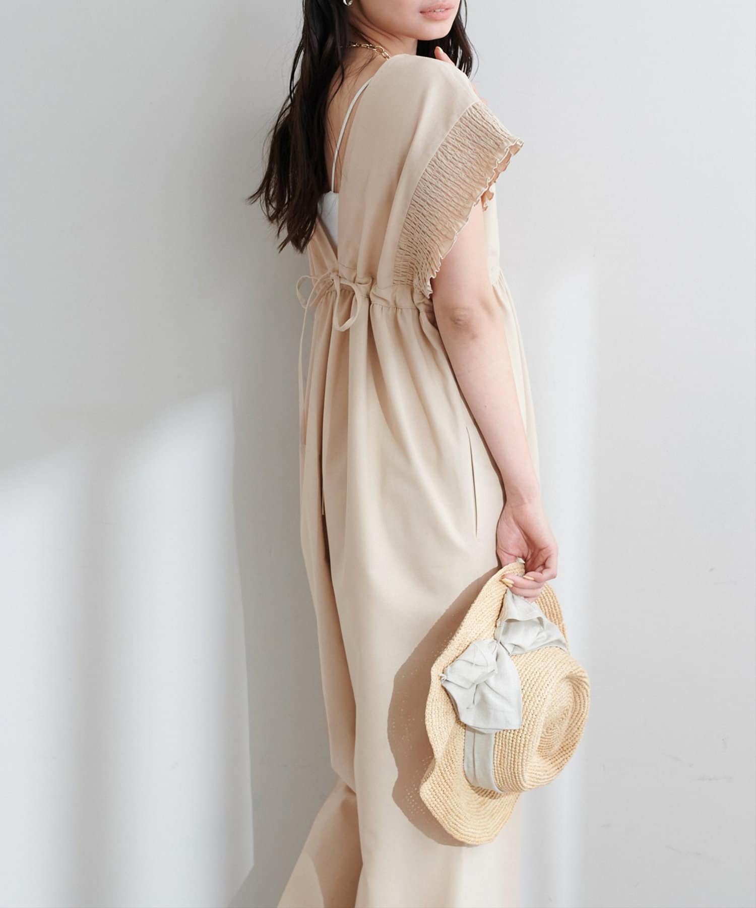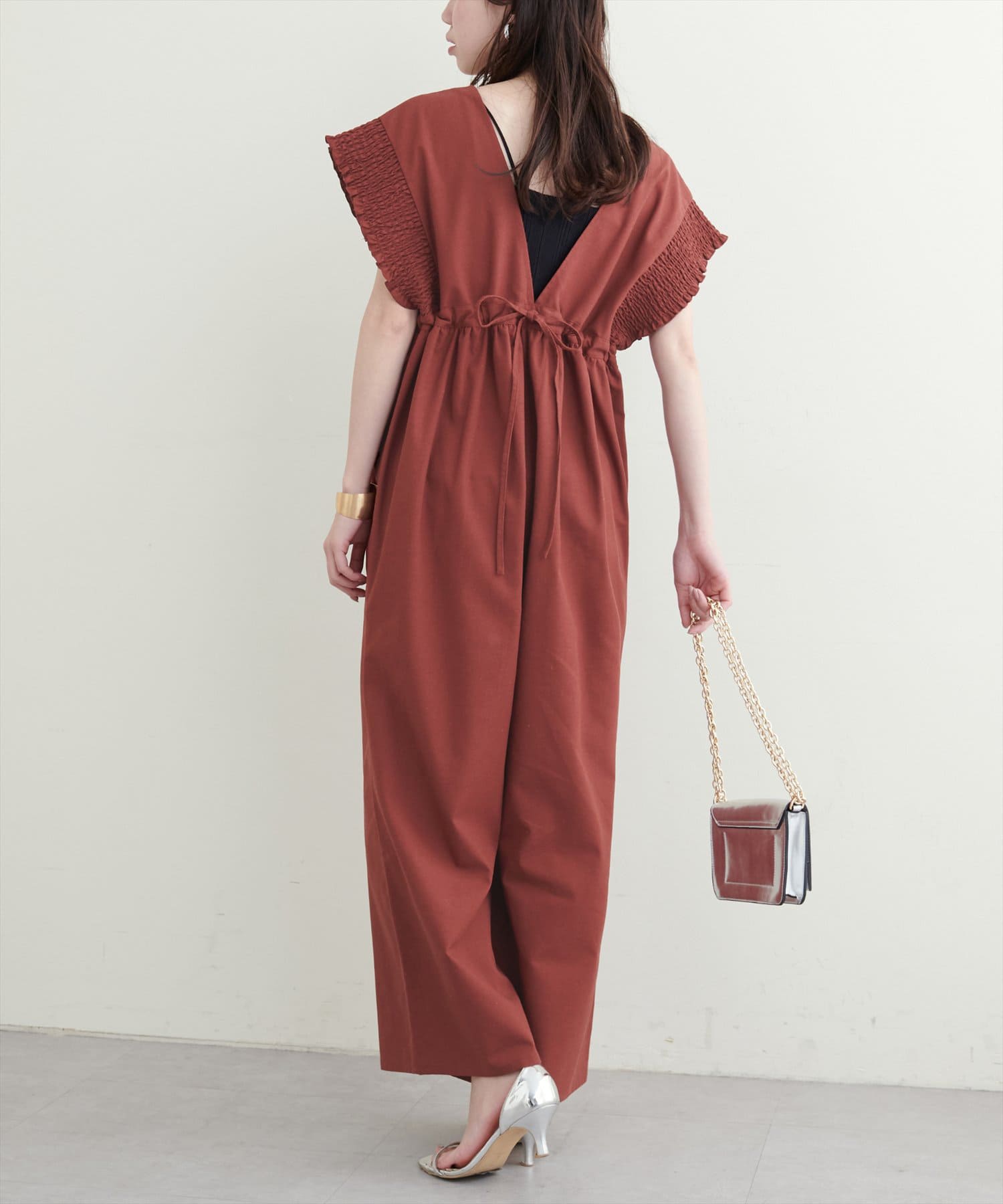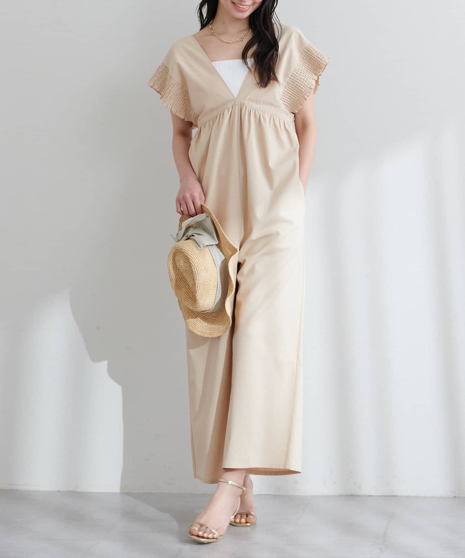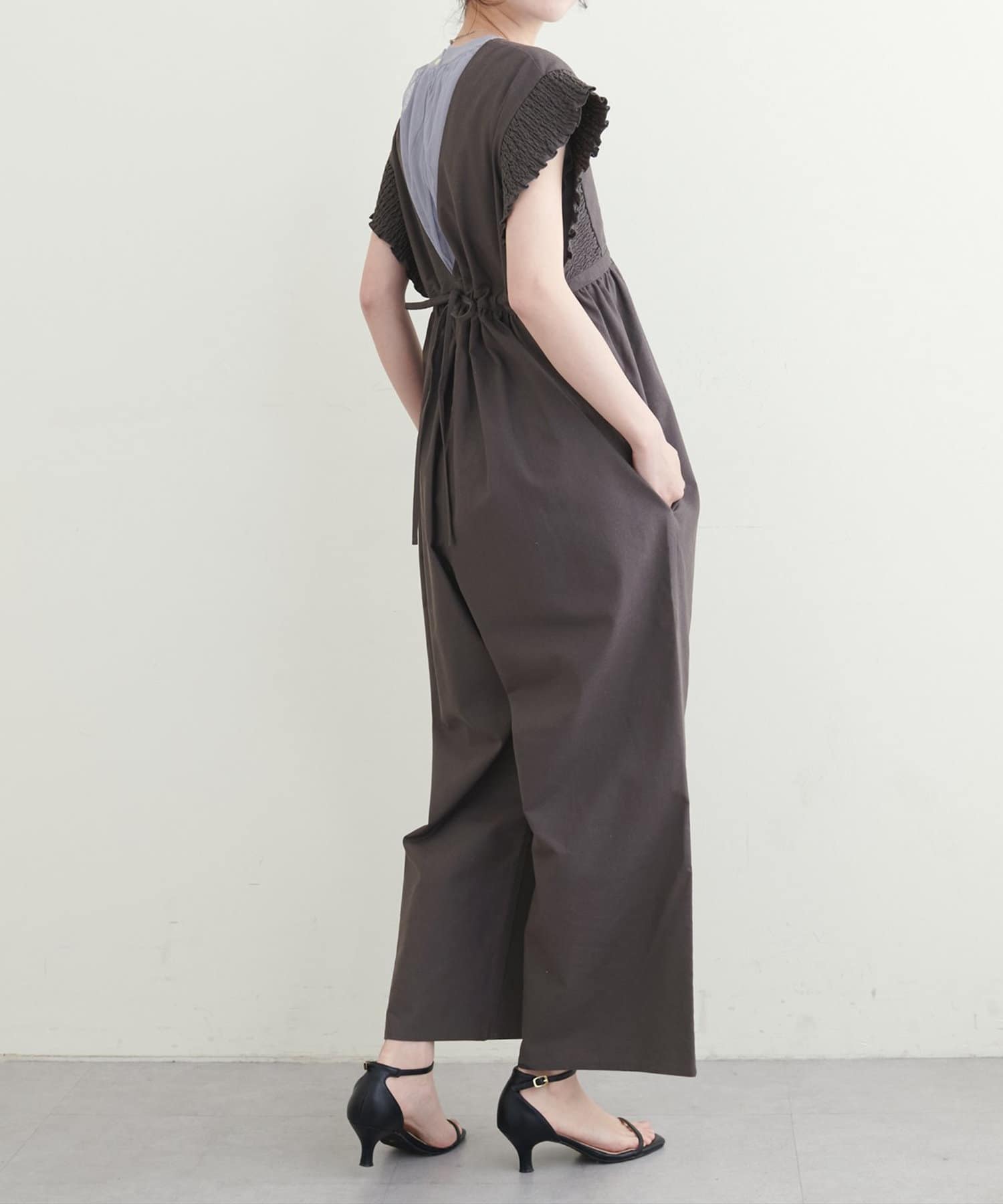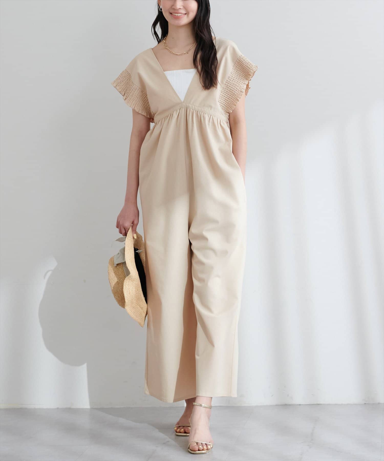 肩にあしらわれたシャーリングがフェミニンで印象的なオールインワン。
