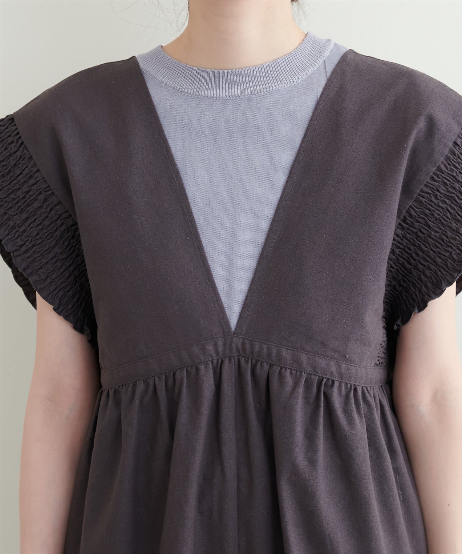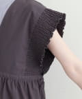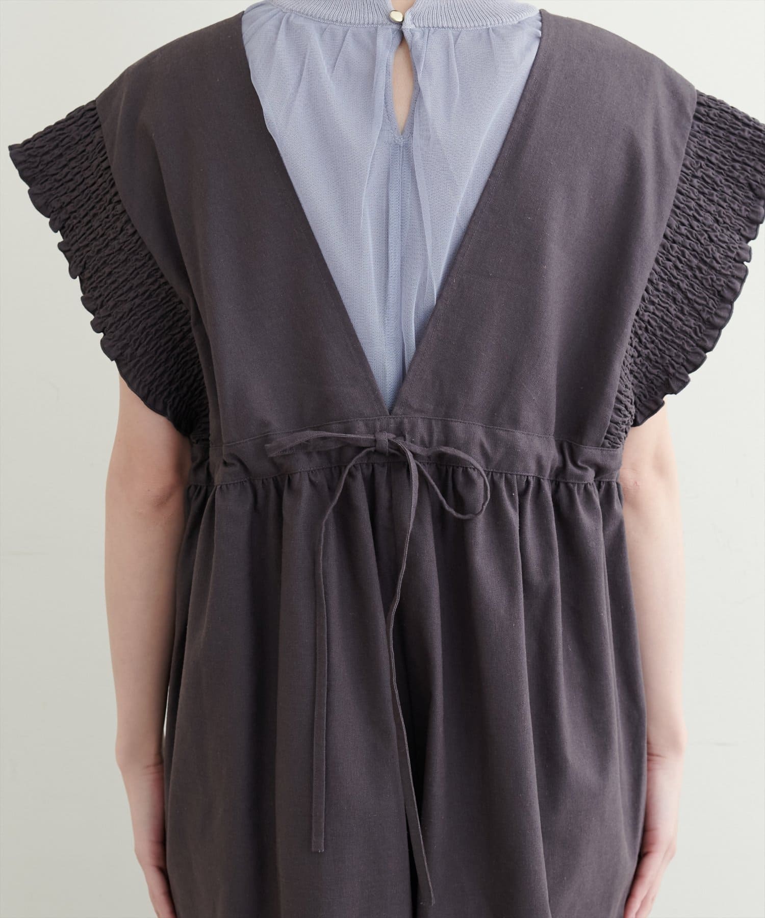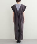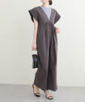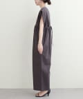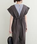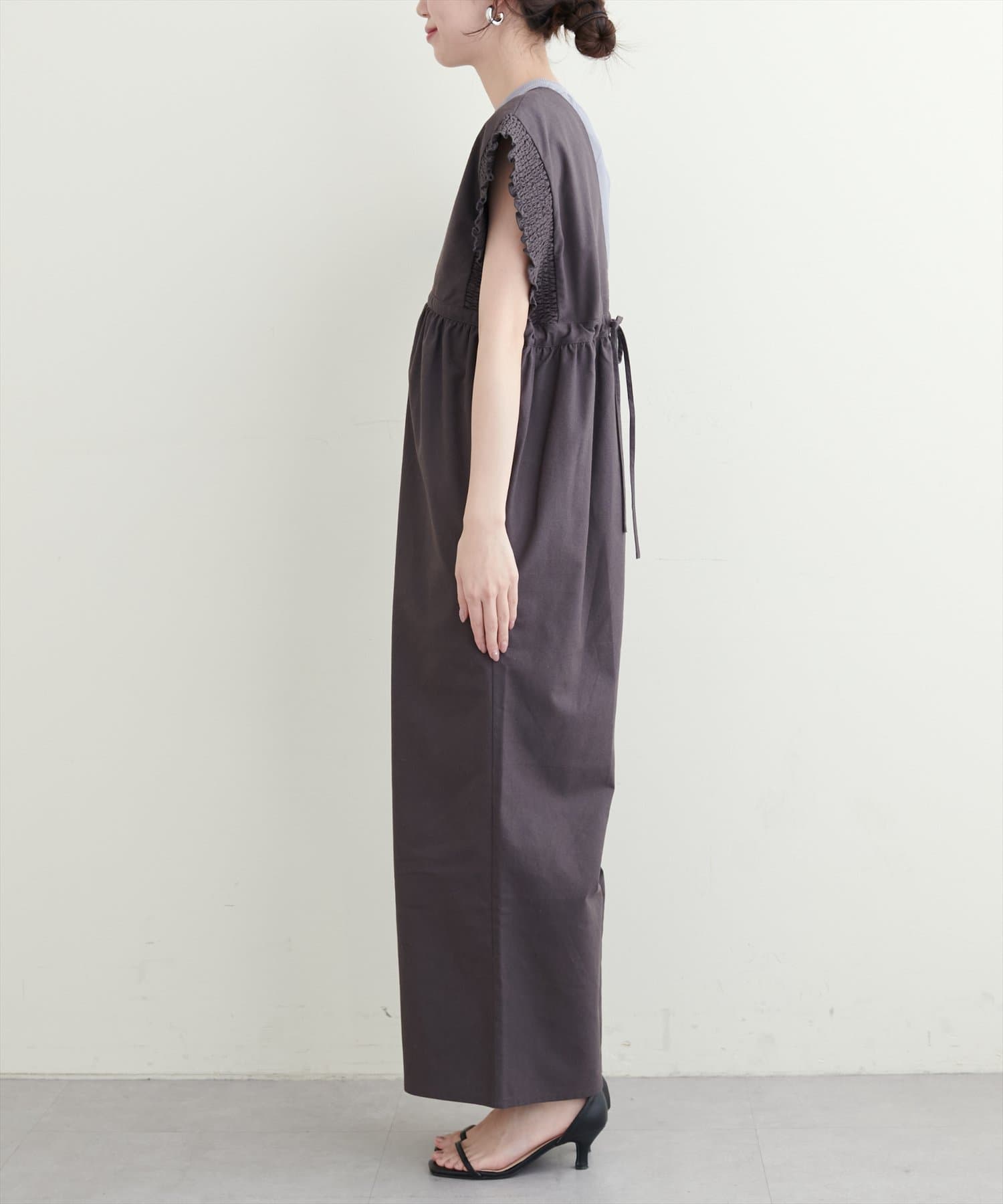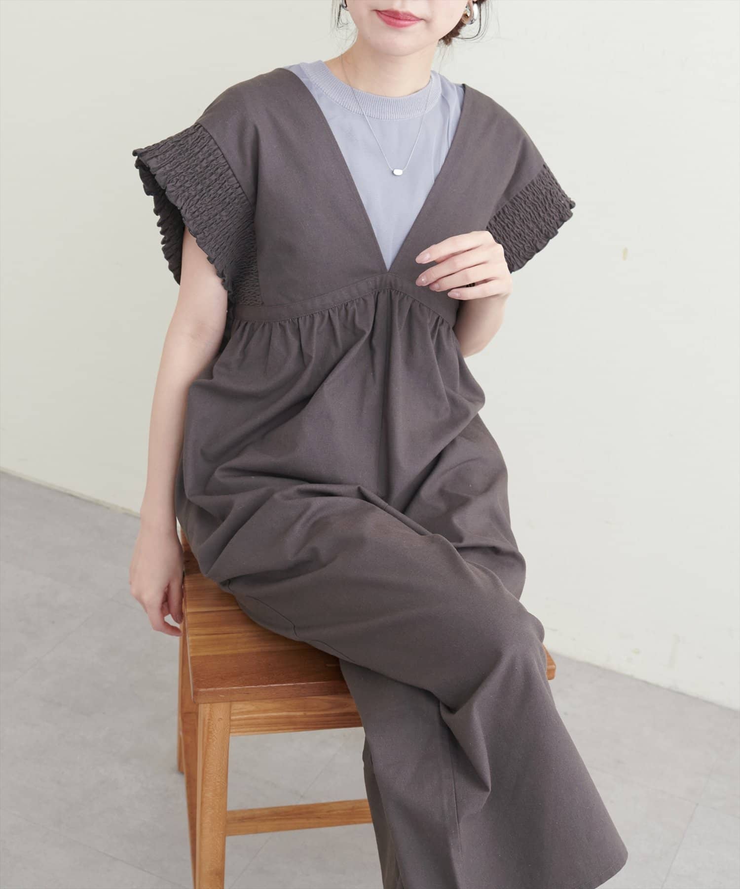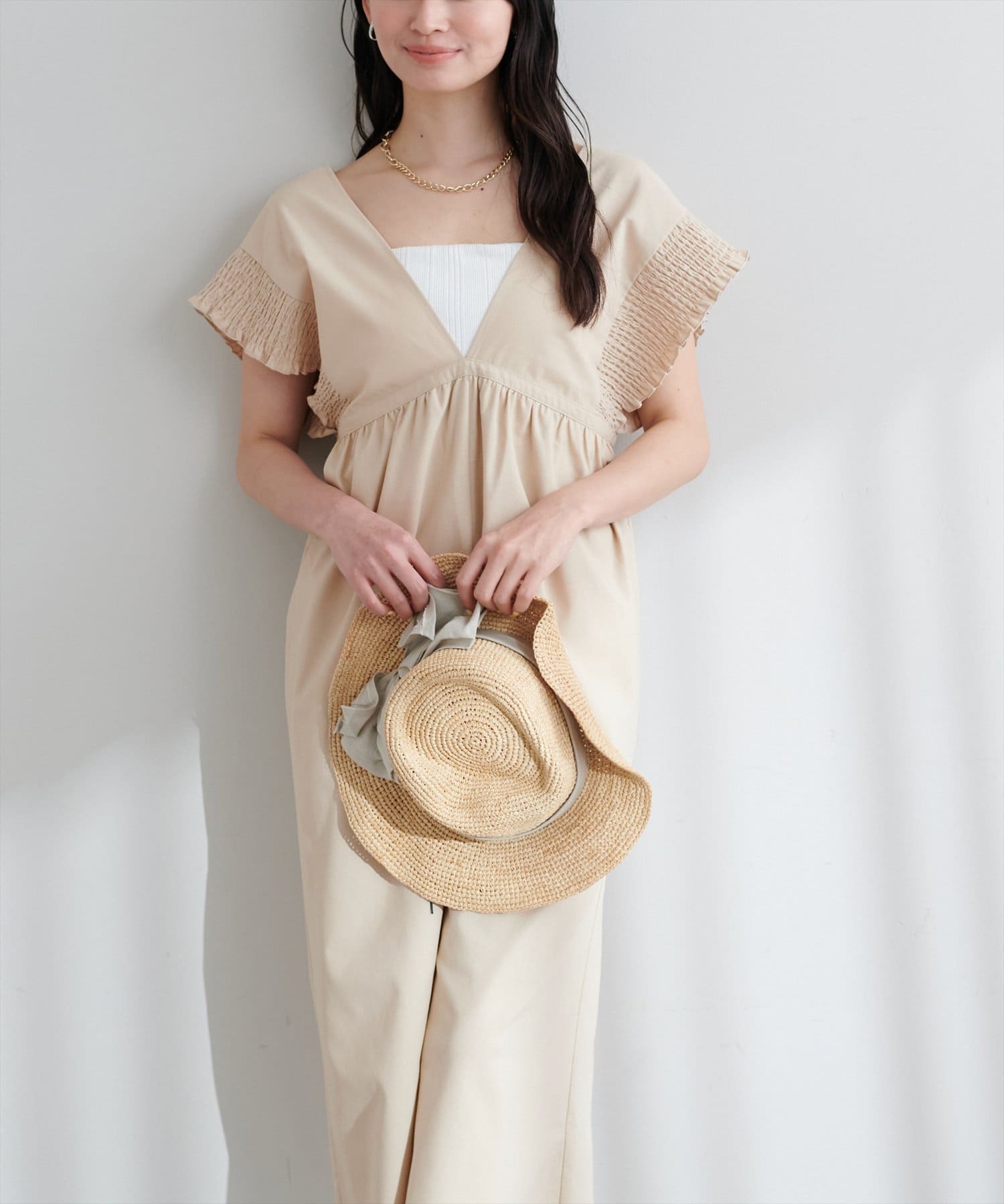 肩にあしらわれたシャーリングがフェミニンで印象的なオールインワン。