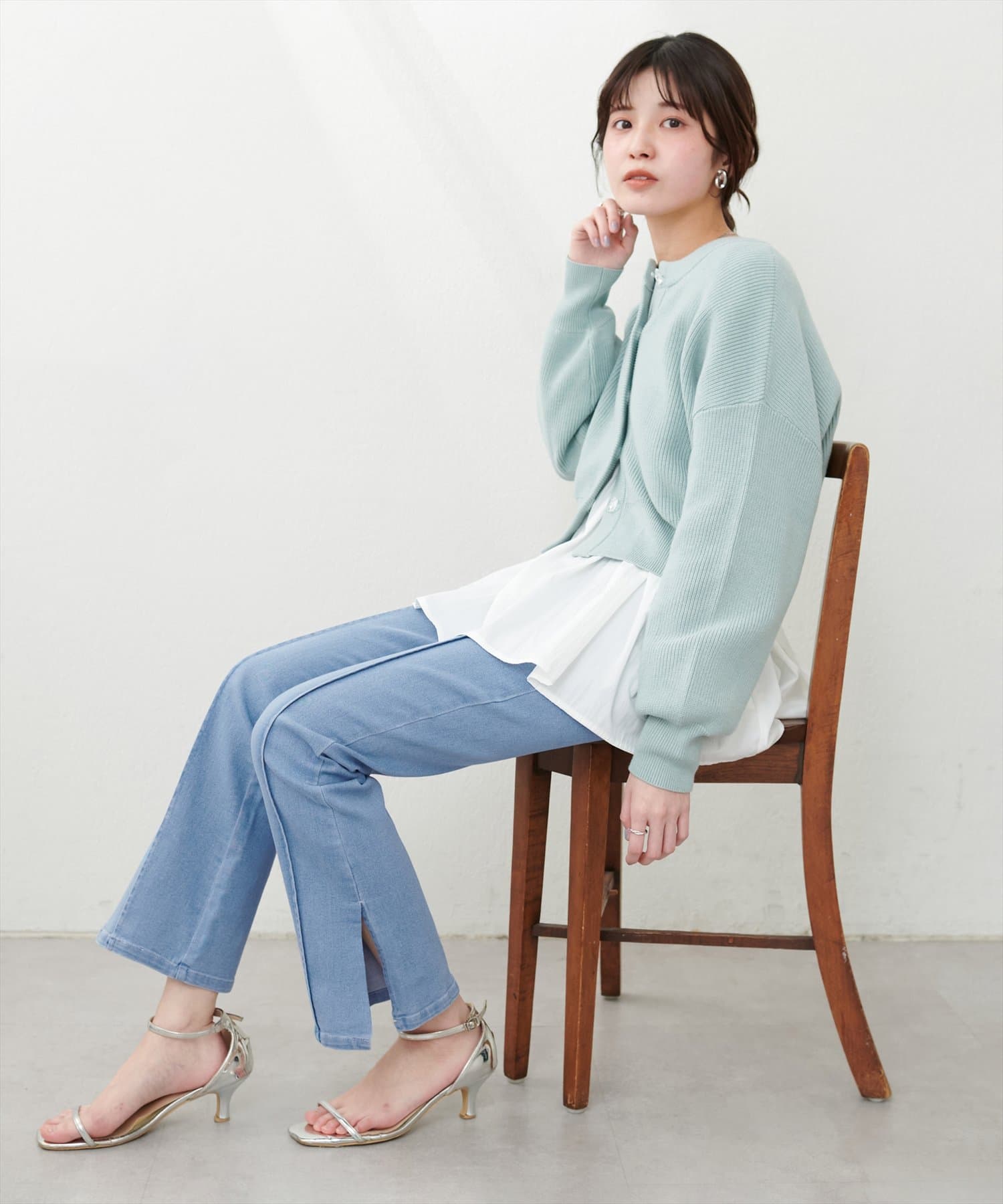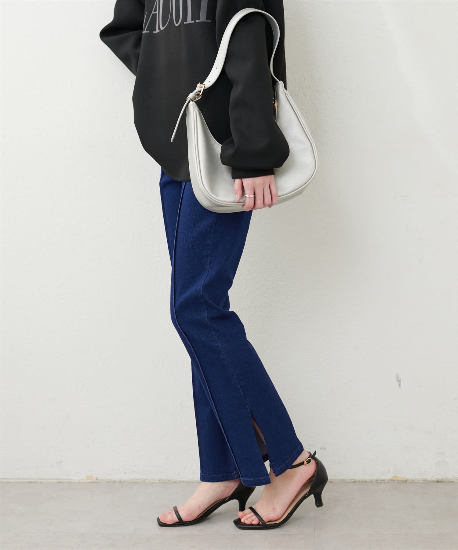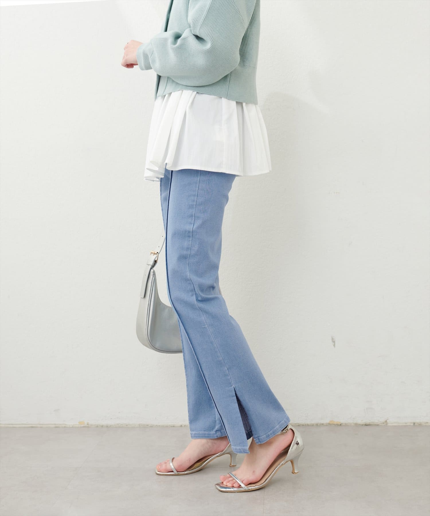 裾のスリットで足首をちら見せしてコーディネートに抜け感をプラス。