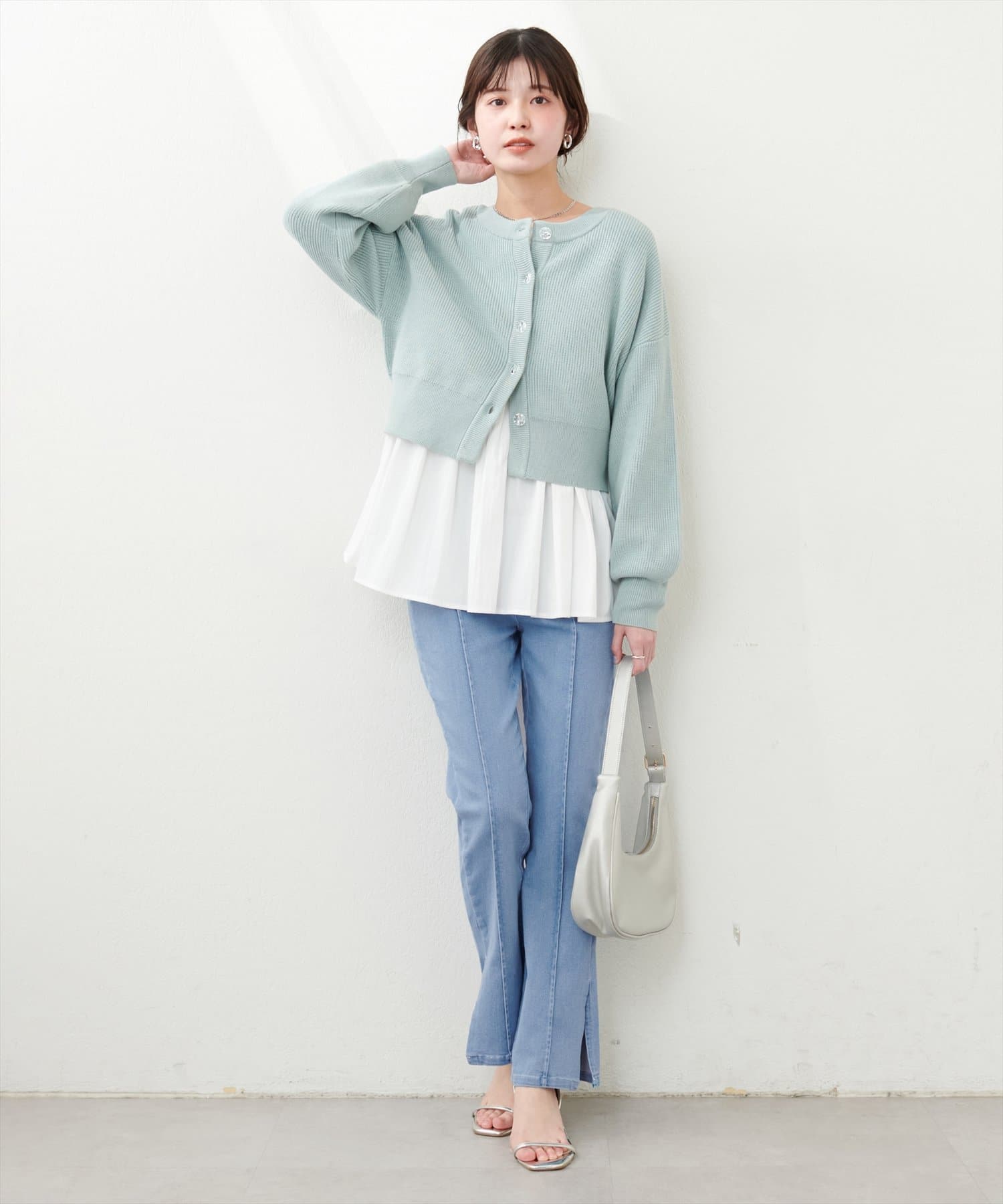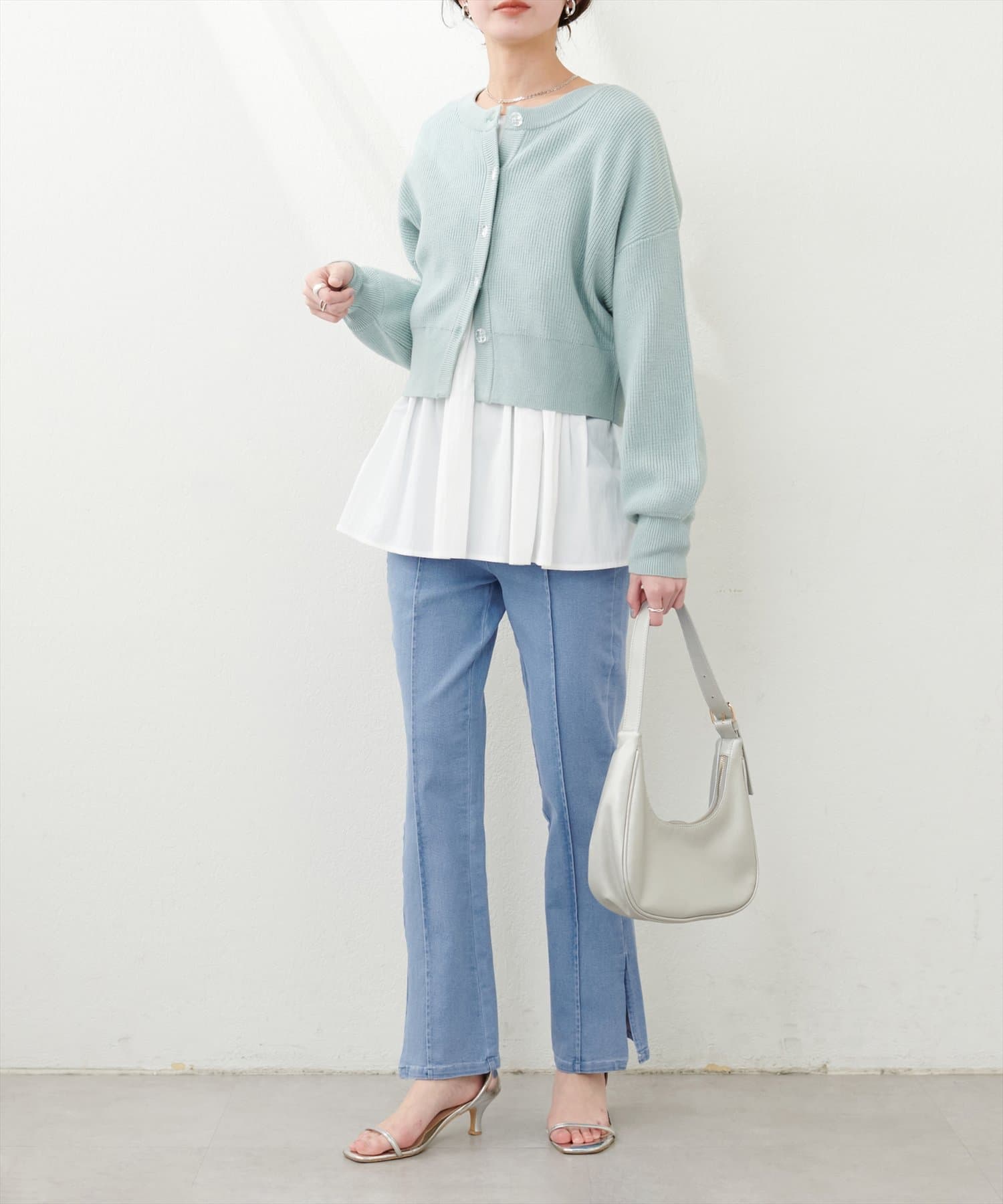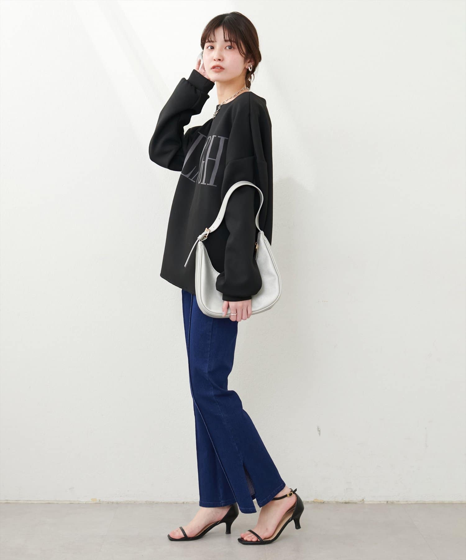 裾のスリットで足首をちら見せしてコーディネートに抜け感をプラス。