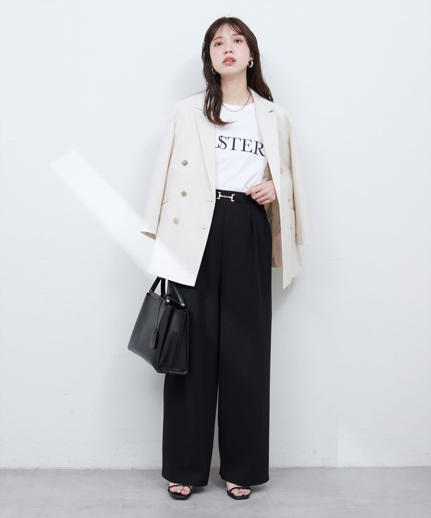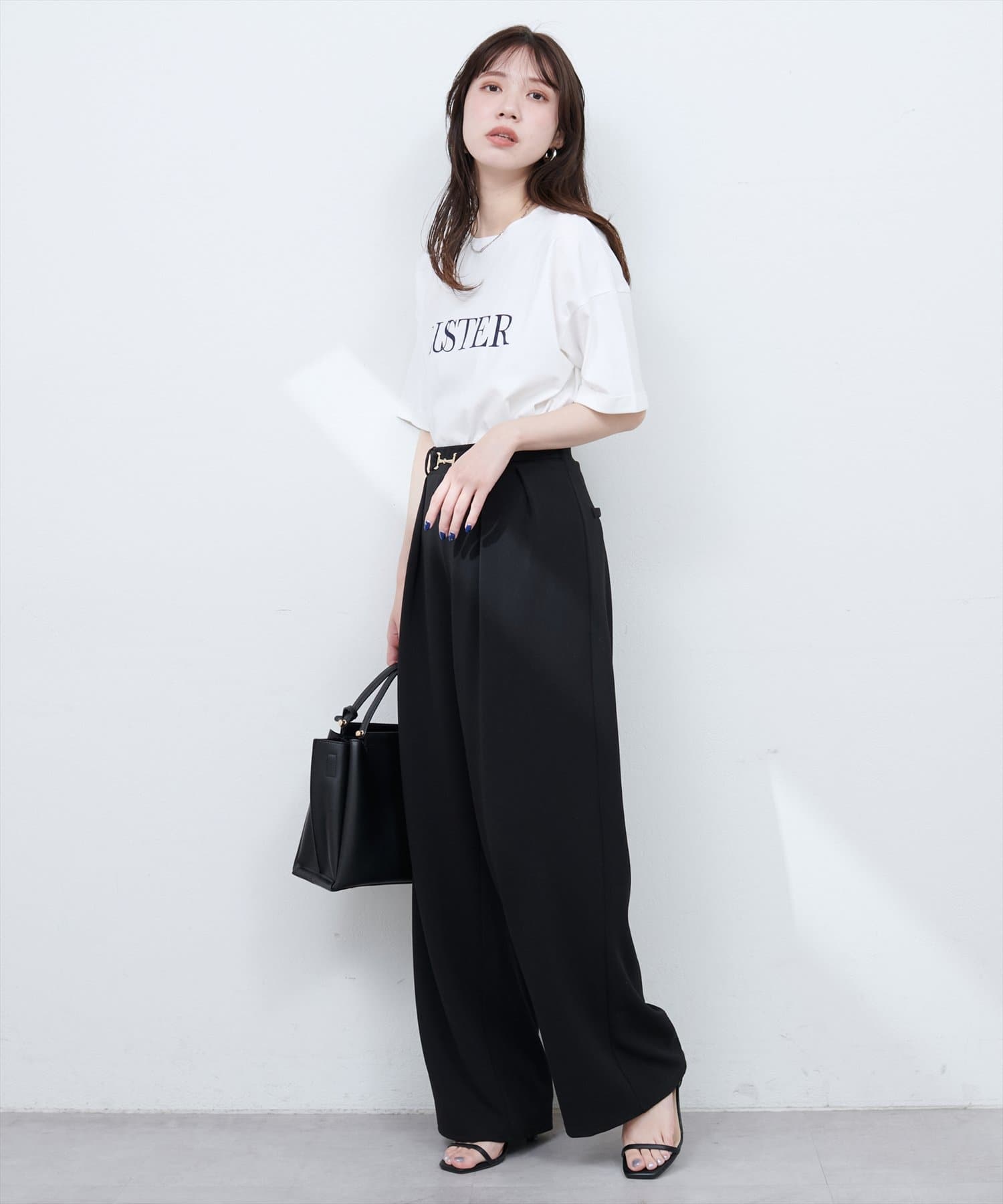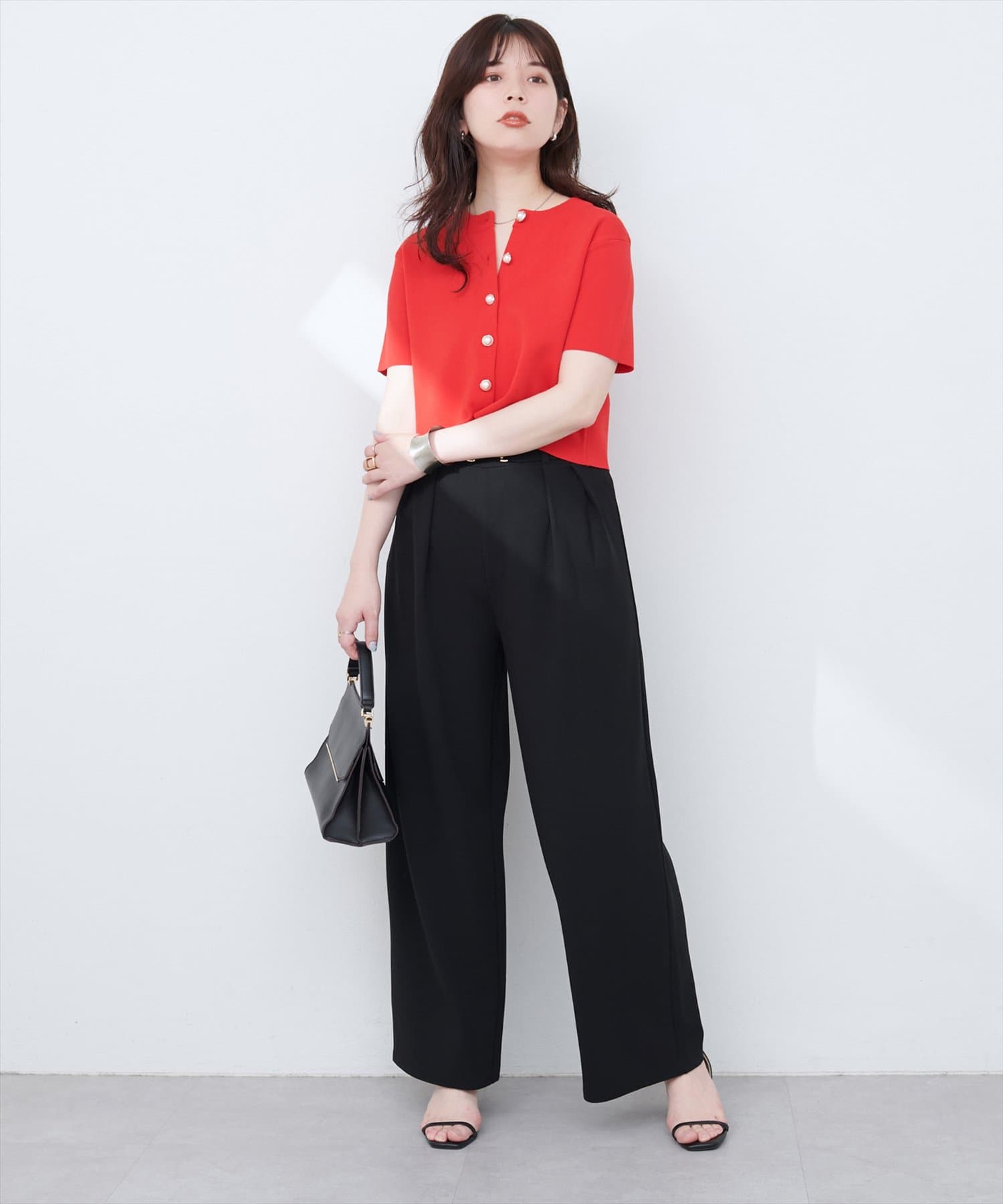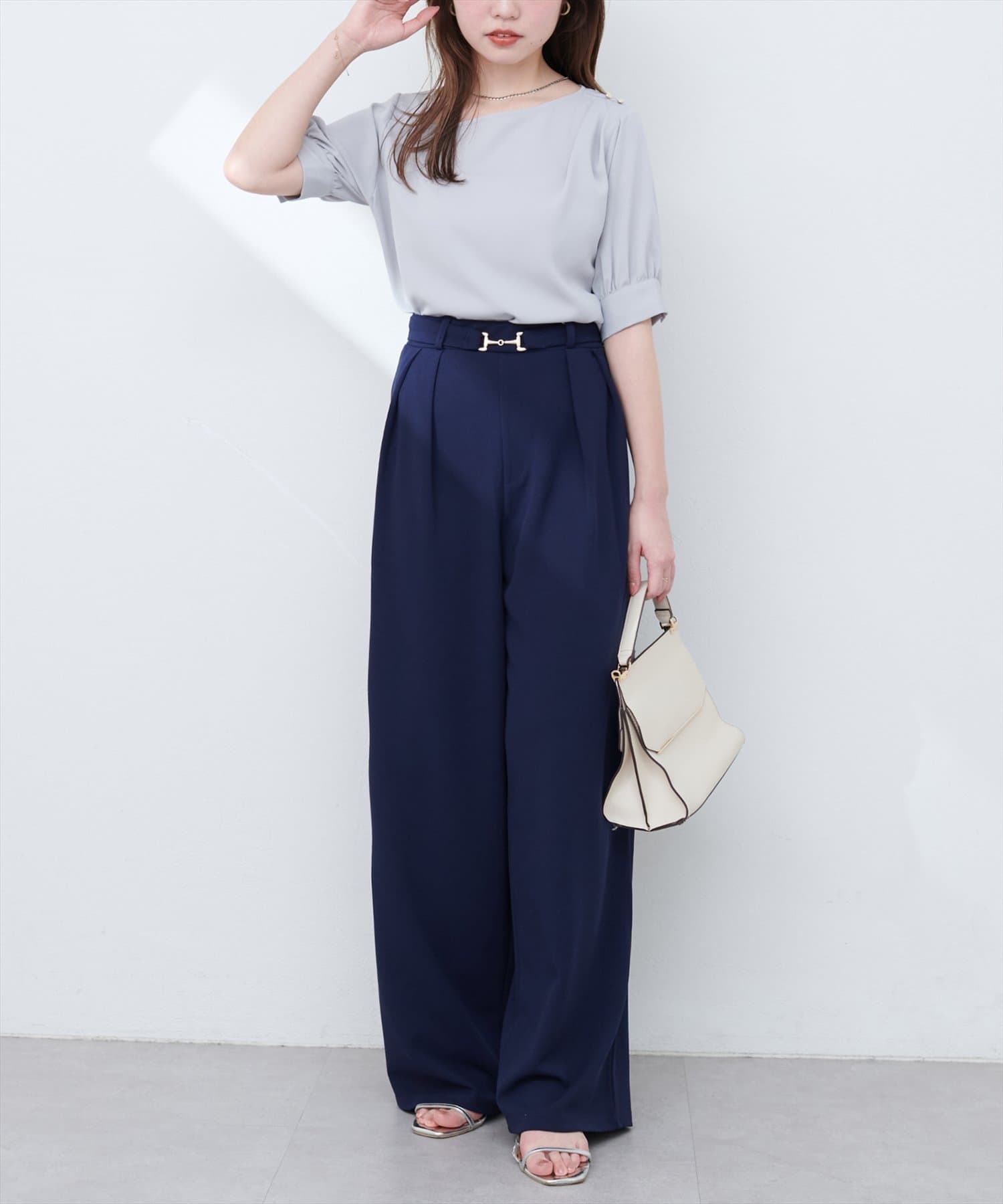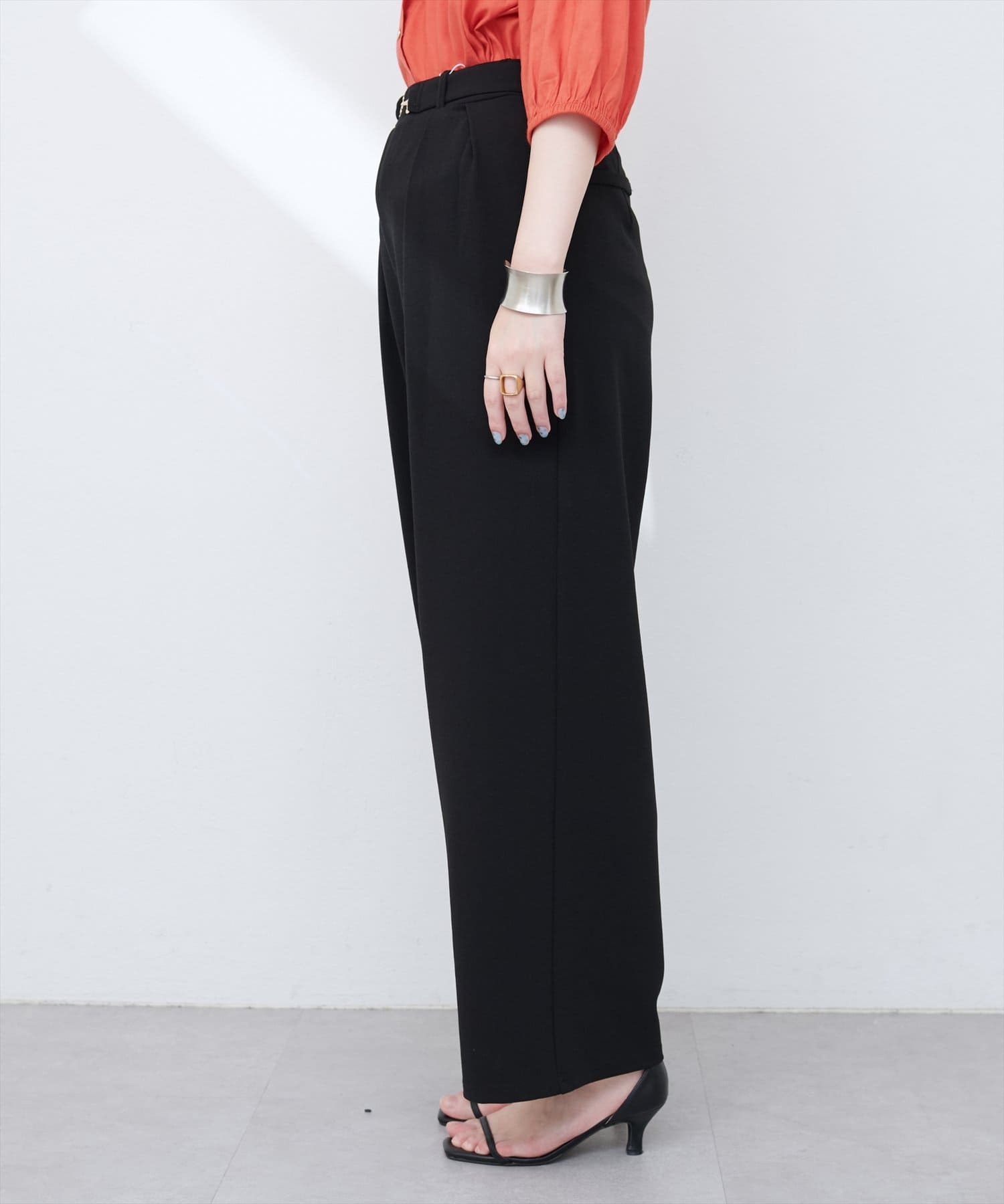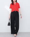 ハイウエストデザインなので、コンパクトな丈感のトップスをウエストアウトでも◎