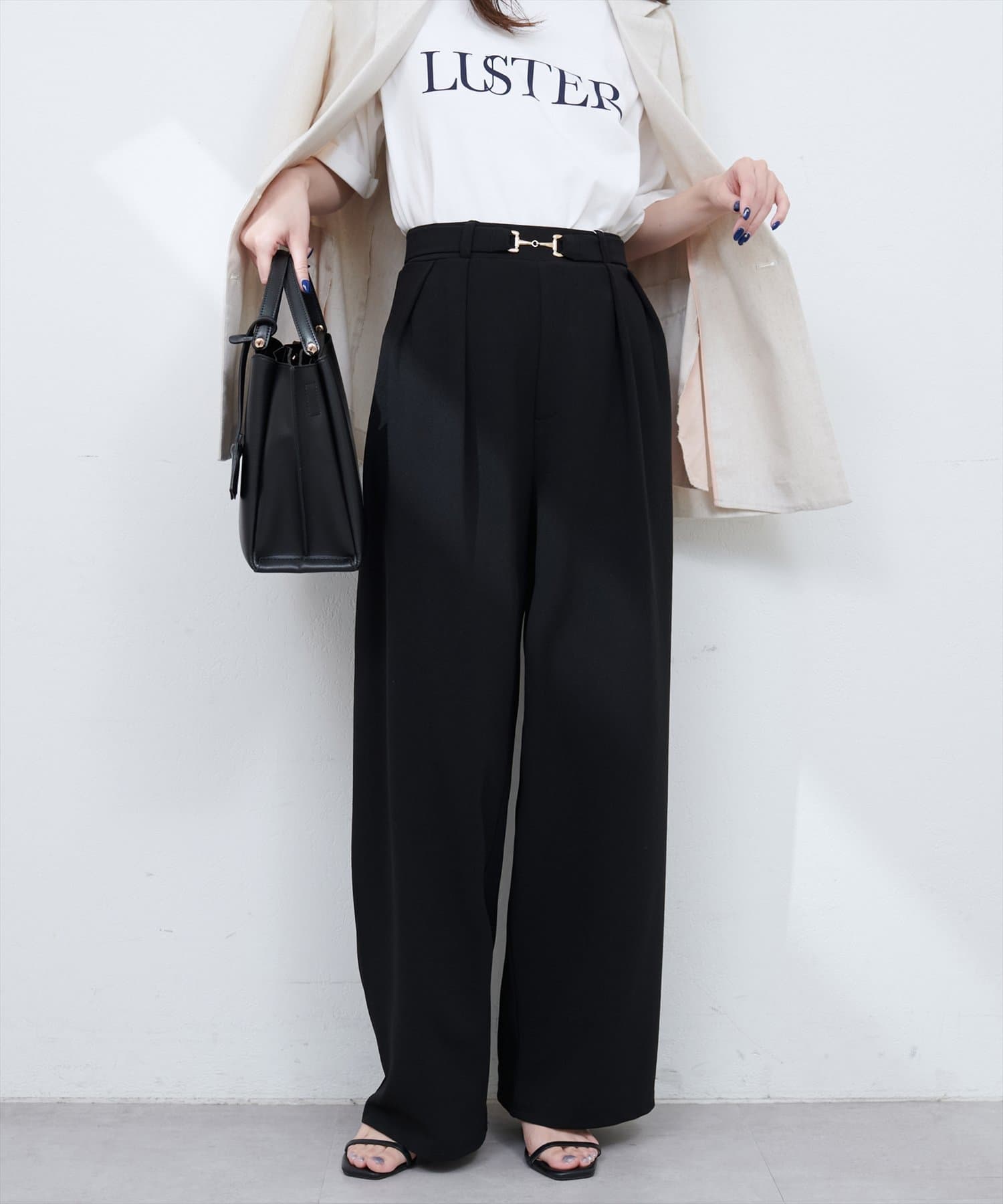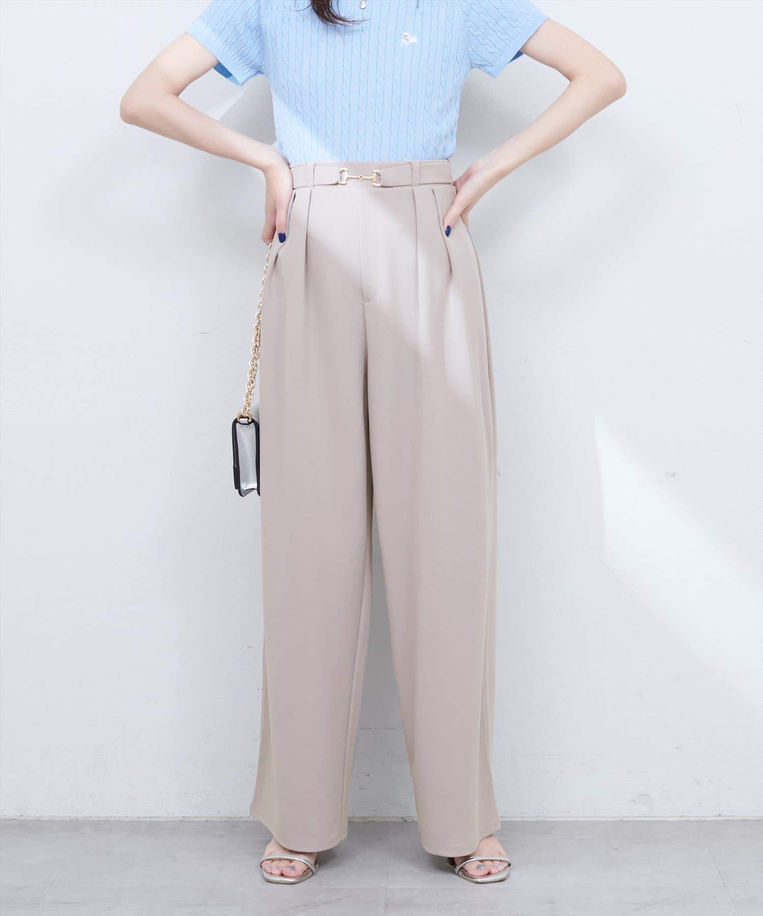 ウエストのビットベルトを引き立てるため、トップスをウエストインしたスタイリングがおすすめです。
