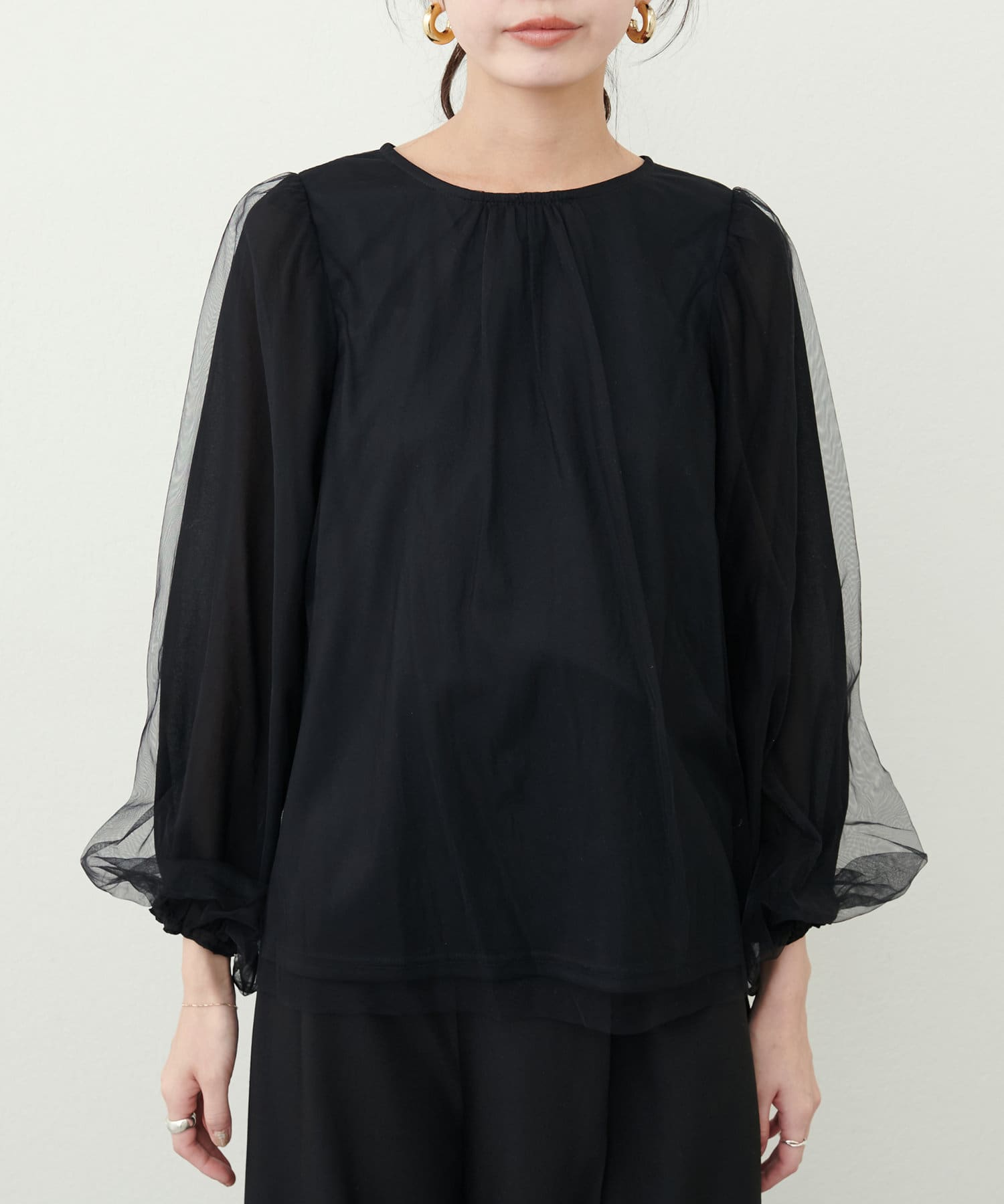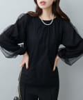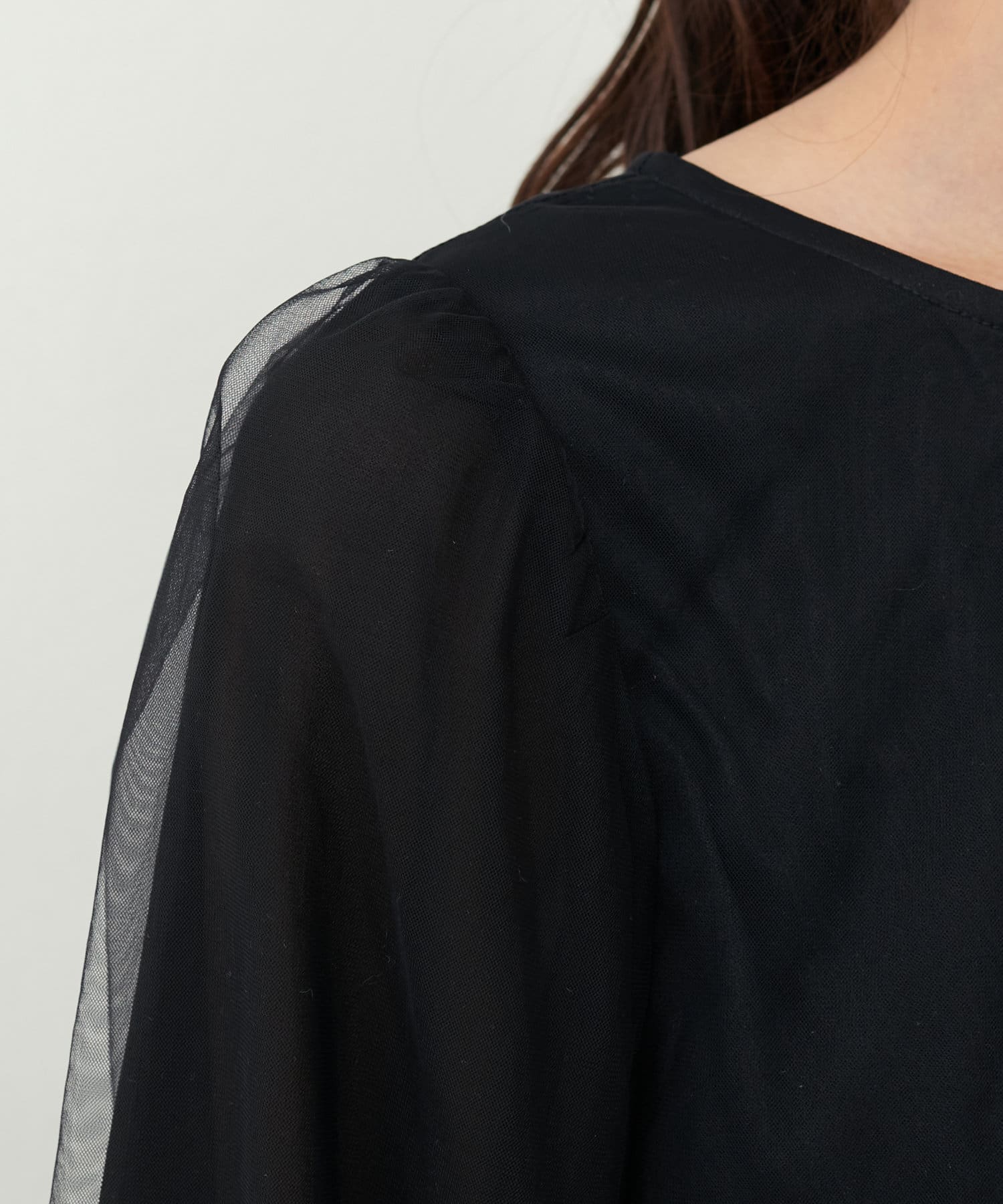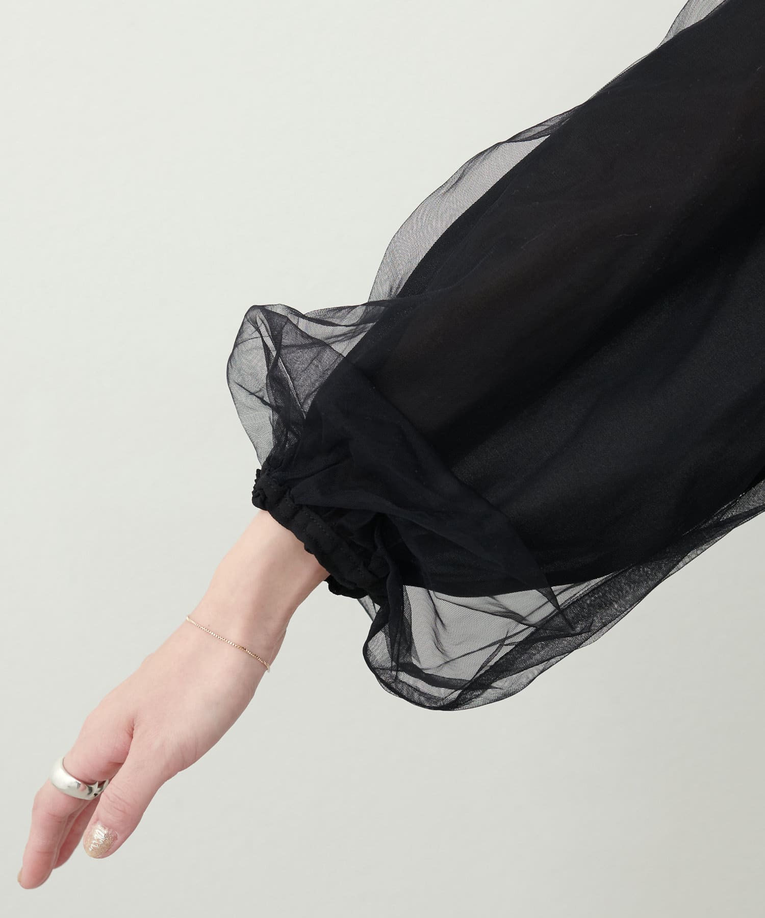 ふわっとしたチュールでコーデに甘さをプラスし、柔らかい雰囲気に。