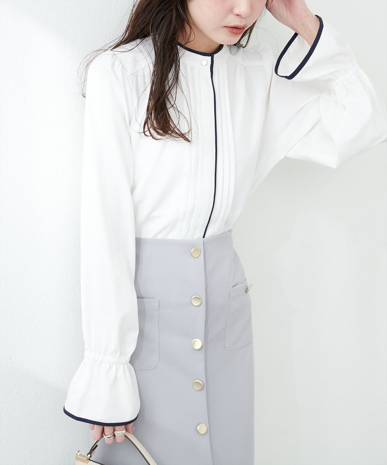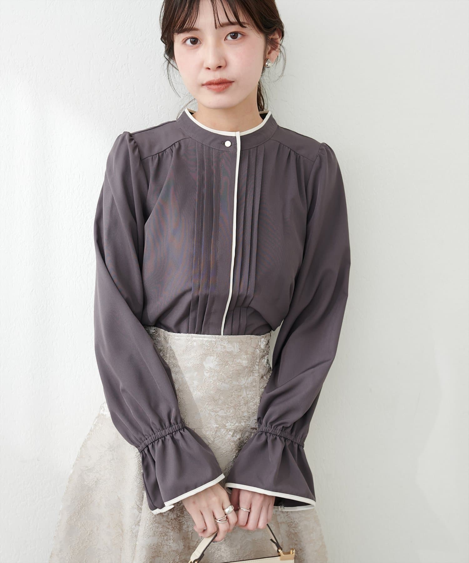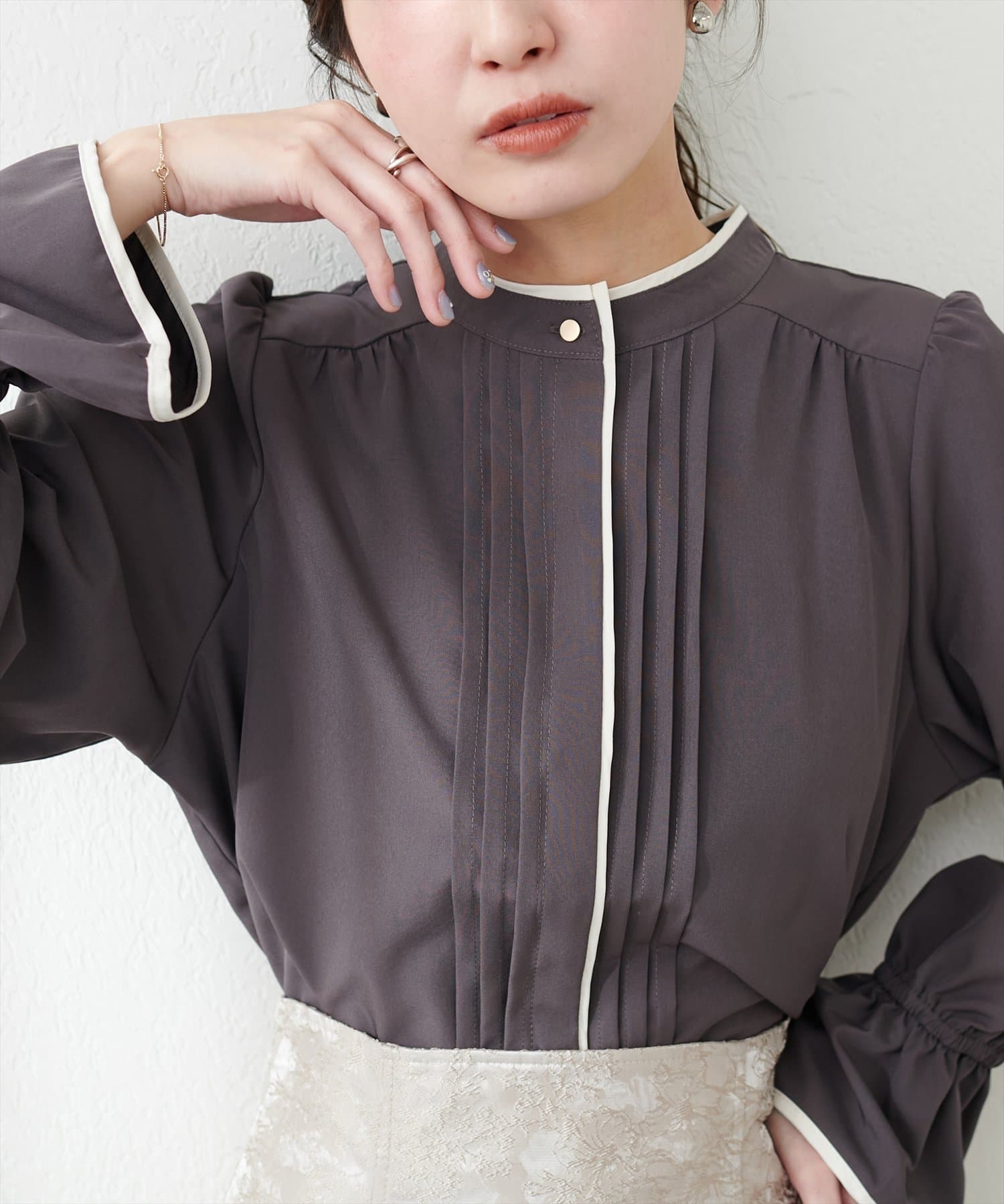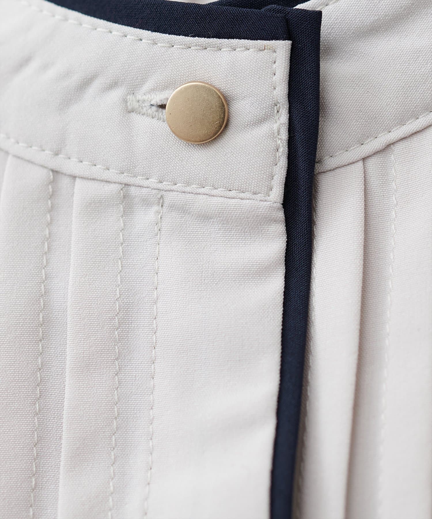 衿元、袖口、前立てに配色のパイピングを施しアクセントをプラス。