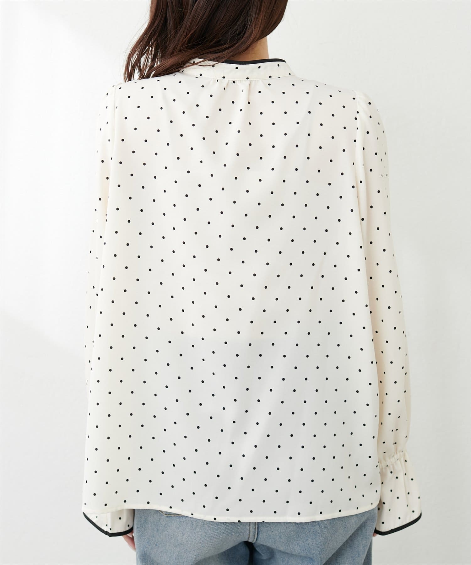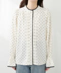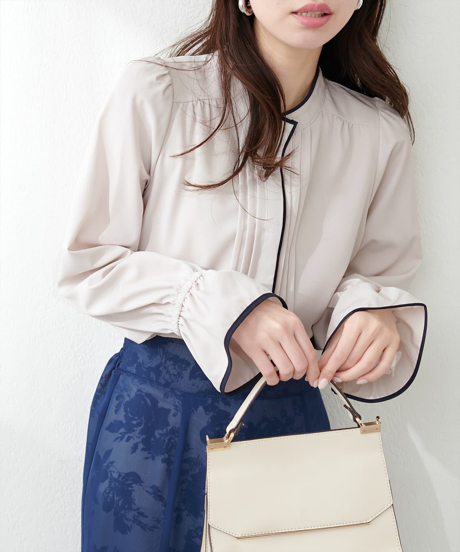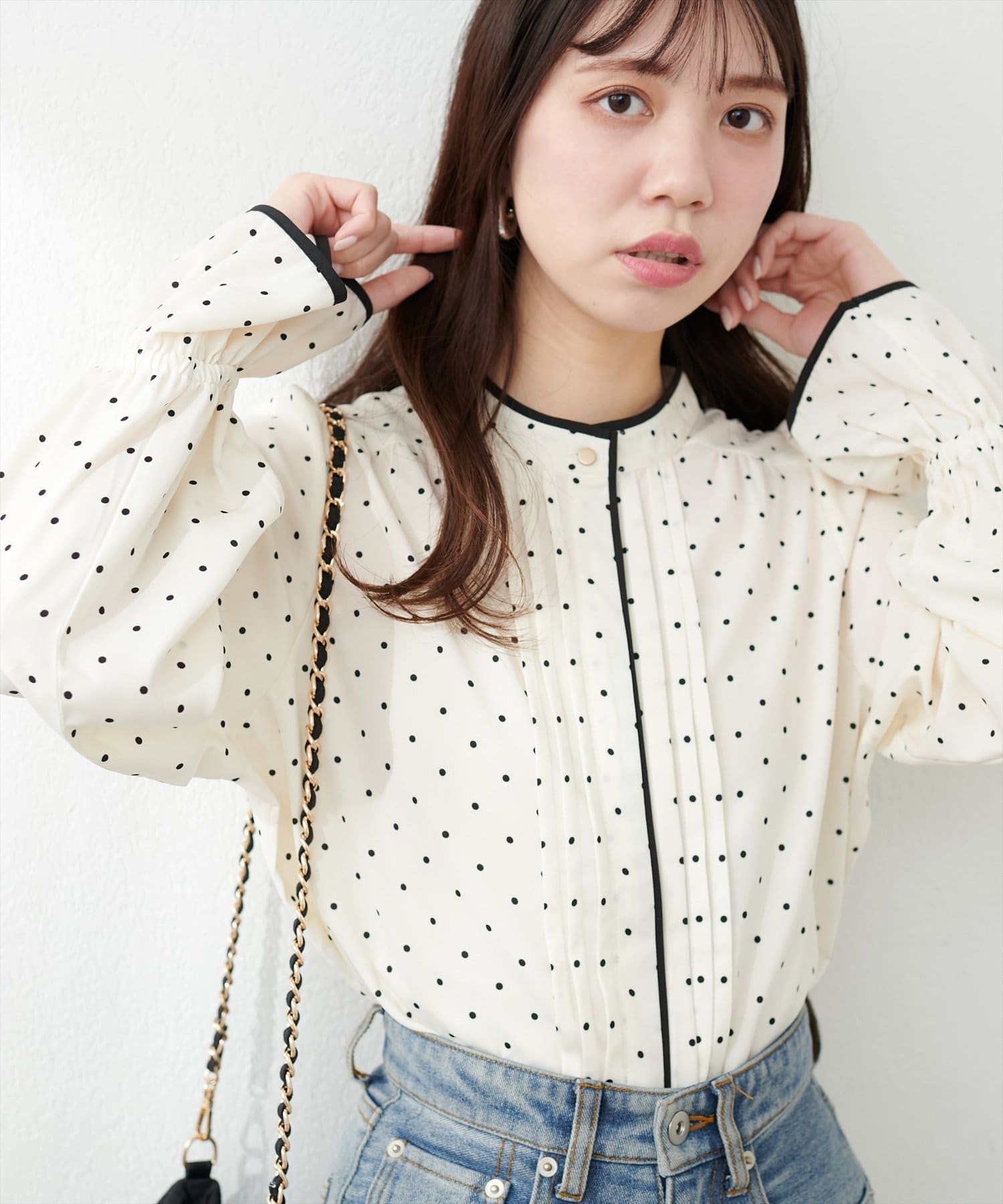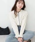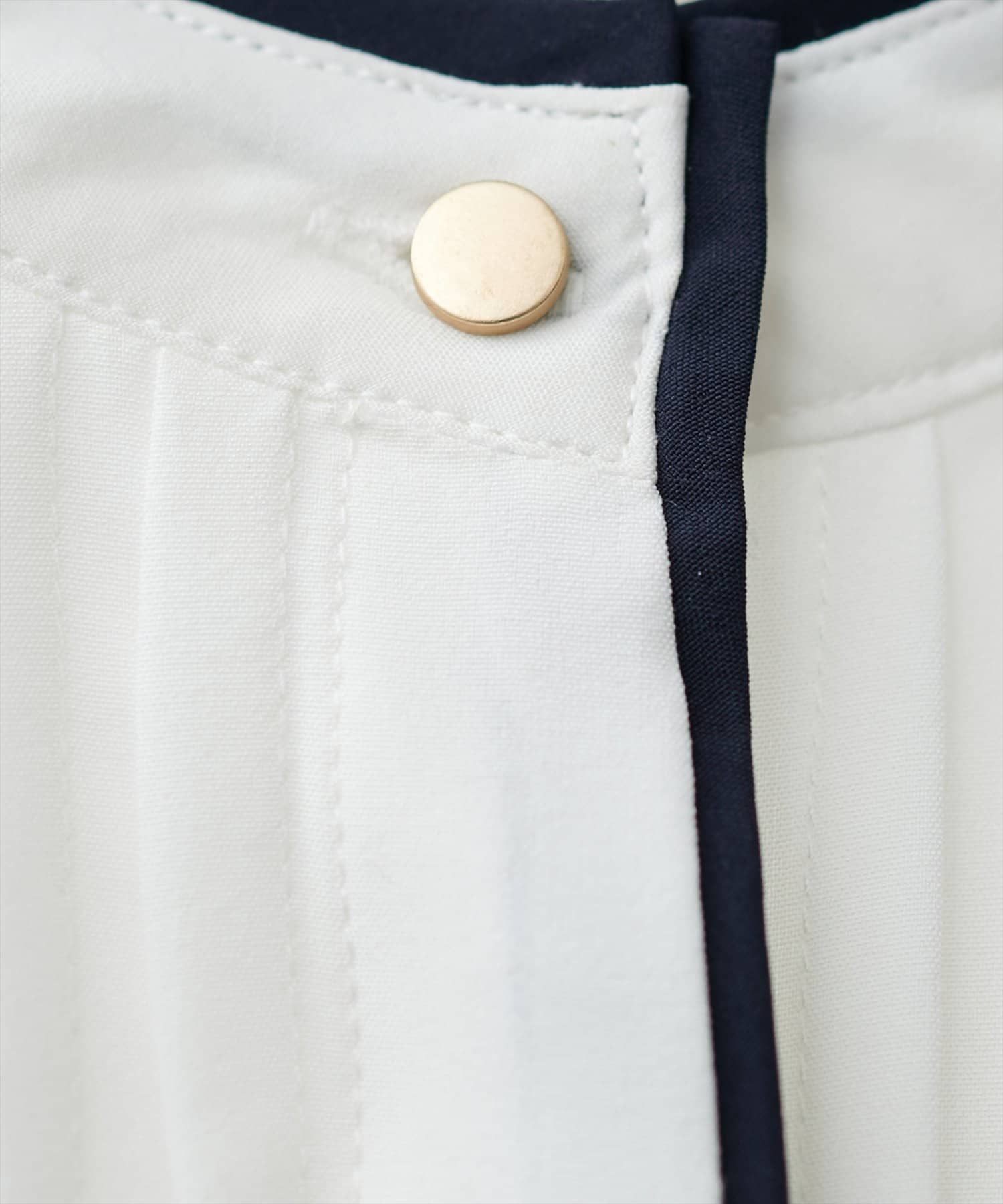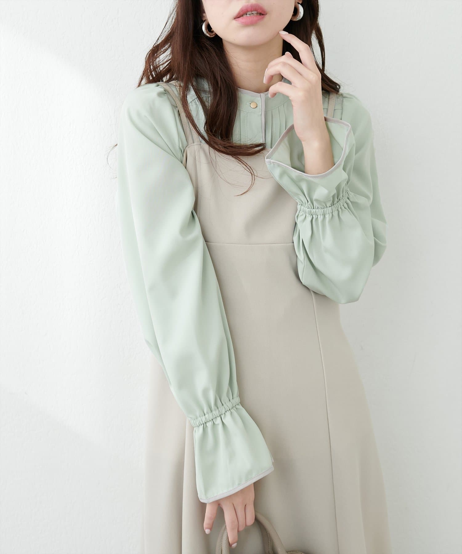 衿元、袖口、前立てに配色のパイピングを施しアクセントをプラス。