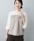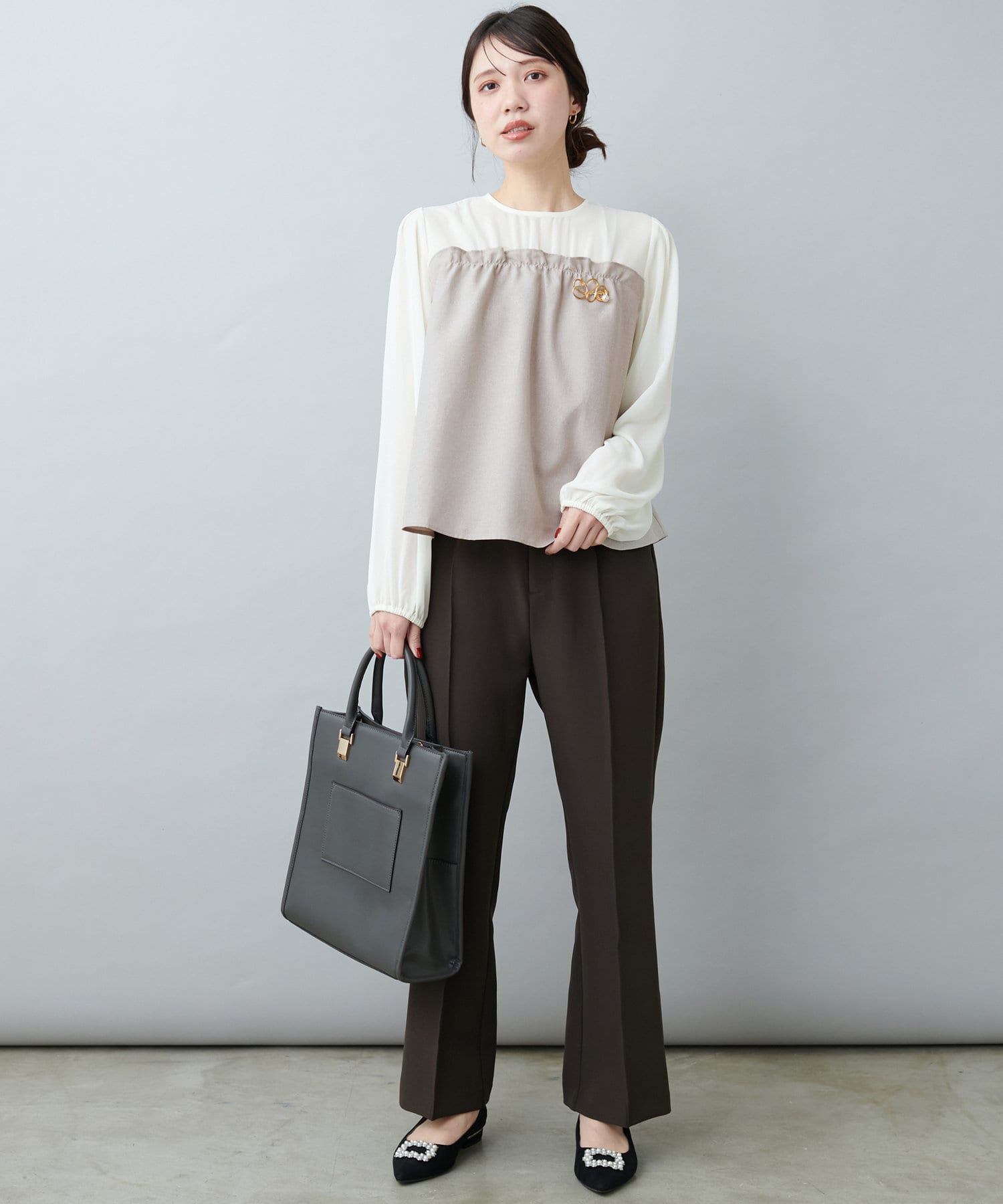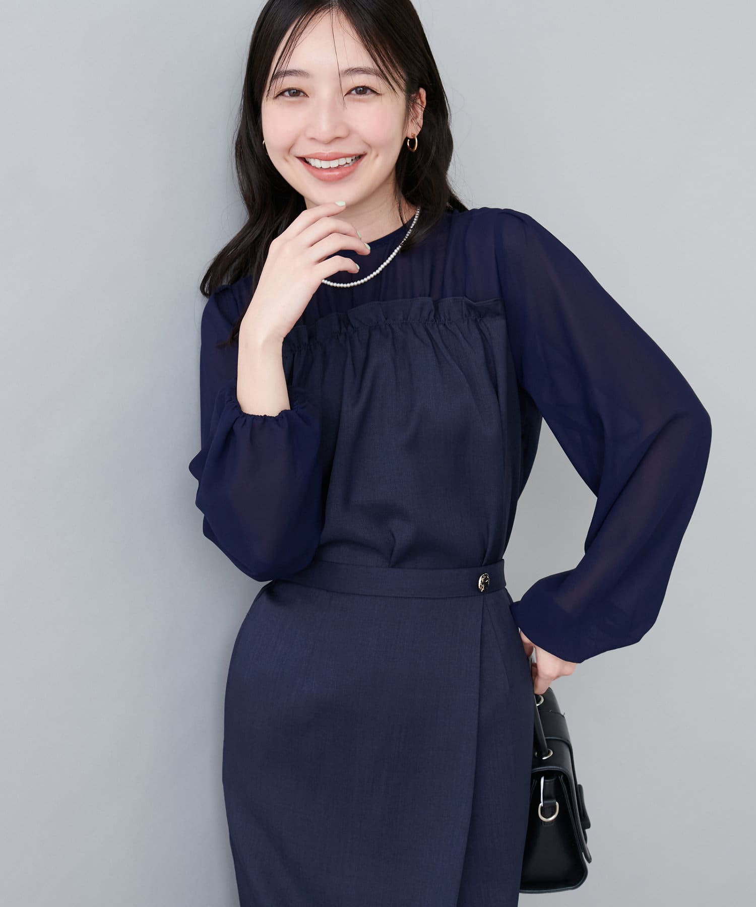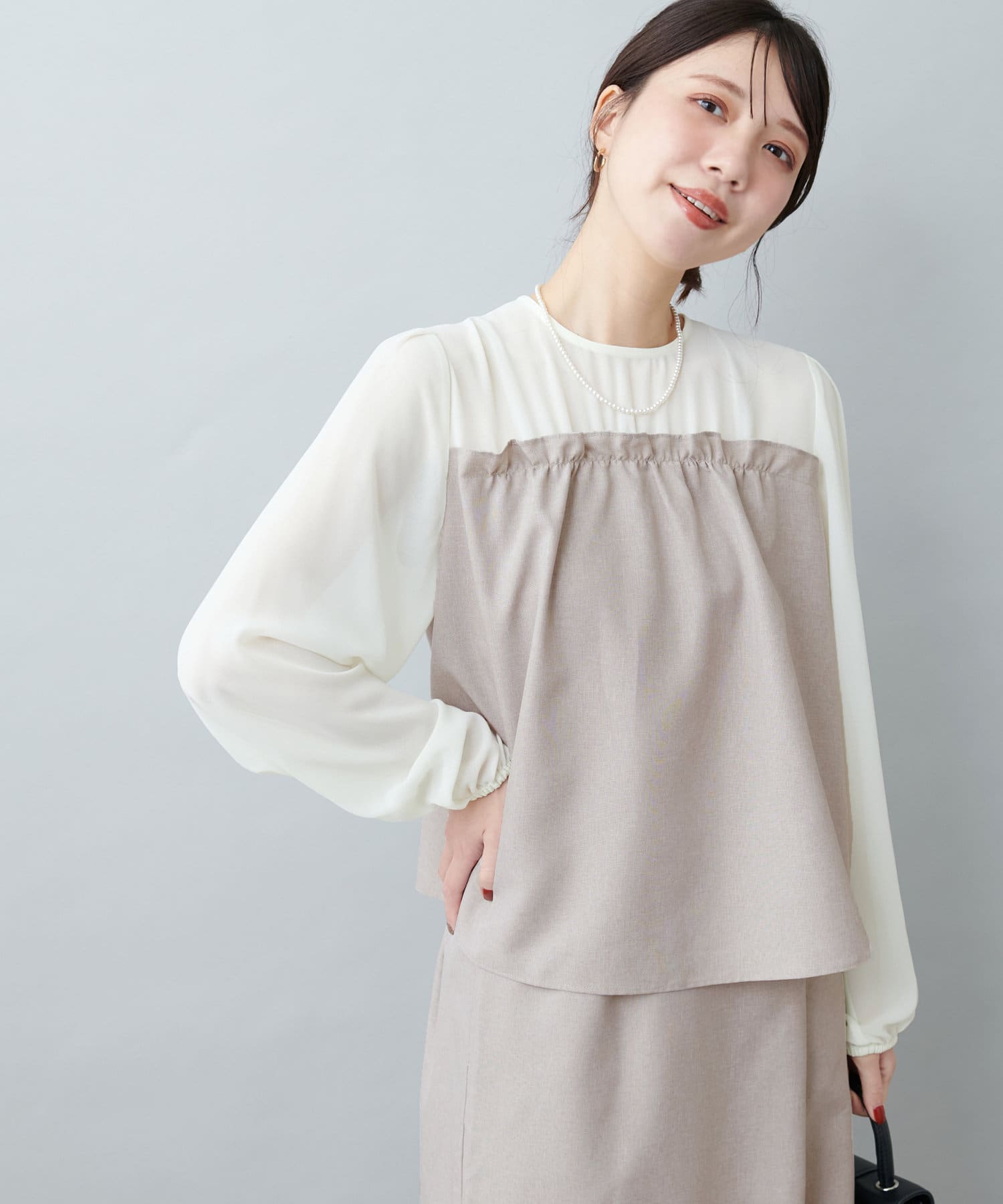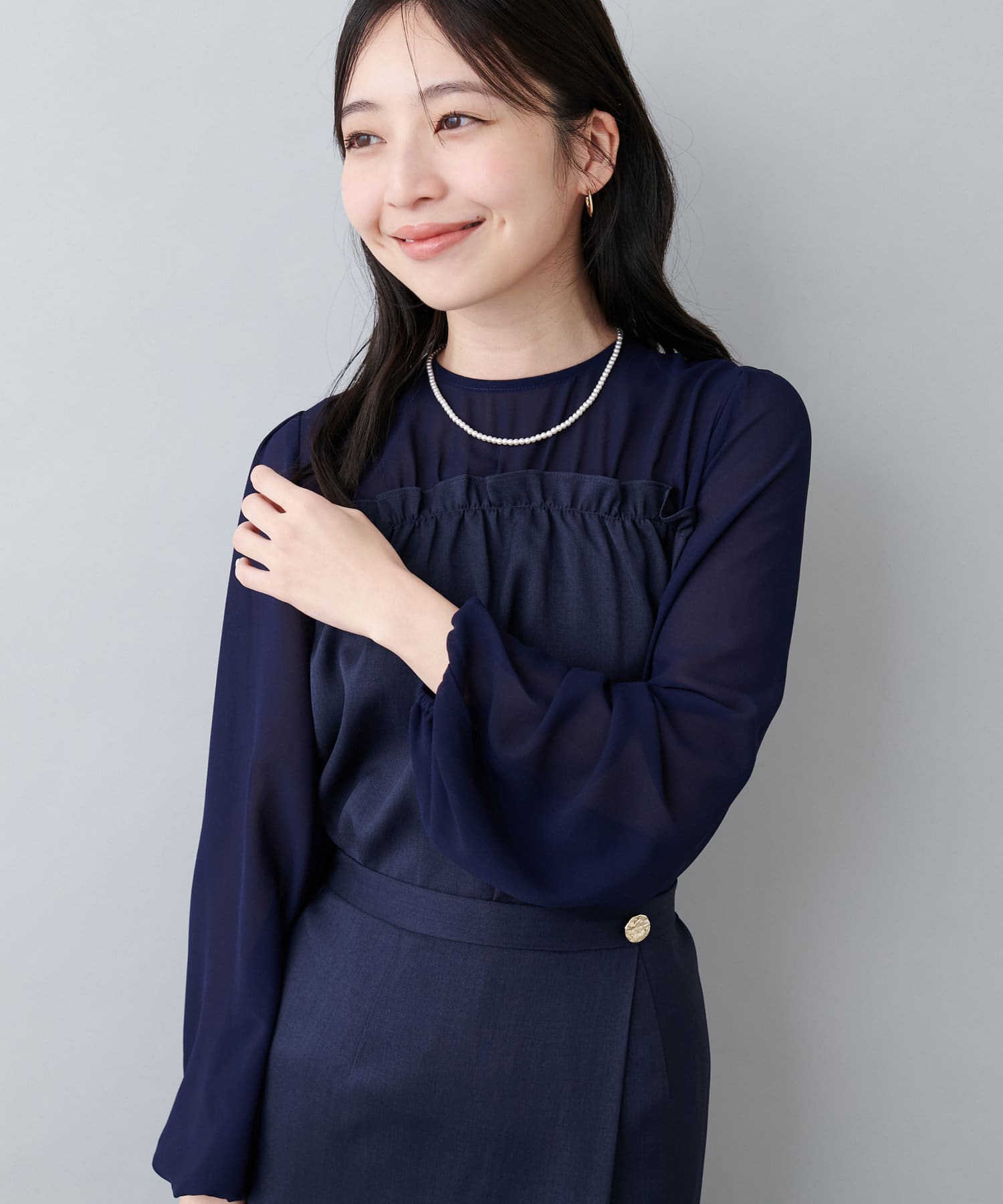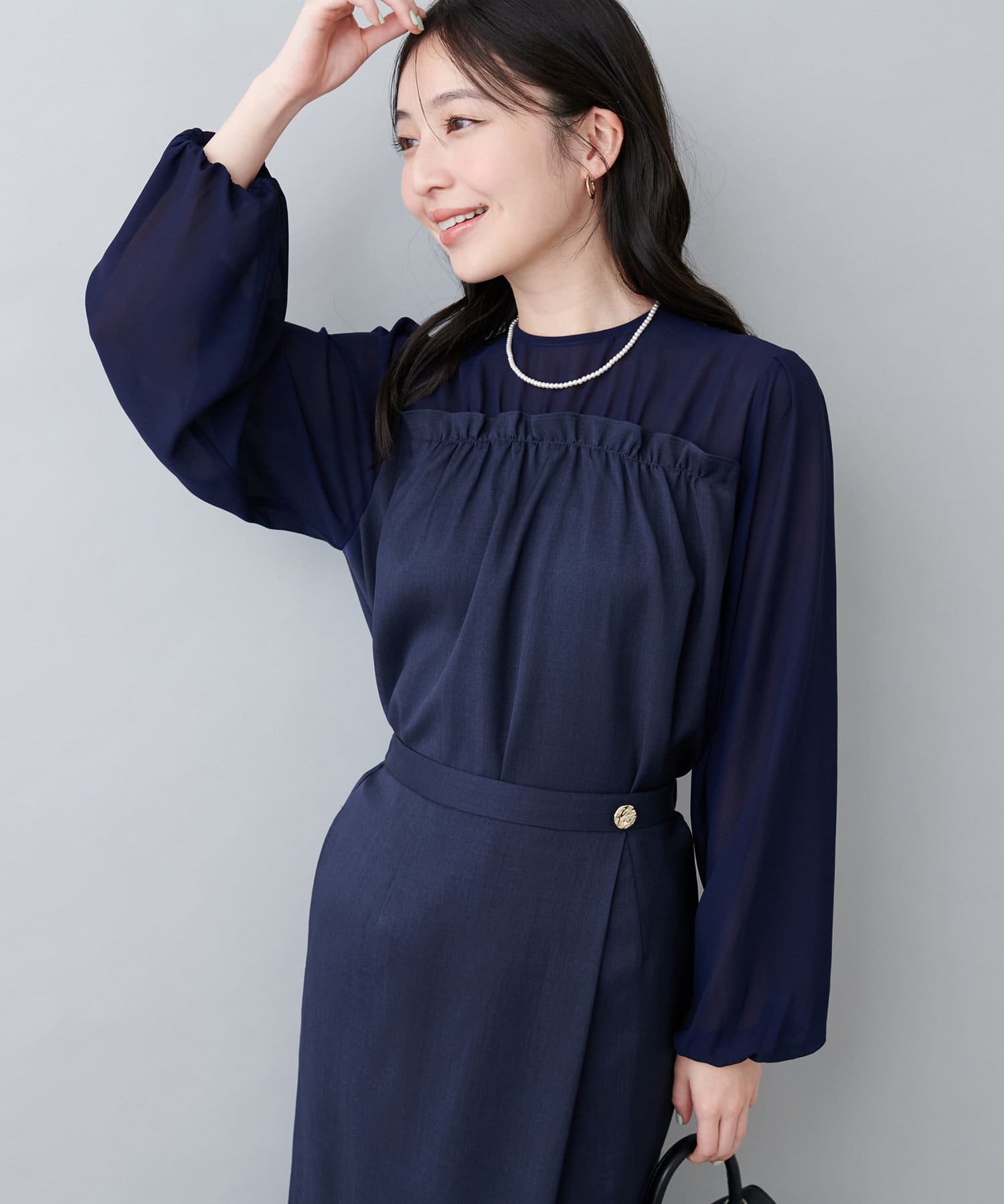 首元から袖にかけたシアー素材と、身頃部分のきれいめ素材の異なる素材感がより女性らしい印象を引き立てます。