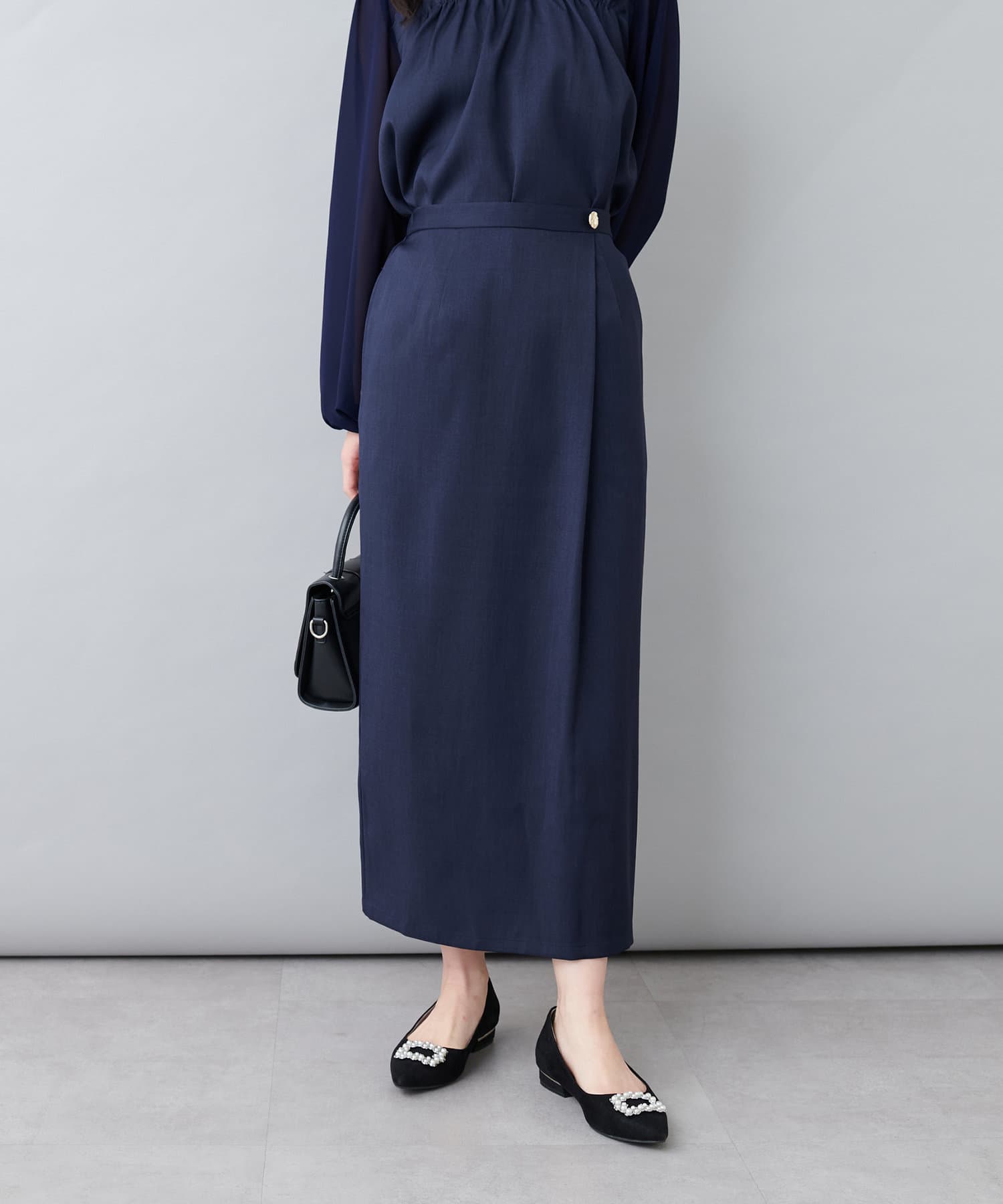 胸元のディテールが女性らしさ引き立つブラウスと、美シルエットラインが魅力なスカートがセットになったアイテム。