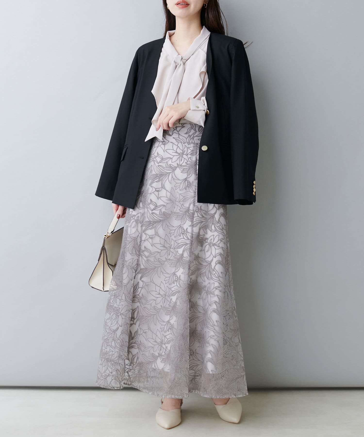 マーメイドシルエットやフレアラインのスカートにウエストインして頂くと、