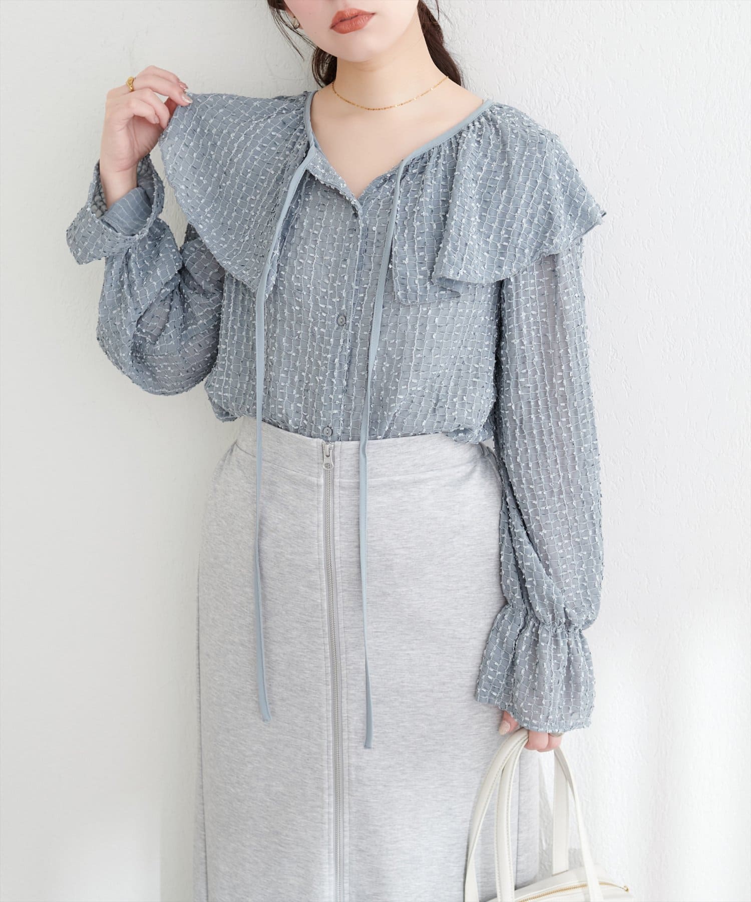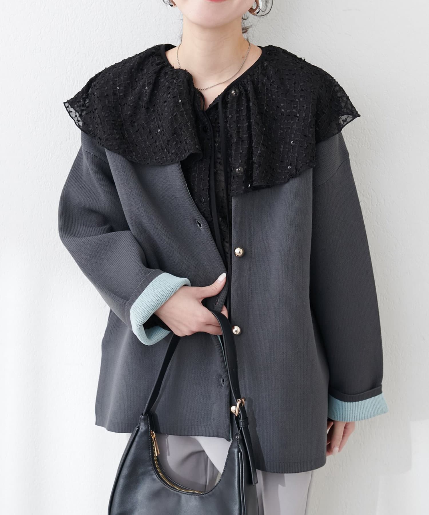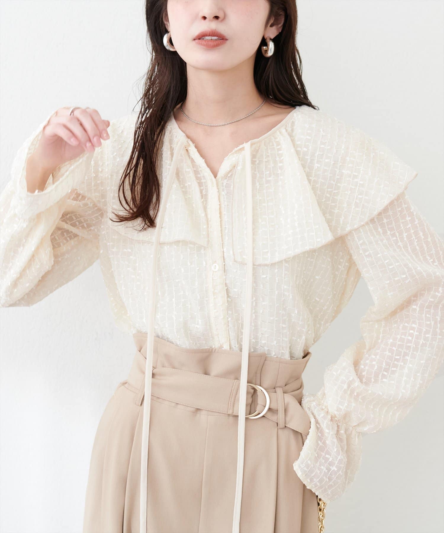 お顔周りが一気に華やかになり、着こなしの可能性が広がる1着です。