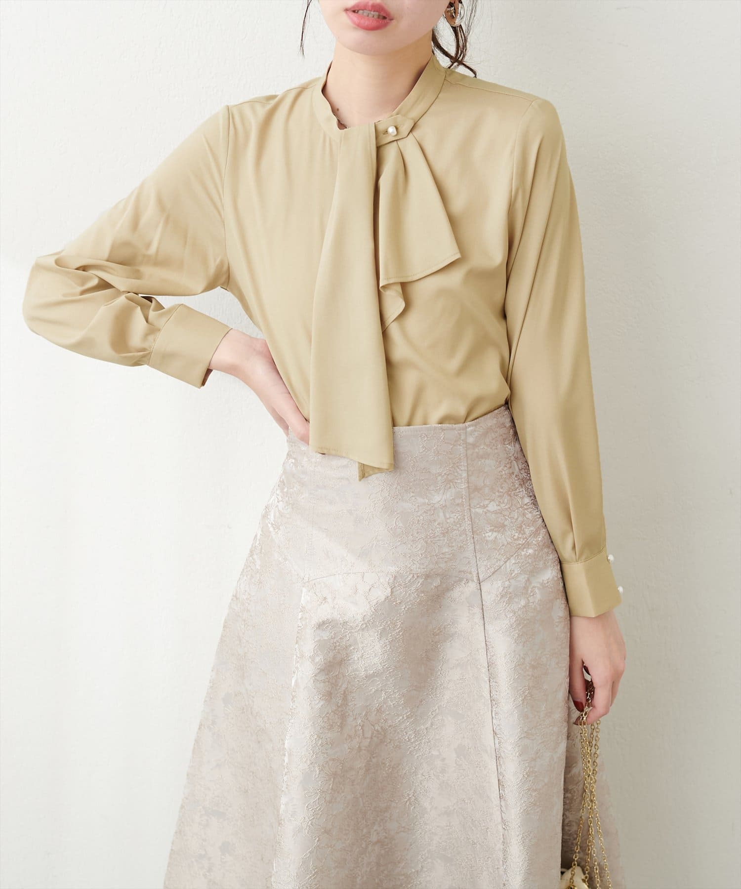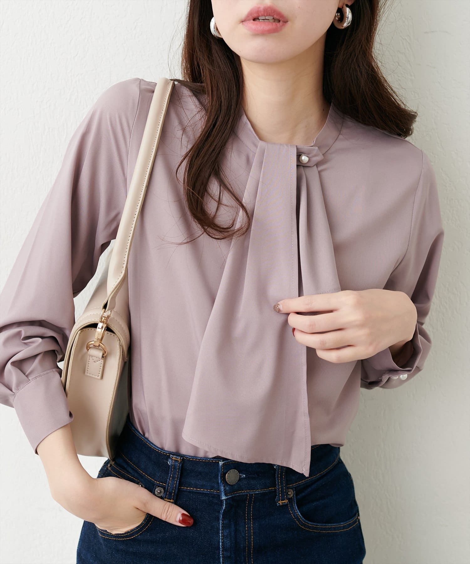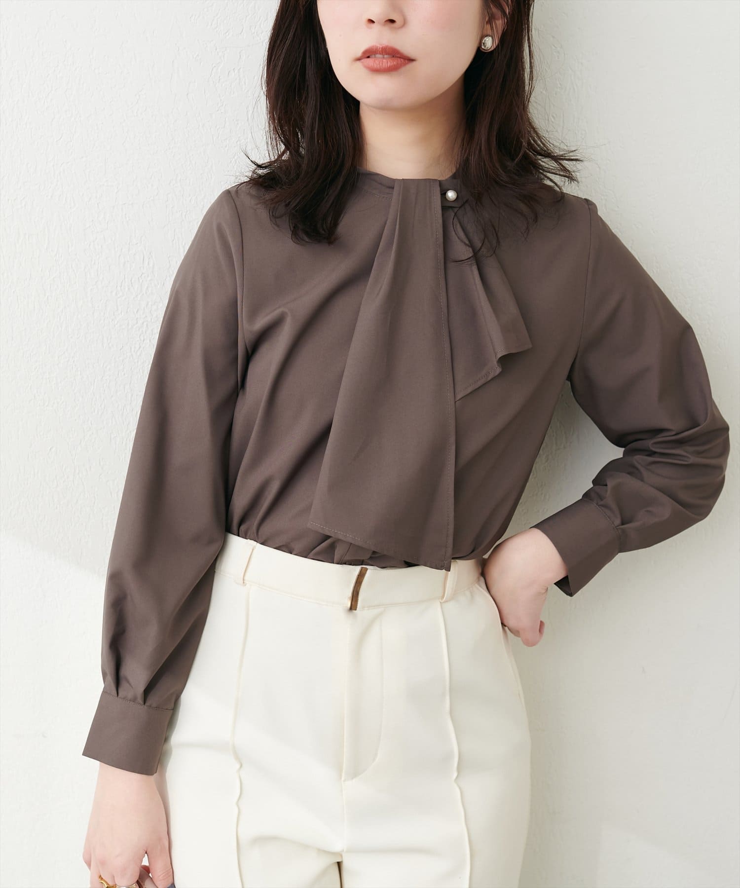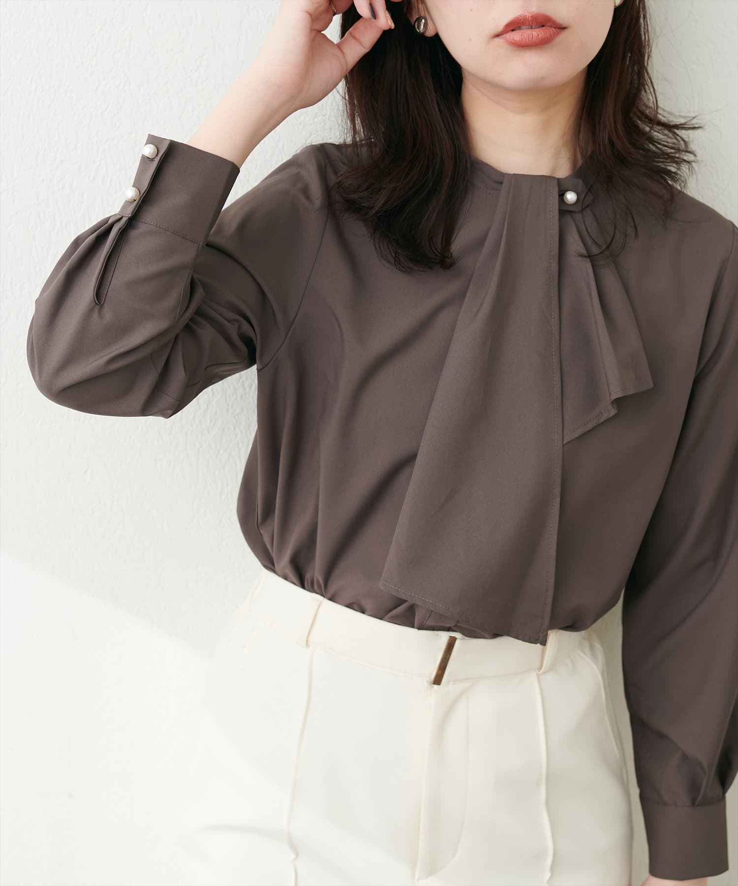 ドレープになったスカーフタイのデザインが特徴のお上品ブラウス。