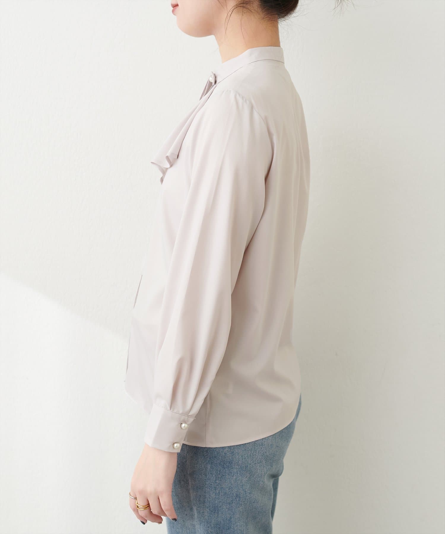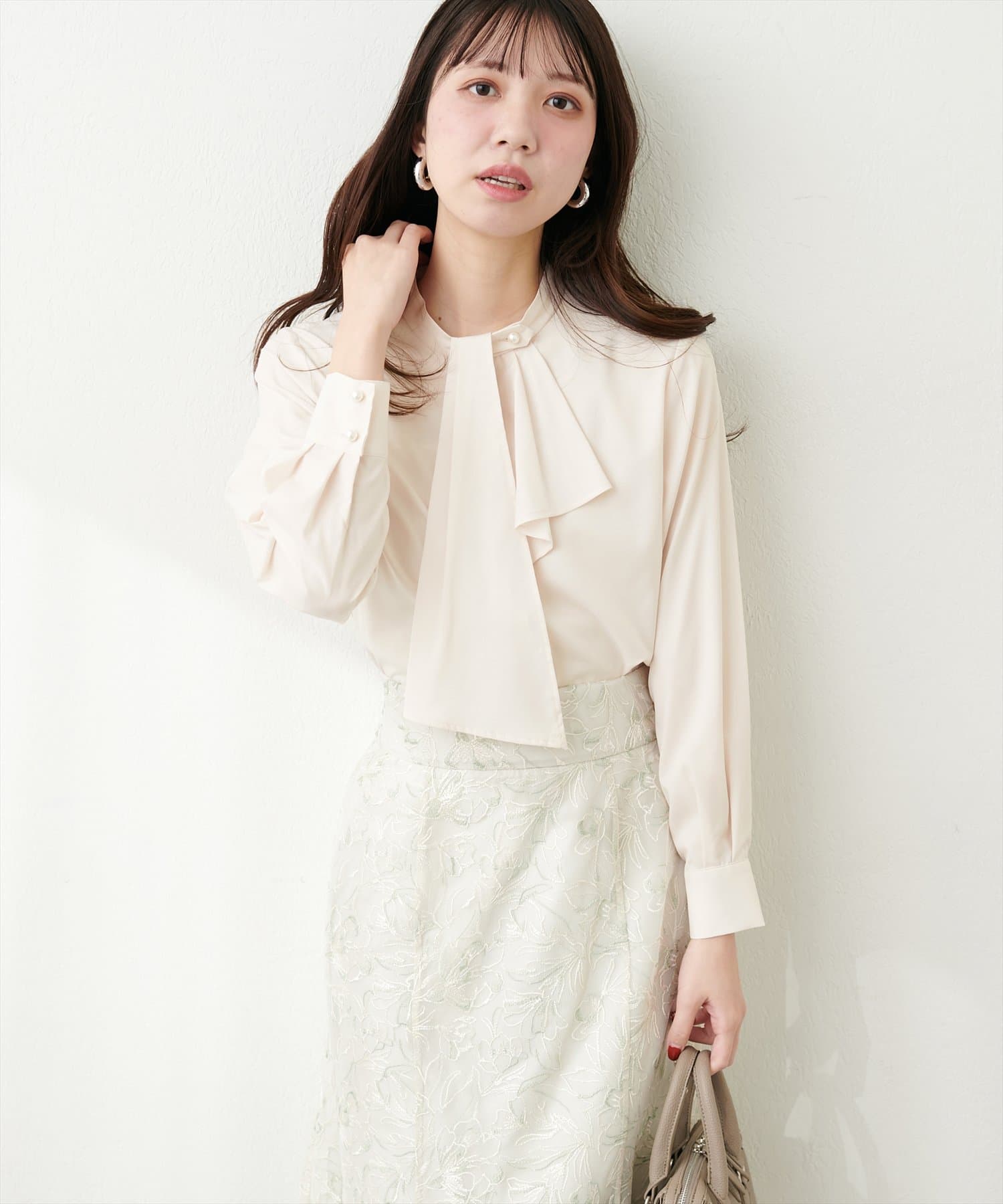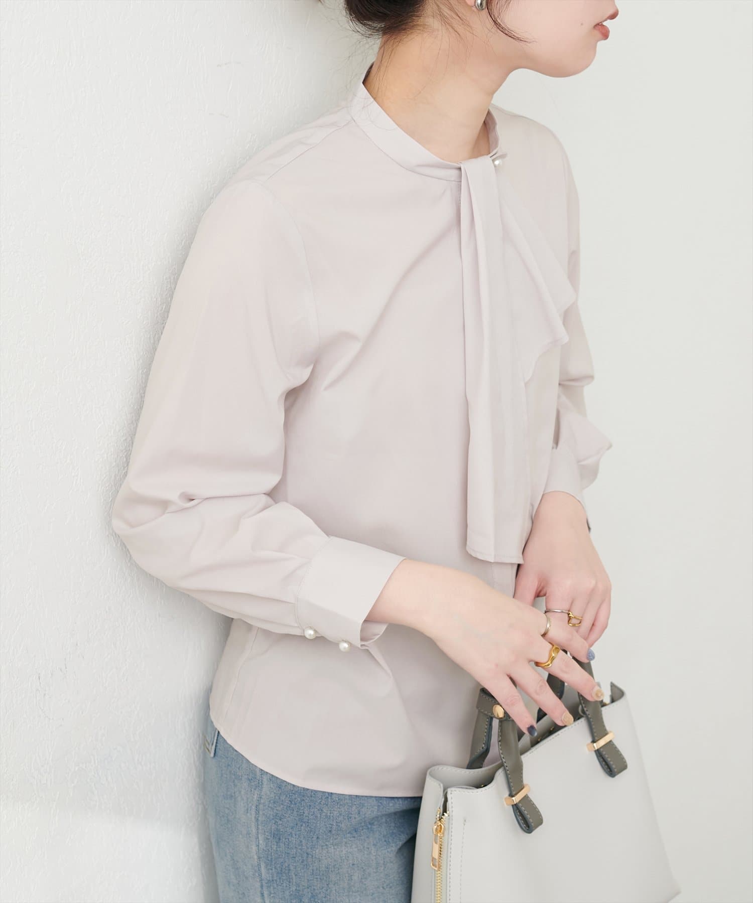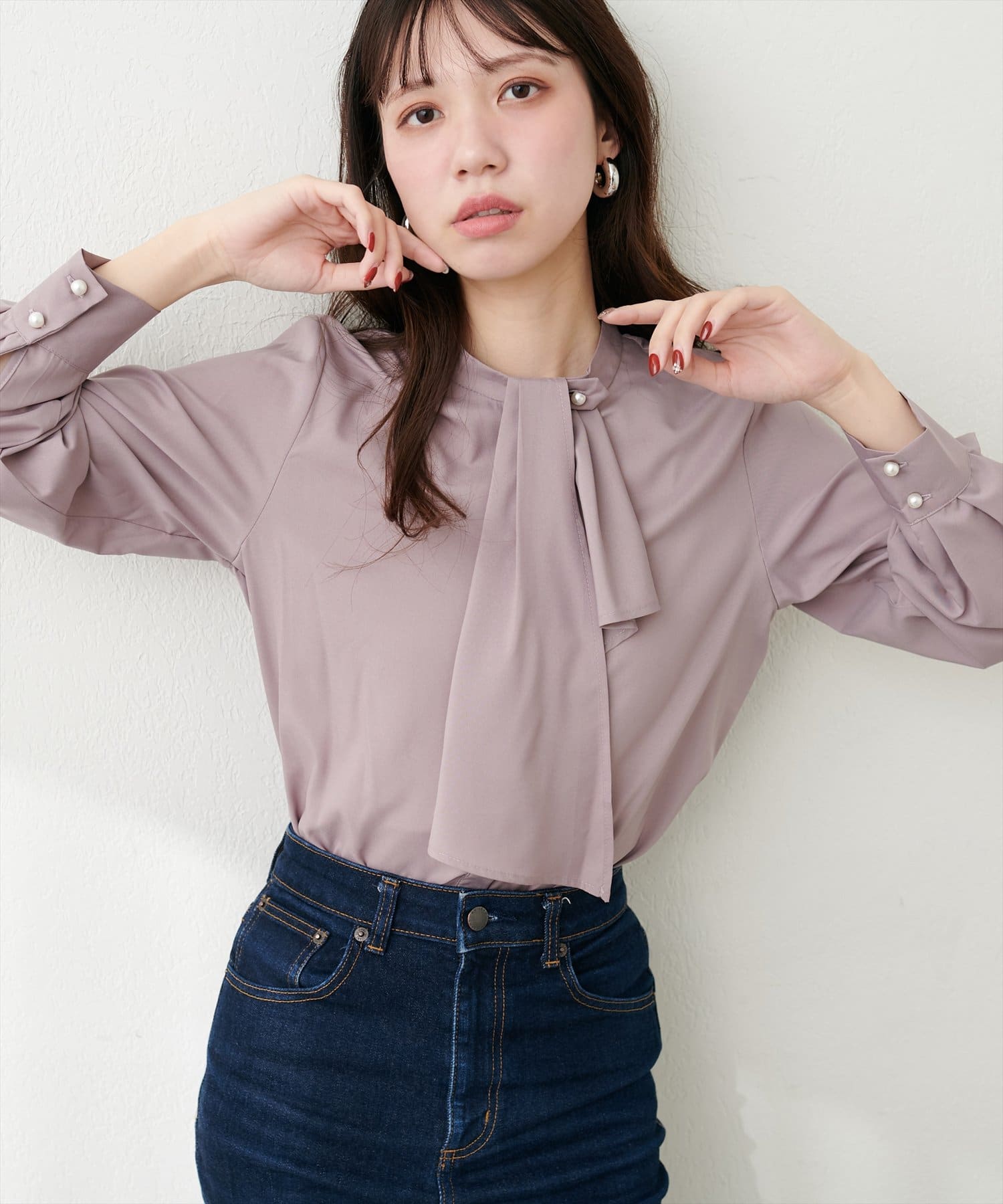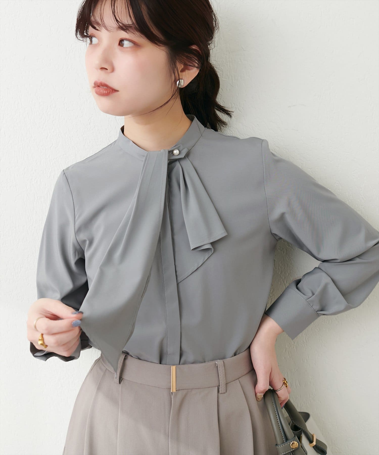 ドレープになったスカーフタイのデザインが特徴のお上品ブラウス。