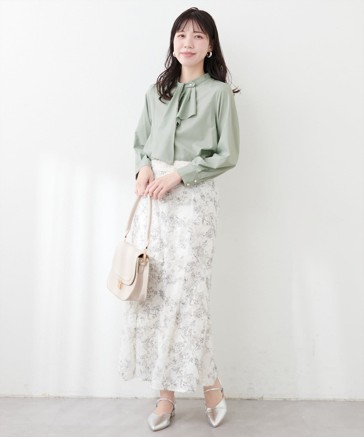 ブラウスがさらりとしている分、ボトムは厚みのあるアイテムを合わせて素材感にメリハリを付けるのがおすすめです。