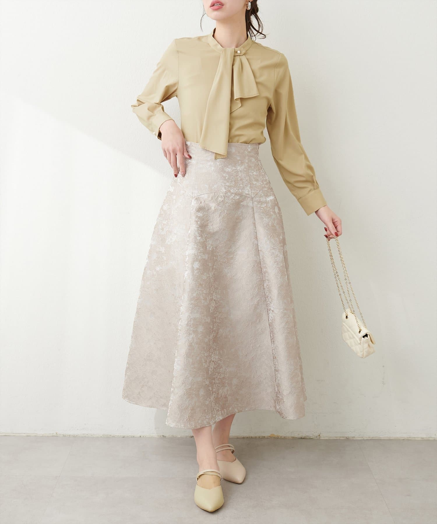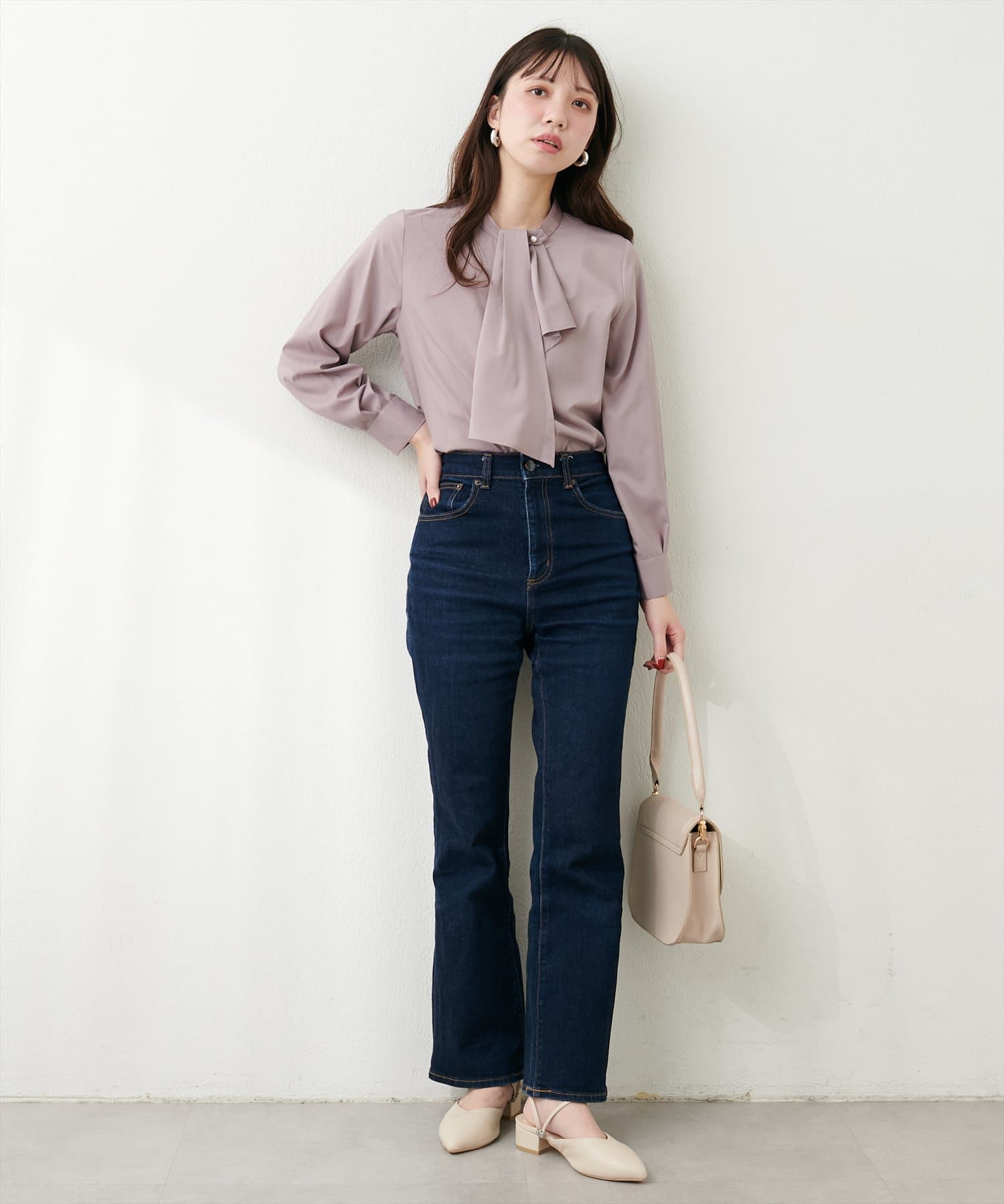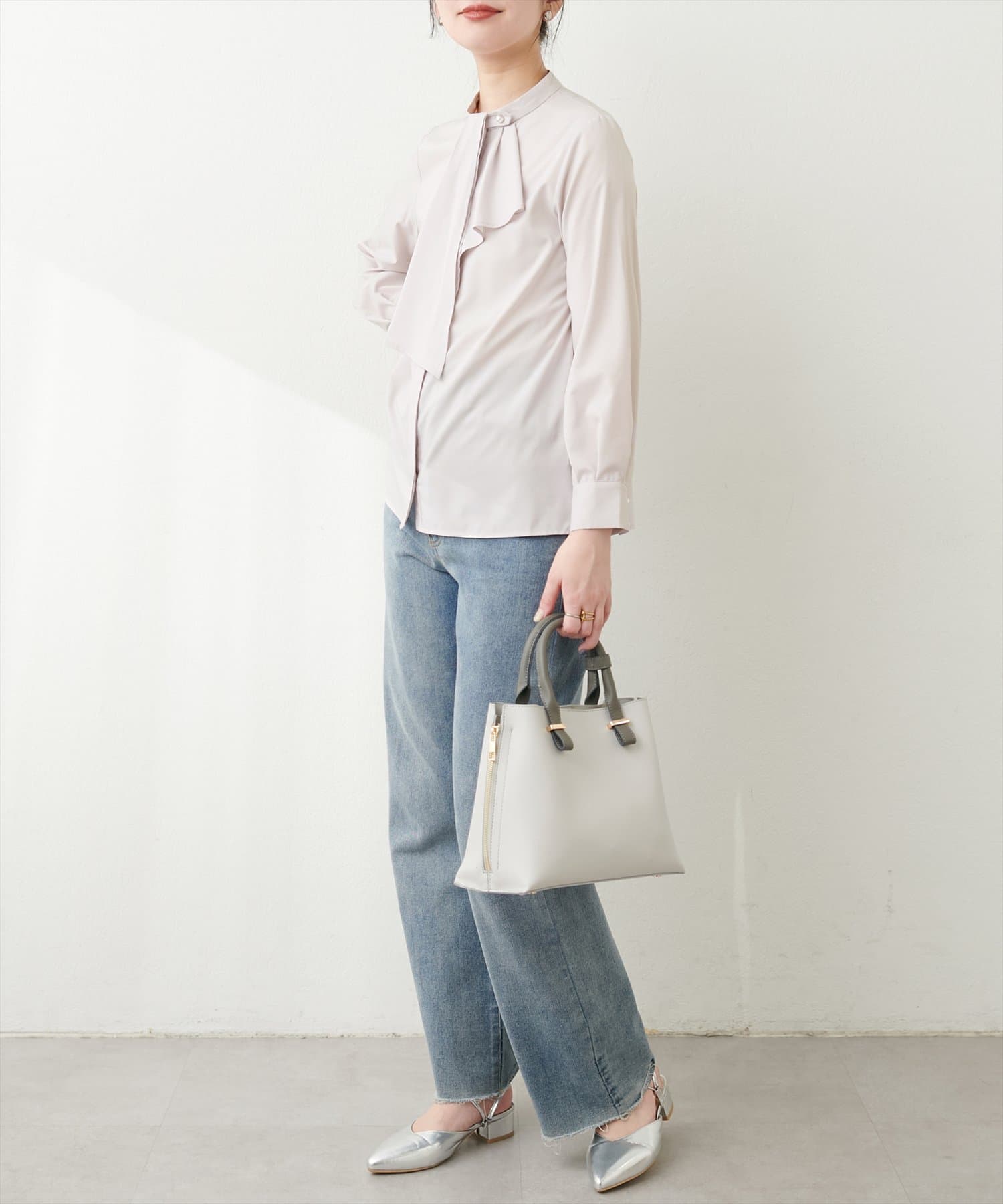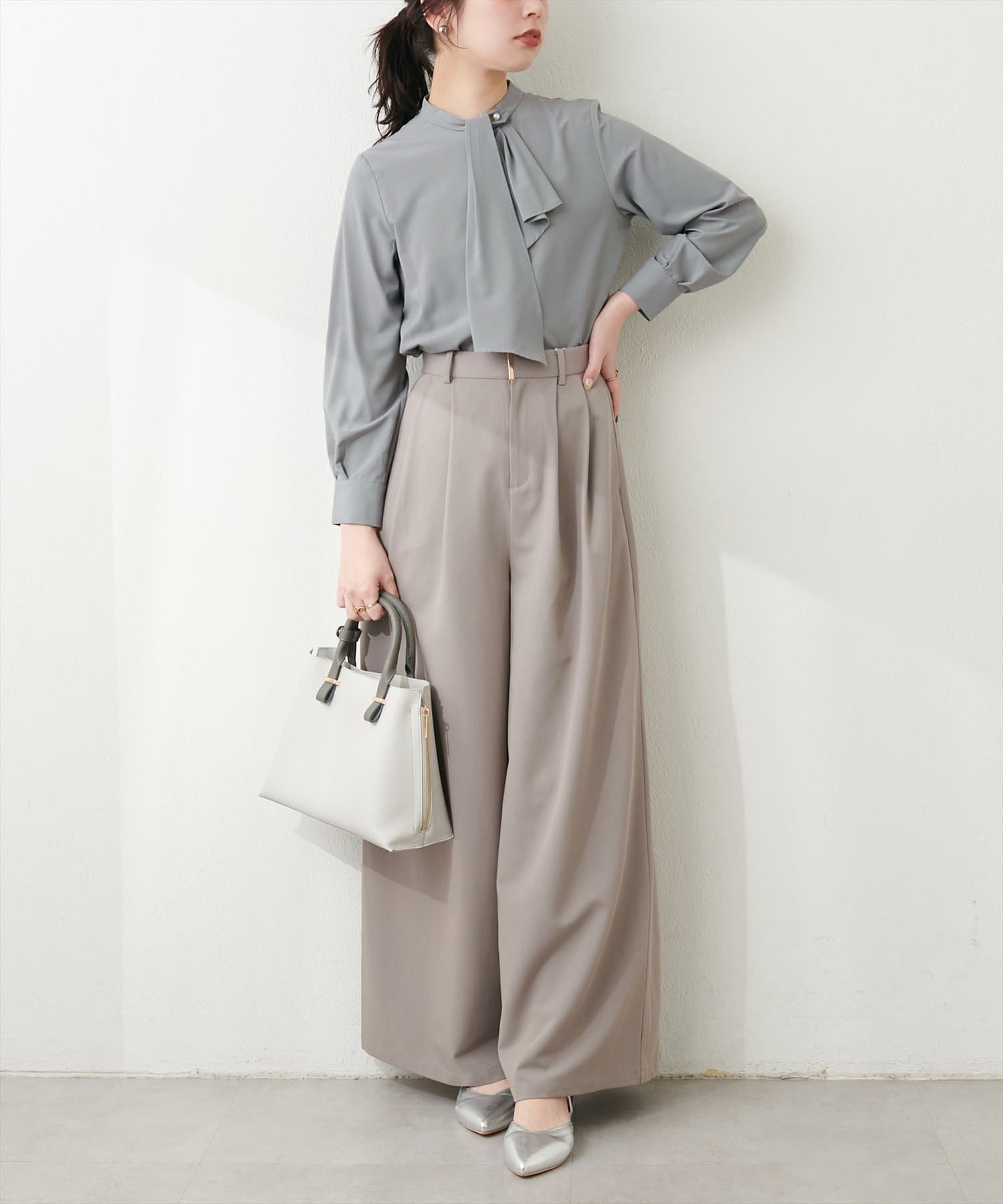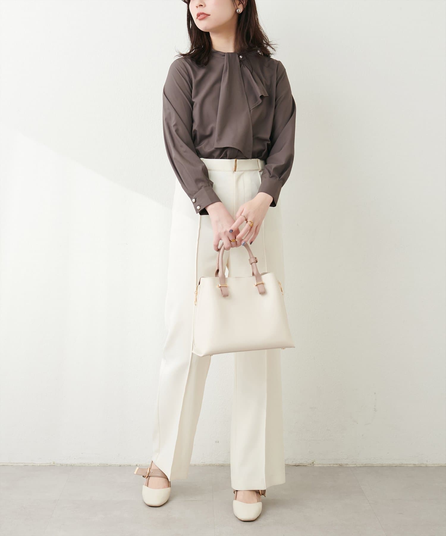 ブラウスがさらりとしている分、ボトムは厚みのあるアイテムを合わせて素材感にメリハリを付けるのがおすすめです。