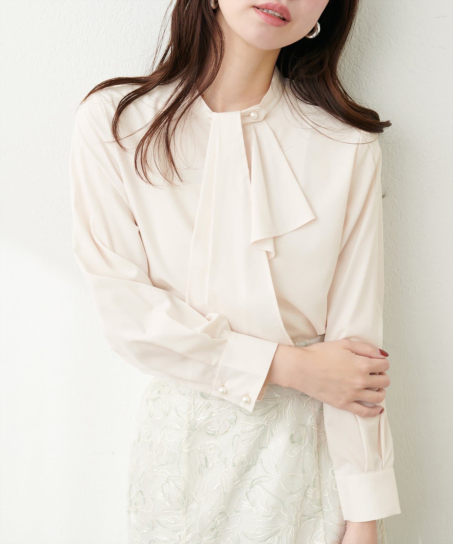 ドレープになったスカーフタイのデザインが特徴のお上品ブラウス。