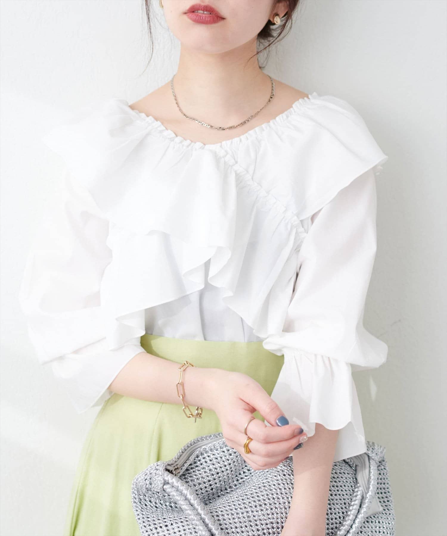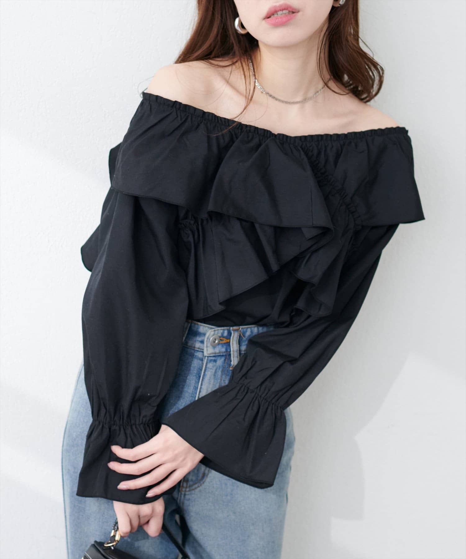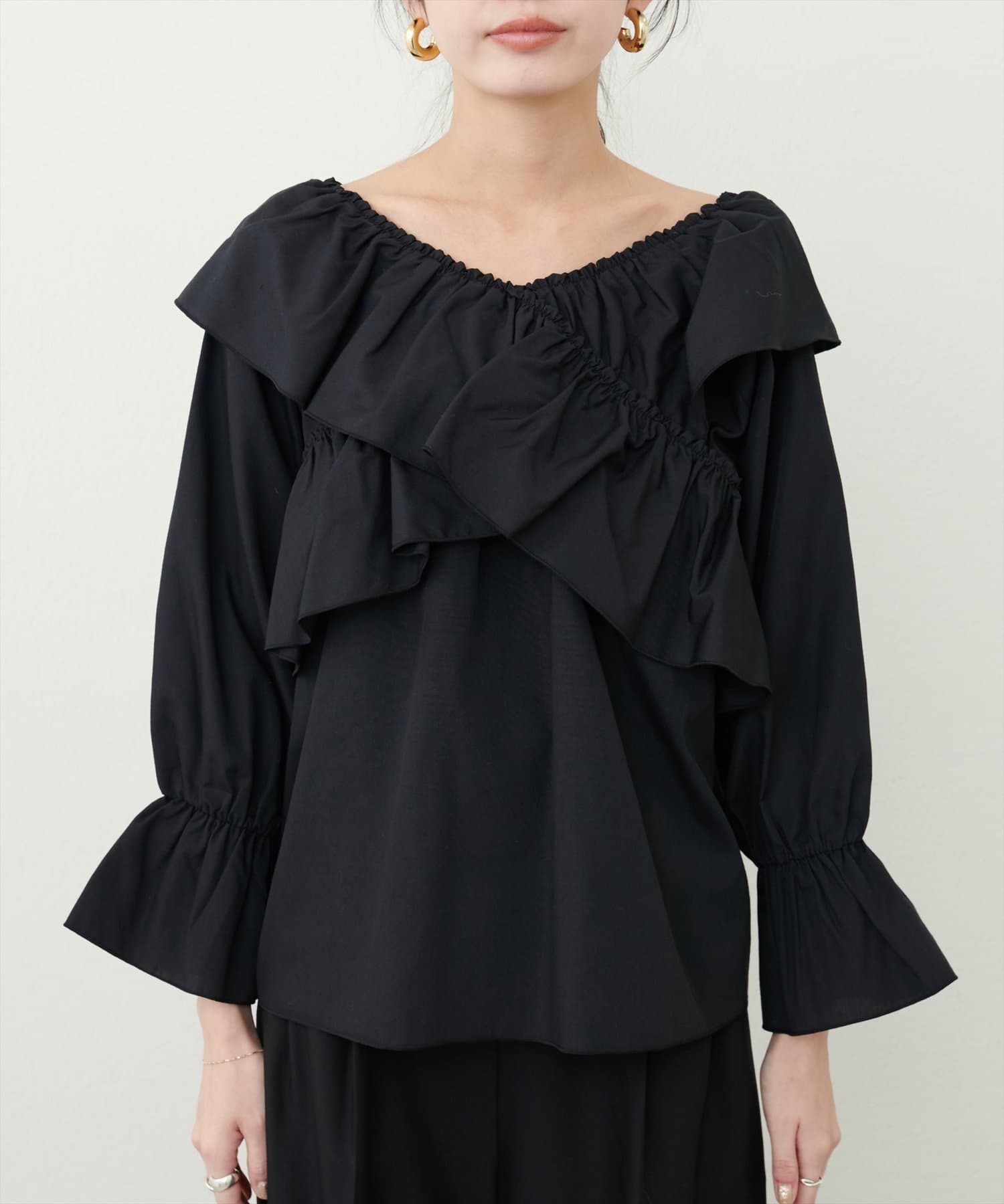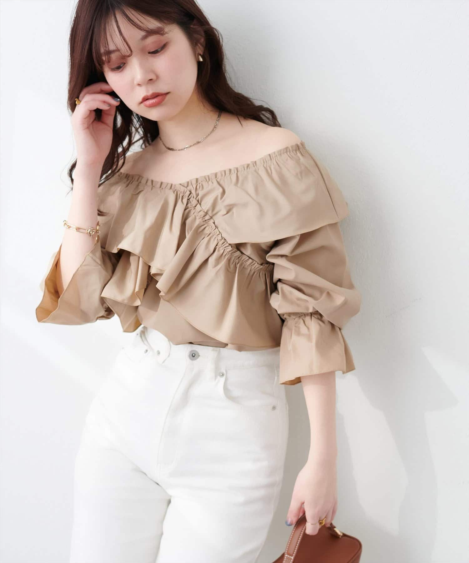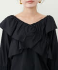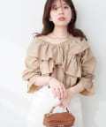 大胆なフリルデザインがコーディネートの主役になるブラウス
