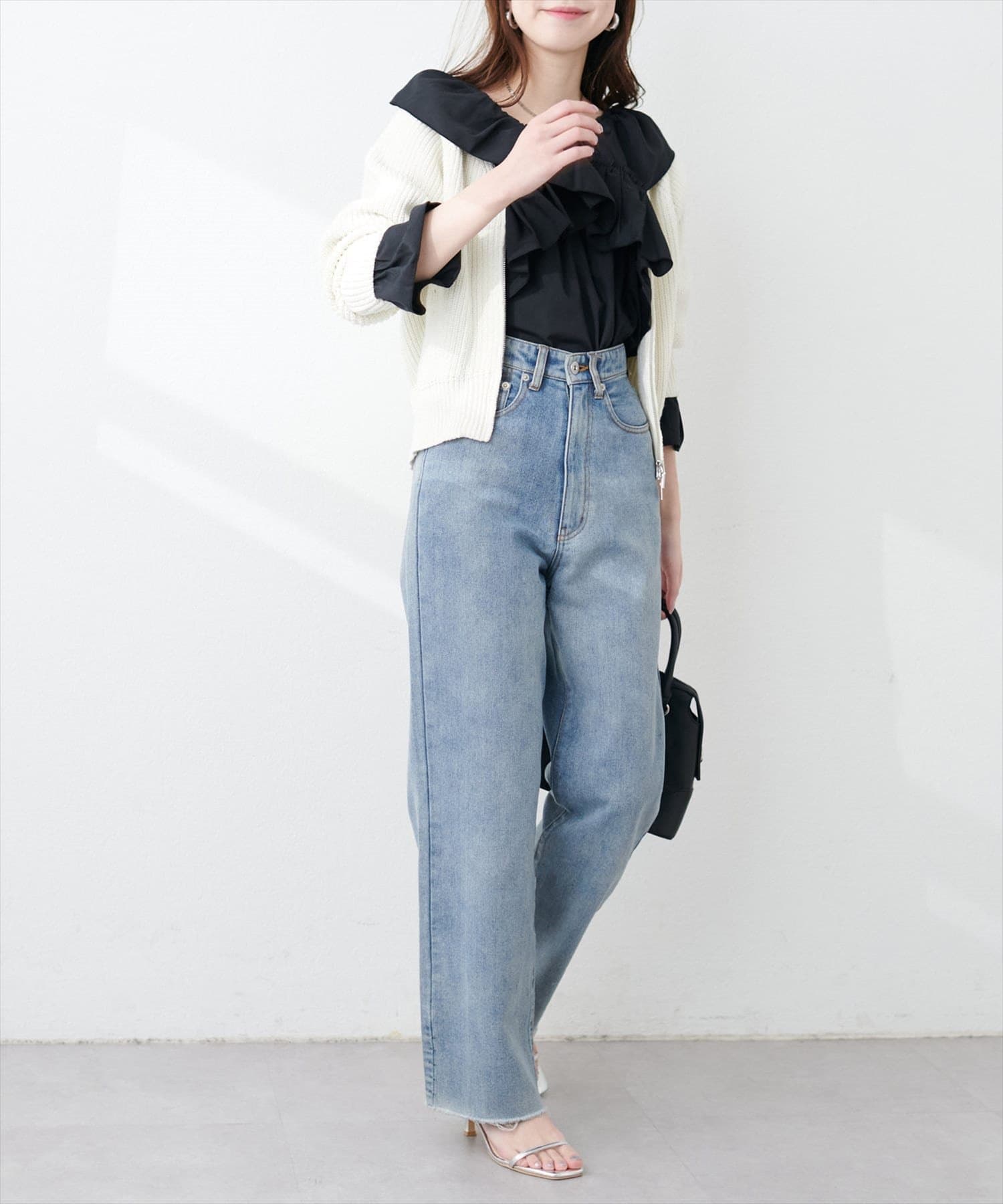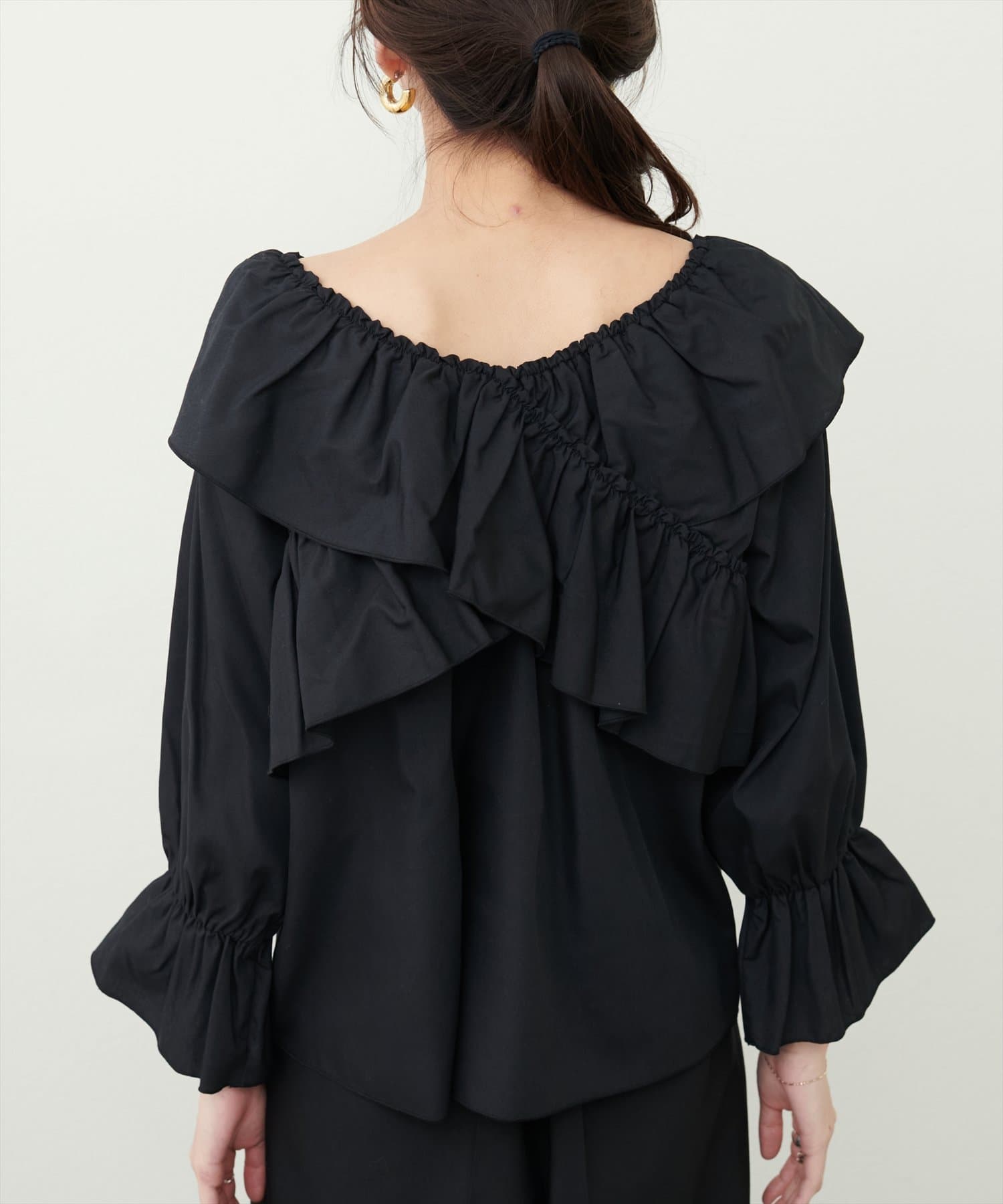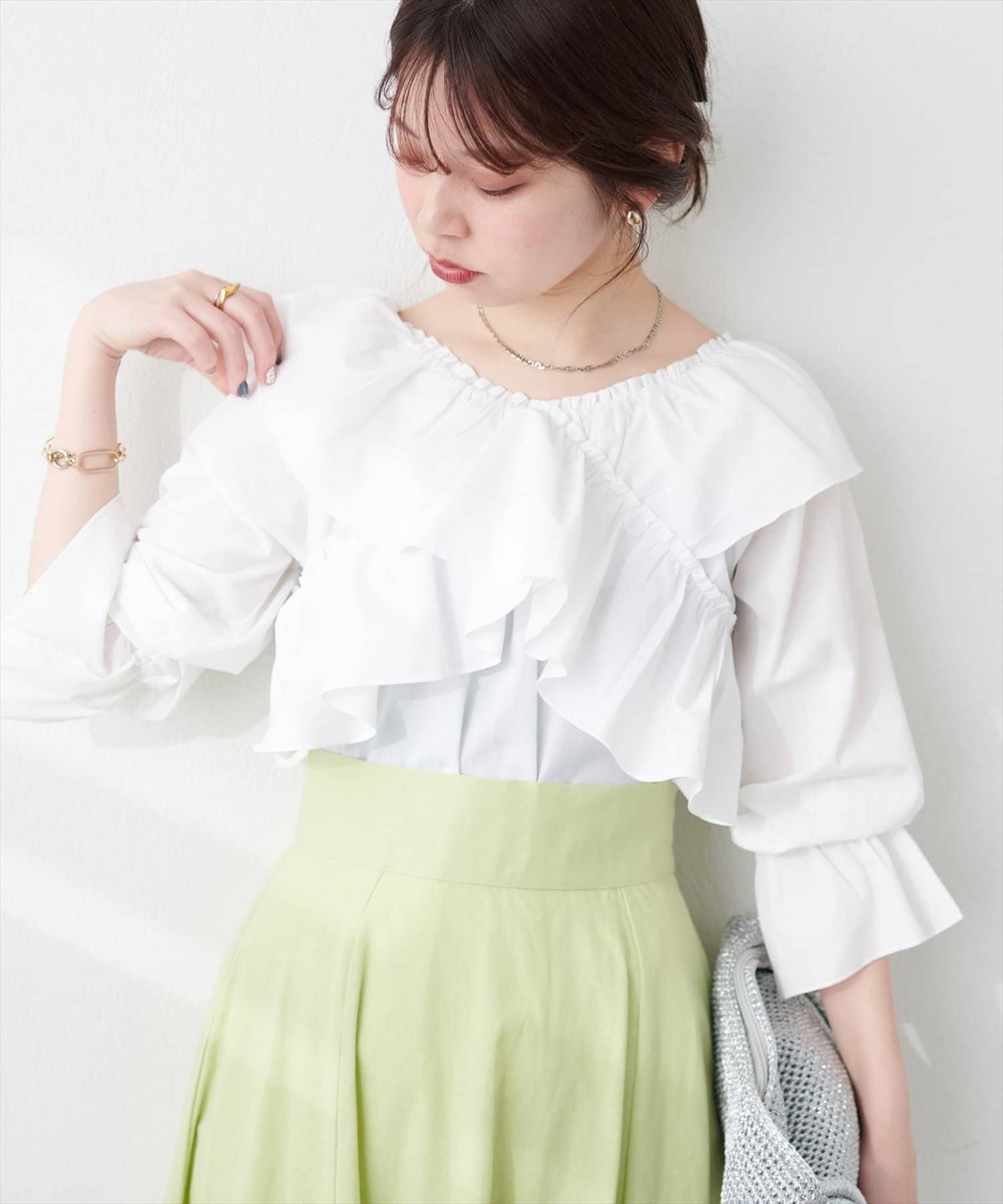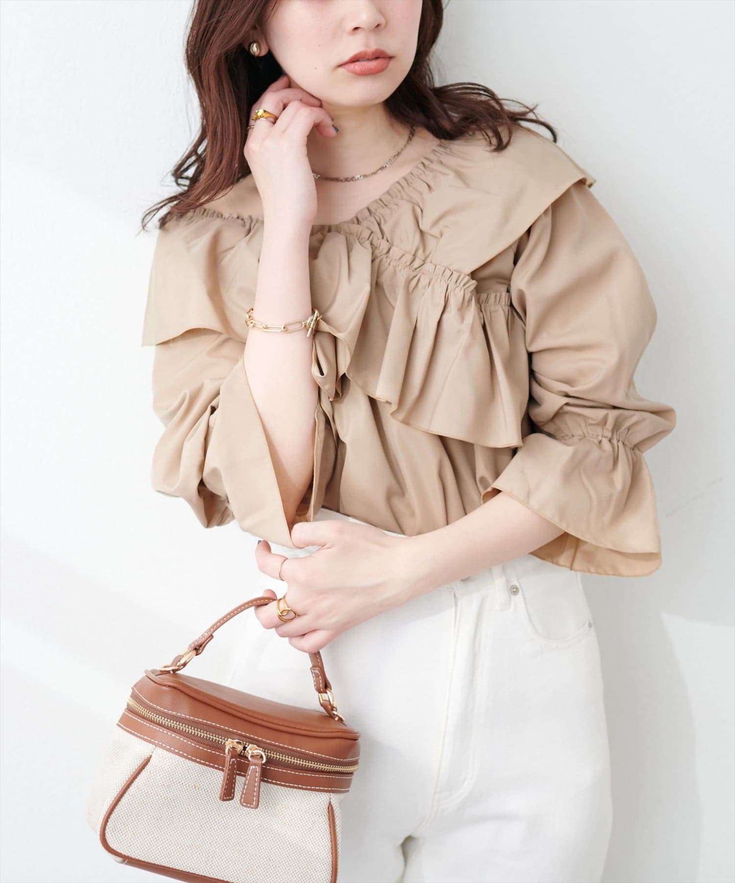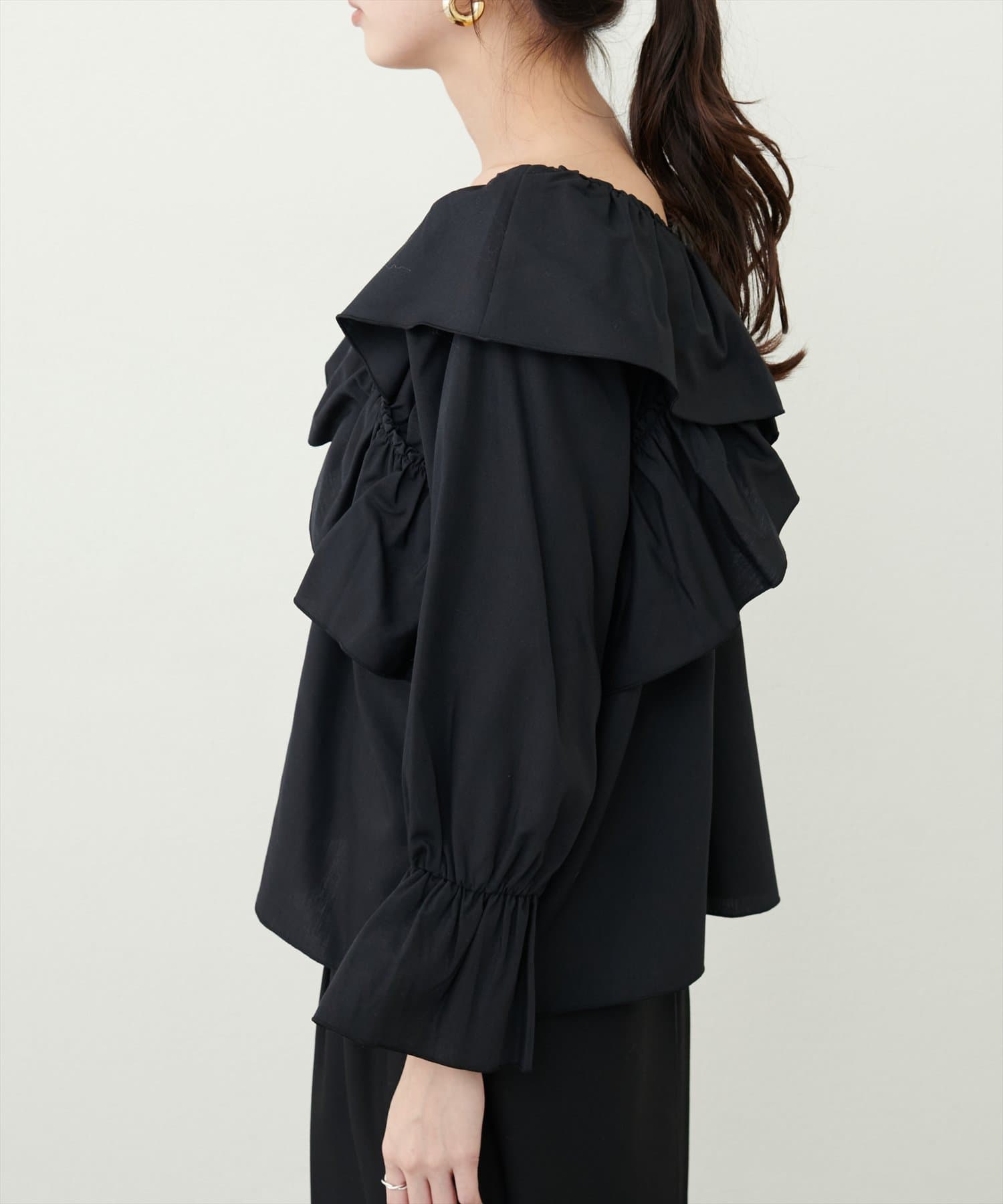 大胆なフリルデザインがコーディネートの主役になるブラウス