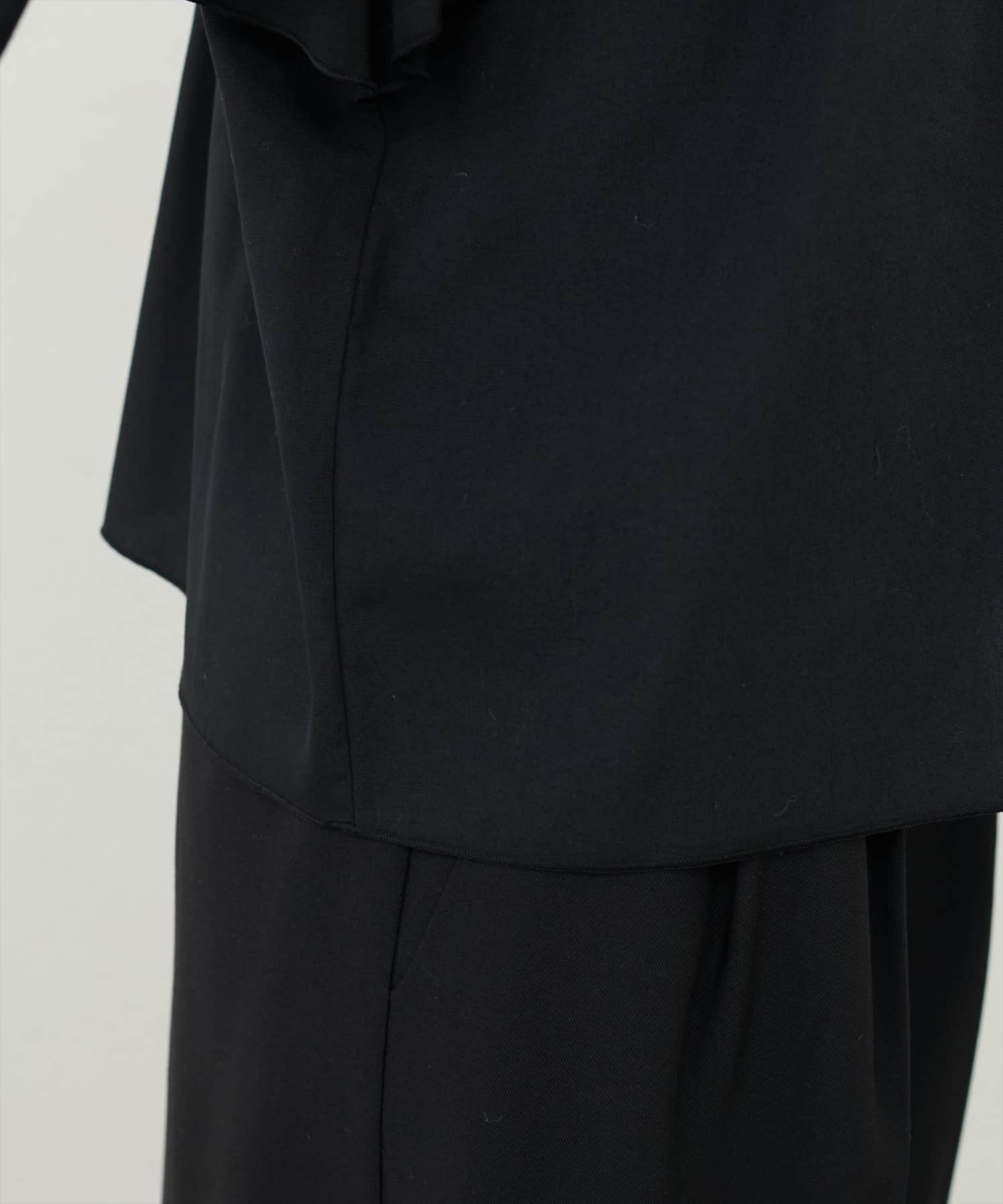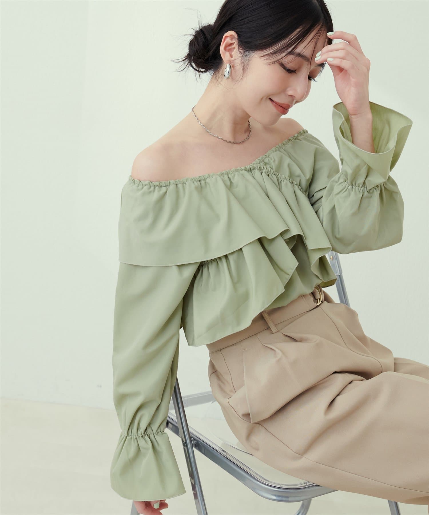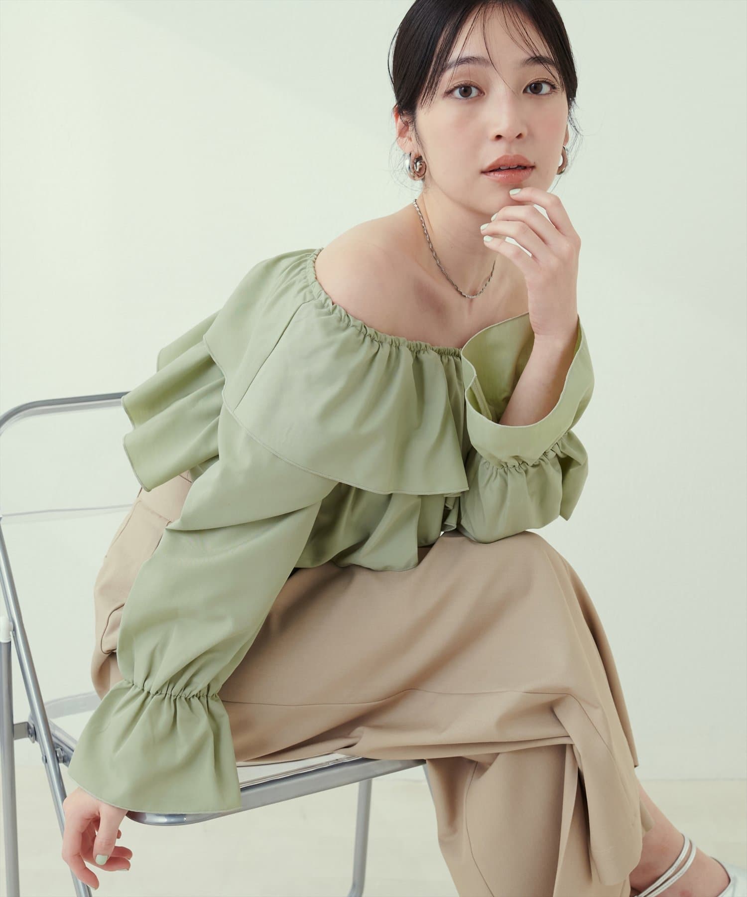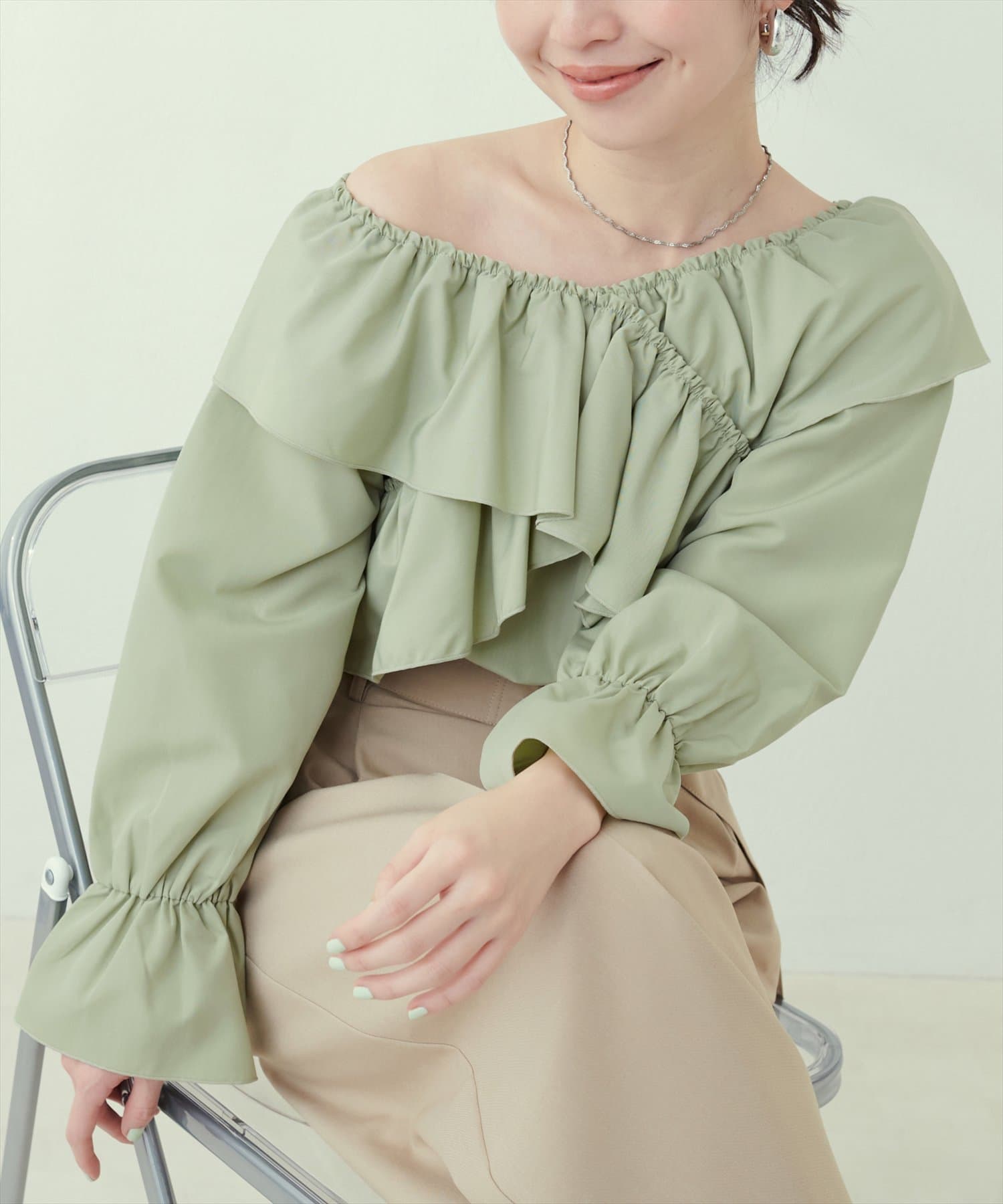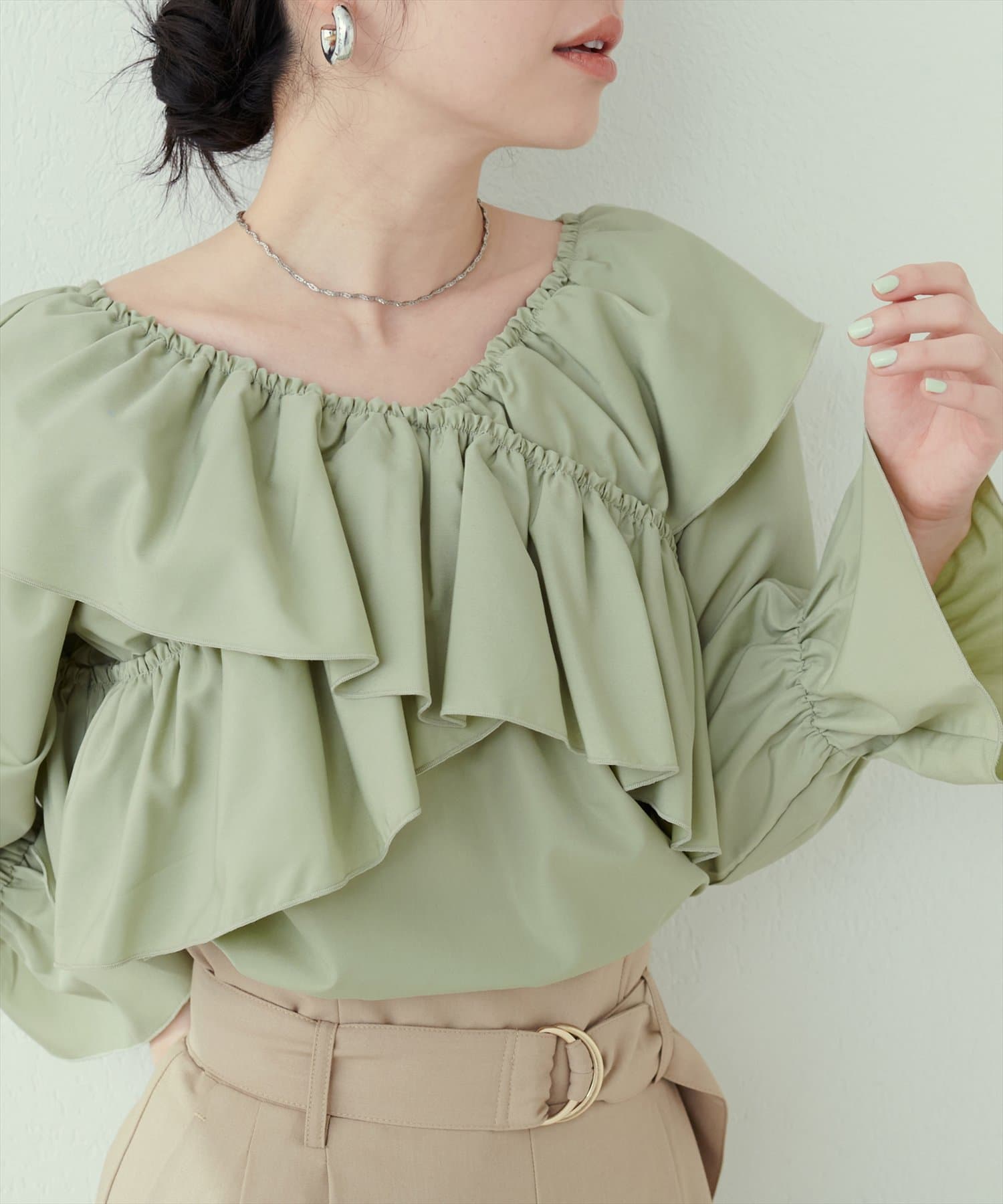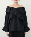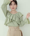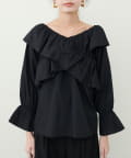 肩から胸にかけてクロスしたフリルデザインが目を惹くフェミニンブラウス。