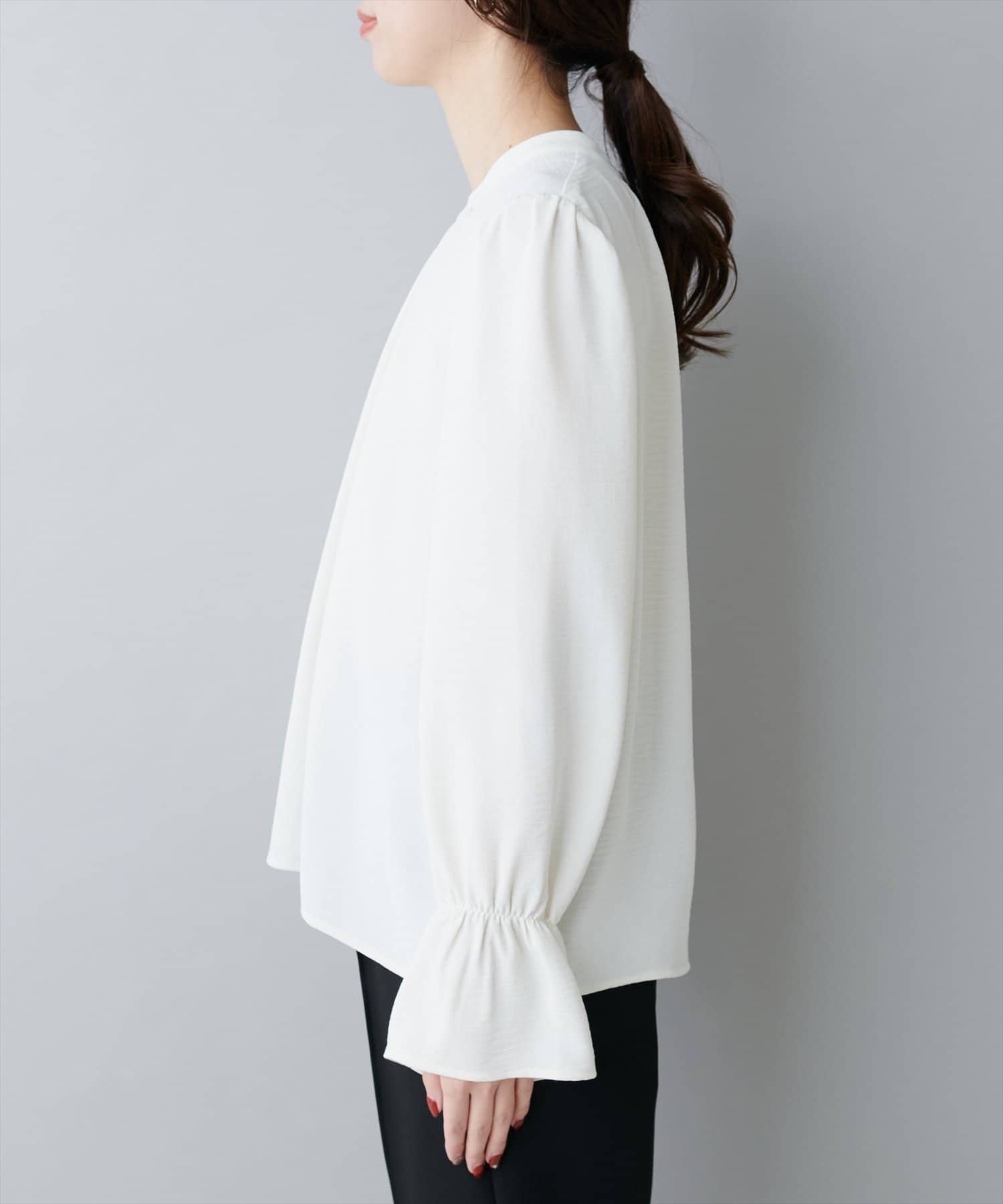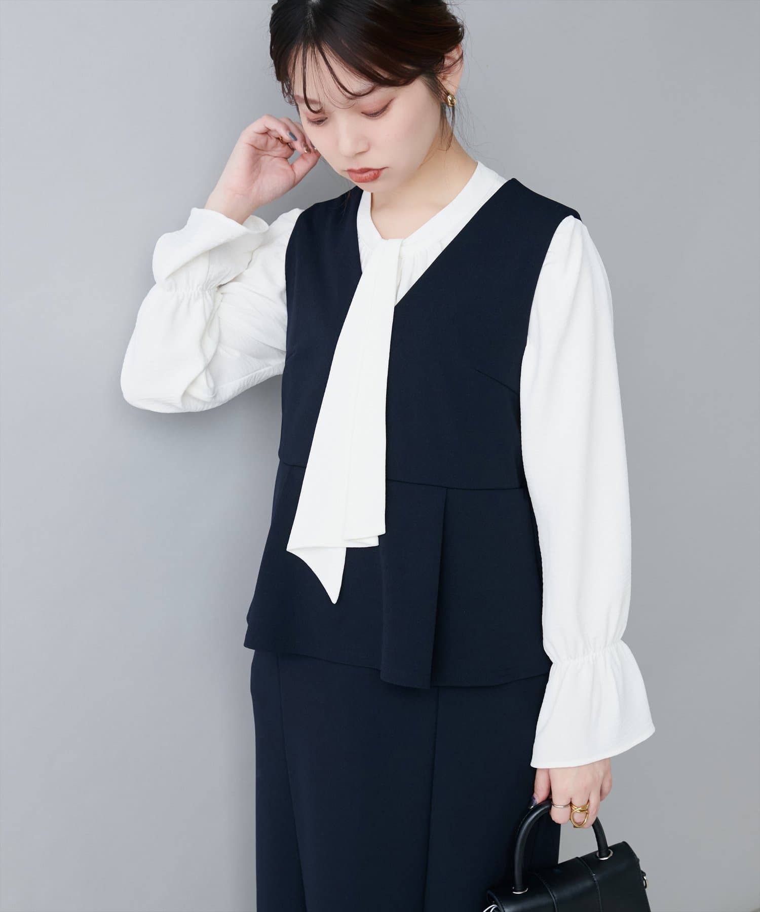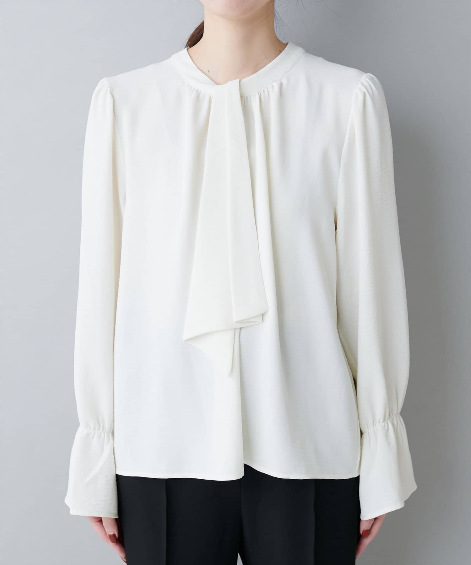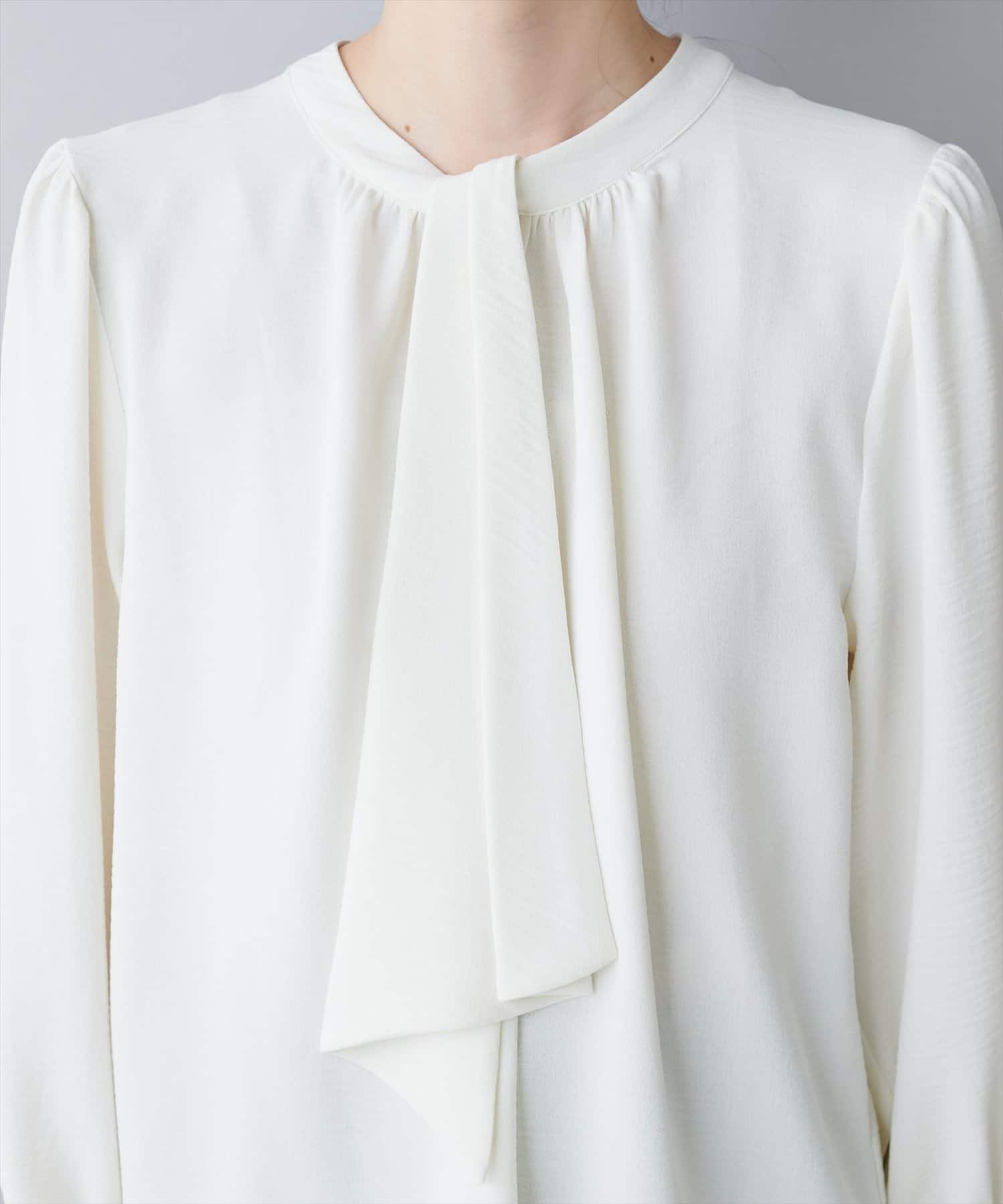 大人気のボウタイブラウスは、なめらかでマットな艶感のある素材を使用。