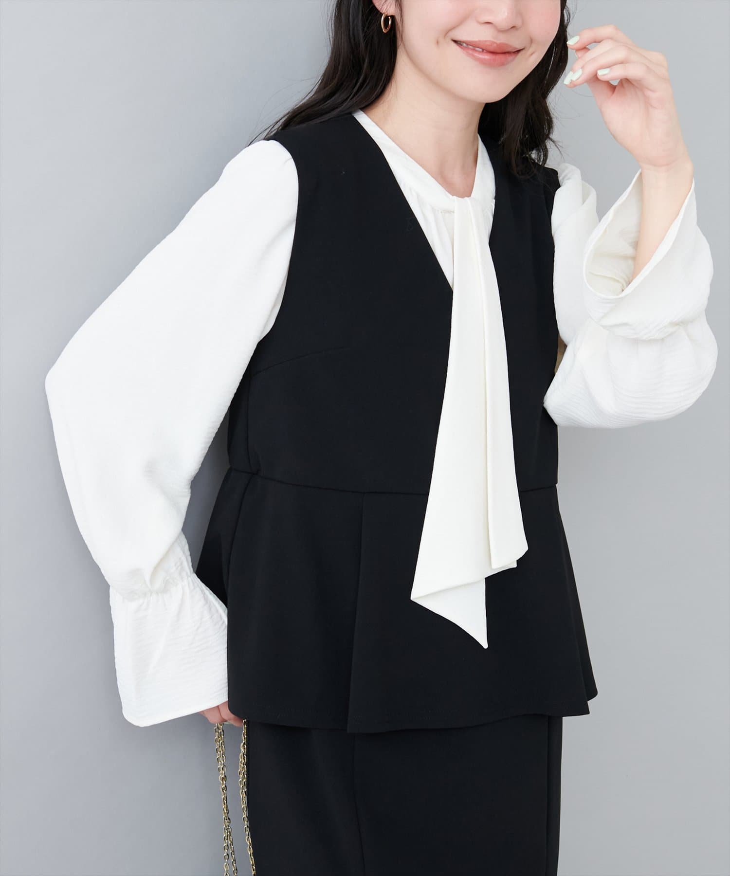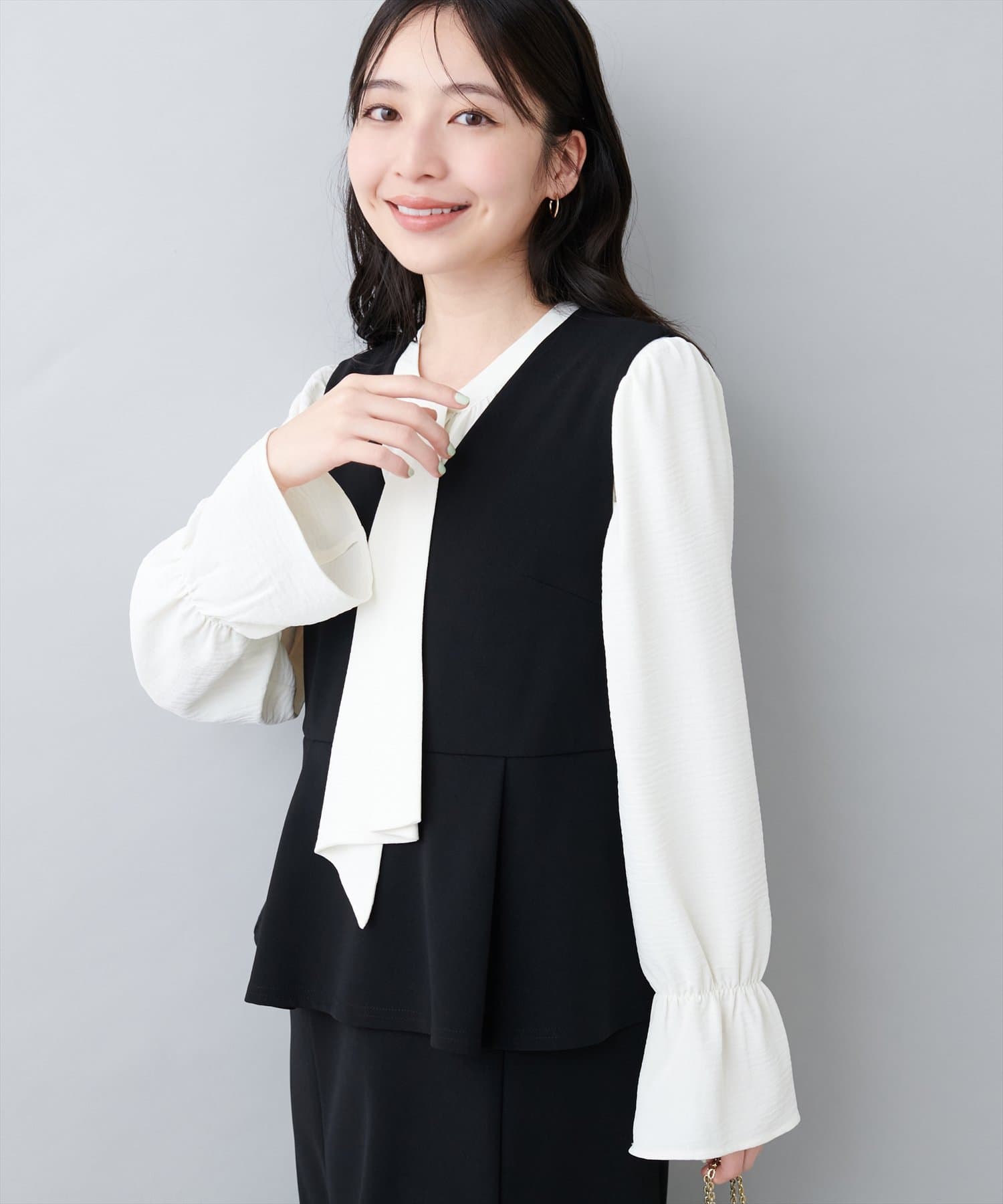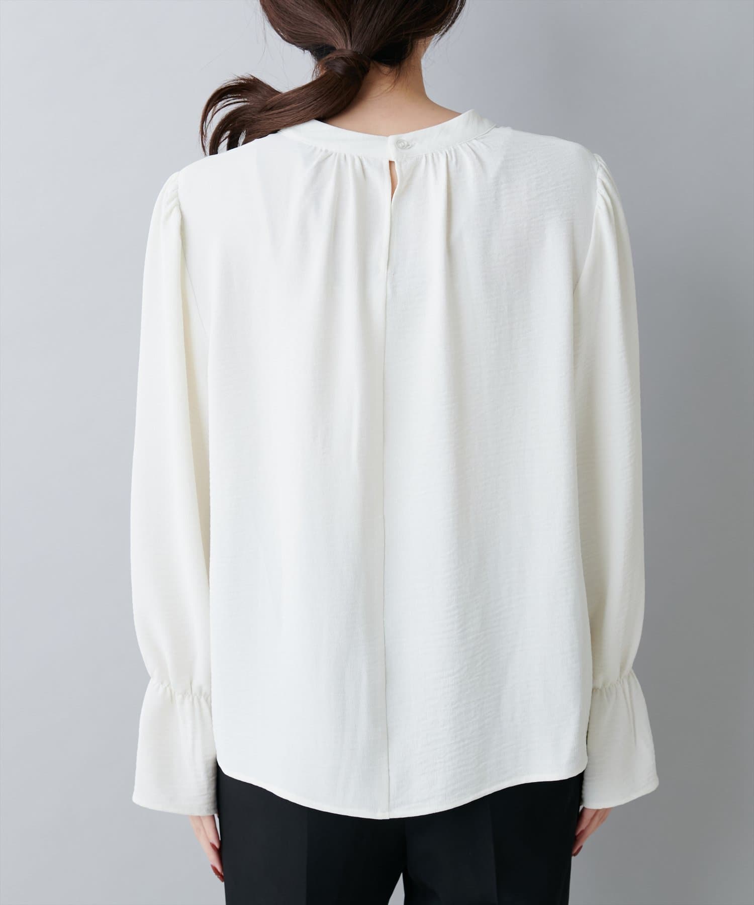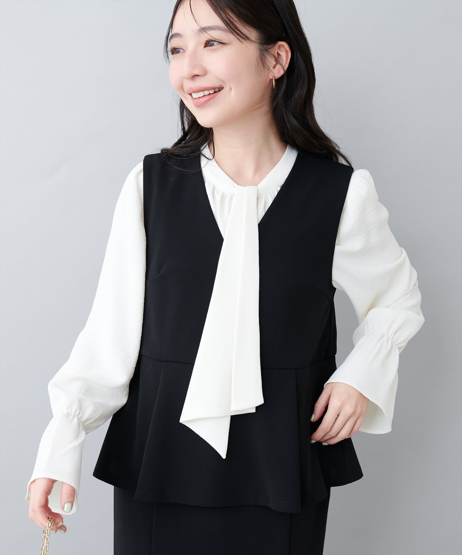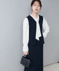 大人気のボウタイブラウスは、なめらかでマットな艶感のある素材を使用。